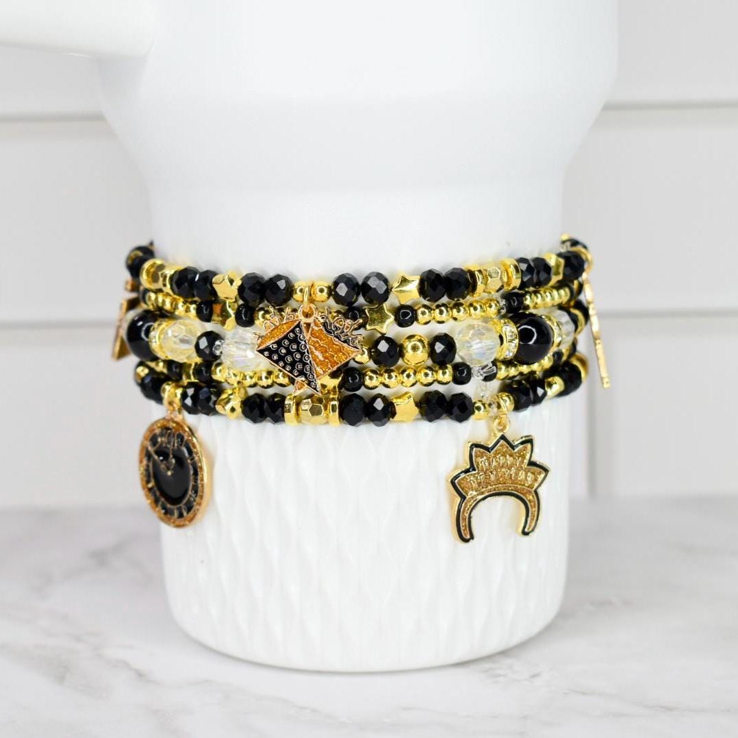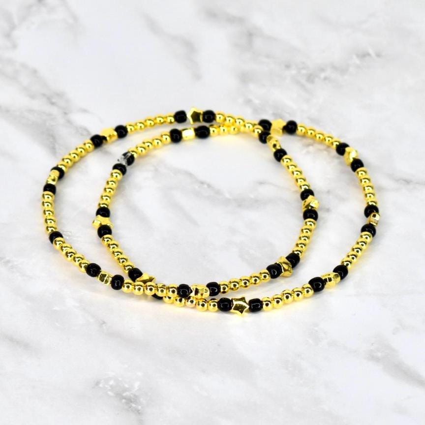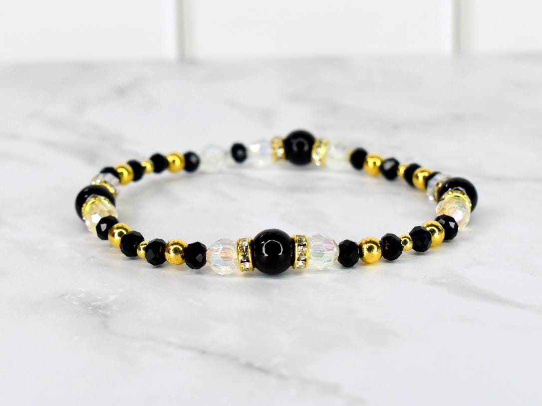 • Stretch bracelets in black, gold, and clear beads for a luxe layered look