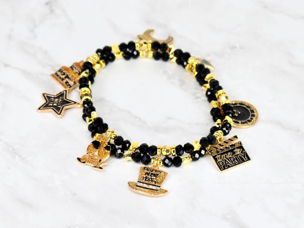 • Features themed charms like a glittery “HAPPY NEW YEAR” top hat, gold party glasses, and a clapperboard that says “time to PARTY” (actual charms may vary but will stay on theme)