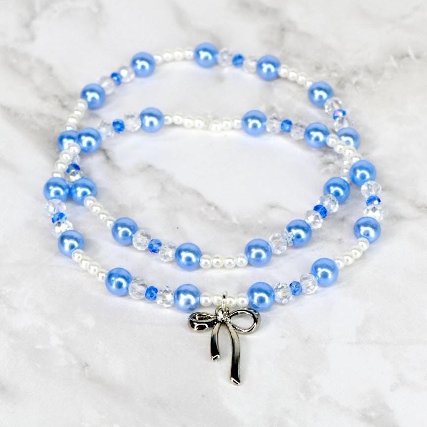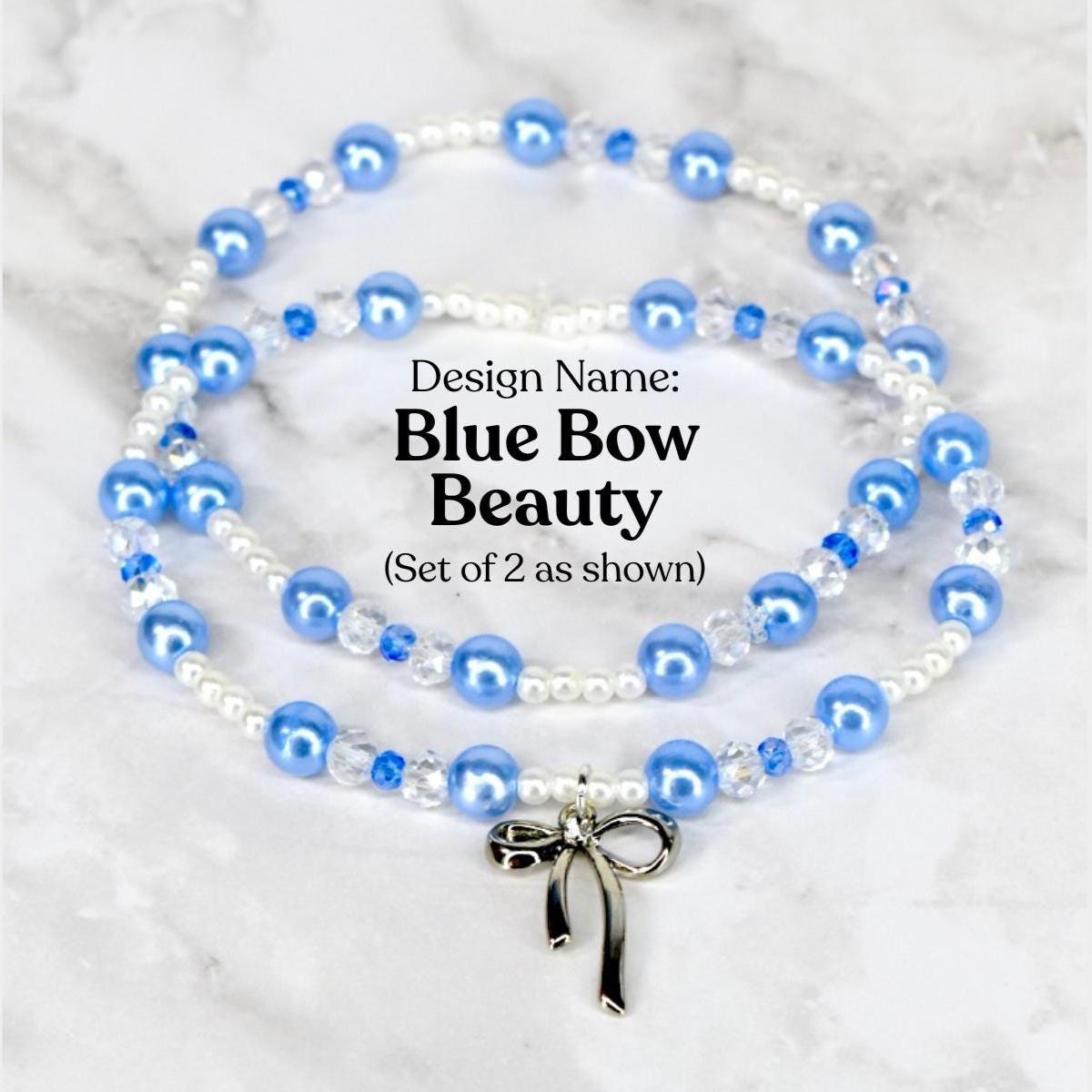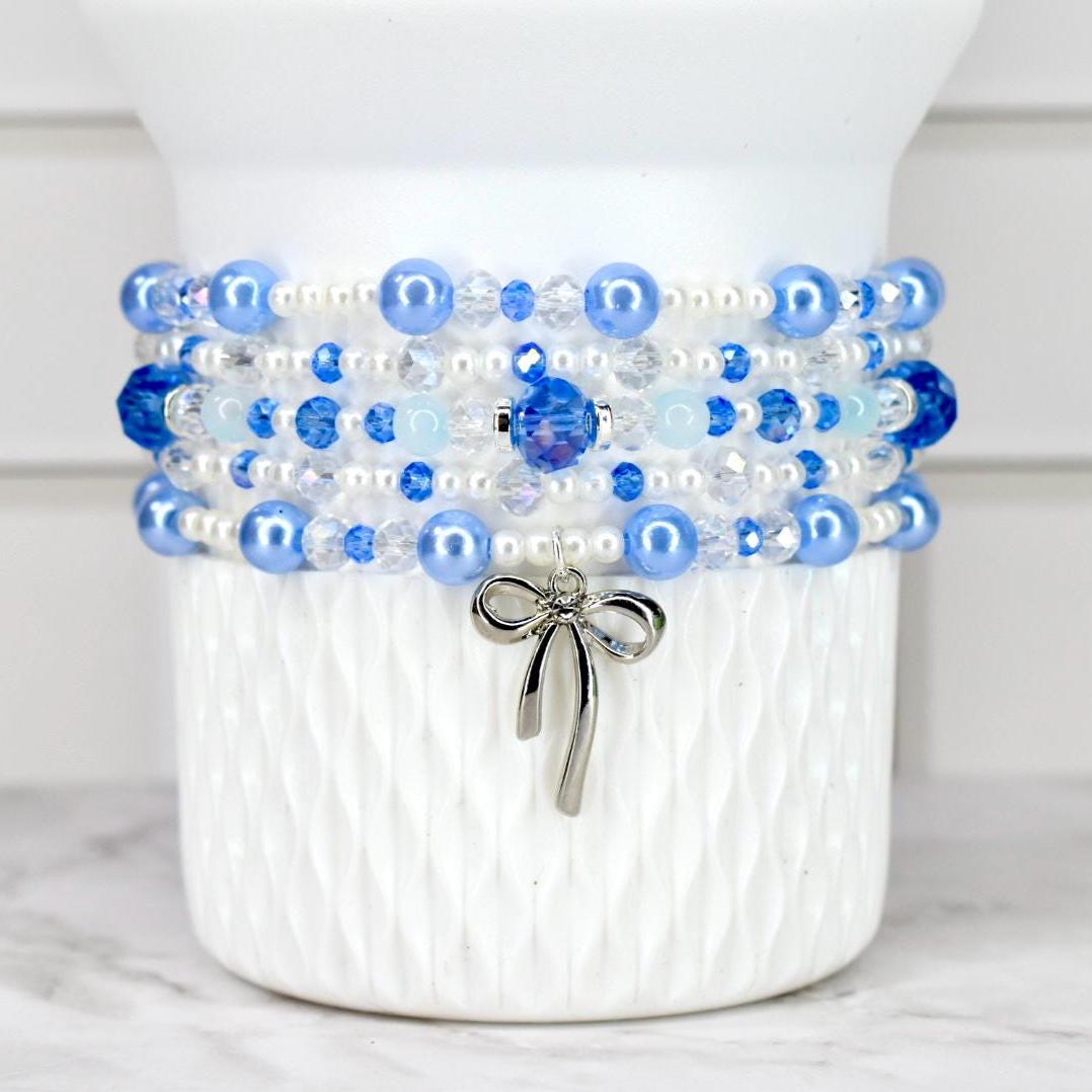 Add a touch of charm, color, and shimmer to your day with these handcrafted blue and pearl beaded bracelets — sold as a set of 5 or individually by design so you can build the perfect stack. Designed with a dreamy mix of icy blue beads, faux pearls, and faceted crystal-style accents, every bracelet brings its own sparkle. A delicate silver bow charm adds a sweet, feminine finish.