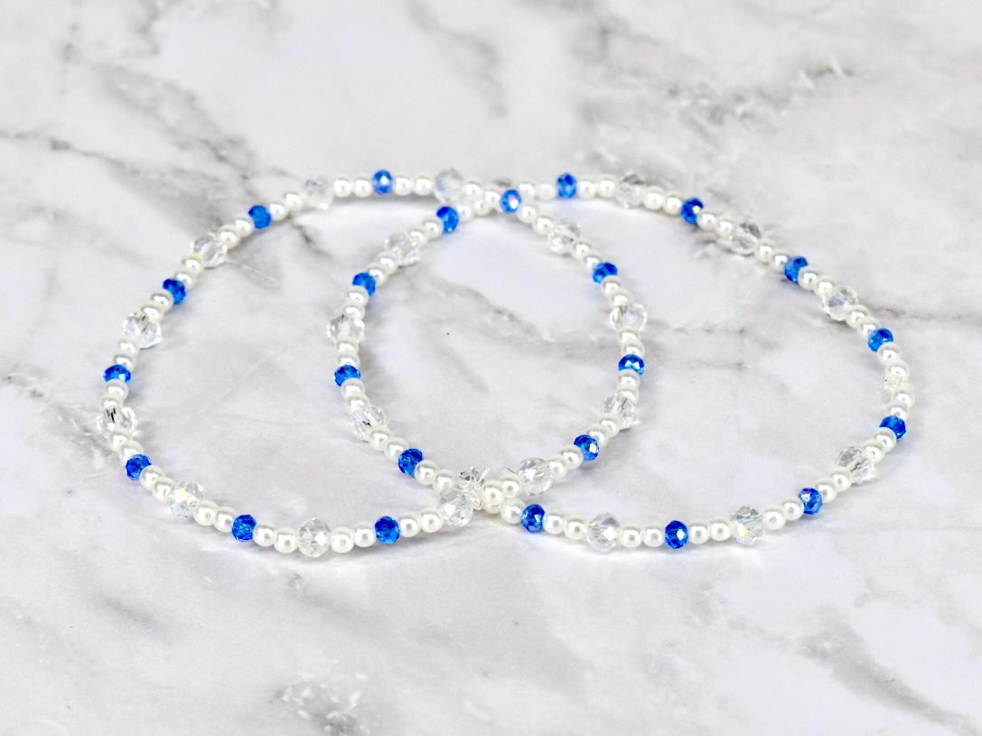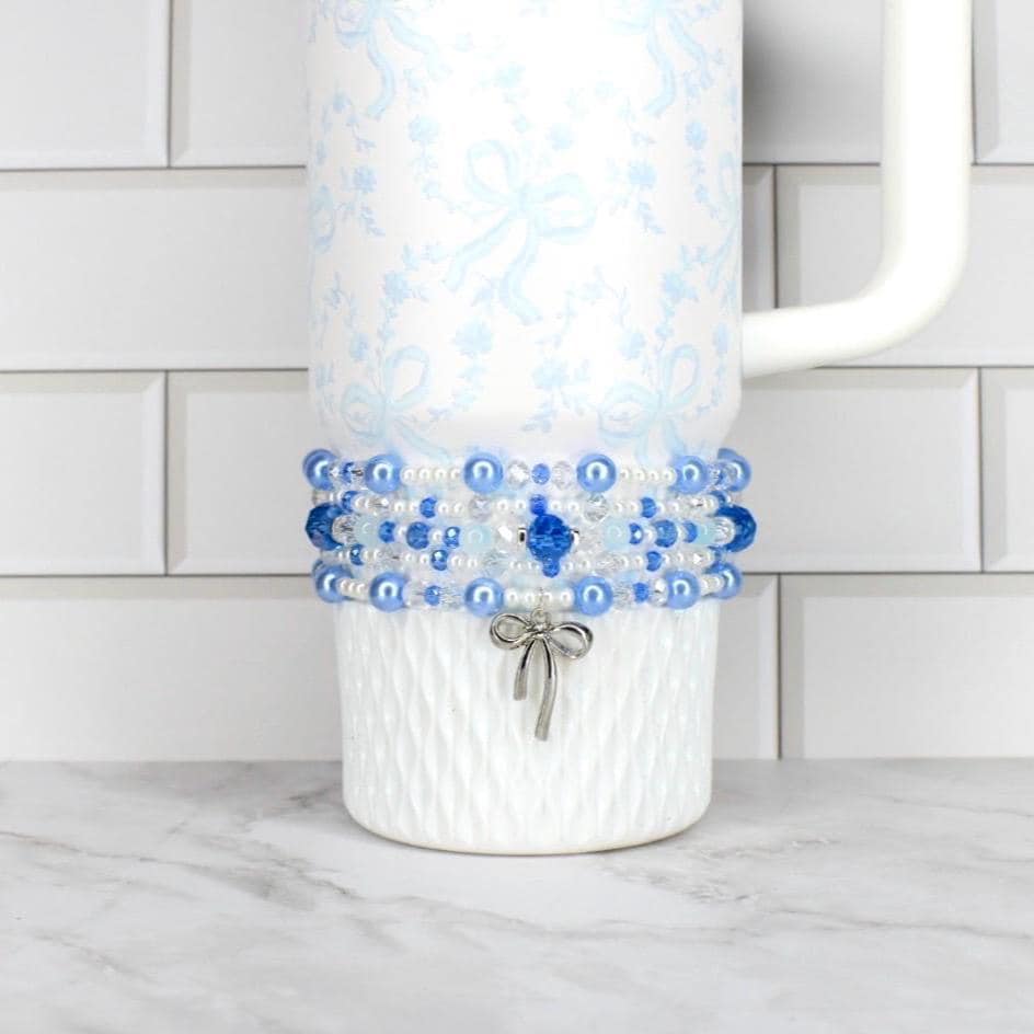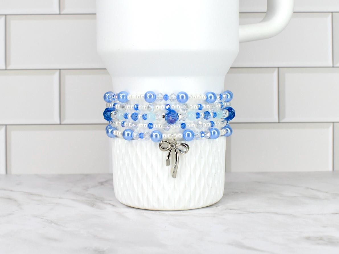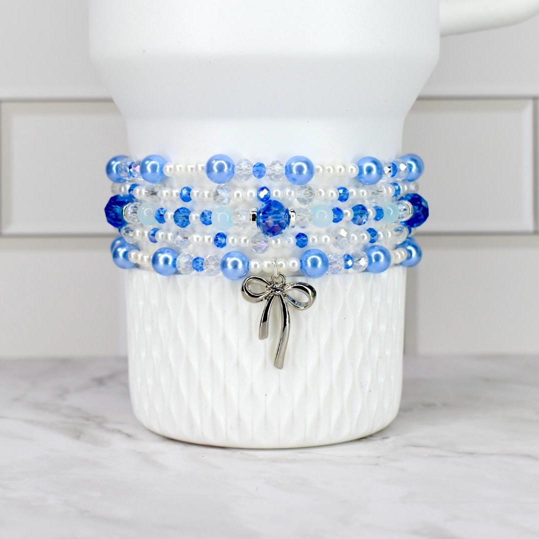 Add a touch of charm, color, and shimmer to your day with these handcrafted blue and pearl beaded bracelets — sold as a set of 5 or individually by design so you can build the perfect stack. Designed with a dreamy mix of icy blue beads, faux pearls, and faceted crystal-style accents, every bracelet brings its own sparkle. A delicate silver bow charm adds a sweet, feminine finish.