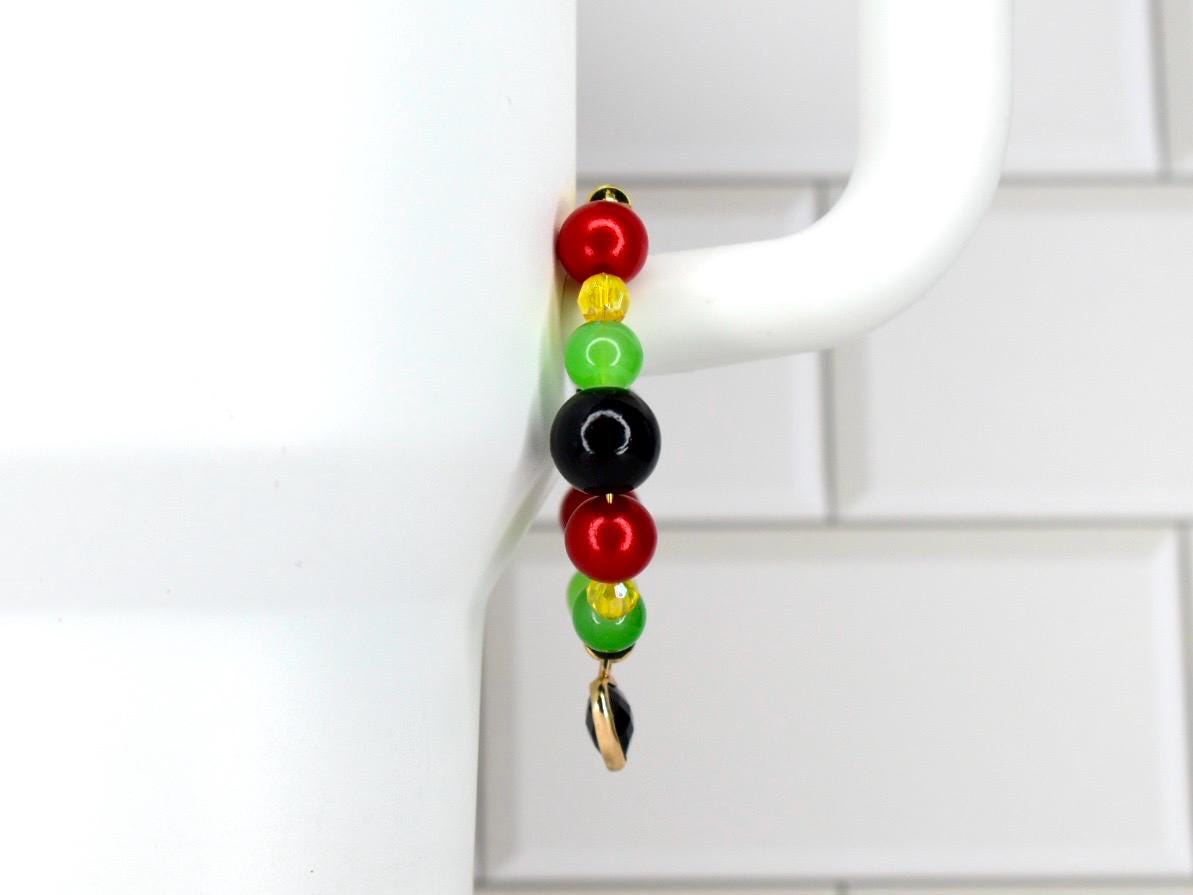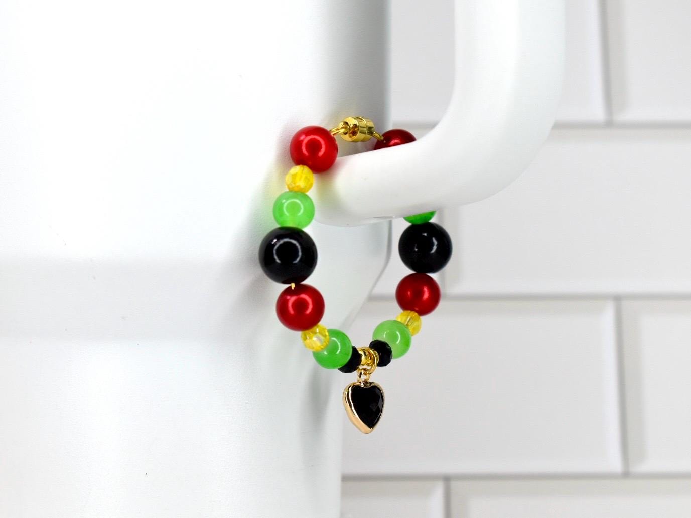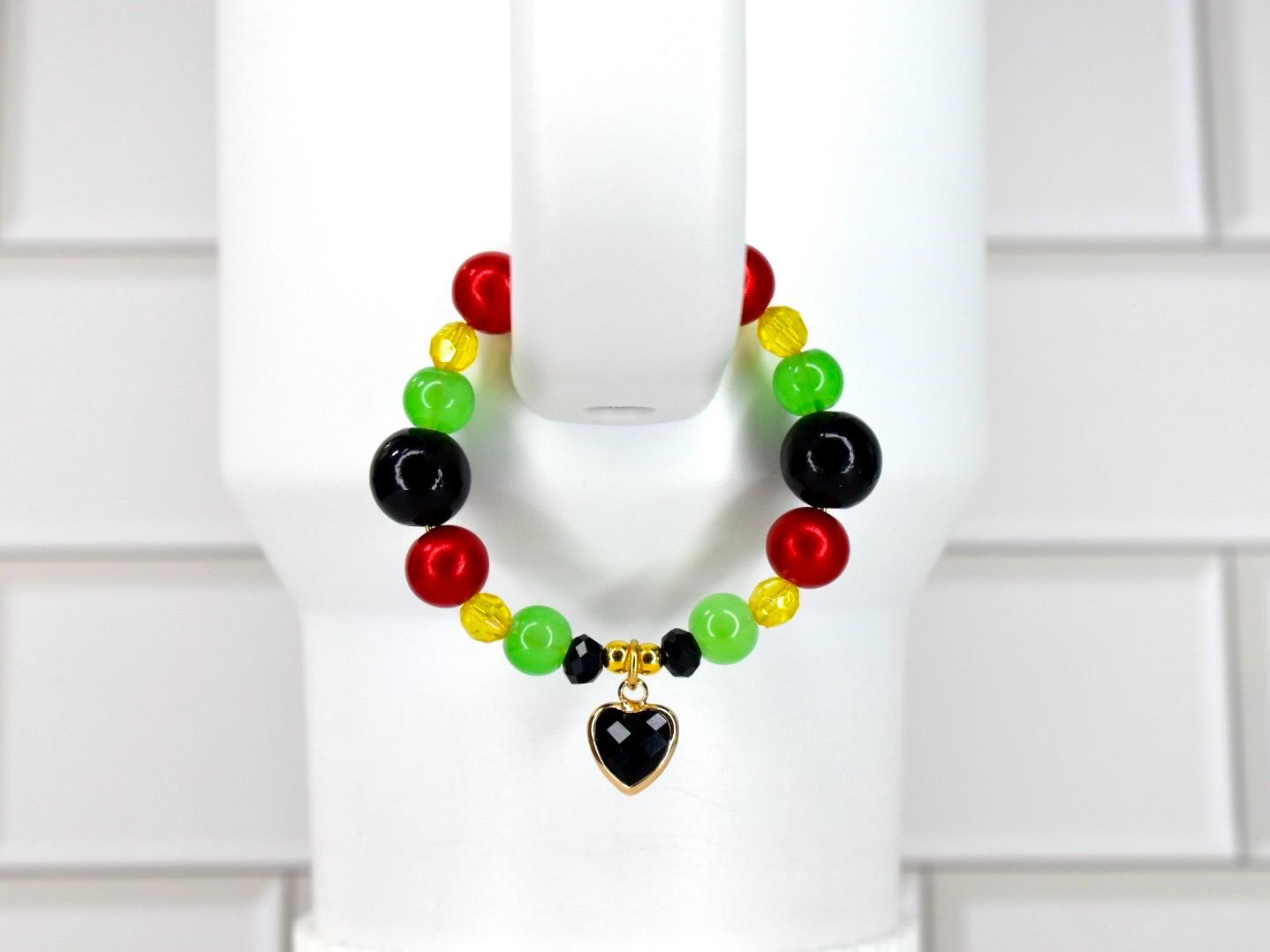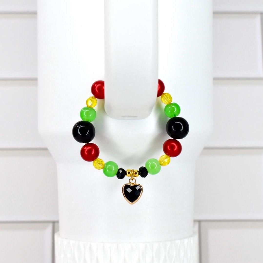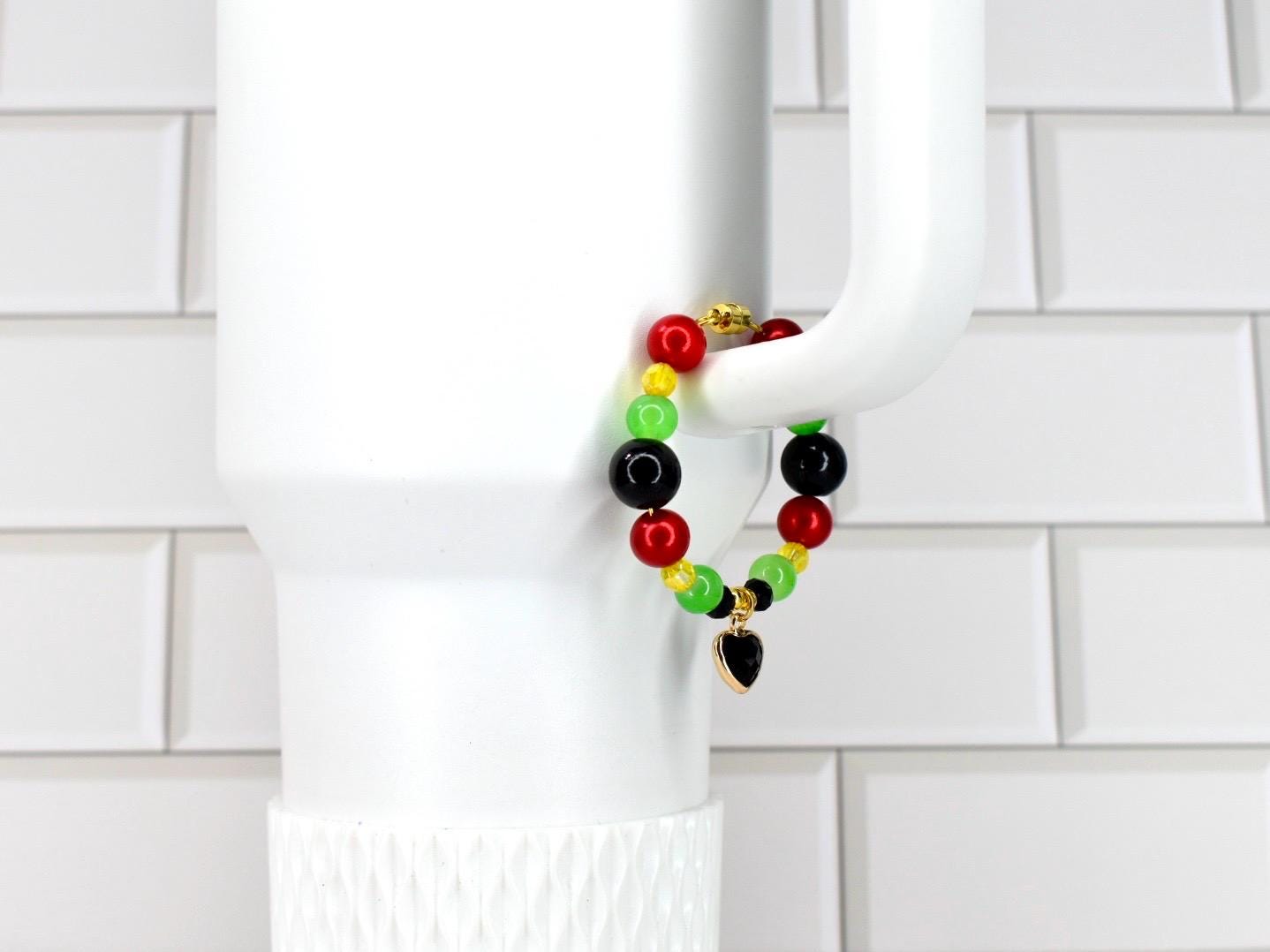 Celebrate culture and heritage with every sip! This striking tumbler handle bracelet features vibrant Pan-African colors in a bold pattern of red, black, green, and yellow beads, making a powerful statement of pride and unity.