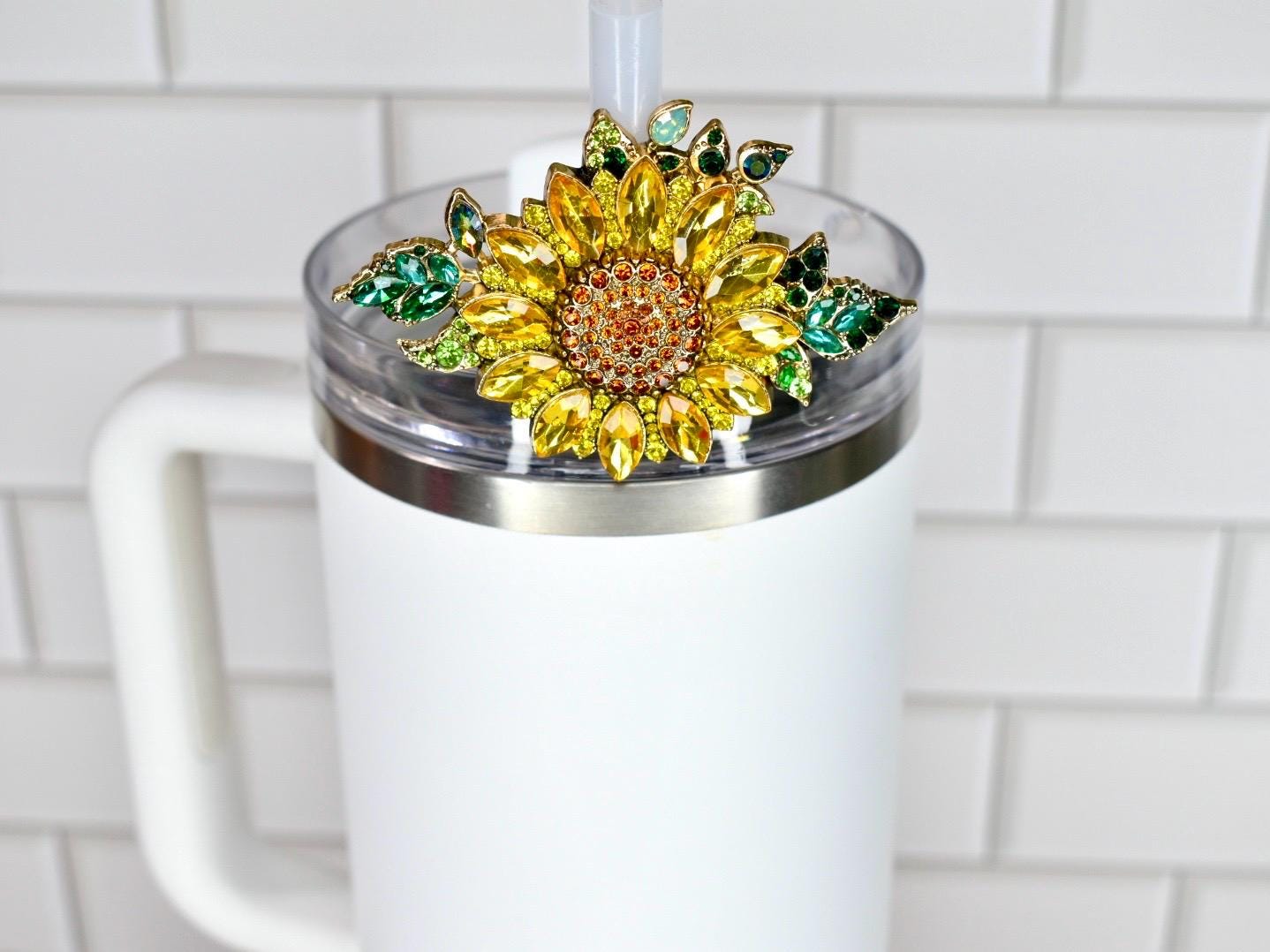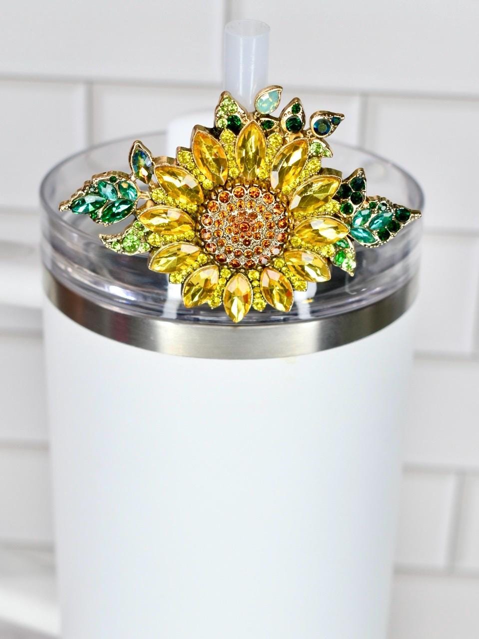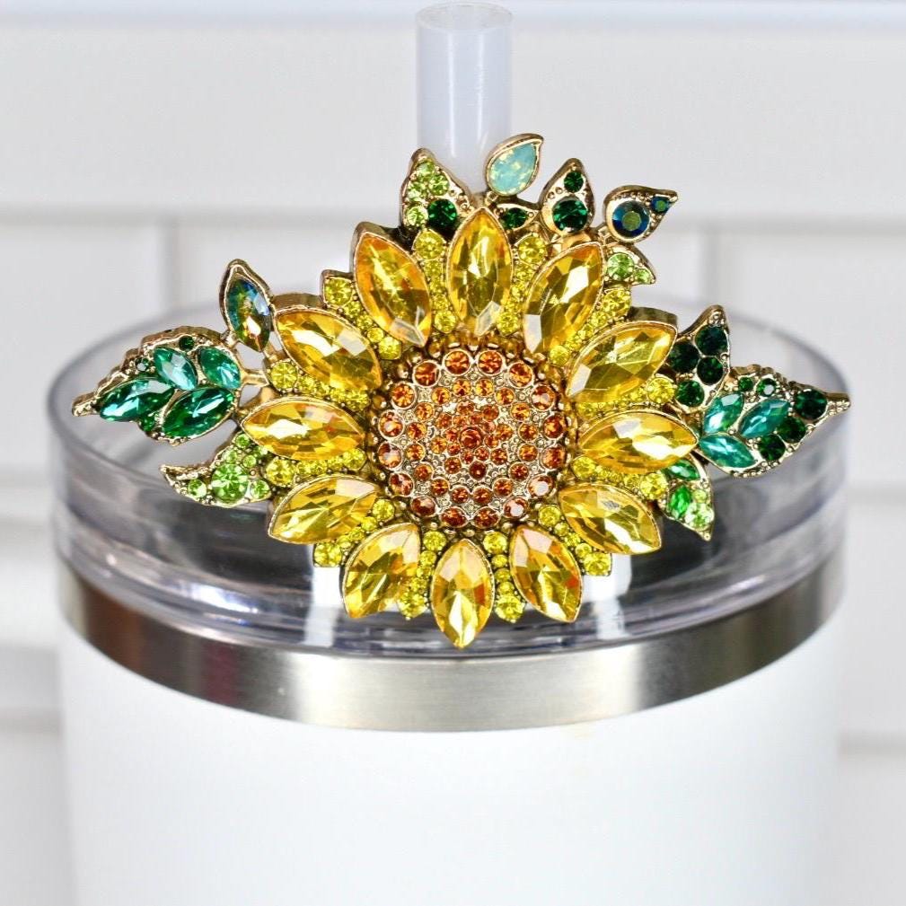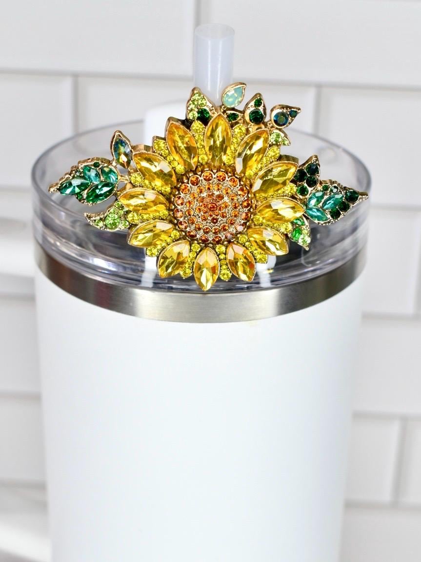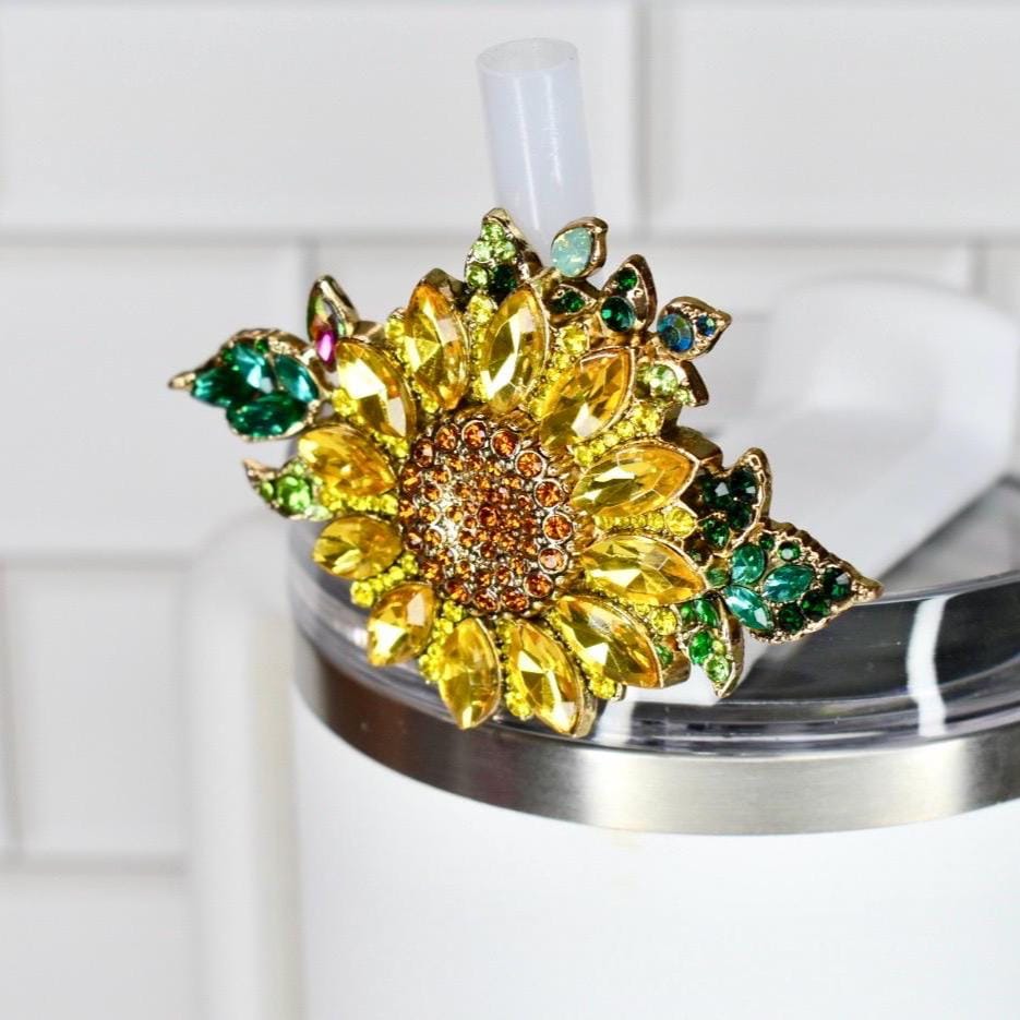 Bring sunshine to your sip with this radiant sunflower straw charm! This gorgeous botanical accessory features brilliant yellow marquise-cut rhinestone petals surrounding a warm amber and topaz crystal center, beautifully accented by lush emerald and lime green leaves with opalescent details. Set in a luxurious gold-tone frame, this dimensional design captures the cheerful essence of a summer sunflower garden.
