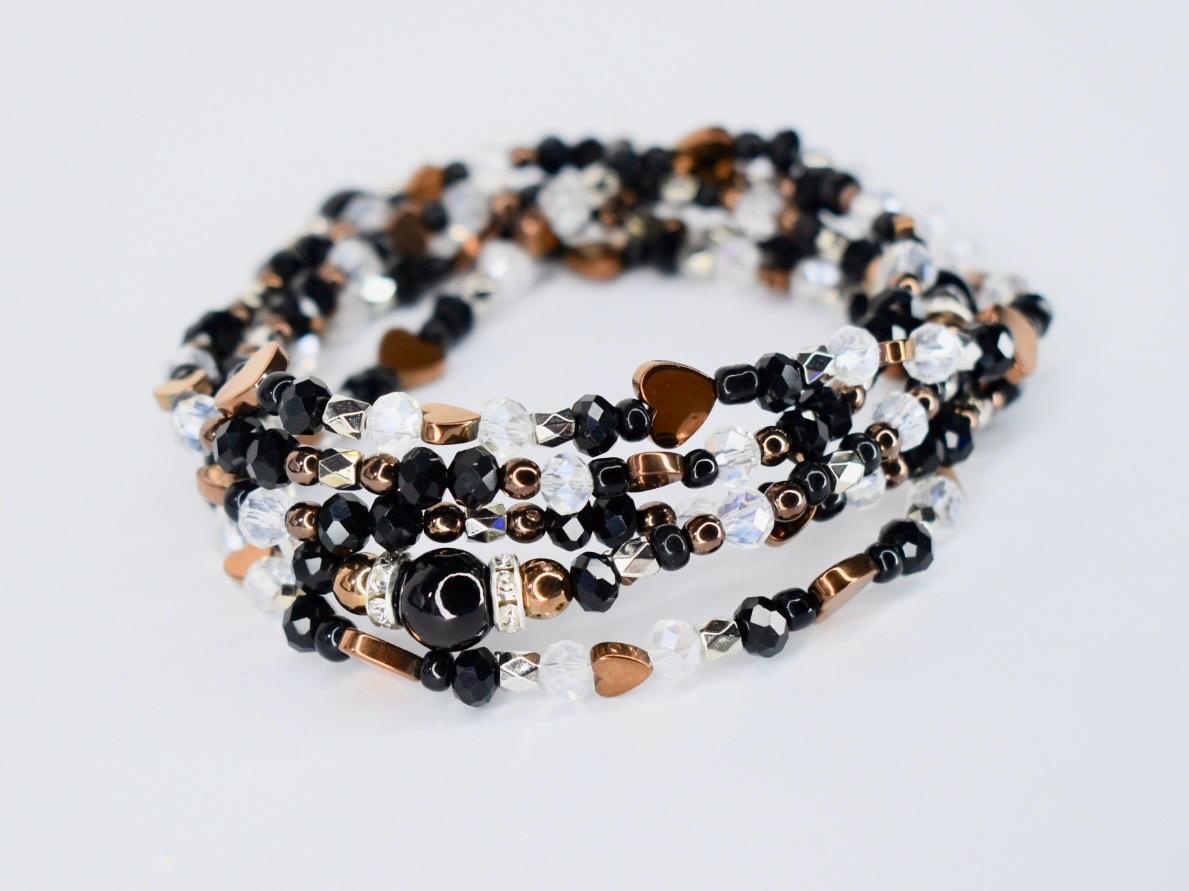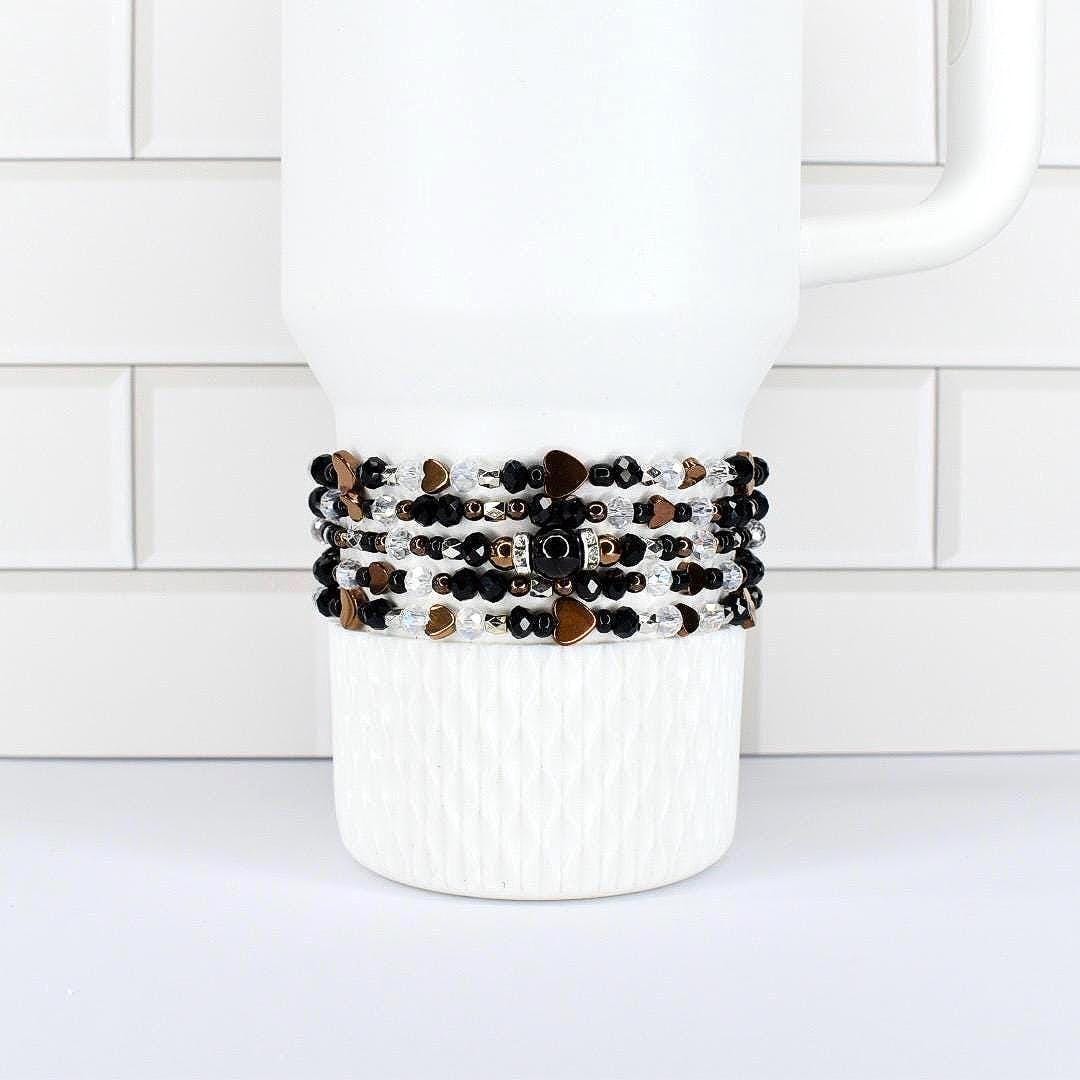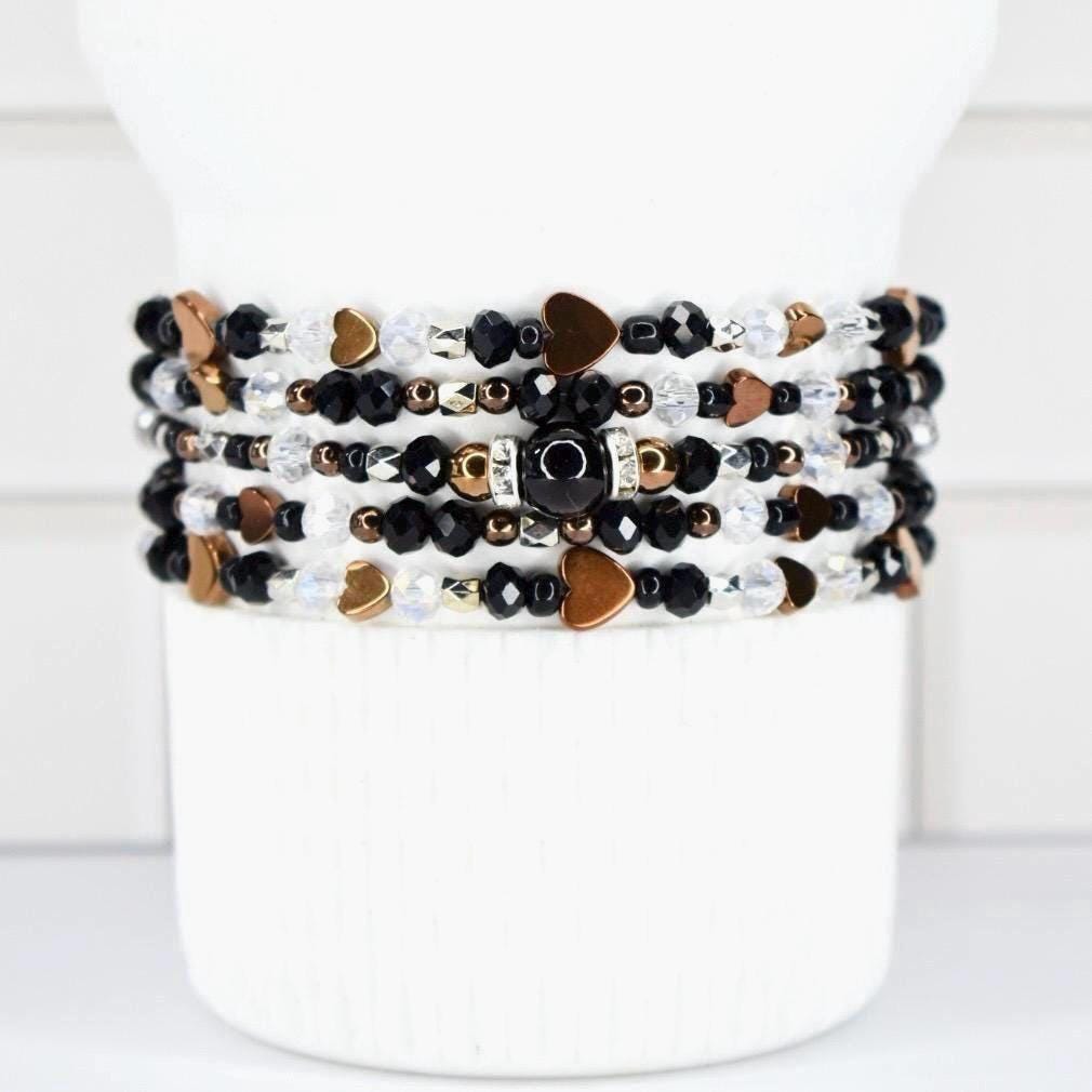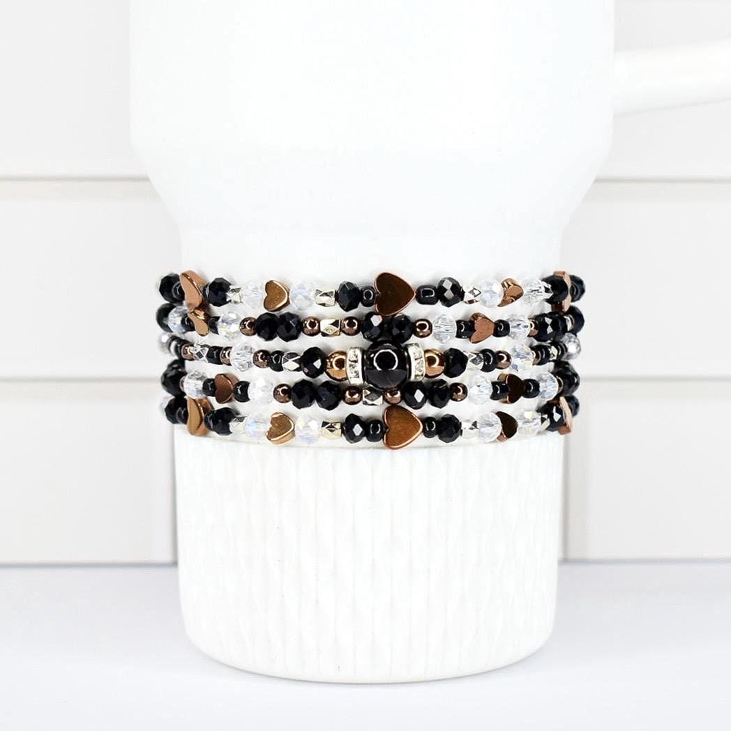 Fall in love with this sophisticated bracelet stack! This elegant 5-piece collection features a stunning combination of black faceted crystals, rose gold heart accents, and clear AB crystals, centered around a striking black oval focal bead with rhinestone details.