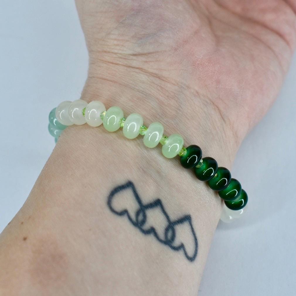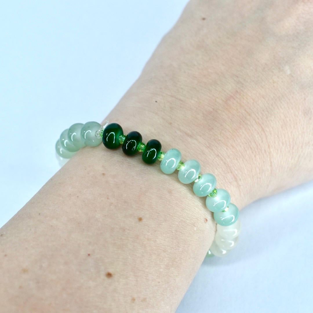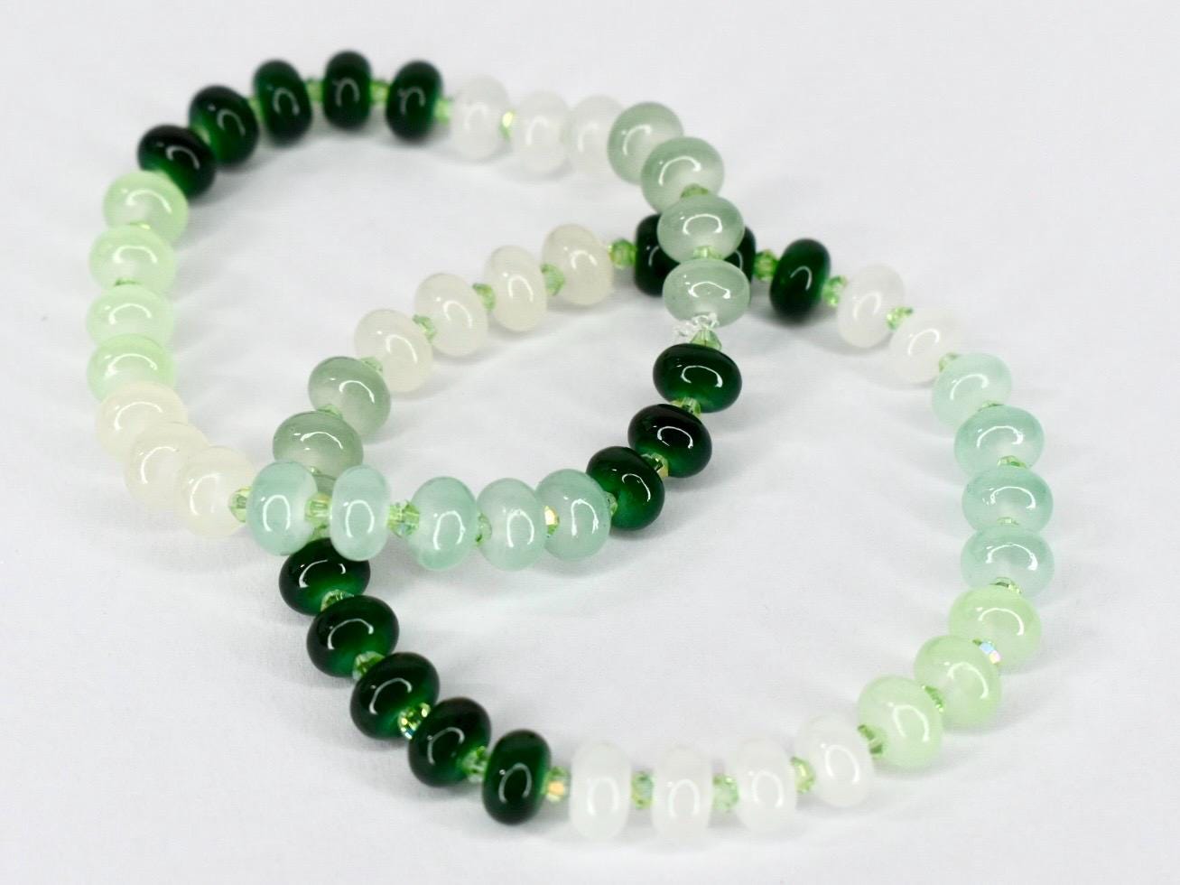 This beautiful glass bead bracelet features a stretch design that makes it a comfortable and adjustable wrist accessory, perfect for casual wear and gift-giving occasions. The handmade jewelry piece showcases elegant green beaded elements with green spacers on an elastic band, offering multiple size options to ensure a perfect fit for everyone.