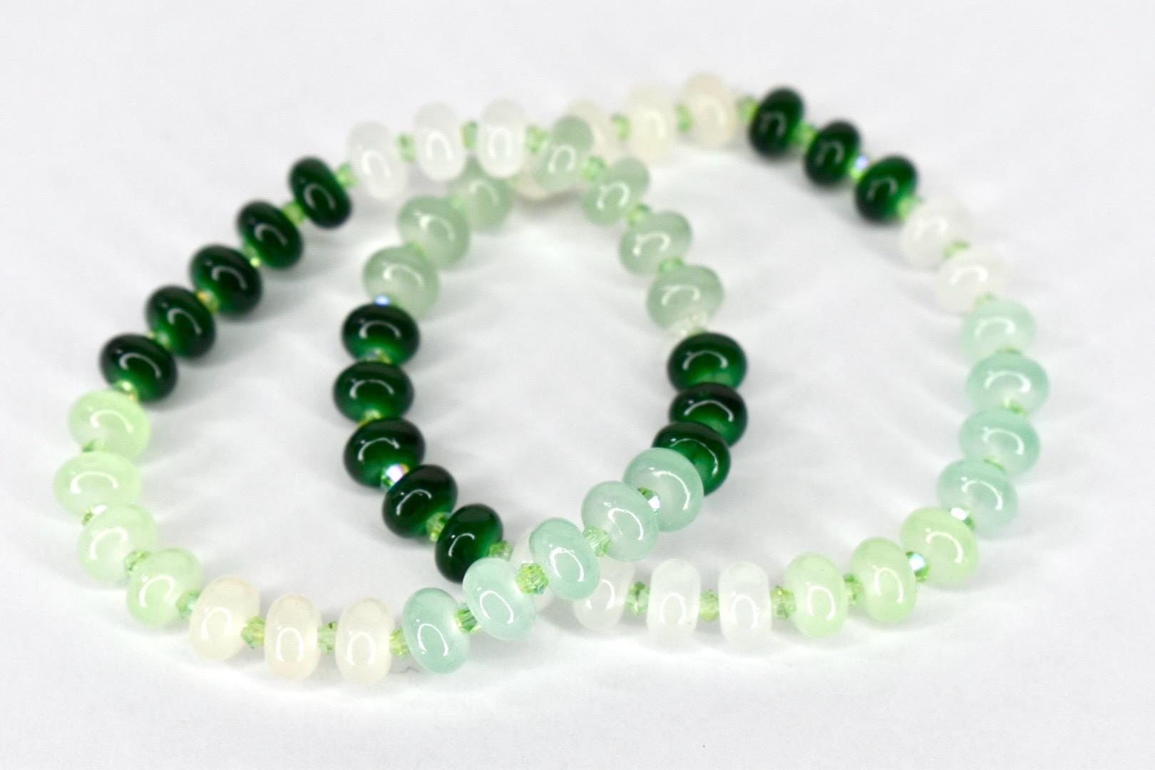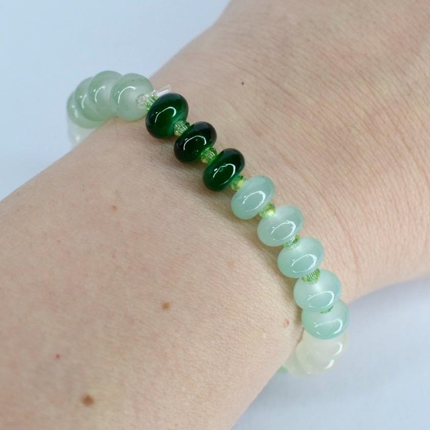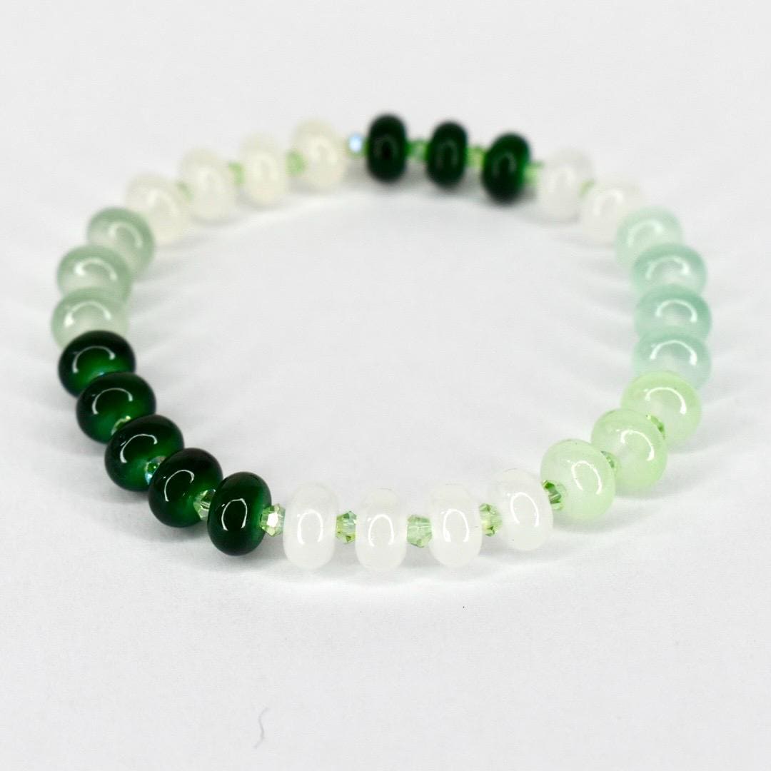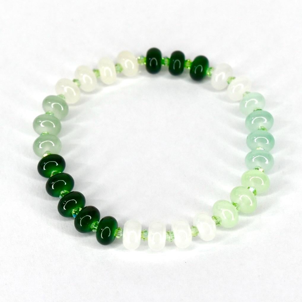 This beautiful glass bead bracelet features a stretch design that makes it a comfortable and adjustable wrist accessory, perfect for casual wear and gift-giving occasions. The handmade jewelry piece showcases elegant green beaded elements with green spacers on an elastic band, offering multiple size options to ensure a perfect fit for everyone.
