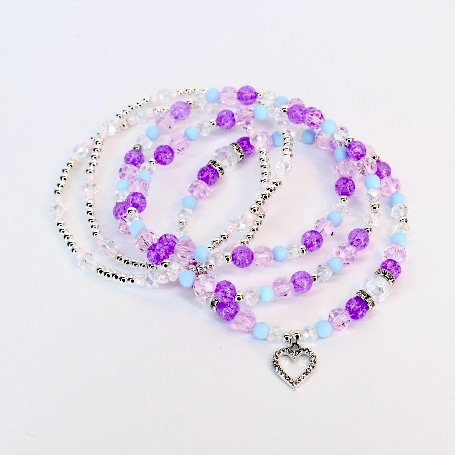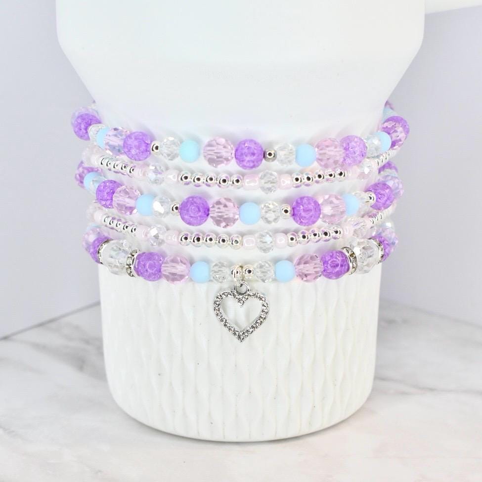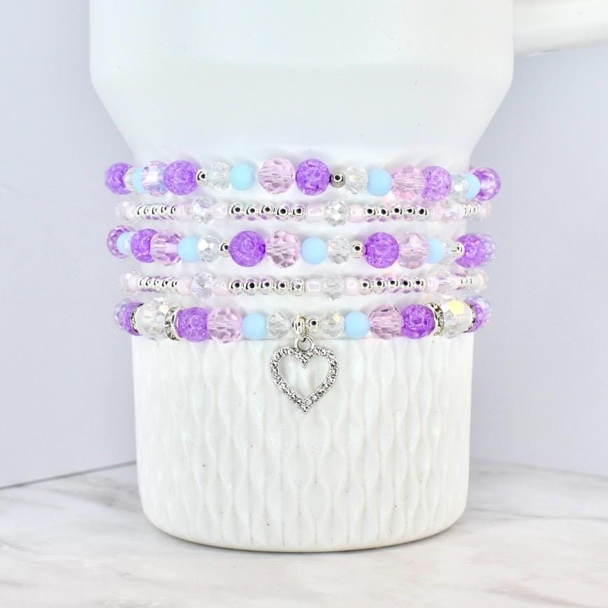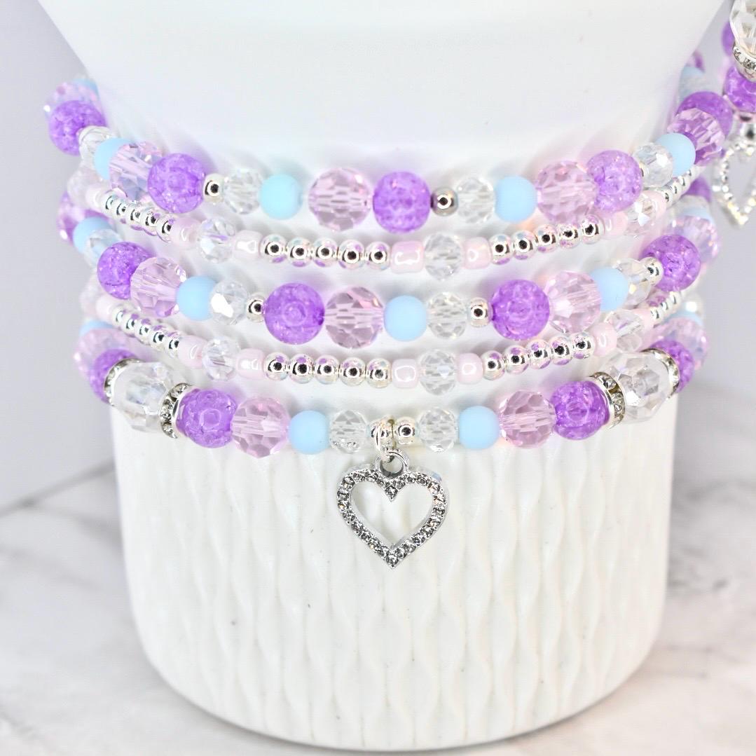 Celebrate love in lovely lavender! This romantic 5-piece Valentine’s collection features dreamy purple and pink tones with soft blue accents, sparkling crystals, and a beautiful rhinestone heart charm that captures the sweet essence of Valentine’s Day.