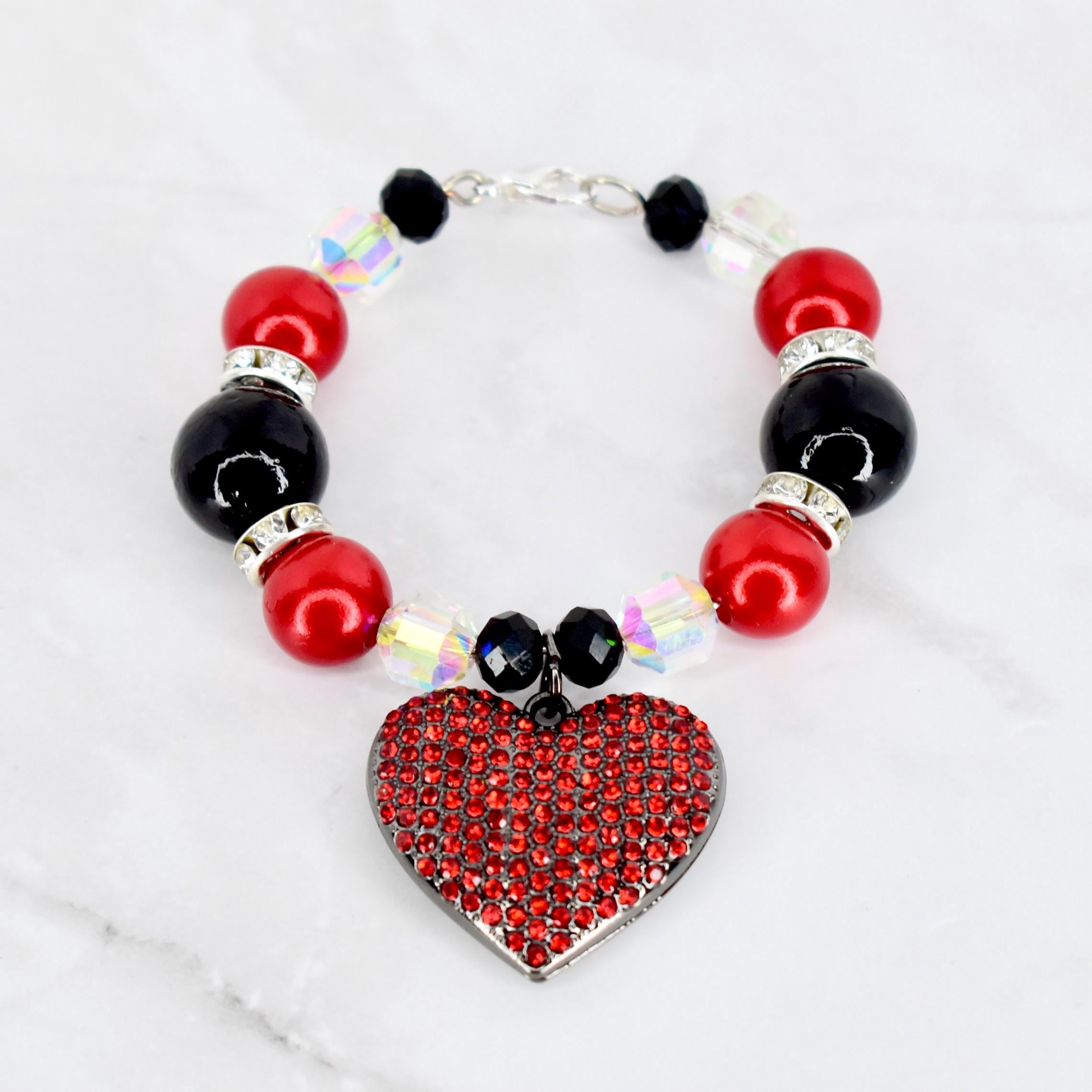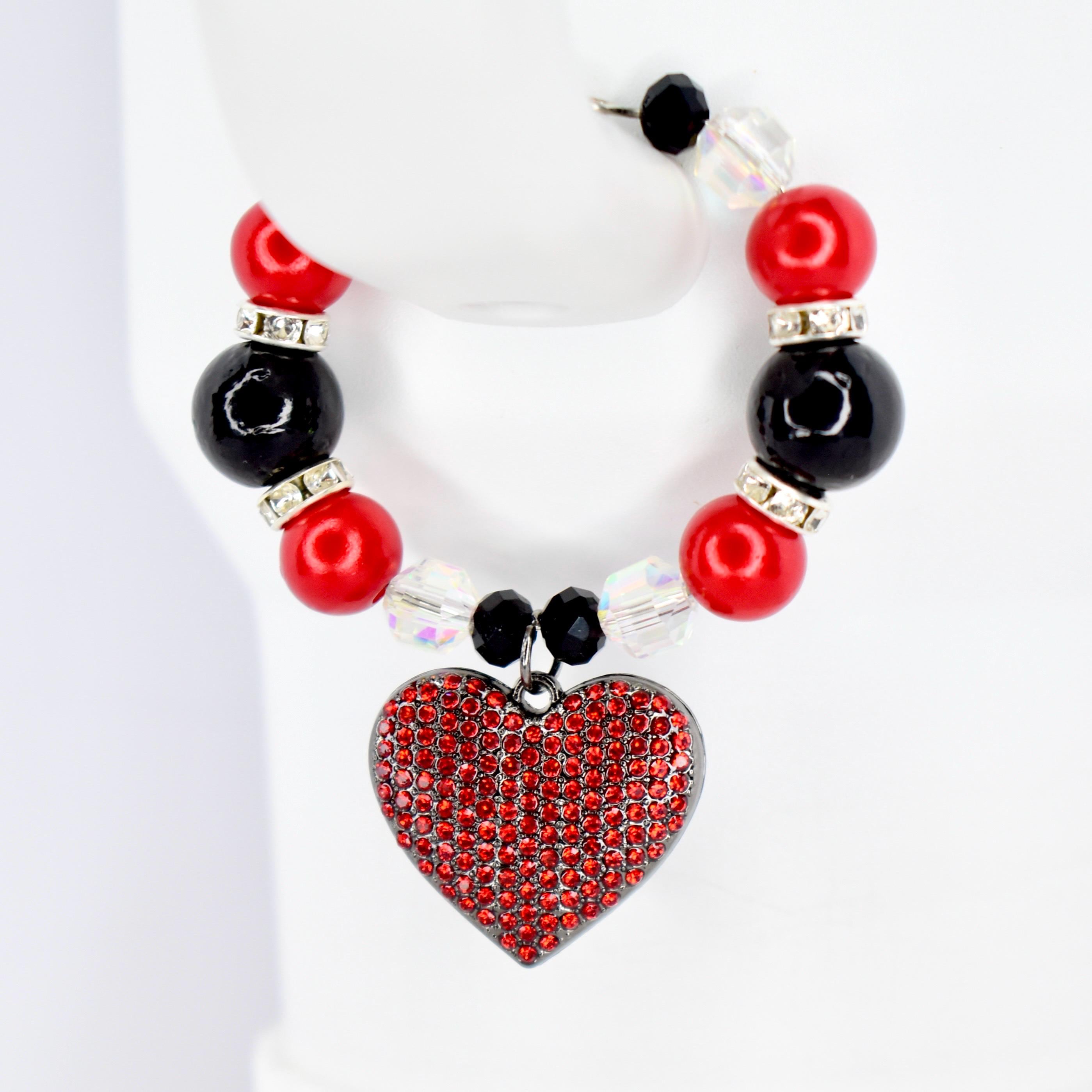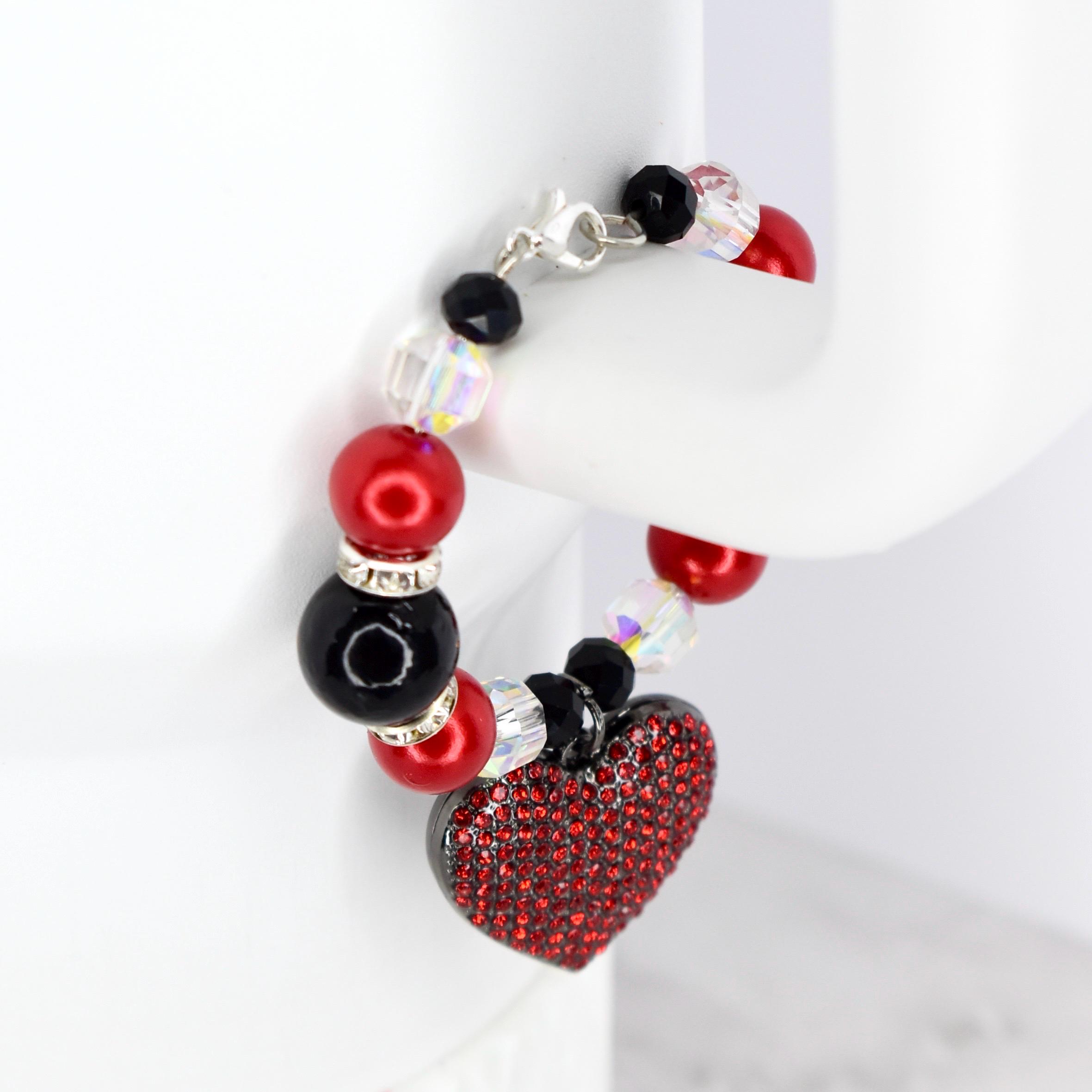 The oversized heart charm is covered in brilliant red rhinestones that catch the light from every angle, creating a dazzling focal point. Surrounding the heart are glossy red and black beads, clear aurora borealis crystals with rainbow reflections, and silver rhinestone spacers that add extra sparkle to this romantic design.