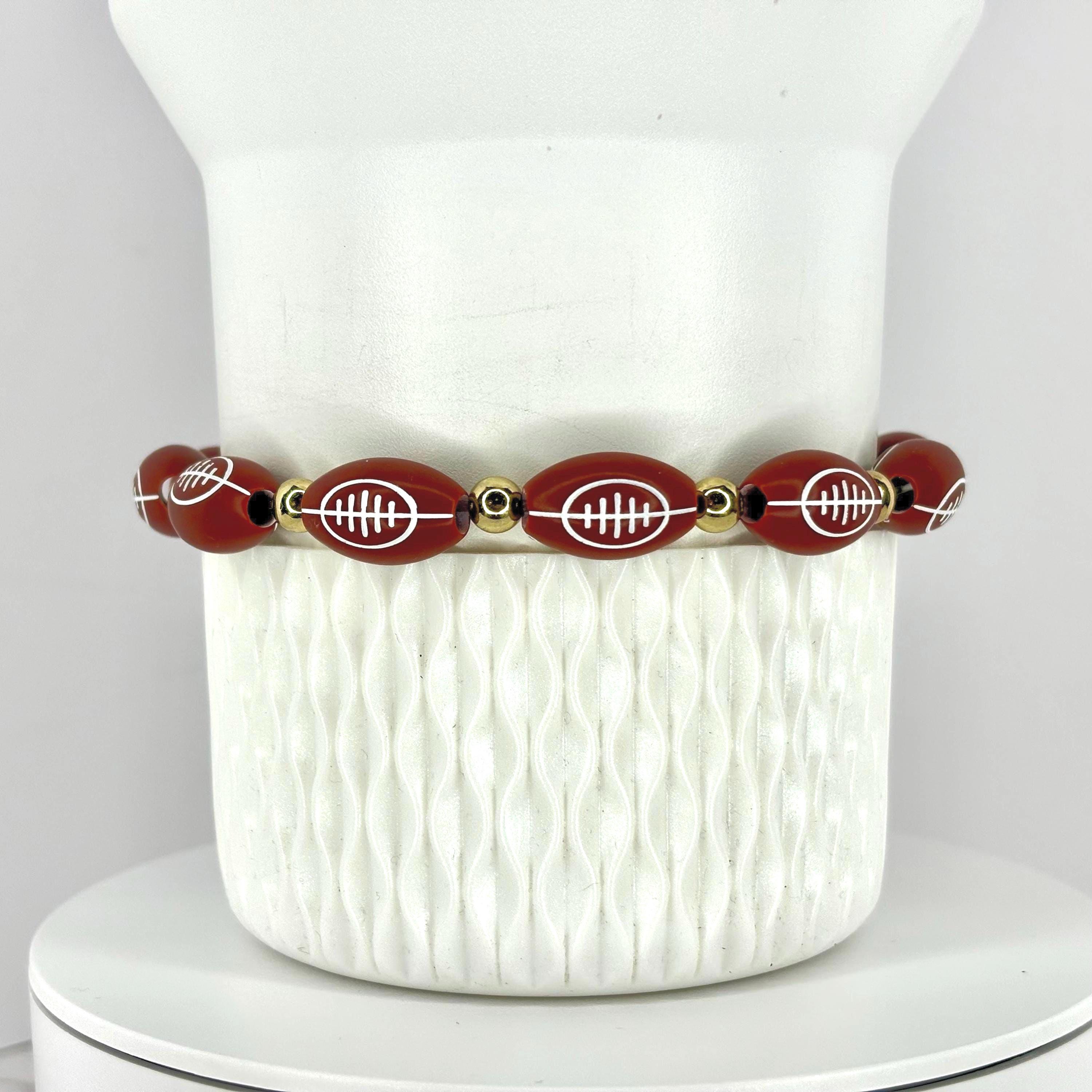 Score a touchdown with this versatile football bracelet! Perfect for showing your team spirit on your wrist or decorating your favorite tumbler, this sporty accessory features realistic brown football beads with white lacing details that capture all the excitement of game day.
