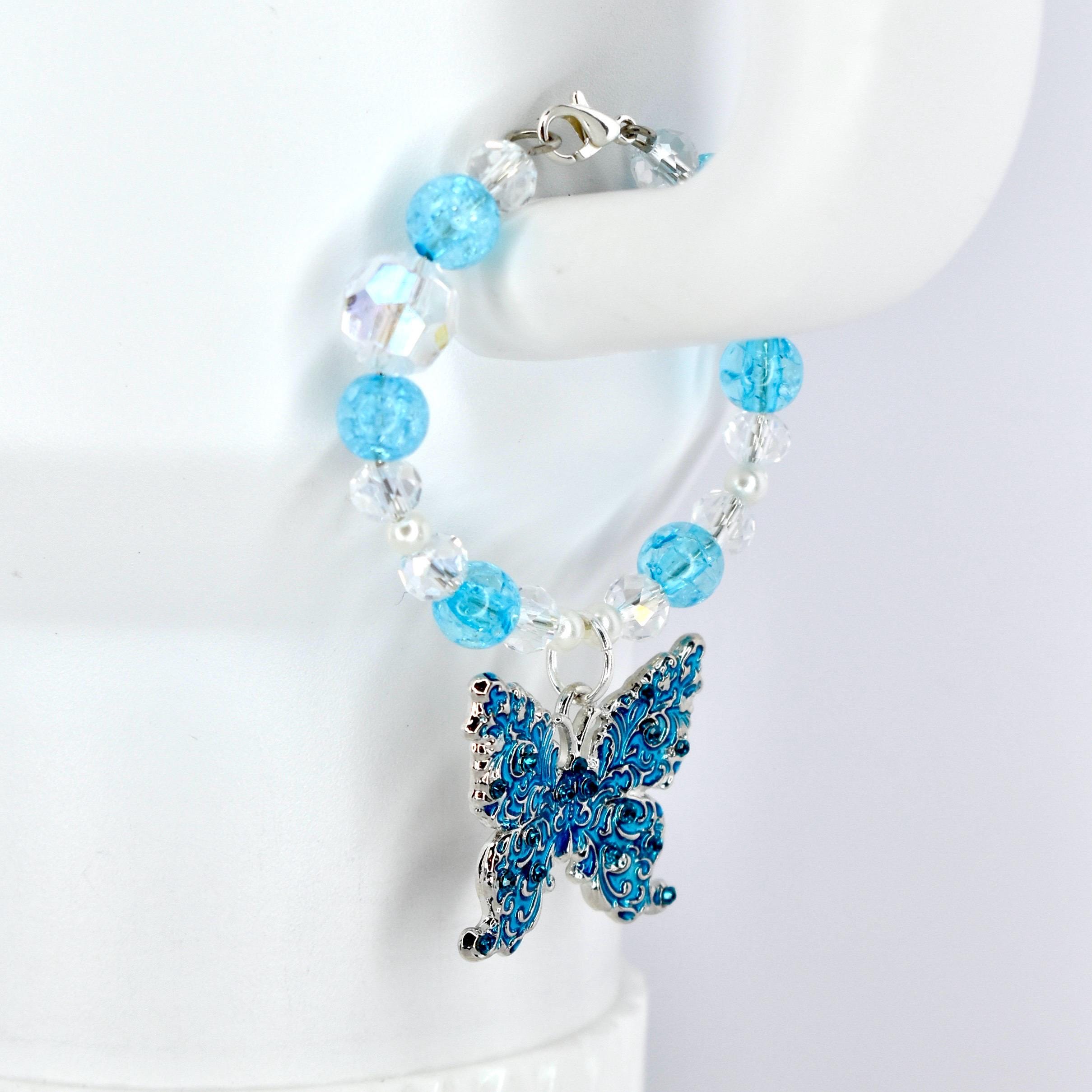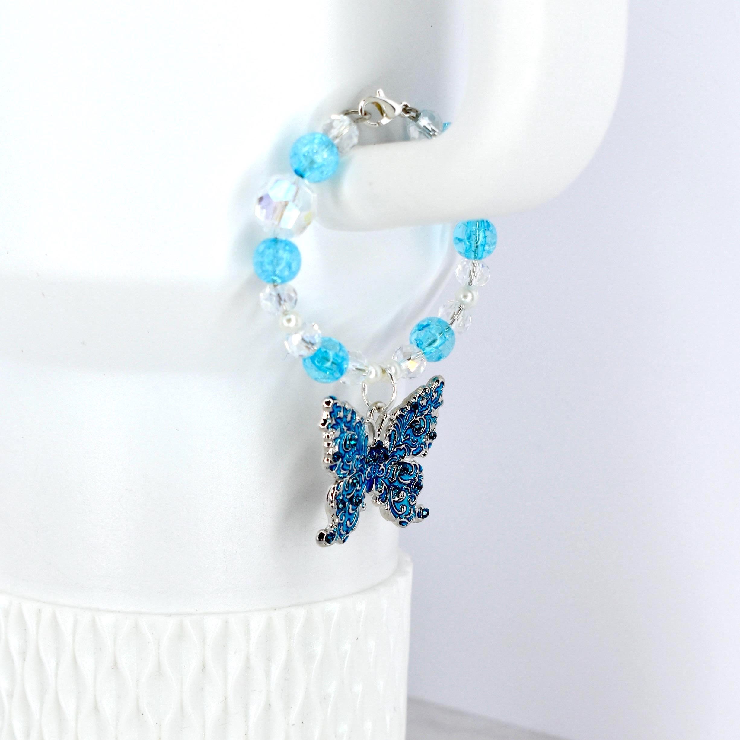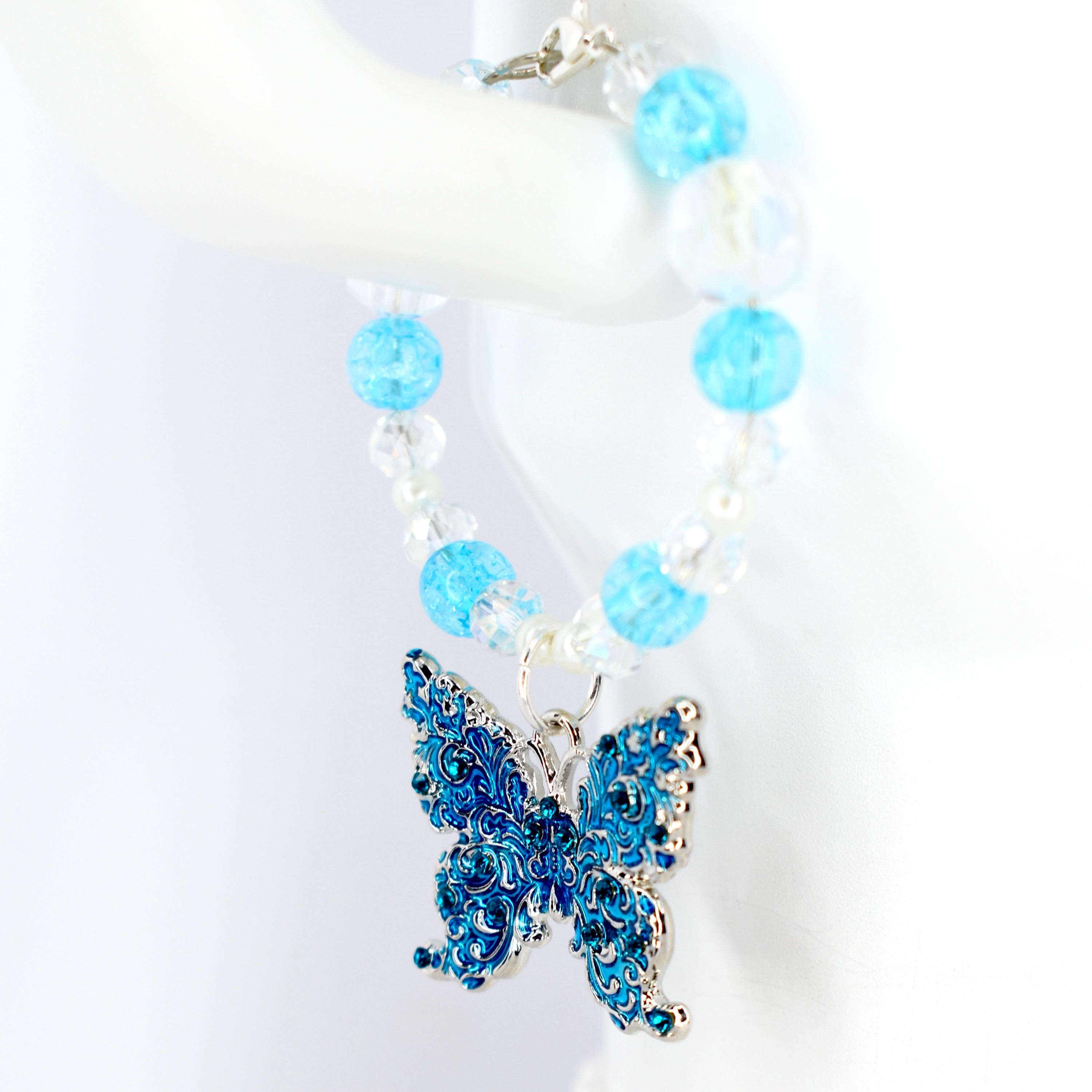 This stunning butterfly tumbler handle charm features a dreamy blue and crystal color palette with iridescent clear beads and bright turquoise crackle glass accents.