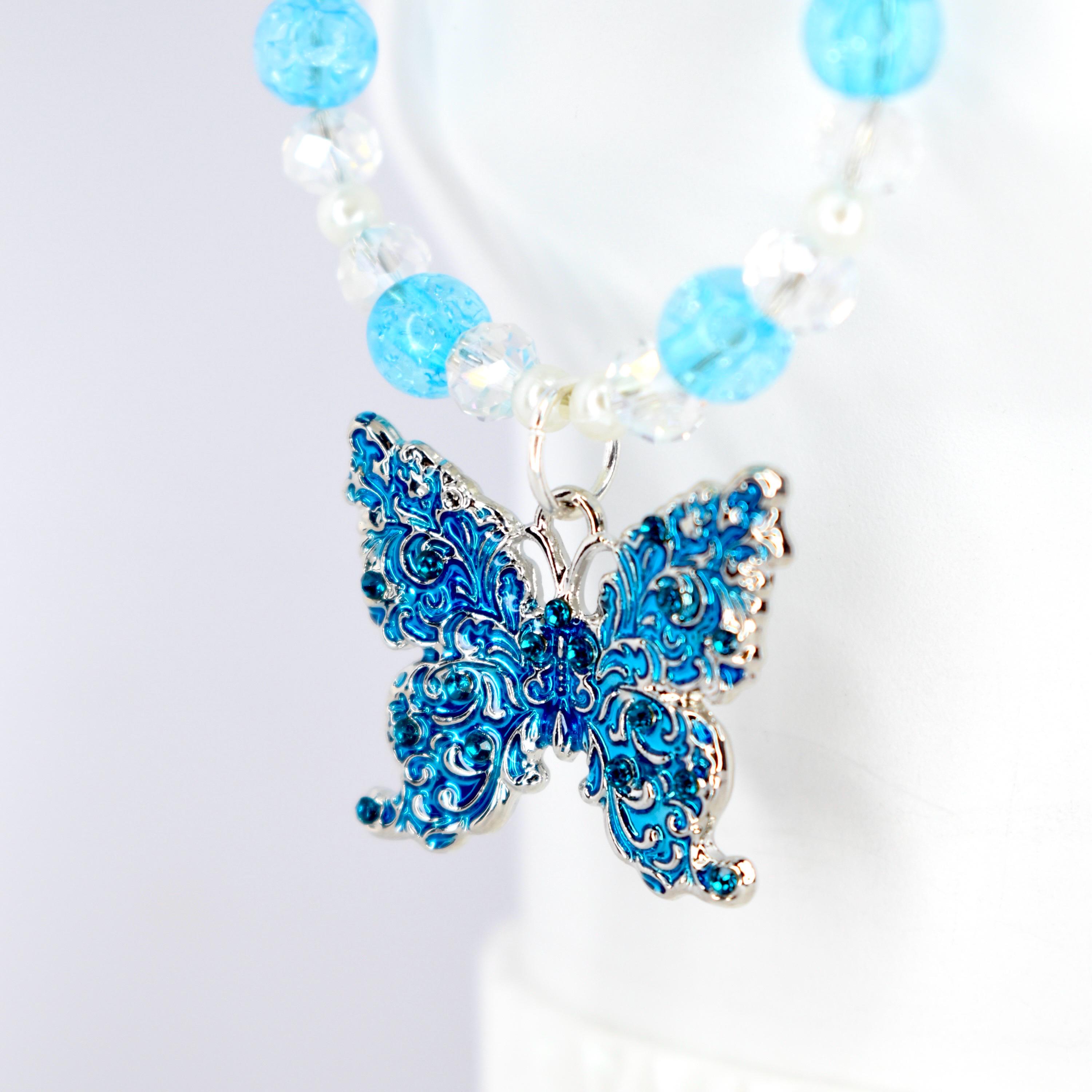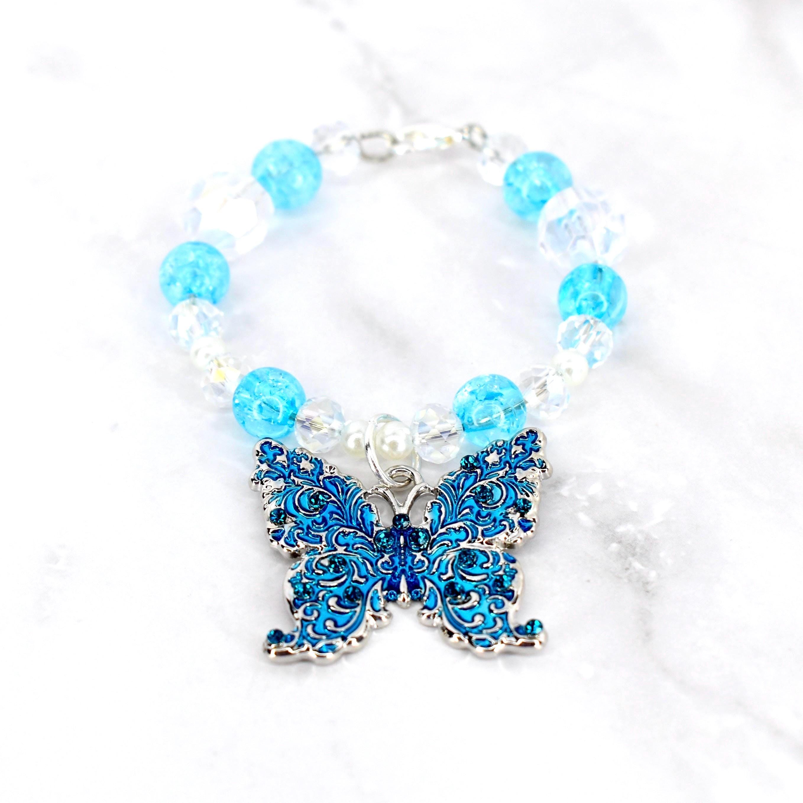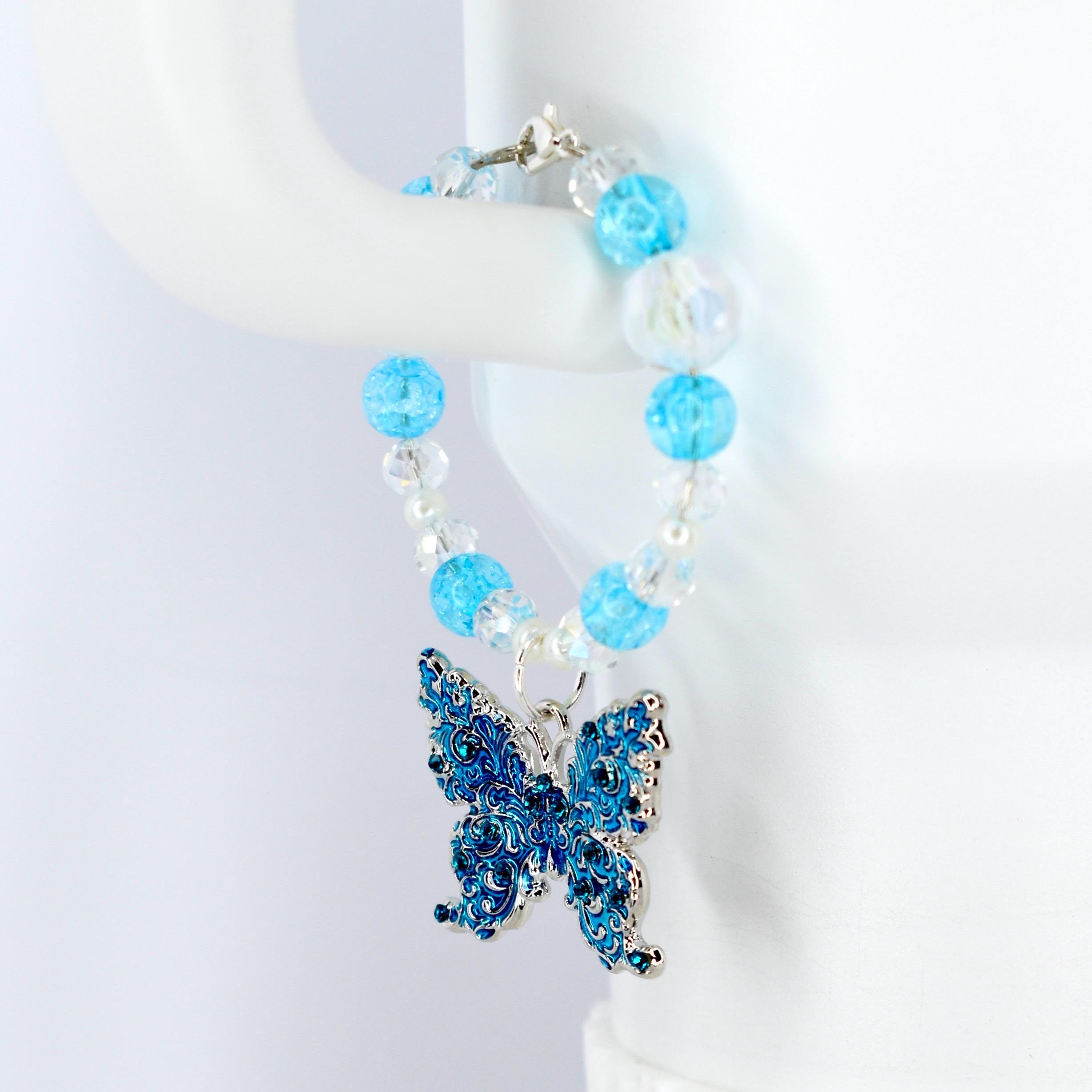 This stunning butterfly tumbler handle charm features a dreamy blue and crystal color palette with iridescent clear beads and bright turquoise crackle glass accents.