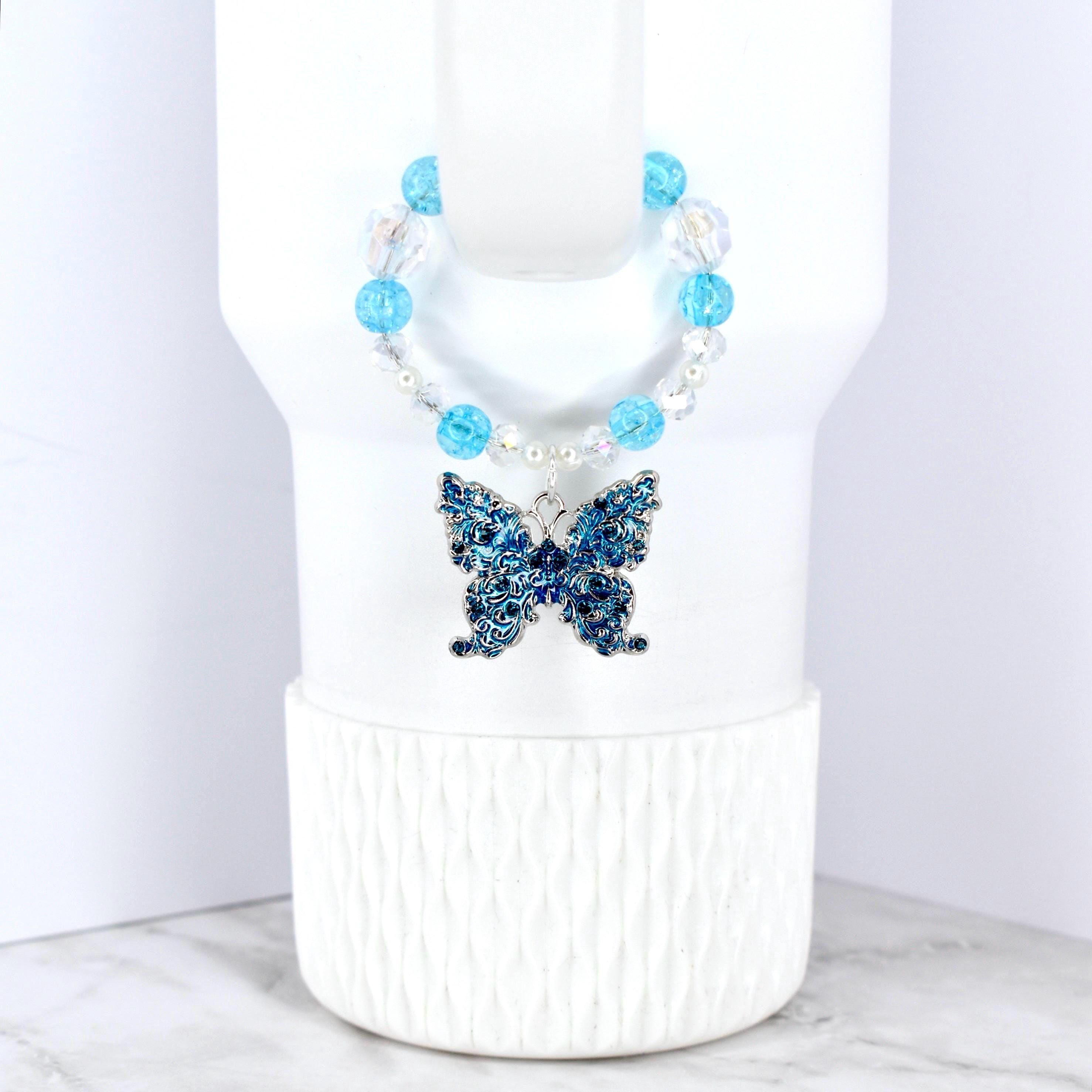 The ornate silver-tone butterfly charm showcases intricate filigree detail in vibrant blue enamel, adding an elegant touch to any tumbler handle.