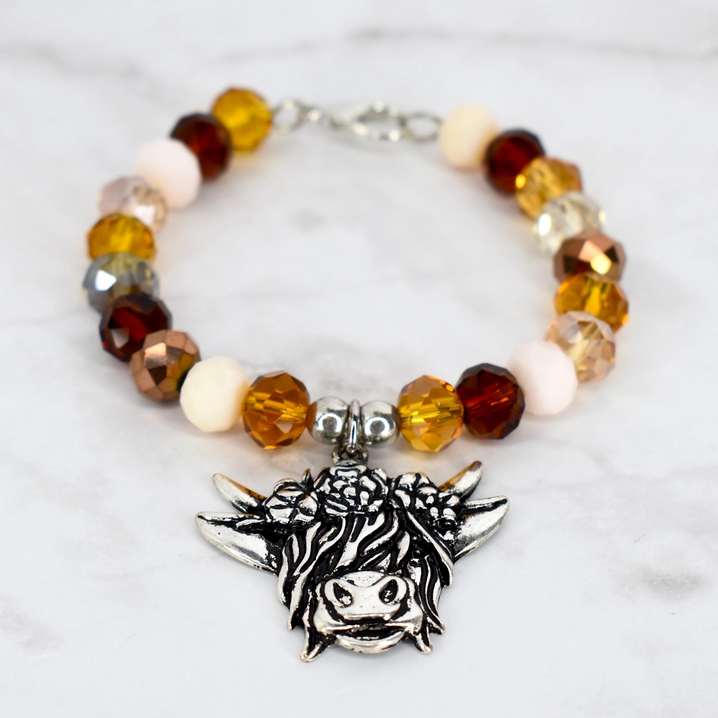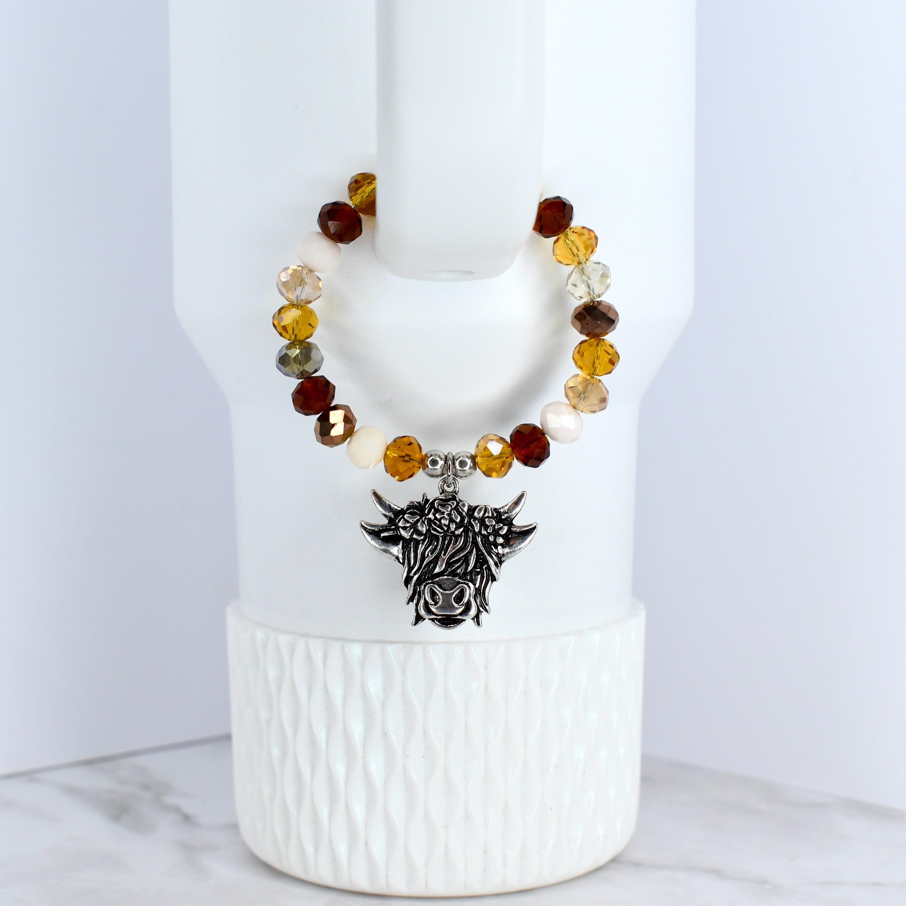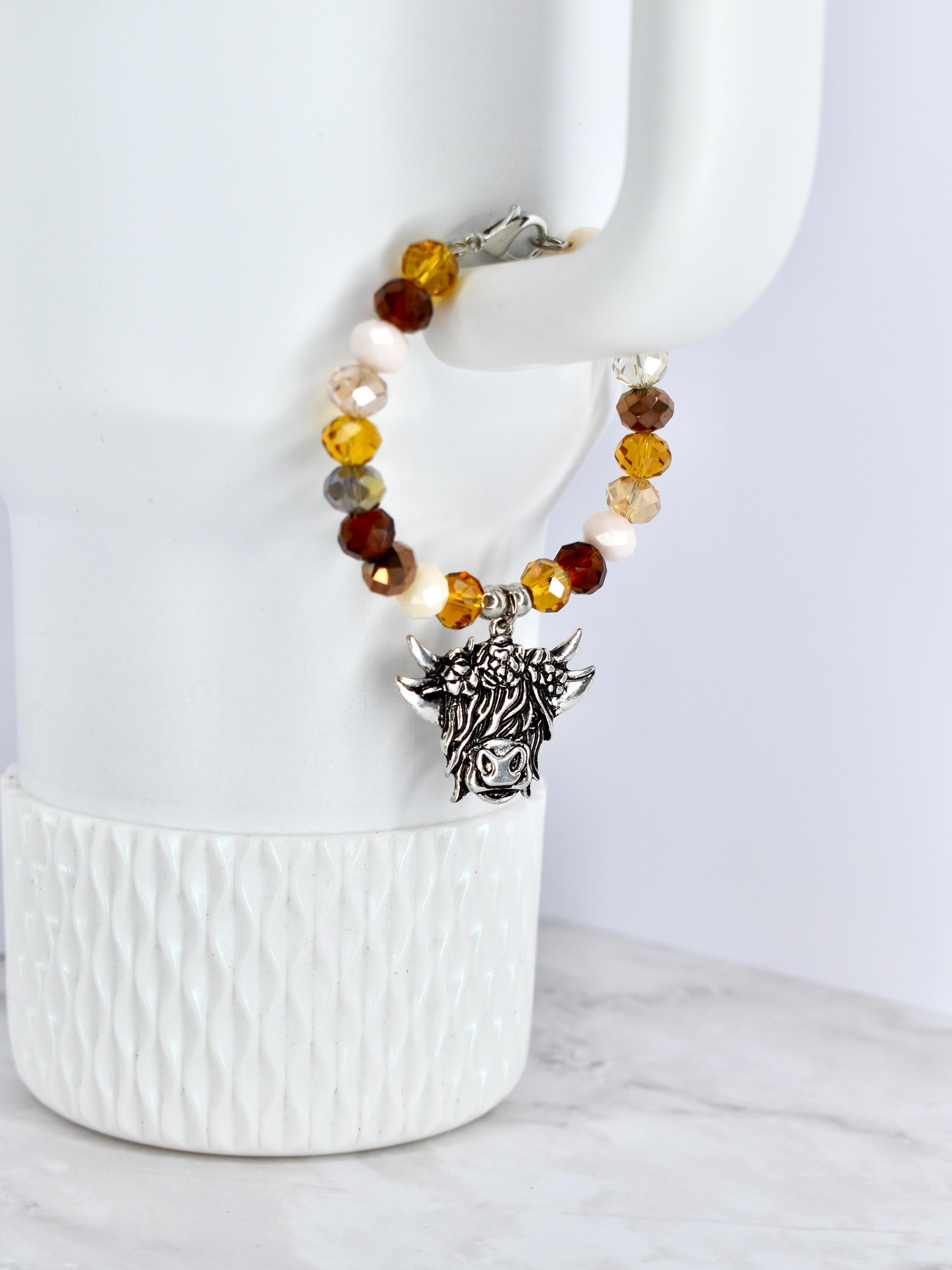 This charming highland cow tumbler charm features a warm color palette of amber, topaz and cream glass beads paired with metallic bronze and clear crystal accents.