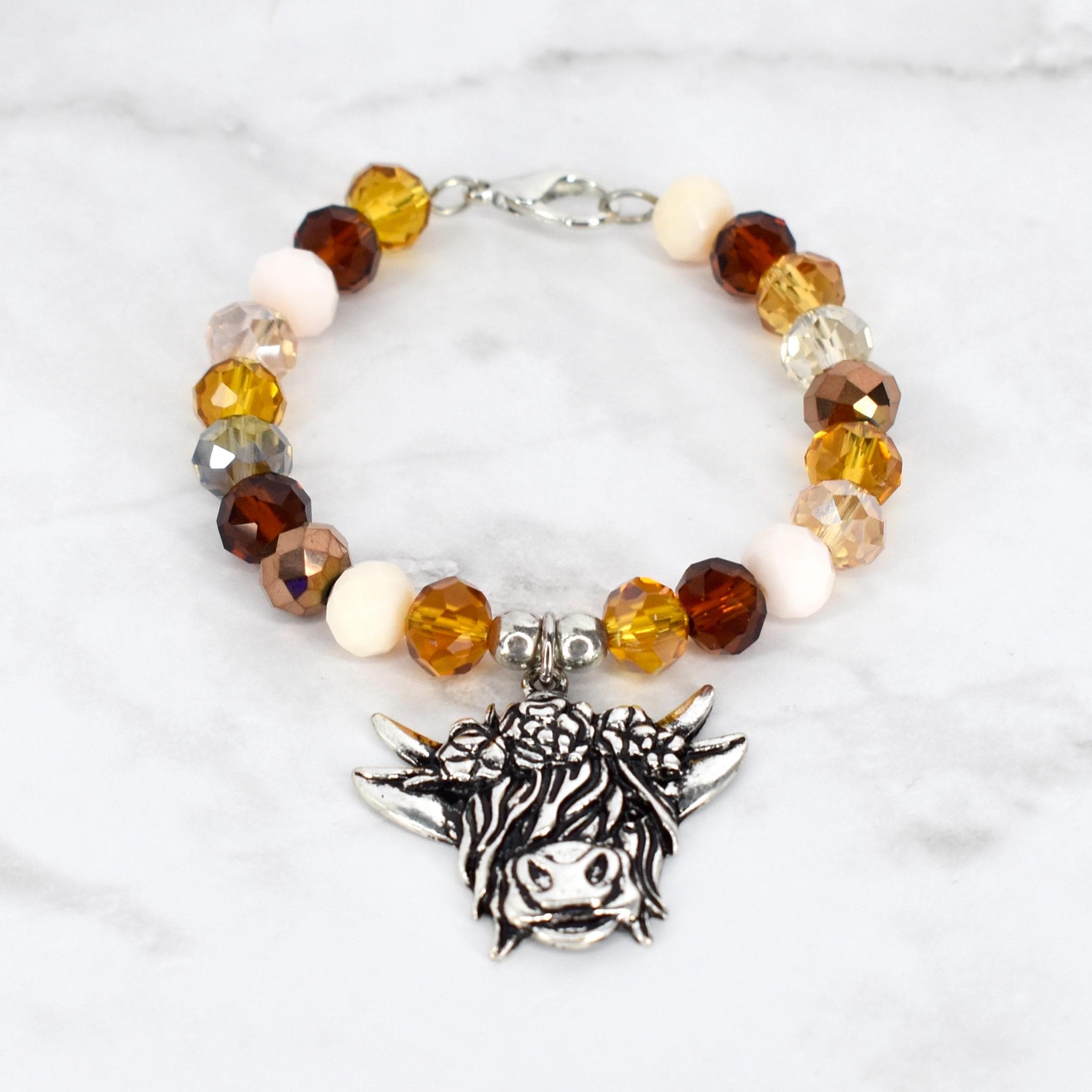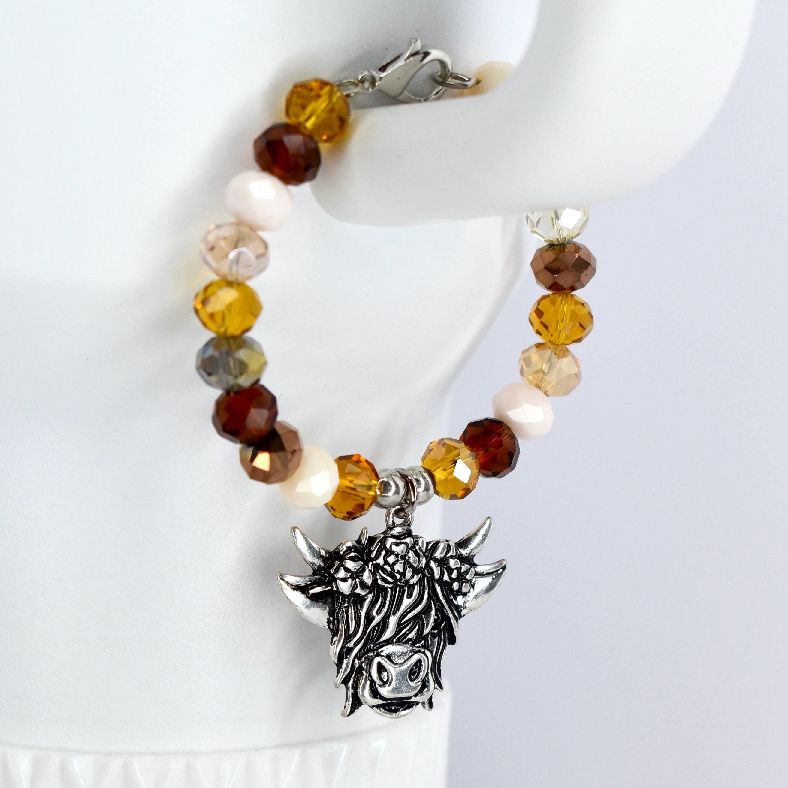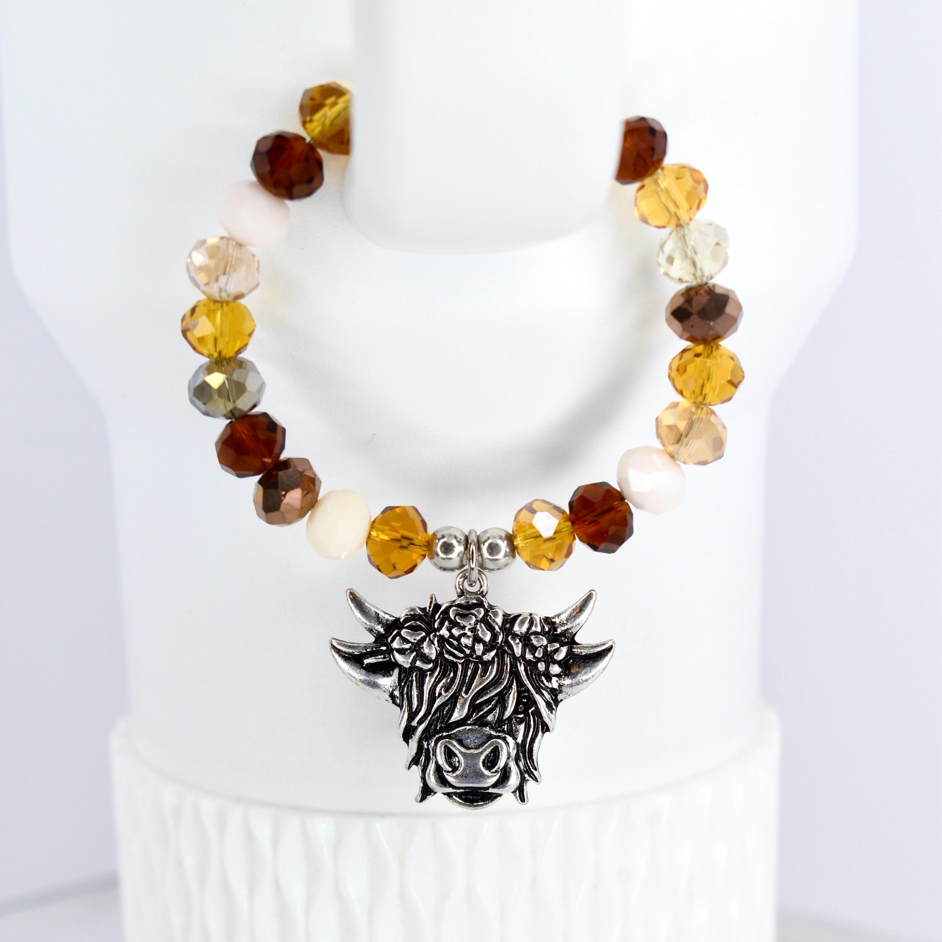 This charming highland cow tumbler charm features a warm color palette of amber, topaz and cream glass beads paired with metallic bronze and clear crystal accents.