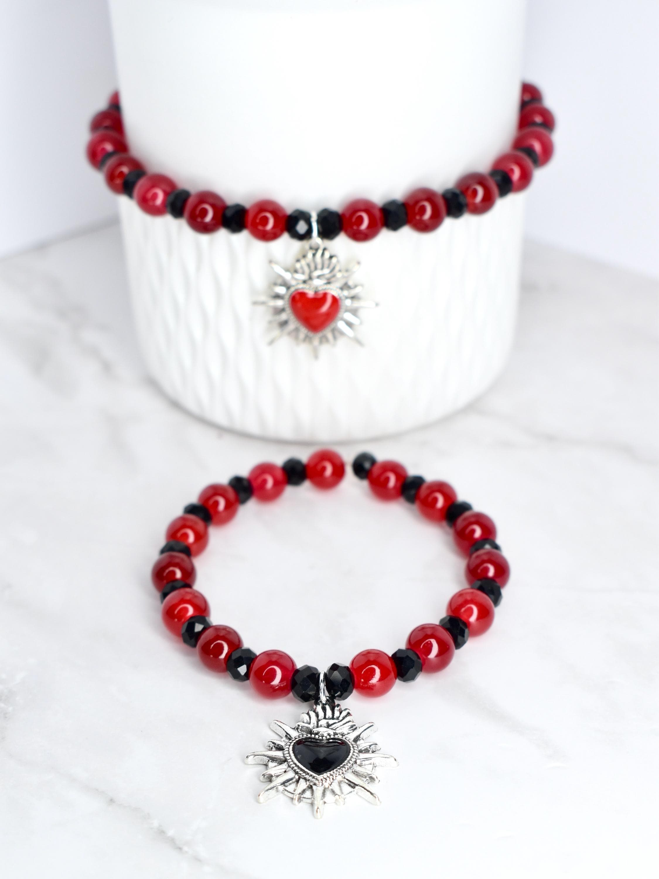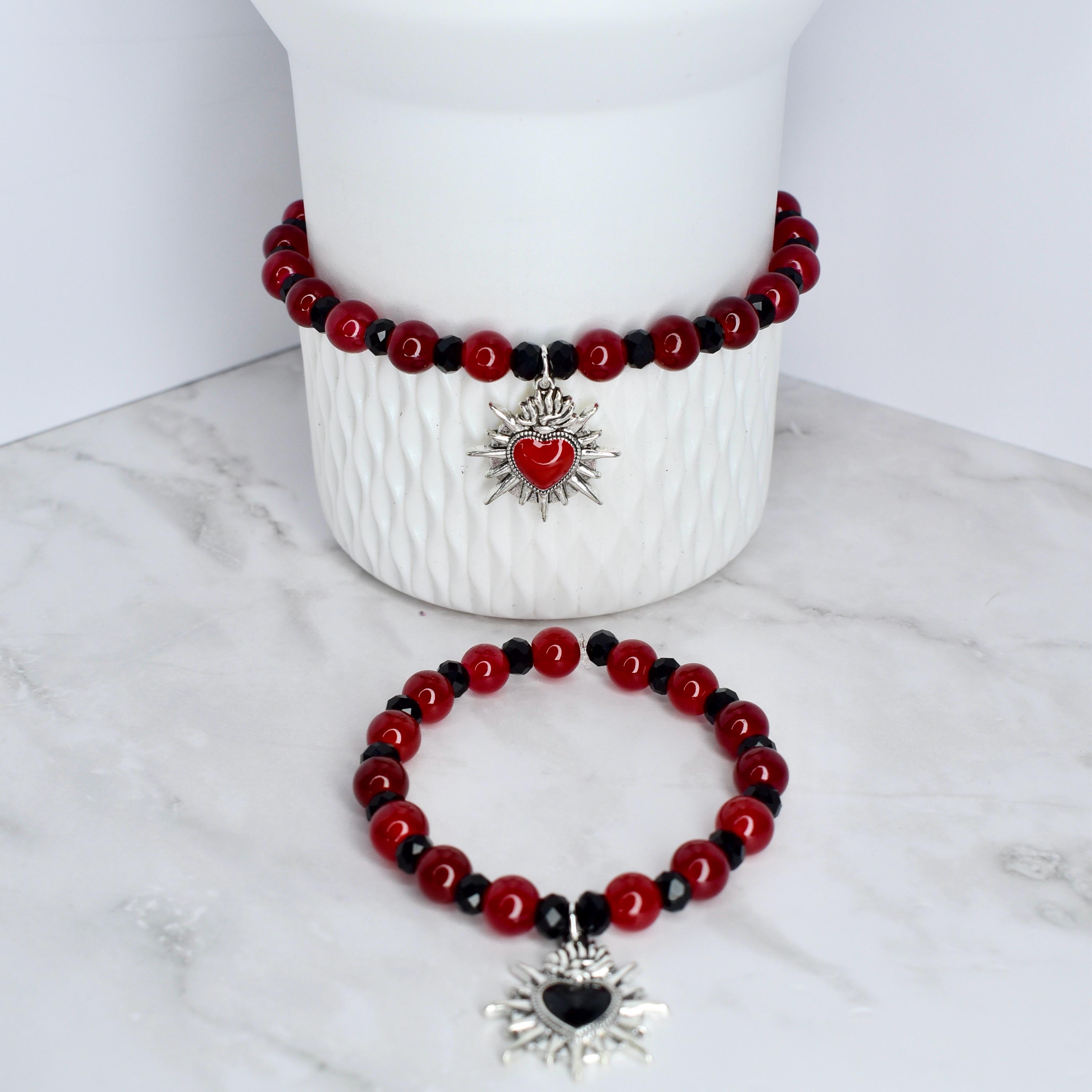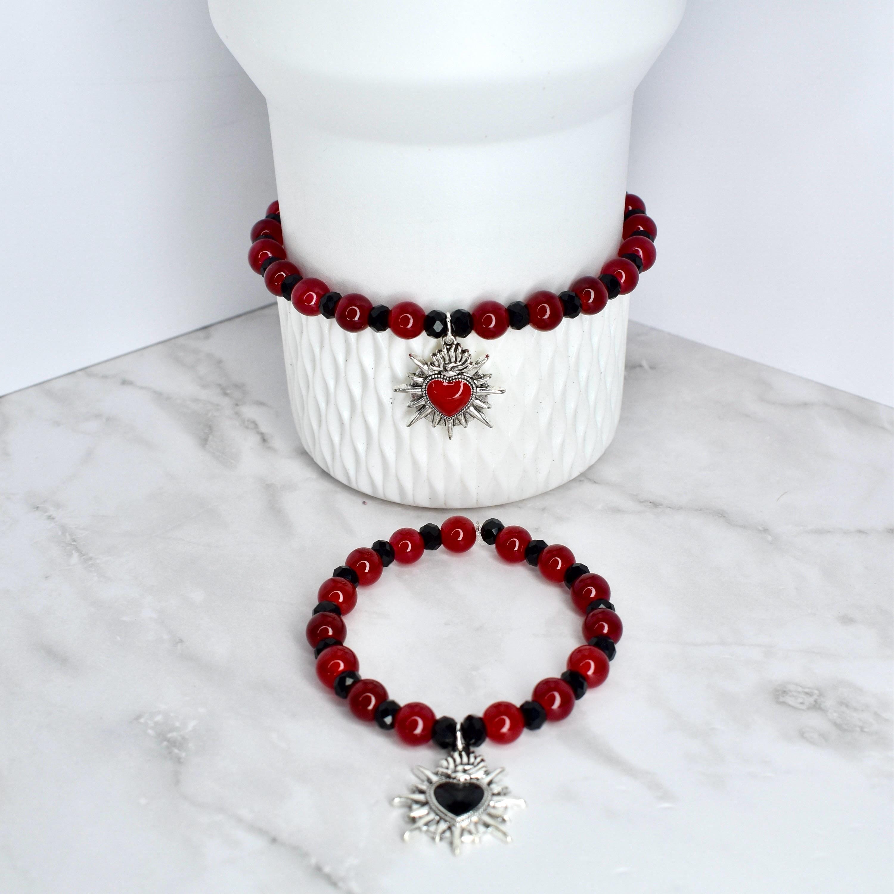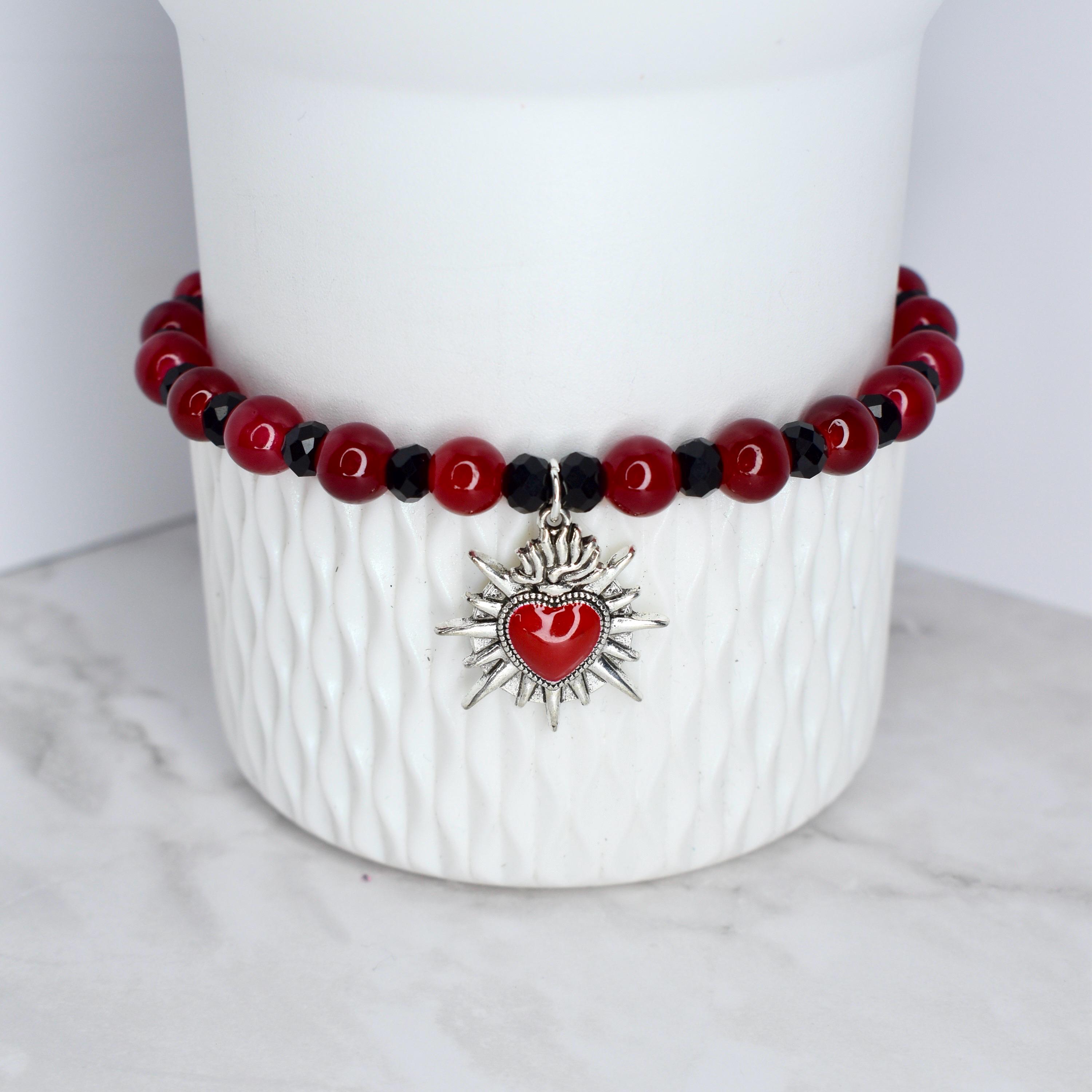 Express your devotion with these stunning sacred heart bracelets! Available in two beautiful variations, each features vibrant red glass beads paired with black faceted crystals and a silver-tone sacred heart charm. Perfect for faith-based style, Valentine’s Day, or anyone who loves meaningful jewelry.