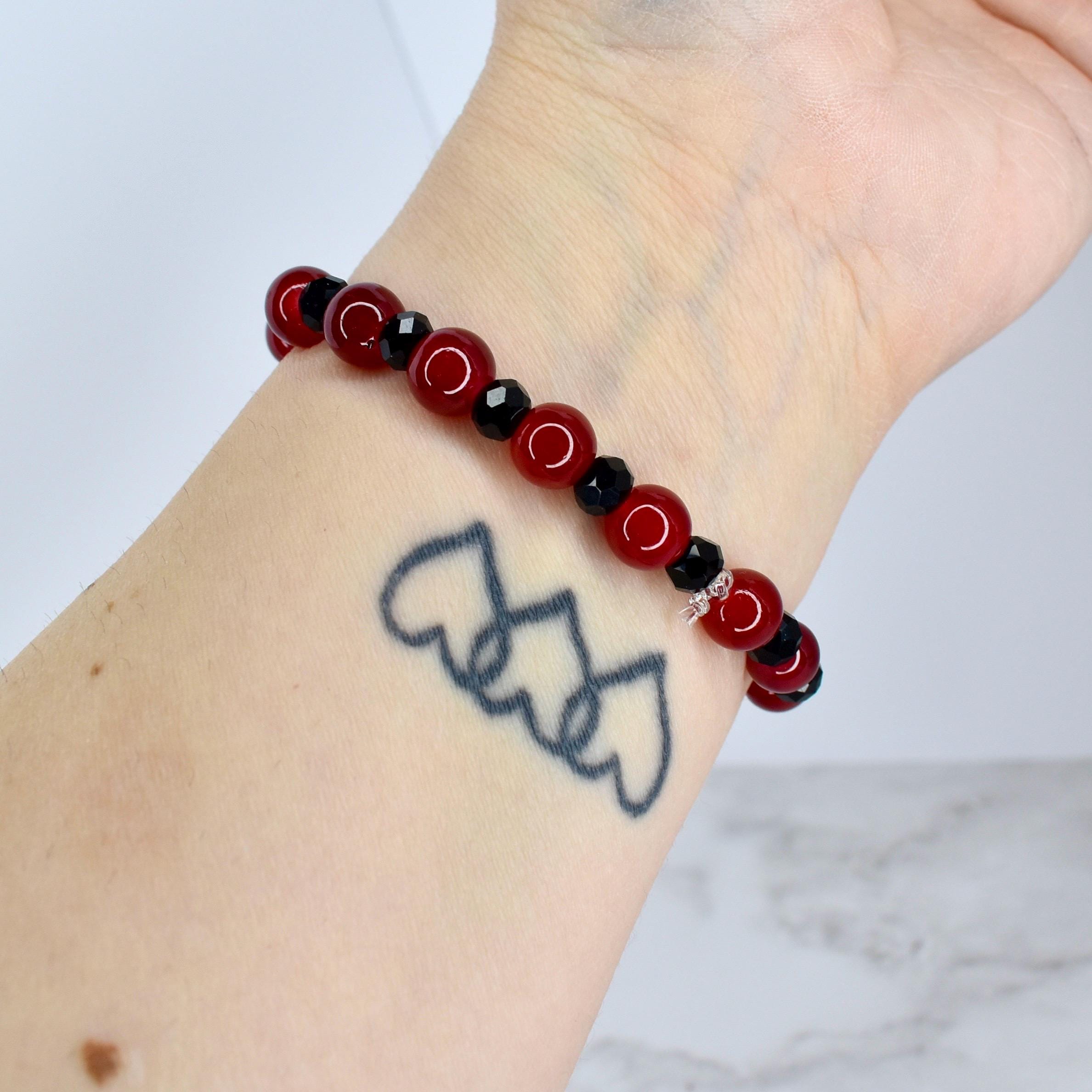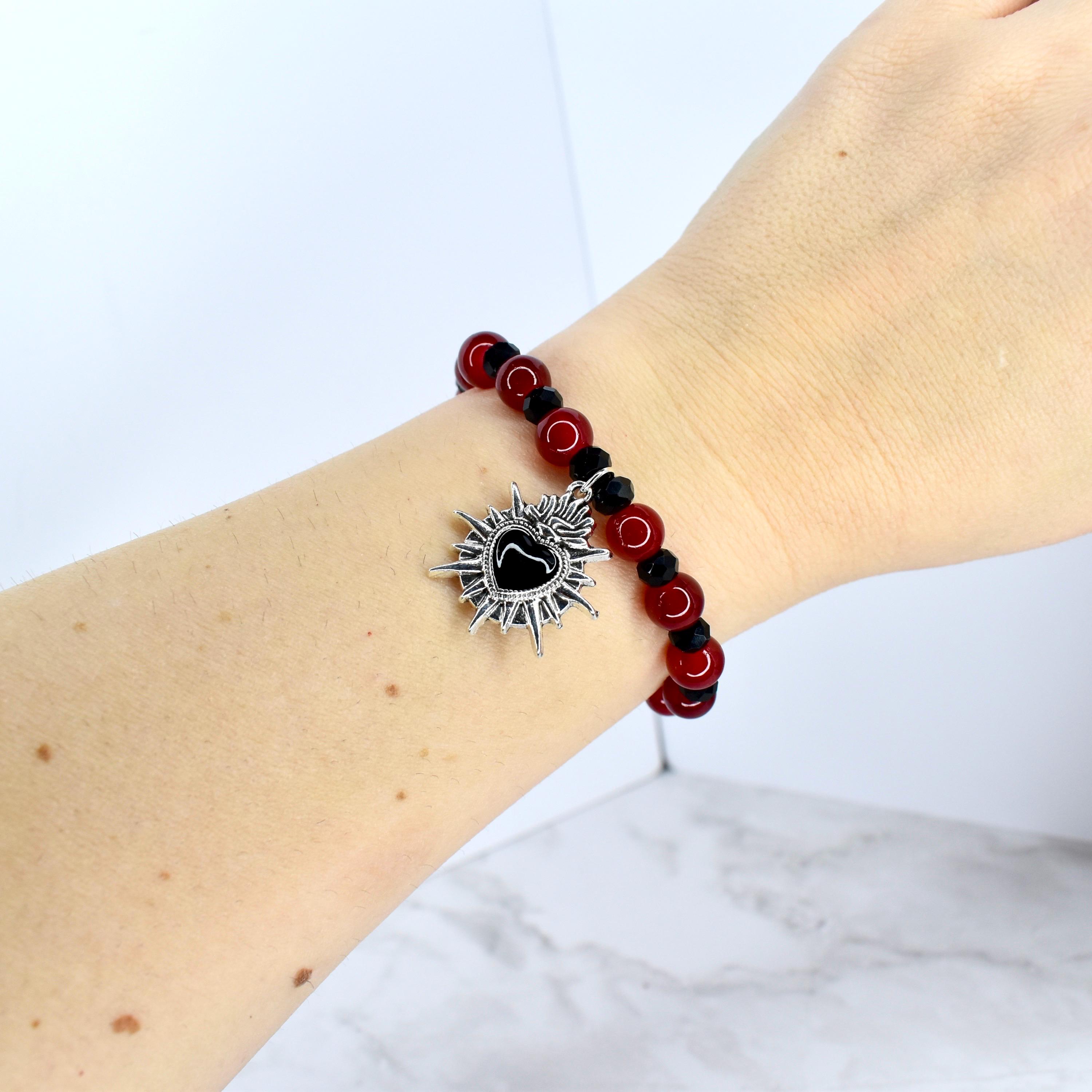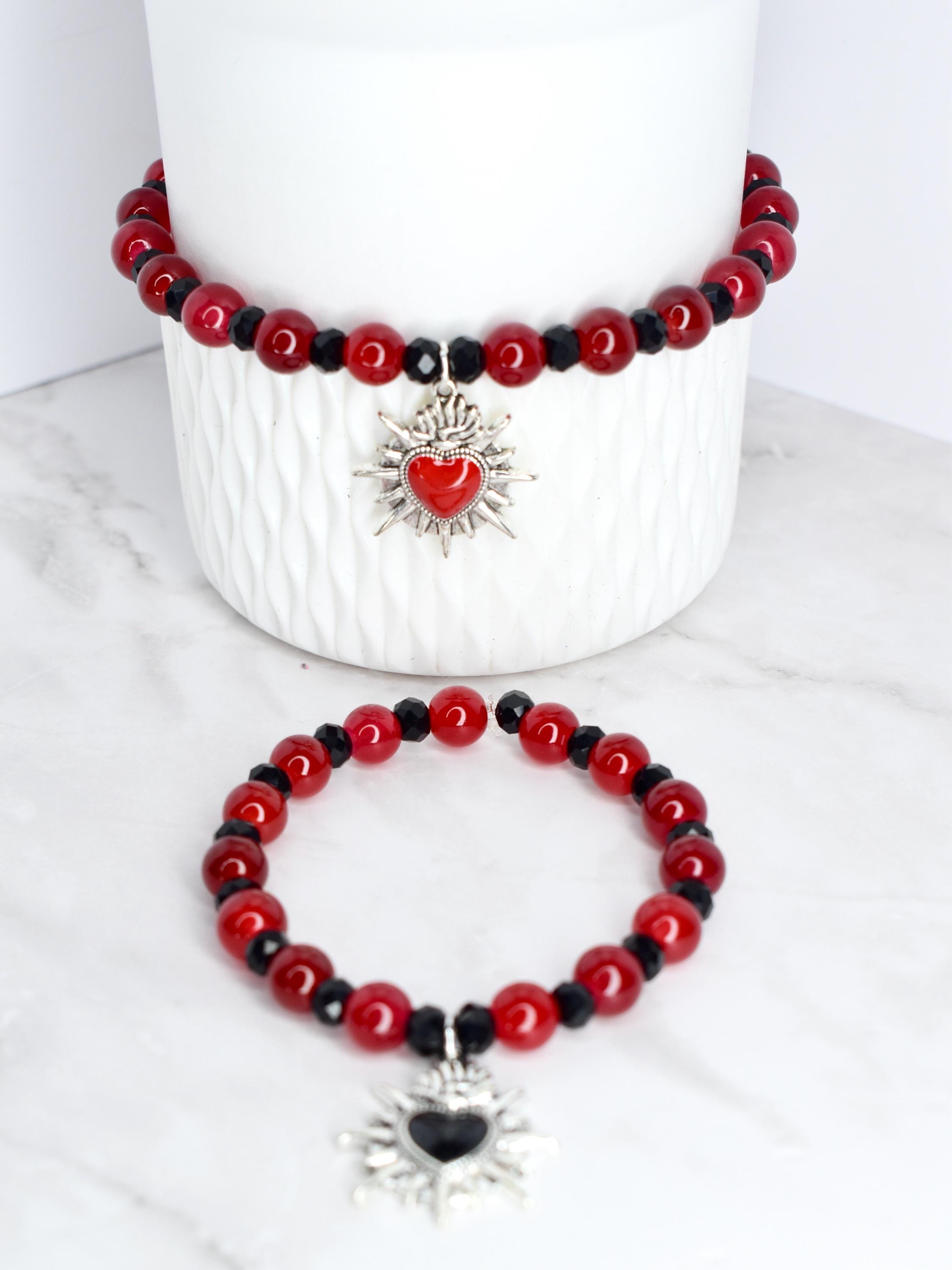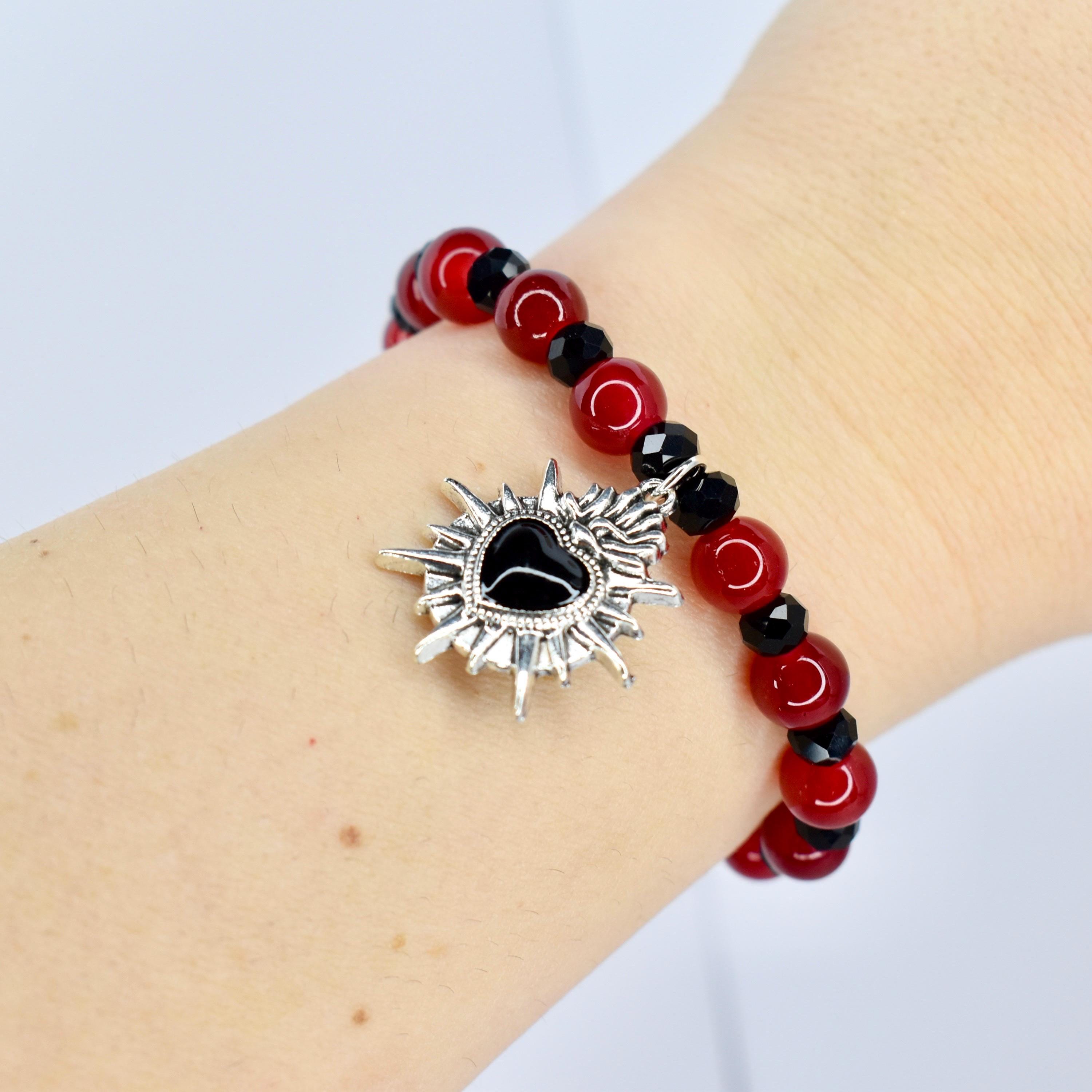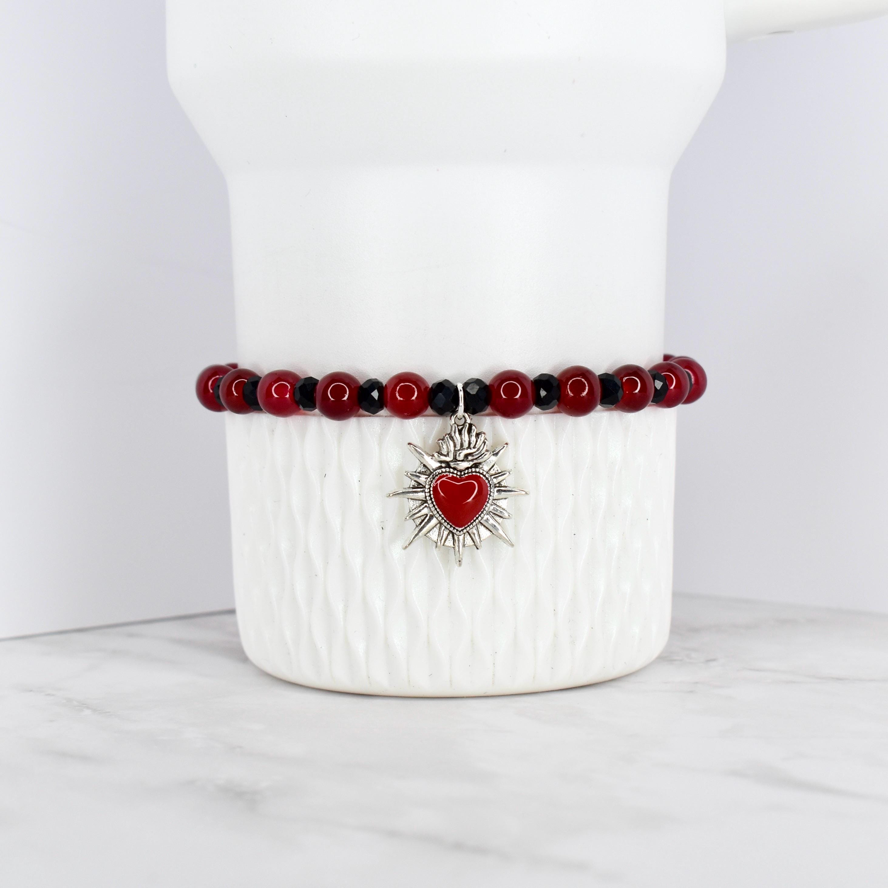Express your devotion with these stunning sacred heart bracelets! Available in two beautiful variations, each features vibrant red glass beads paired with black faceted crystals and a silver-tone sacred heart charm. Perfect for faith-based style, Valentine’s Day, or anyone who loves meaningful jewelry.