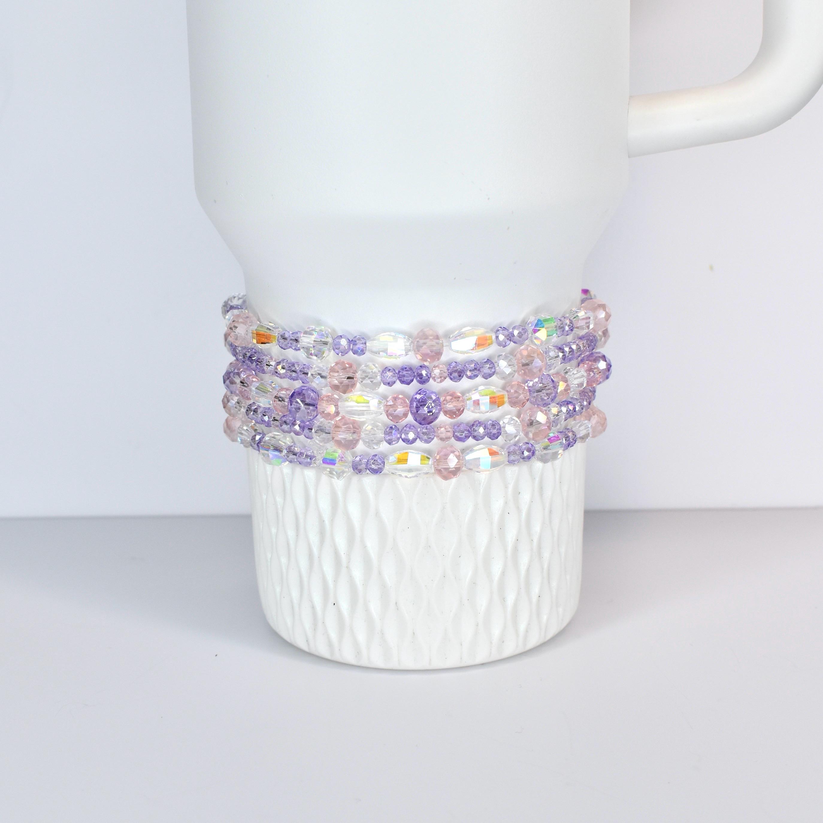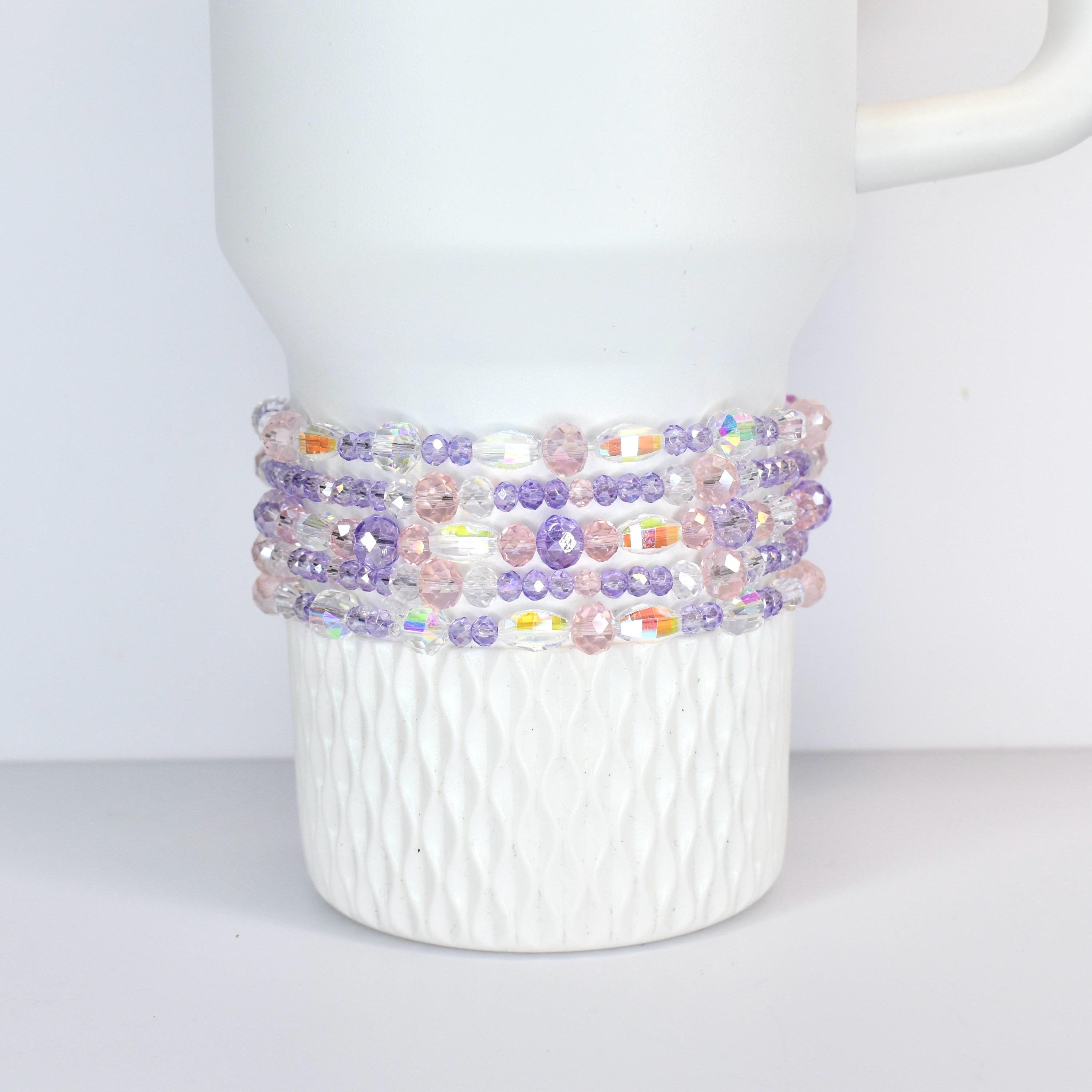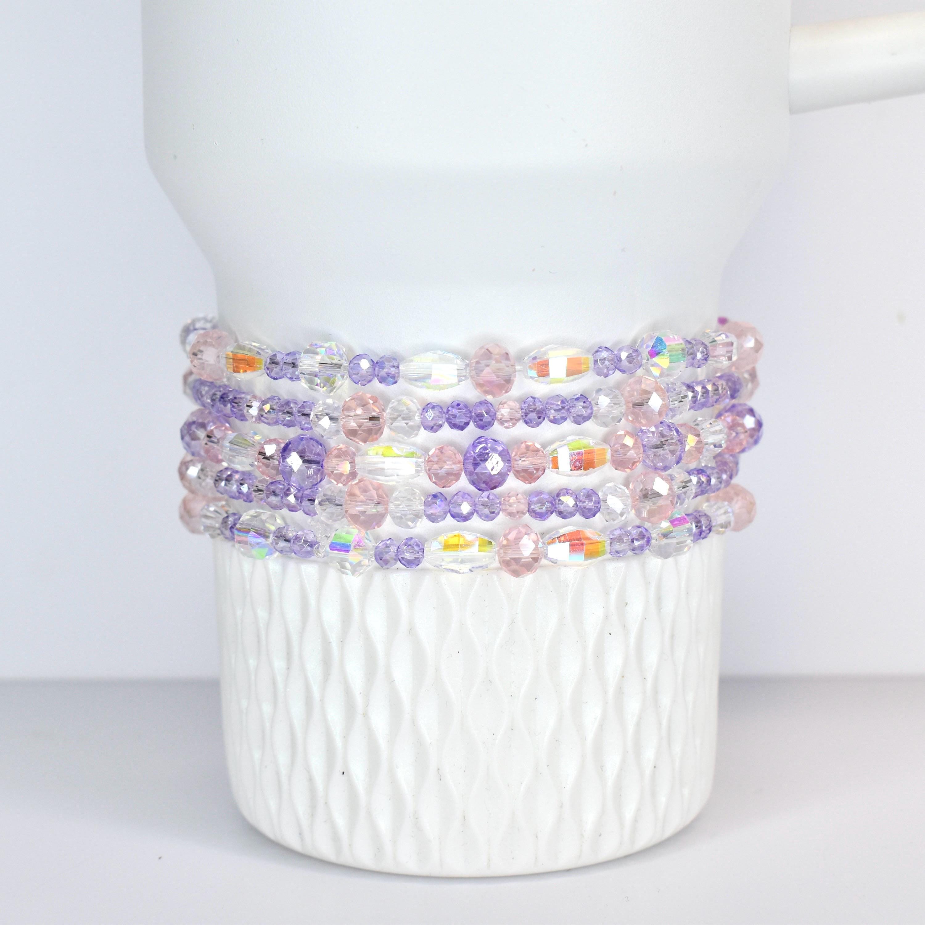 Each bracelet in this stack showcases faceted glass beads with gorgeous aurora borealis (AB) coating that catches the light beautifully. The soft purple and pink tones create a feminine, sophisticated look that complements any outfit or tumbler.