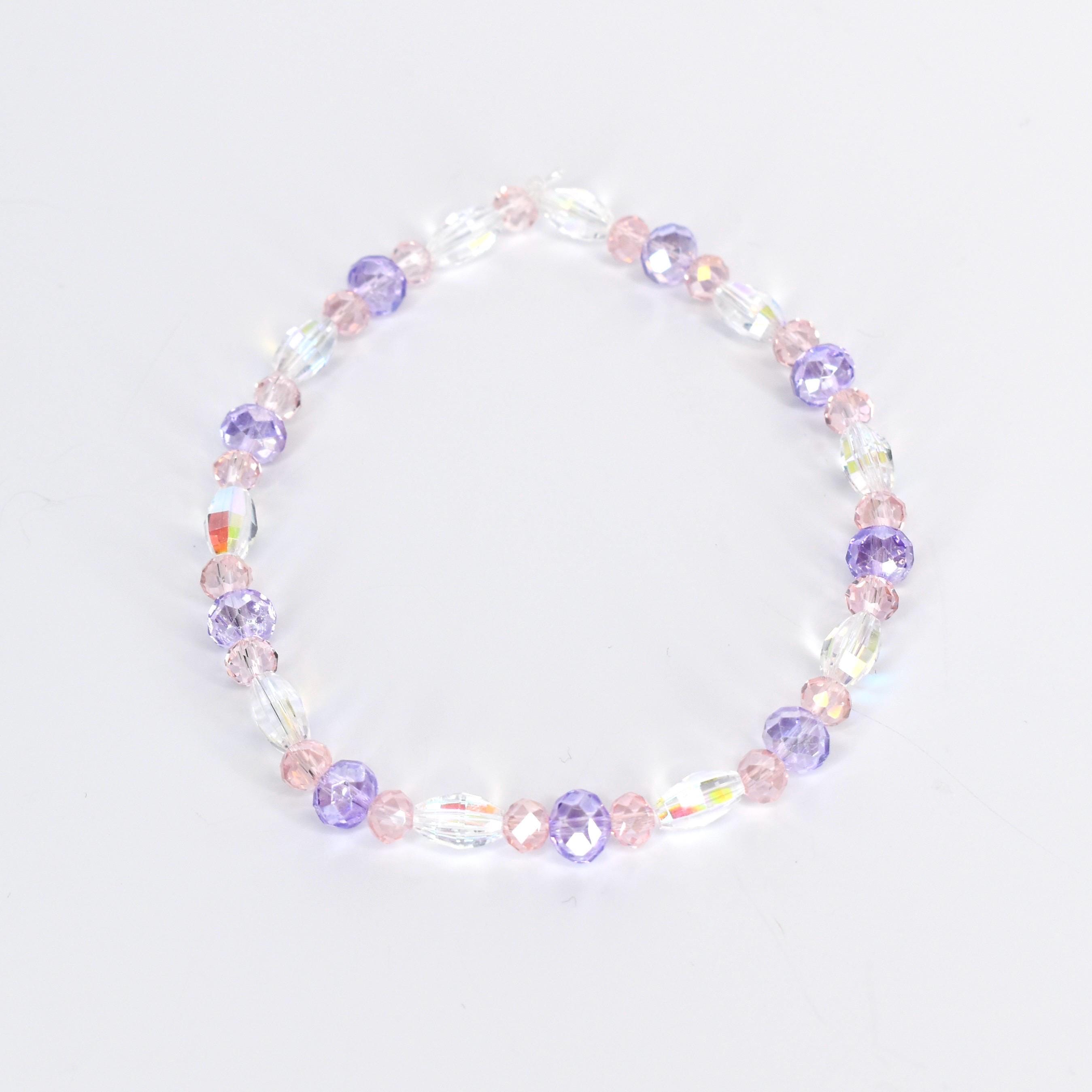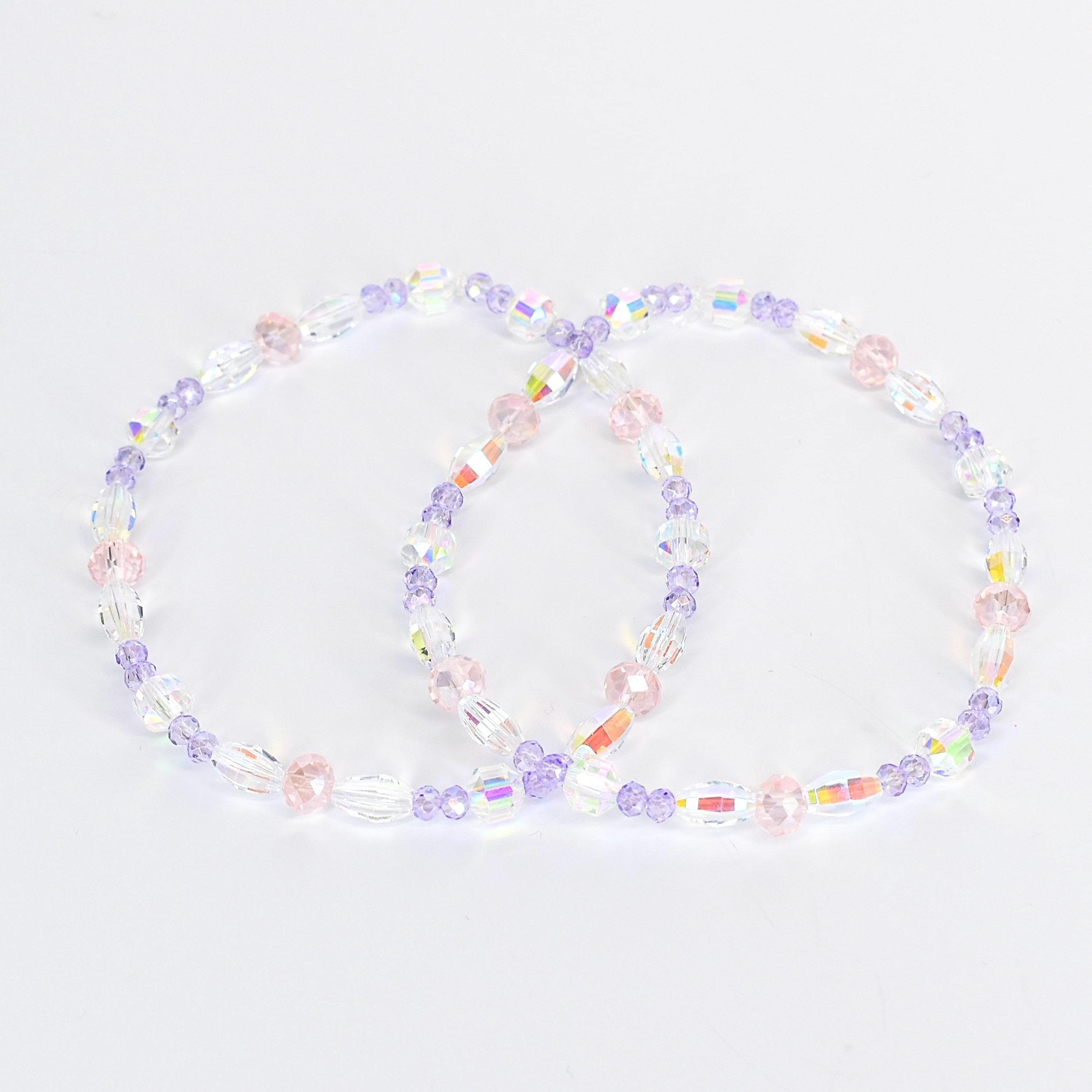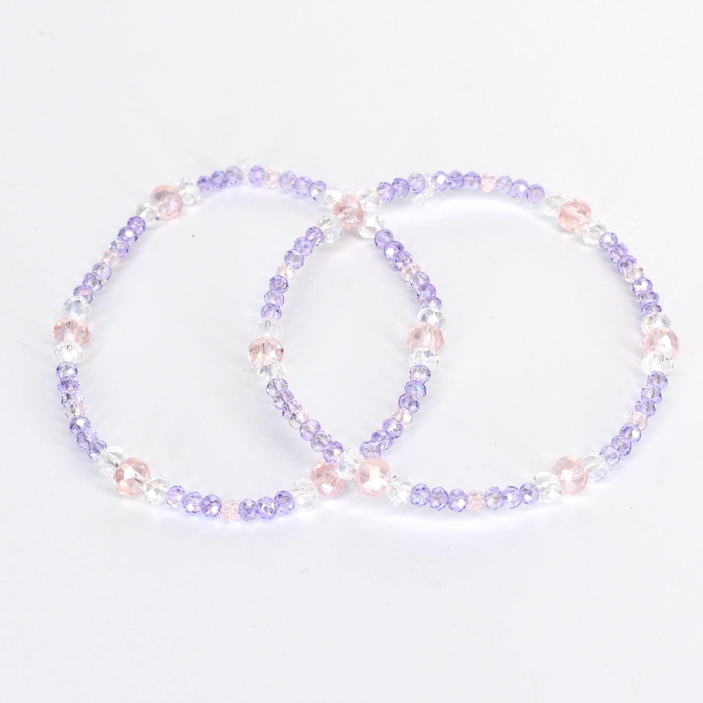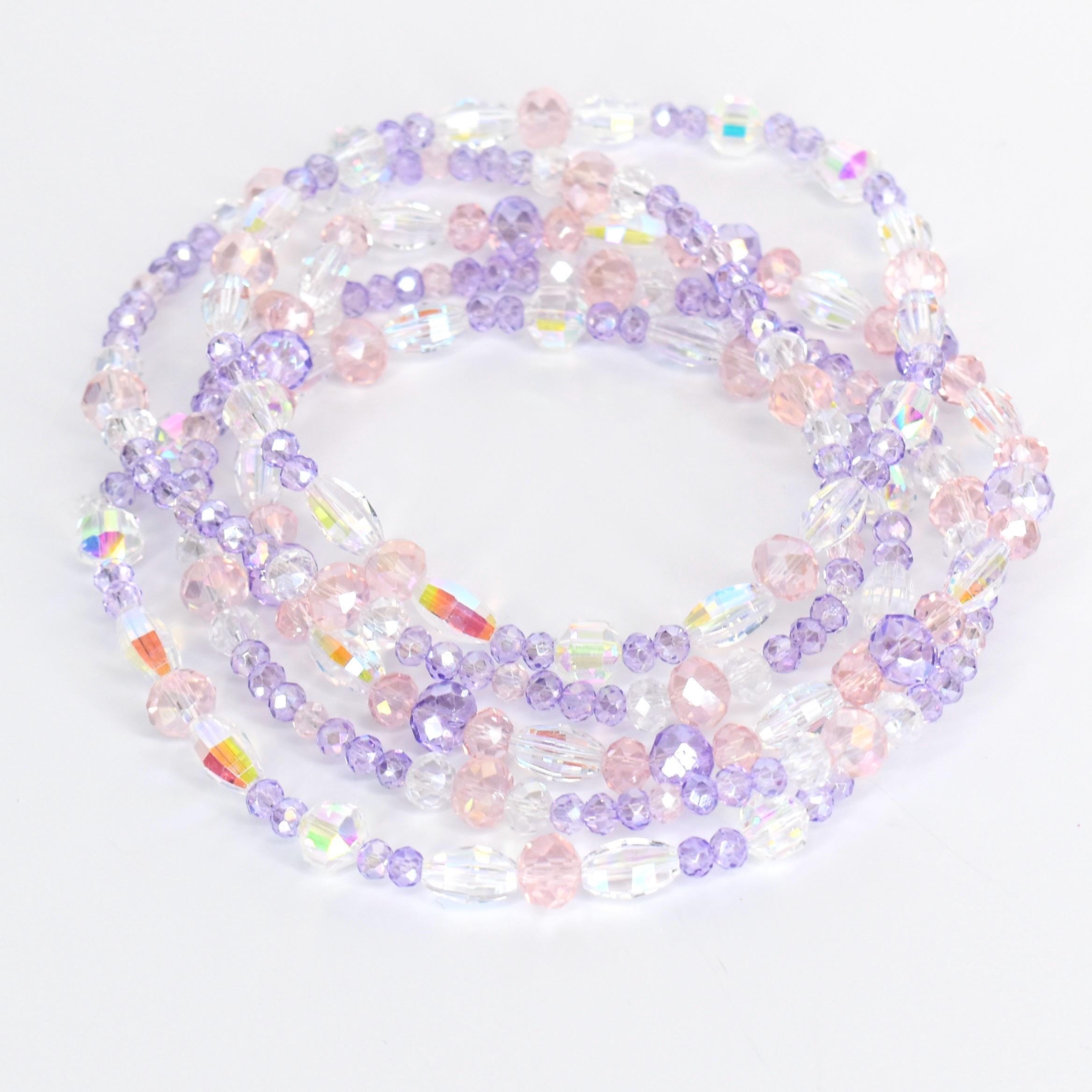 Each bracelet in this stack showcases faceted glass beads with gorgeous aurora borealis (AB) coating that catches the light beautifully. The soft purple and pink tones create a feminine, sophisticated look that complements any outfit or tumbler.