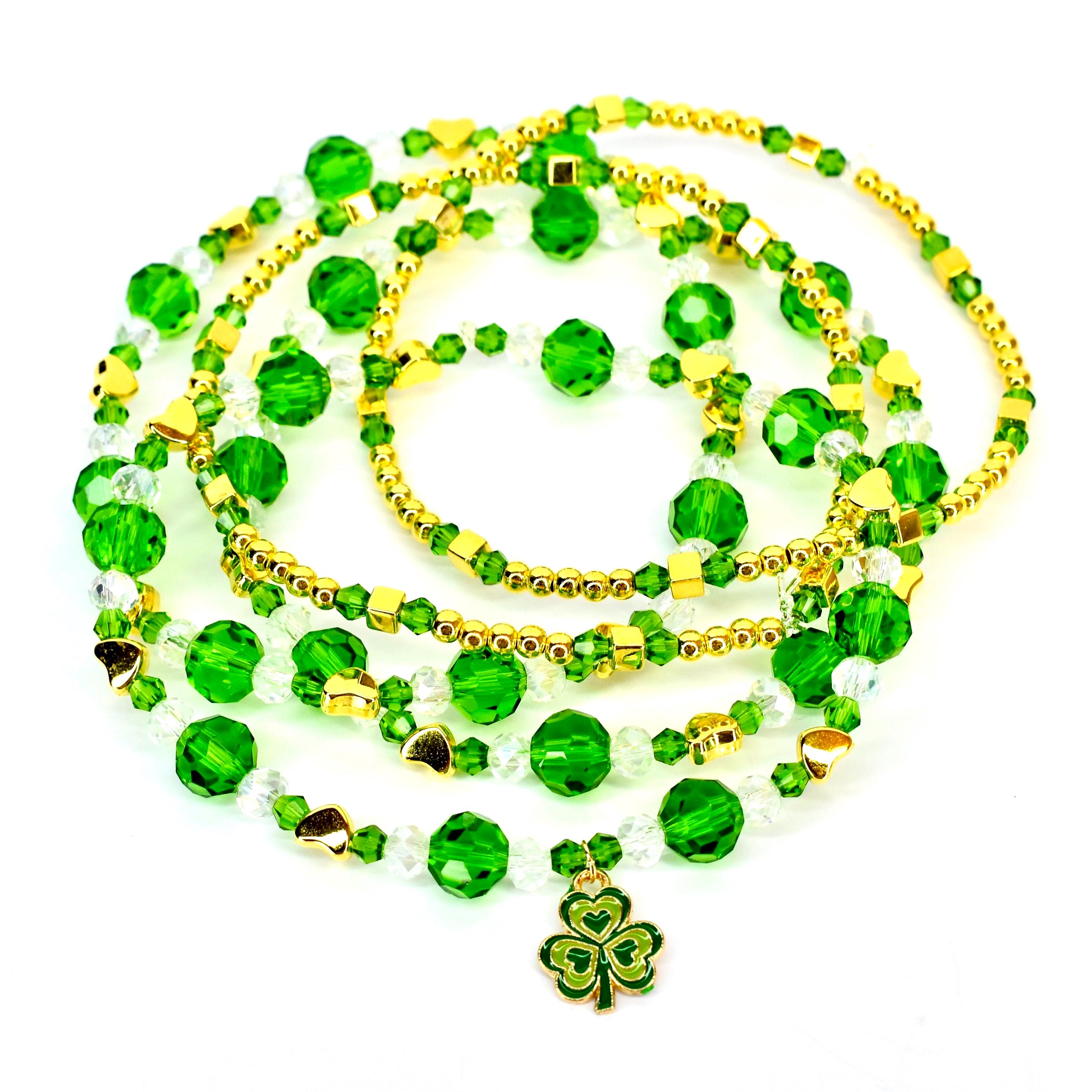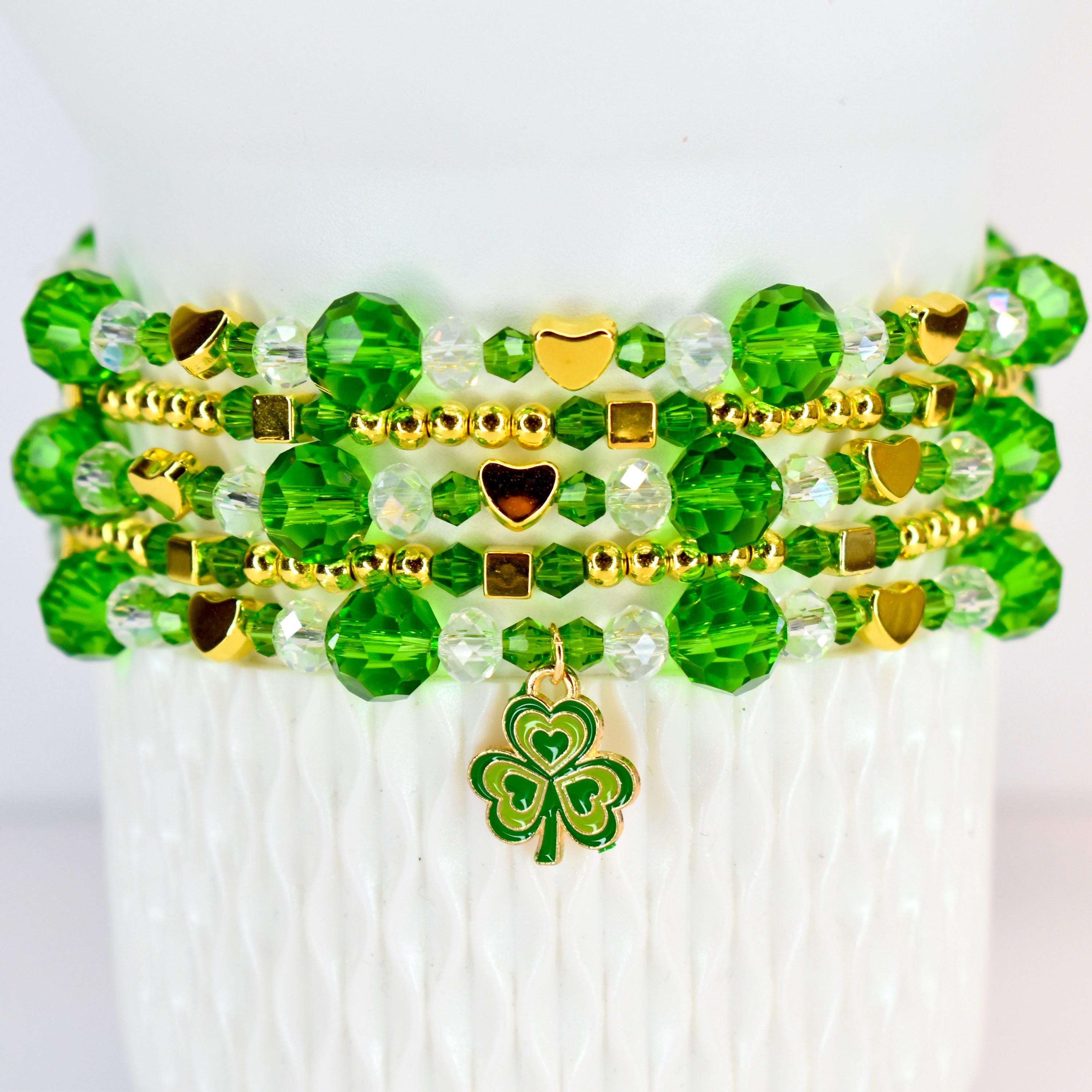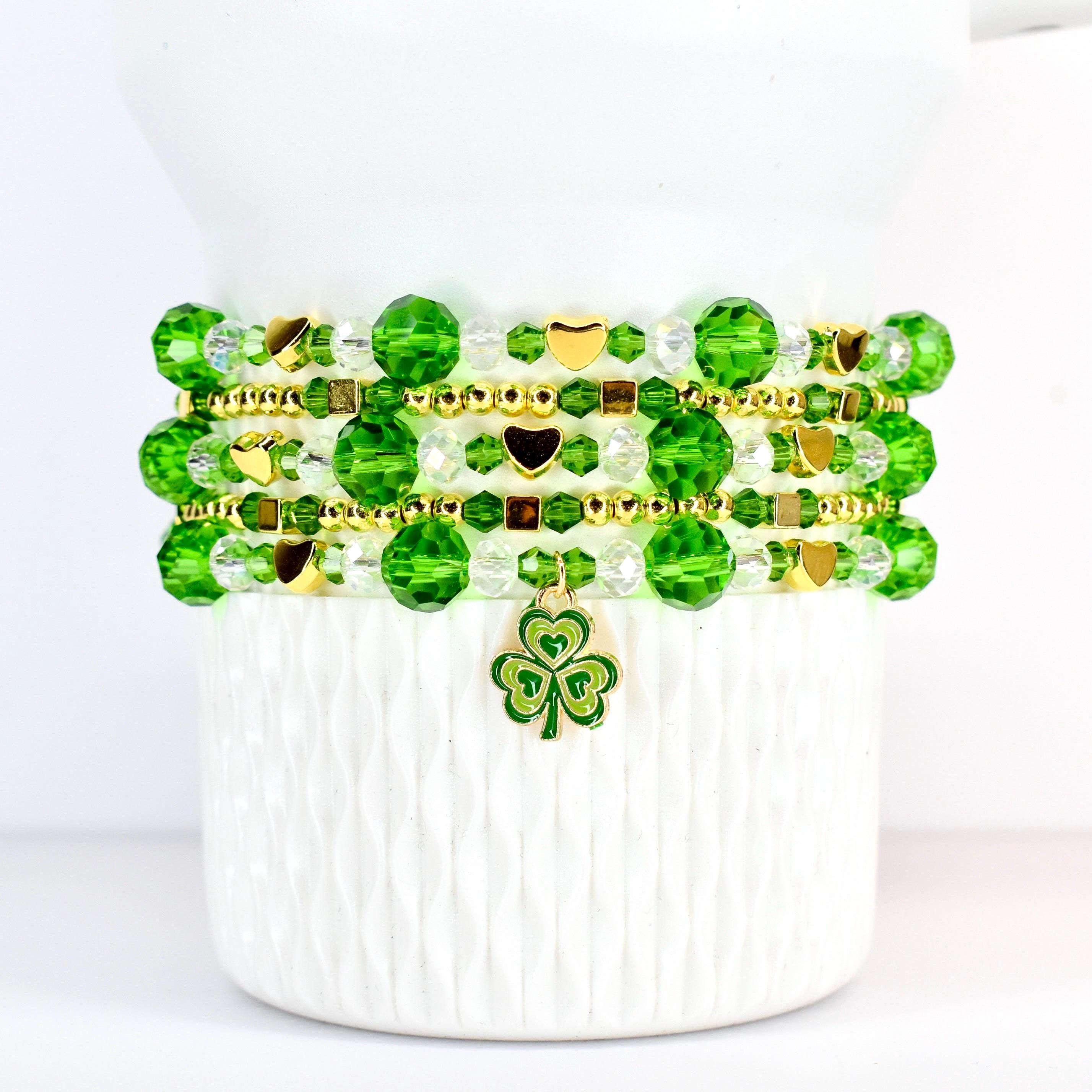 Celebrate the luck of the Irish with this sparkling St. Patrick’s Day bracelet stack! Perfect for adding festive flair to your favorite tumbler or wrist, these green and gold beaded bracelets feature a charming shamrock accent for the ultimate Irish celebration accessory.