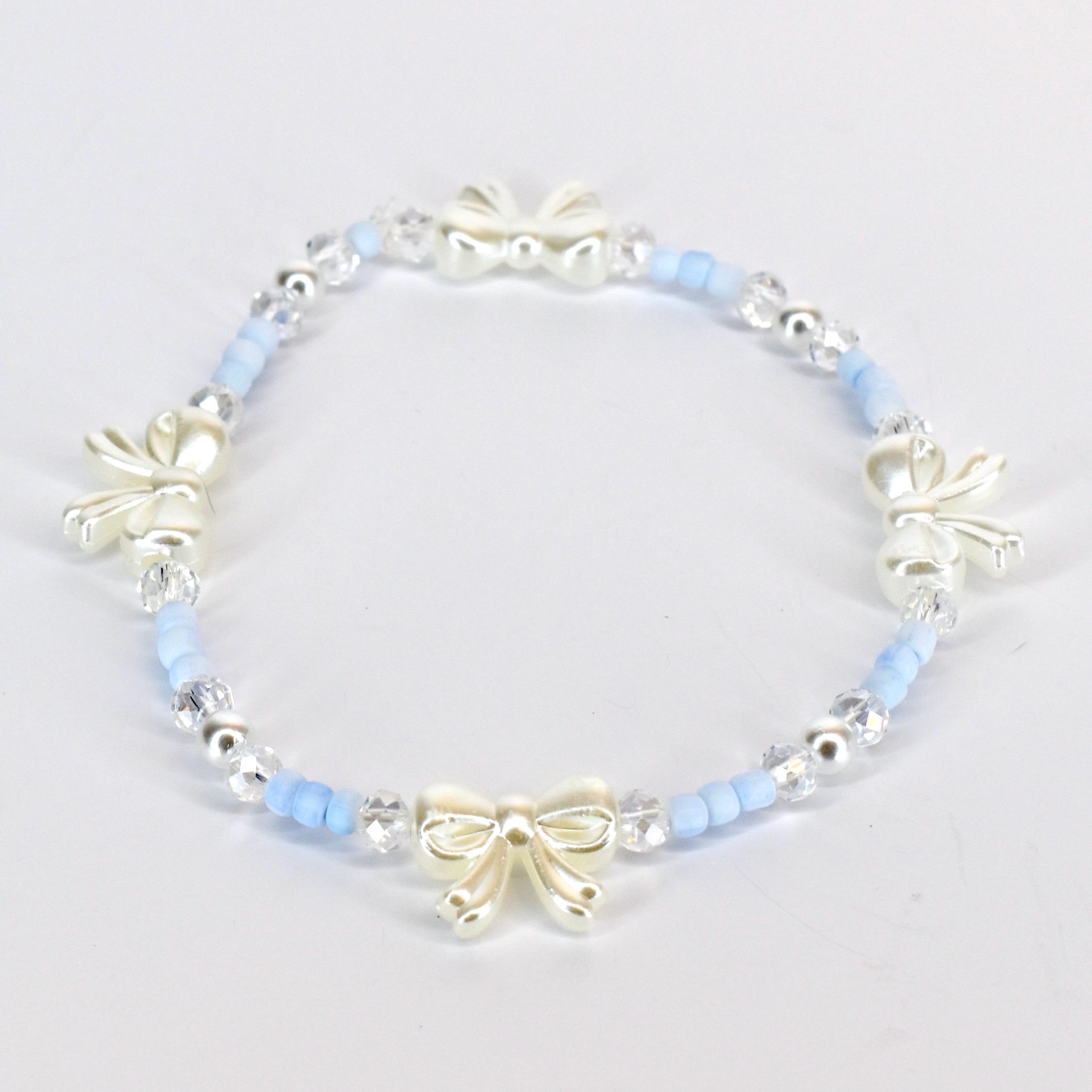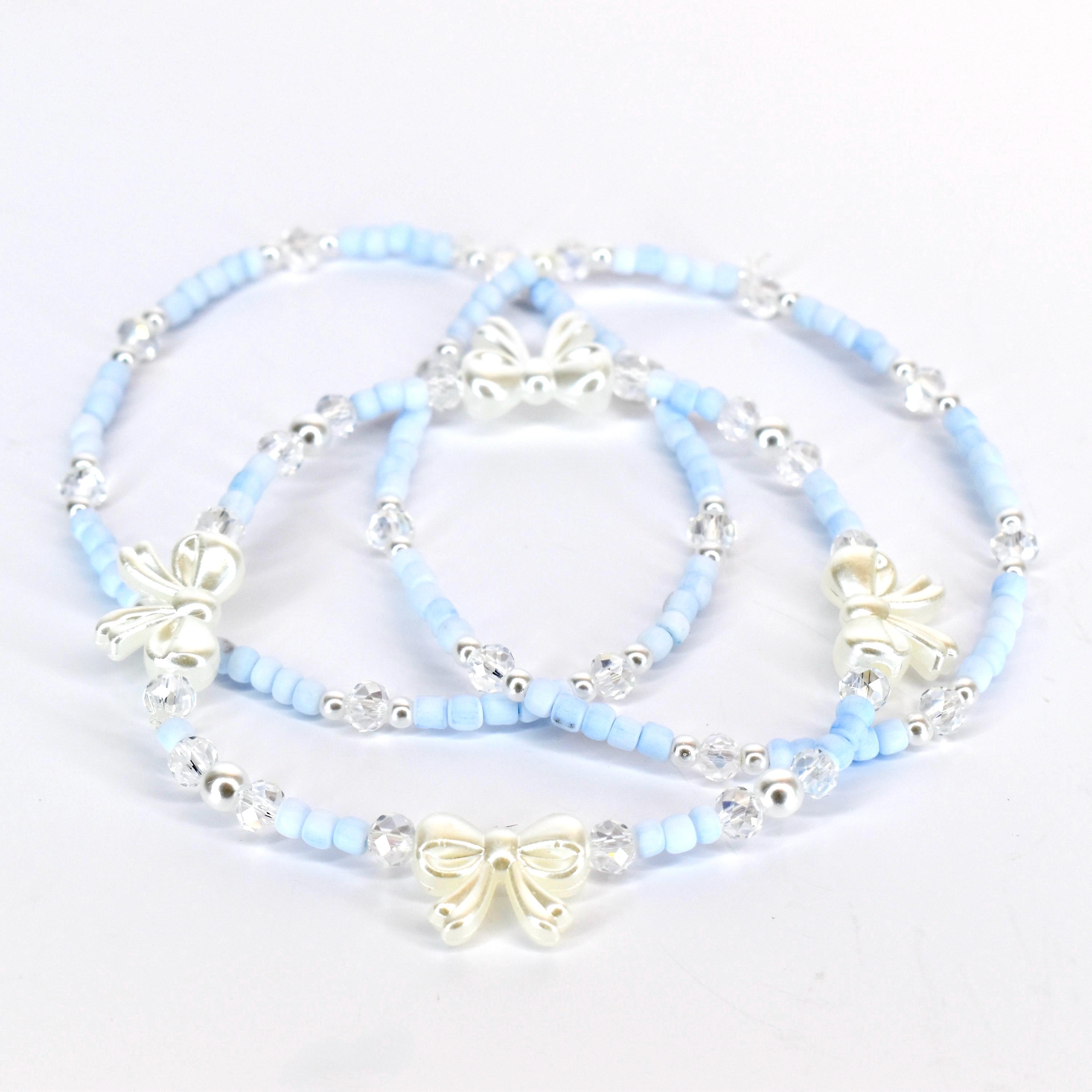 Add a touch of sweet sophistication to your style with this charming 3-piece baby blue bracelet stack! Thoughtfully handcrafted with soft baby blue beads, sparkling clear crystals, polished silver metallic accents and an adorable white bow centerpiece, this versatile collection creates the perfect statement.