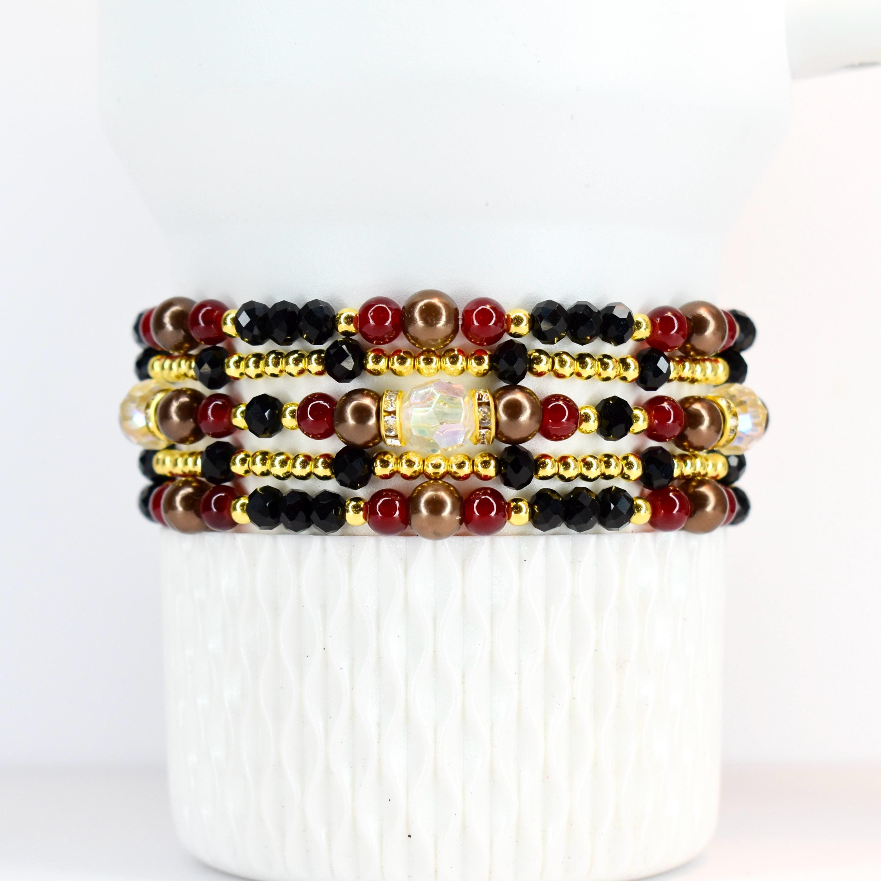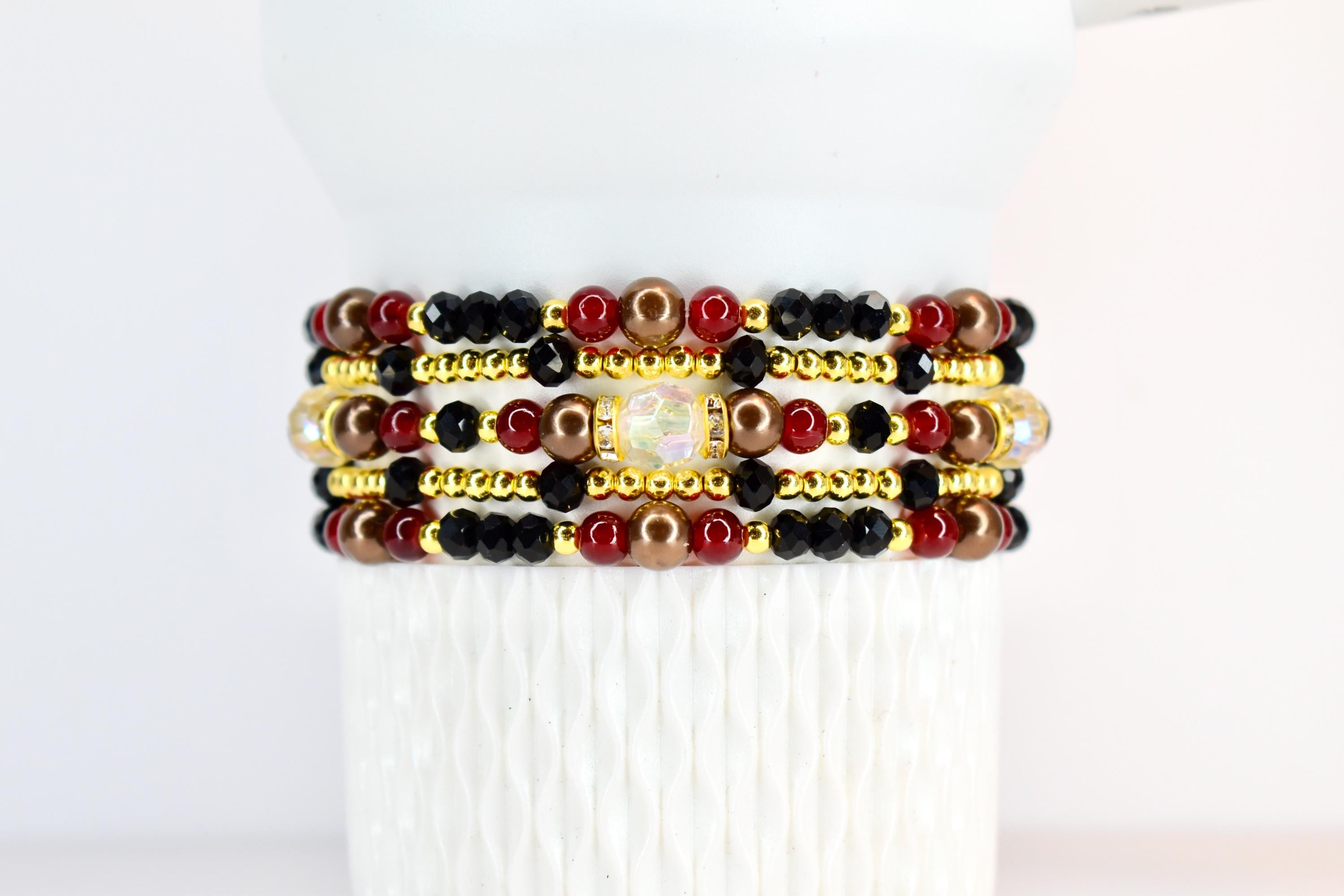 Indulge in sophisticated luxury with this stunning bracelet stack! This elegant 5-piece set combines rich garnet red, jet black, brown, and gleaming gold accents for a look that’s both opulent and romantic.