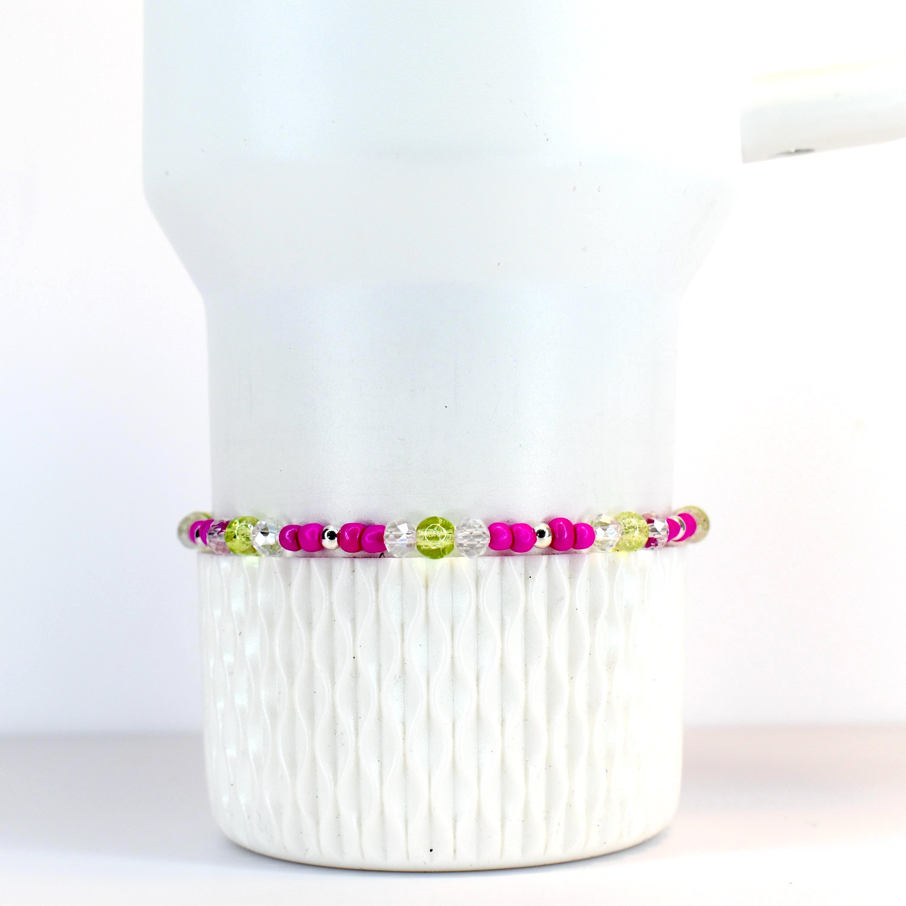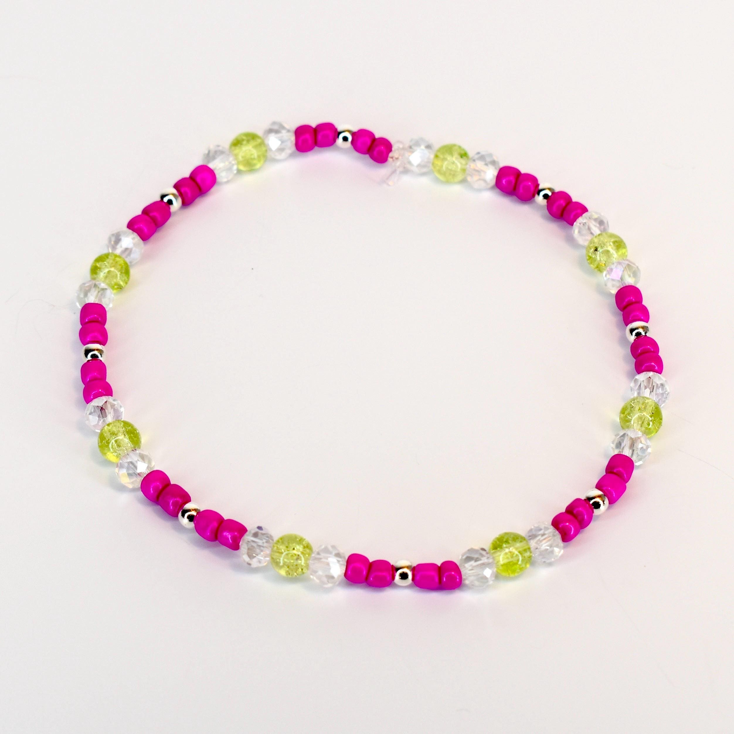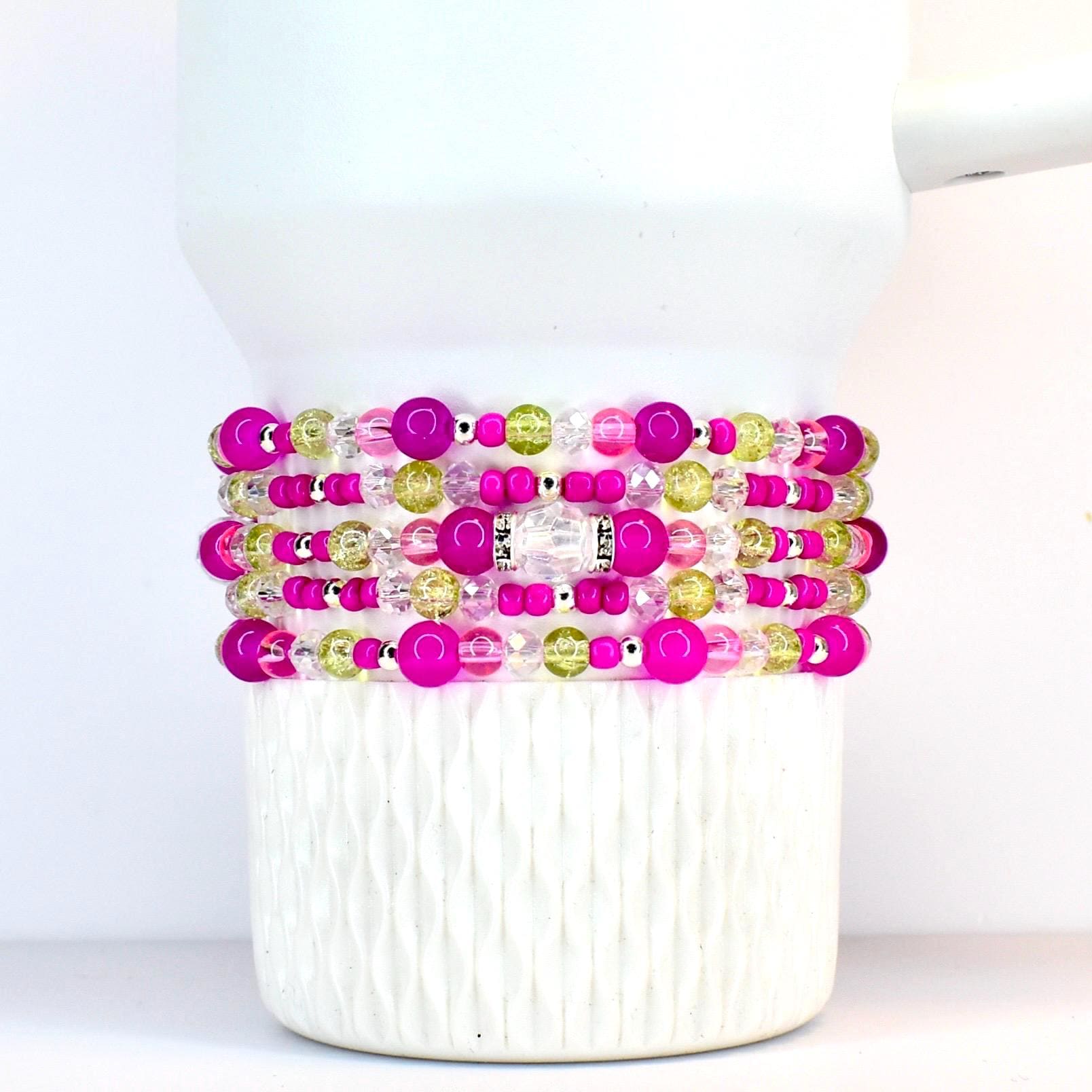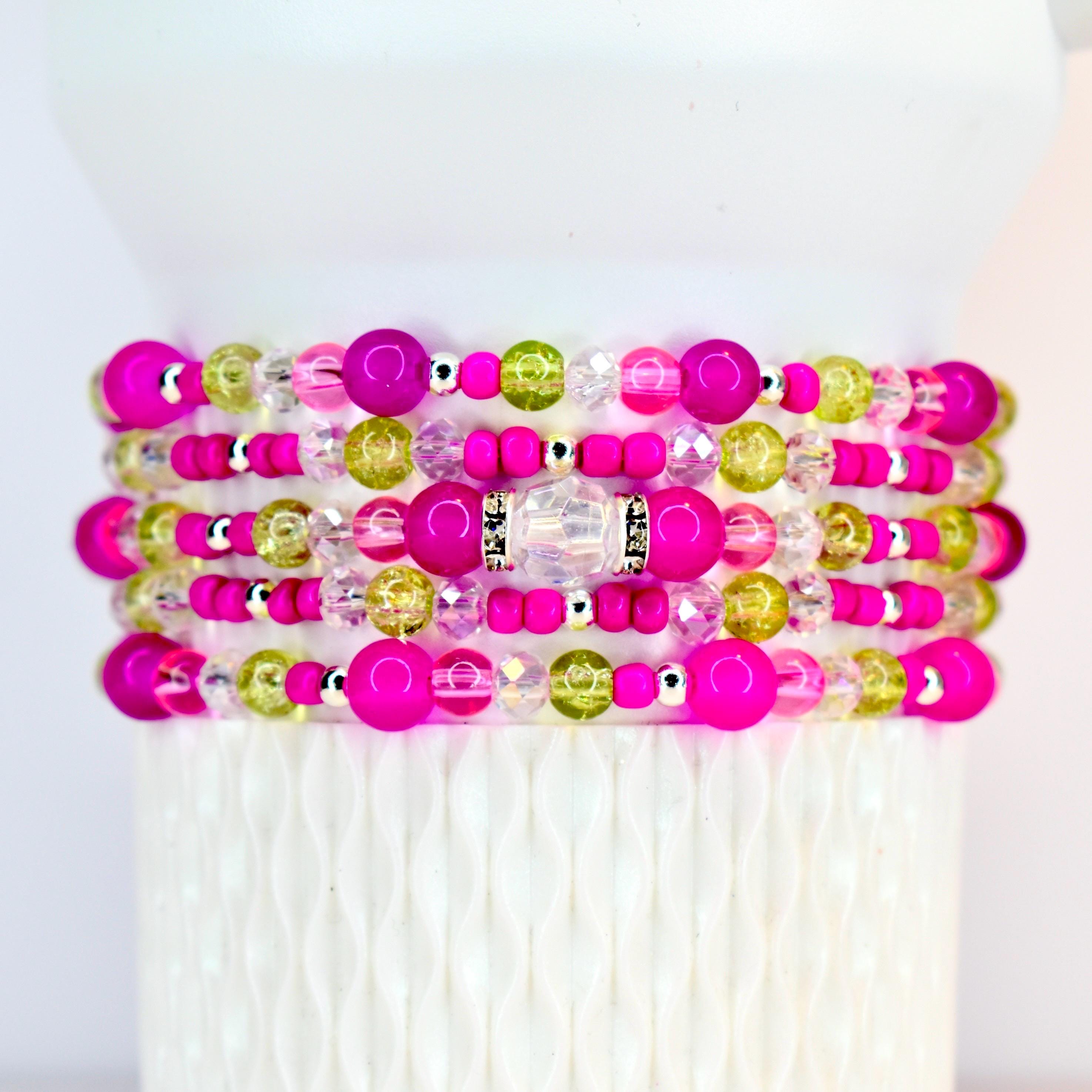 Add a pop of vibrant energy to your wrist with this eye-catching 5-piece bracelet stack! Featuring bold fuchsia pink beads paired with shimmering chartreuse accents and iridescent clear crystals, this stack creates a stunning modern boho look.