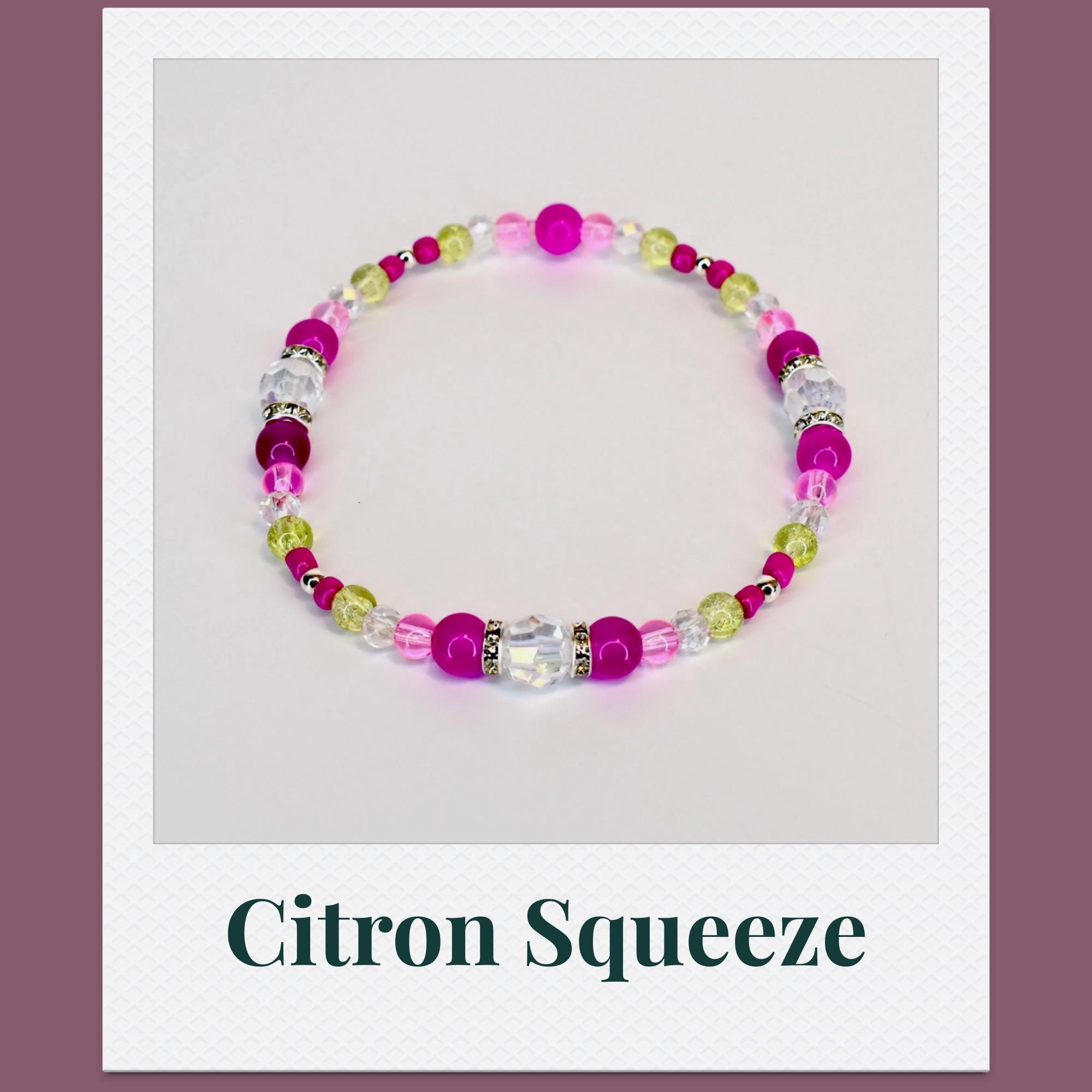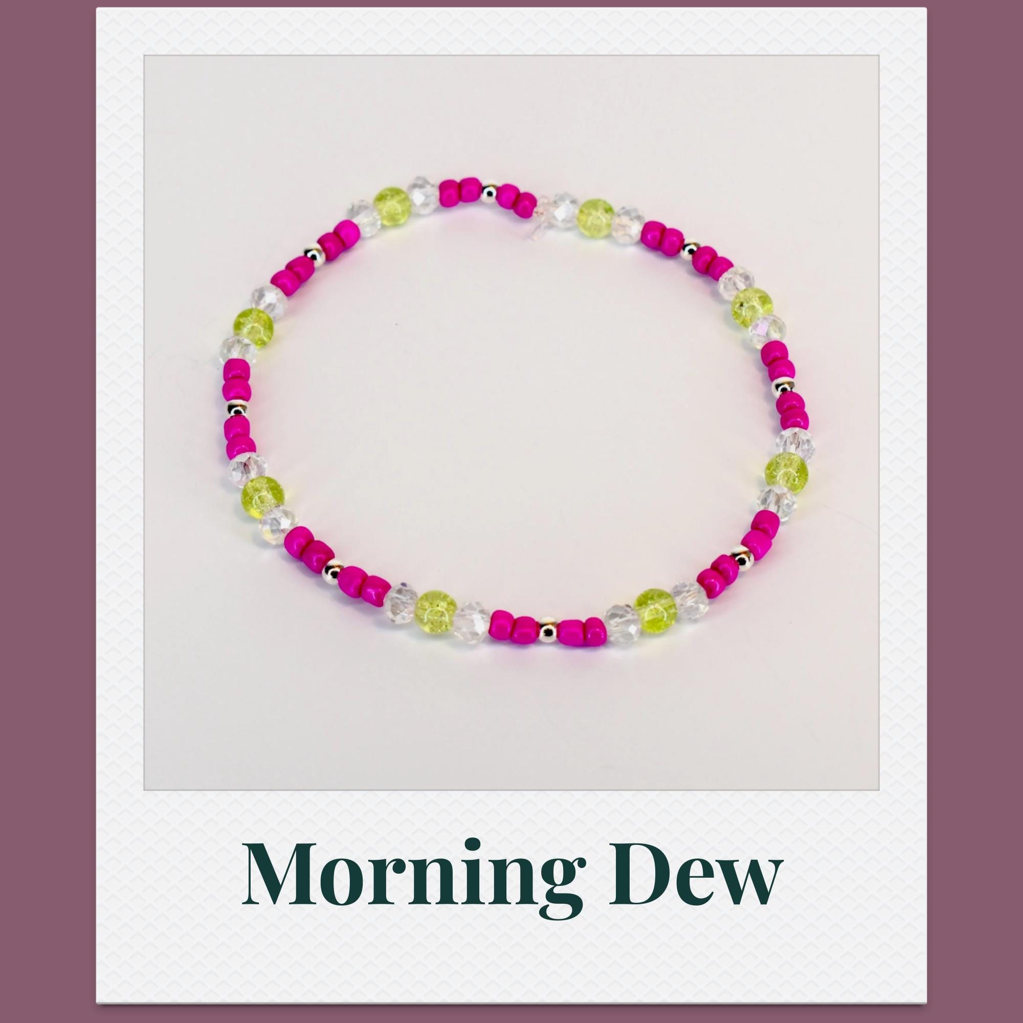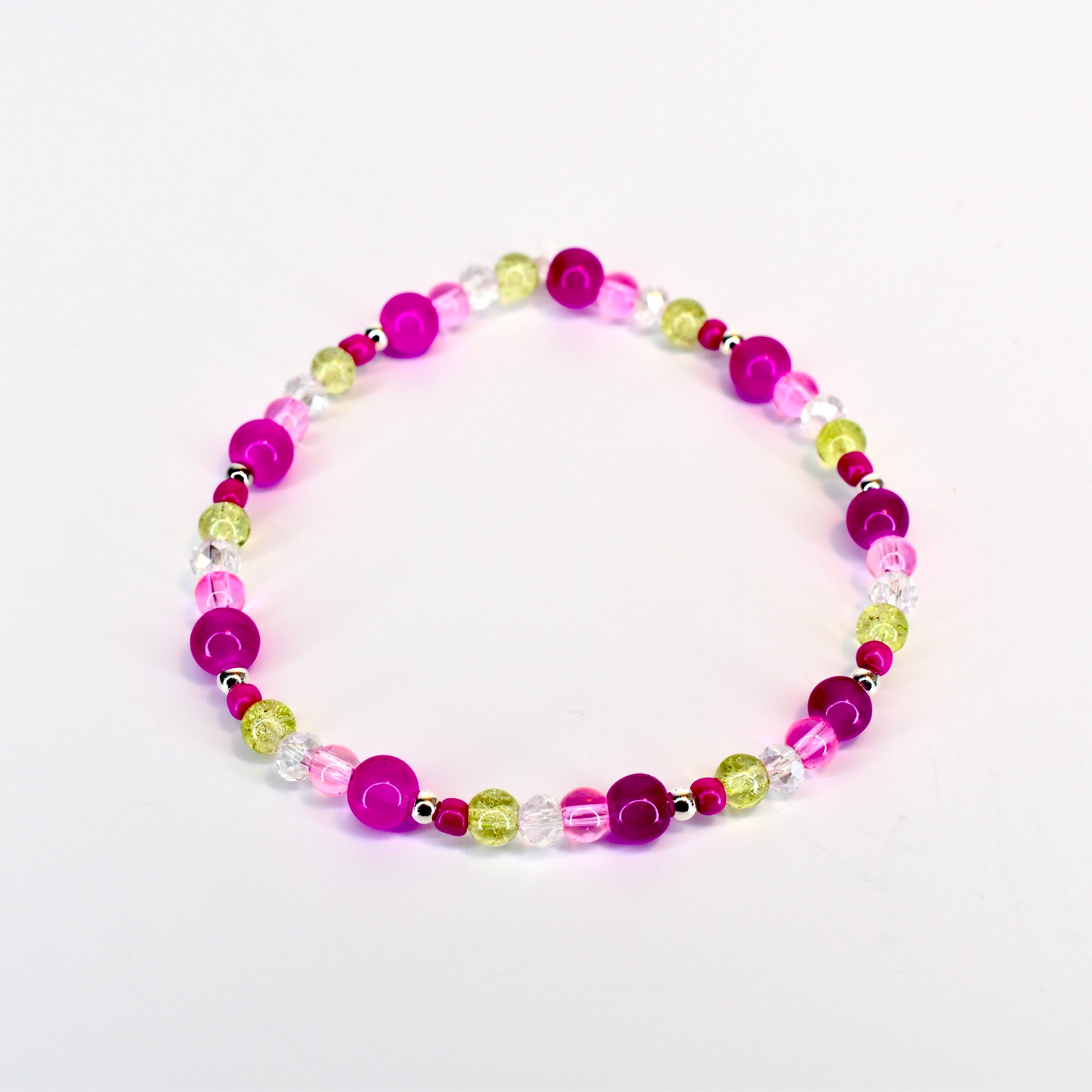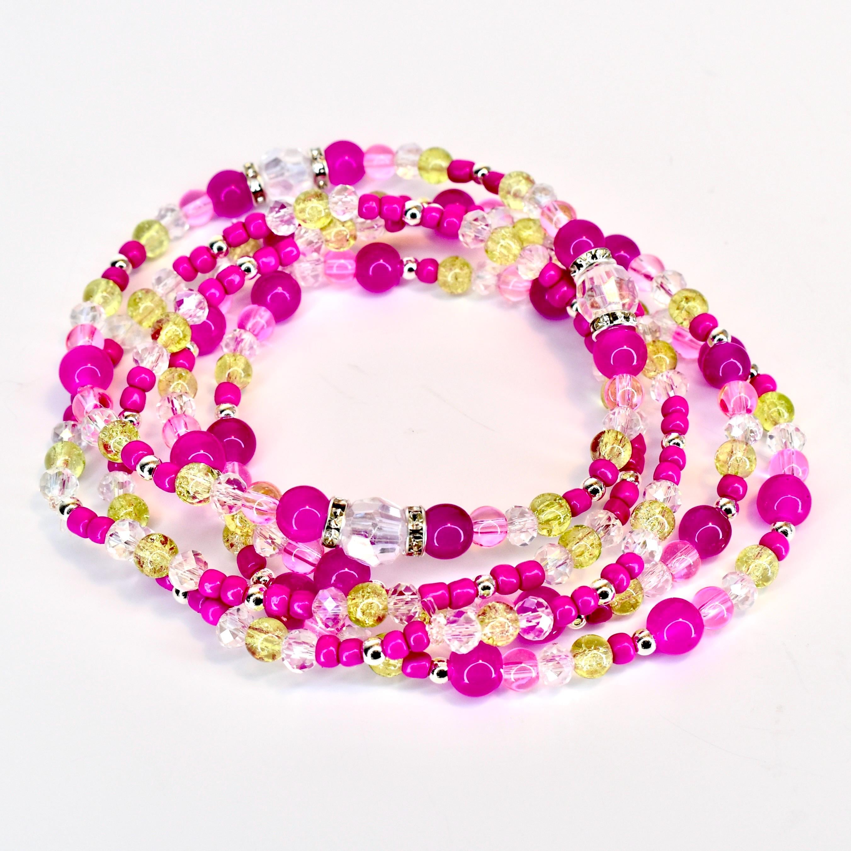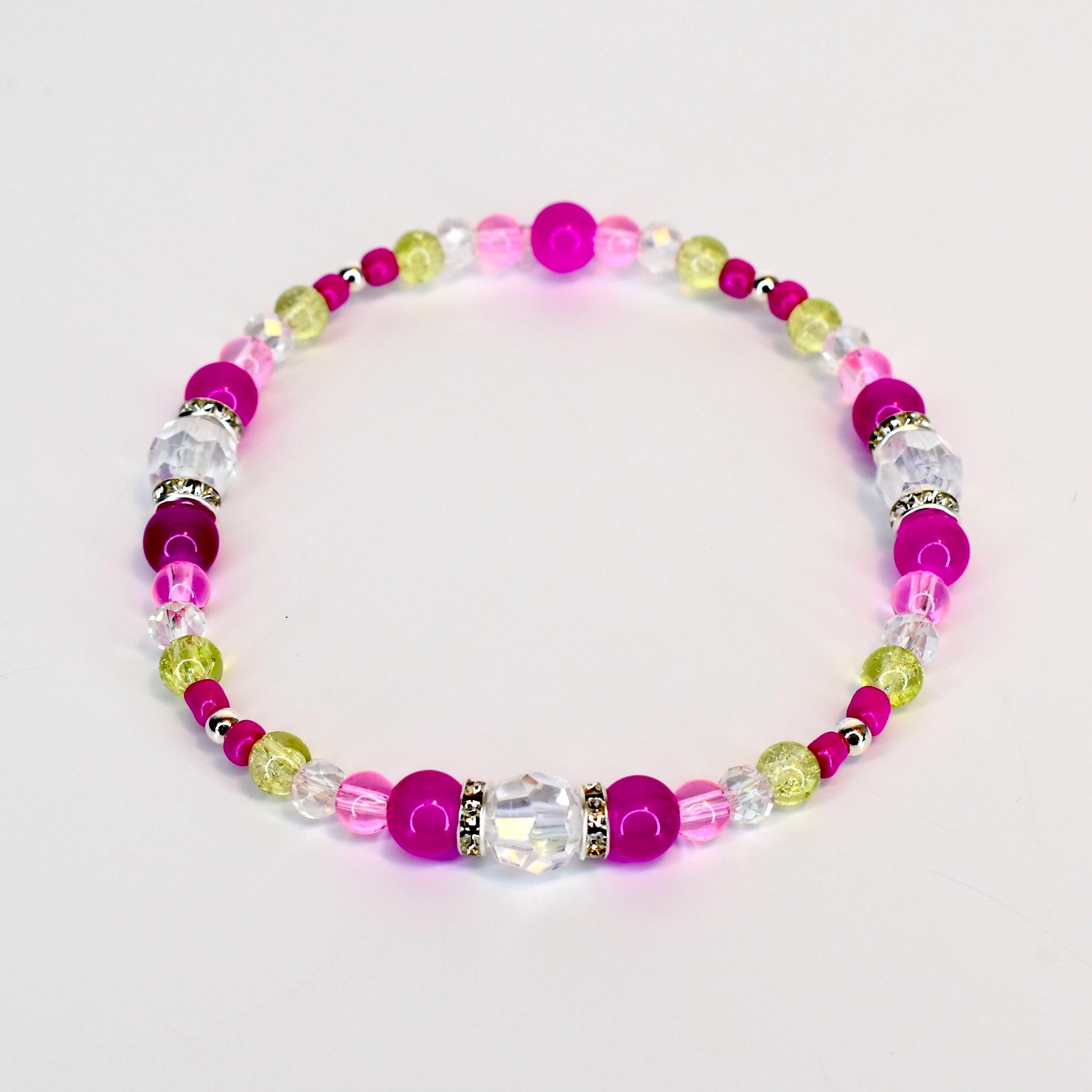 Add a pop of vibrant energy to your wrist with this eye-catching 5-piece bracelet stack! Featuring bold fuchsia pink beads paired with shimmering chartreuse accents and iridescent clear crystals, this stack creates a stunning modern boho look.