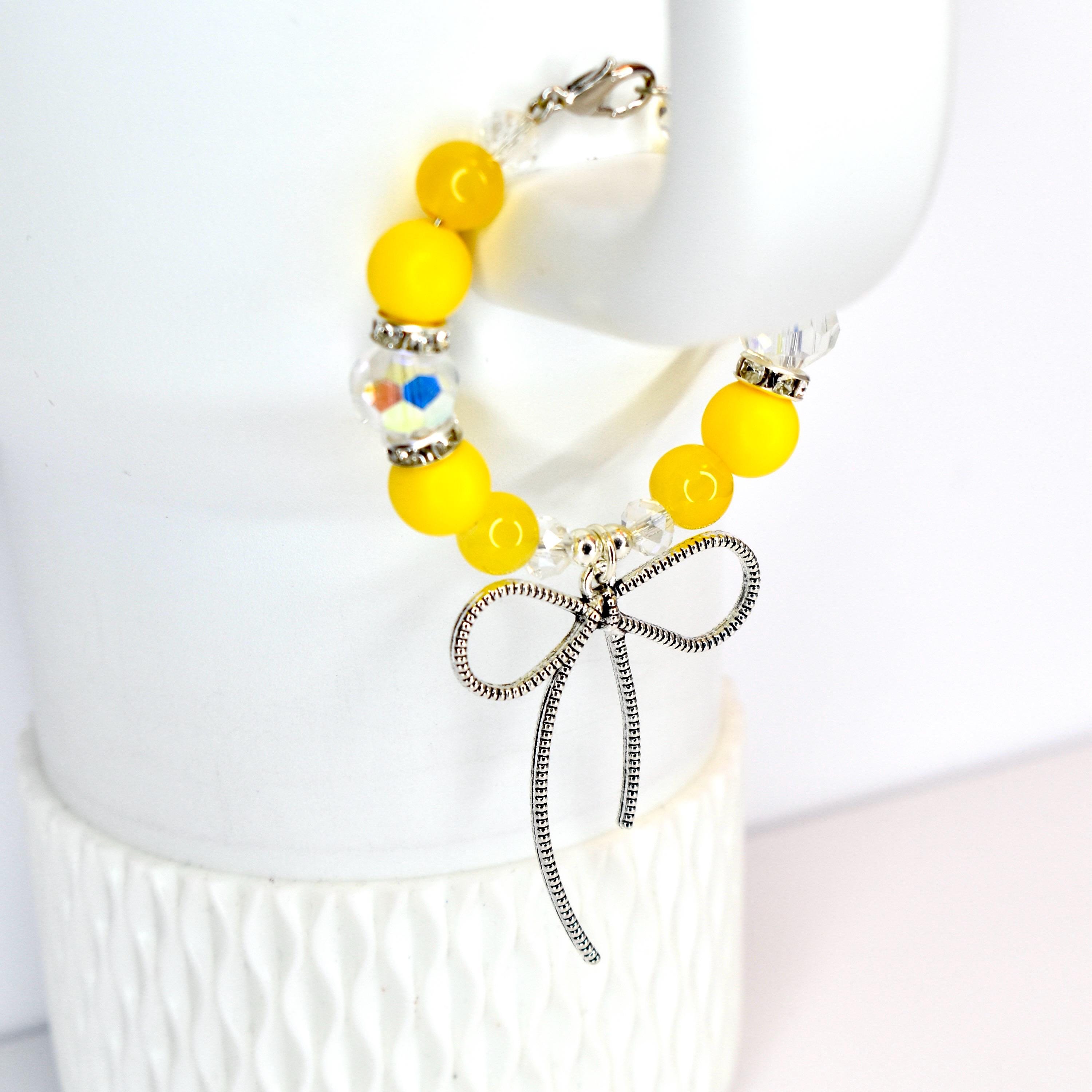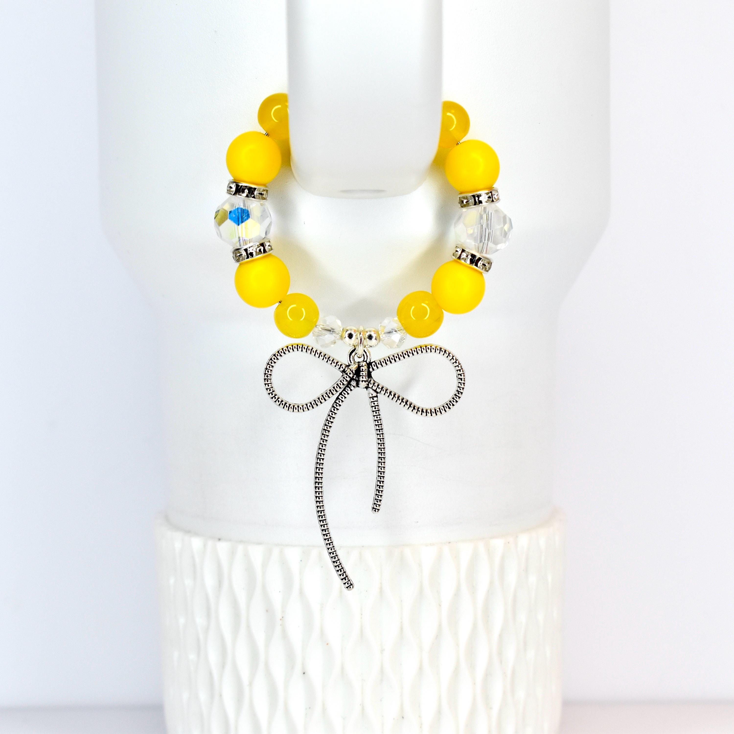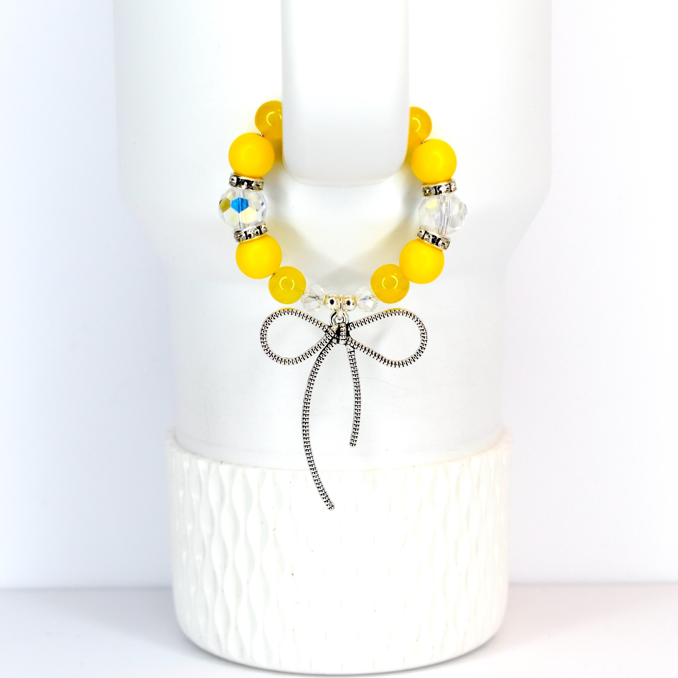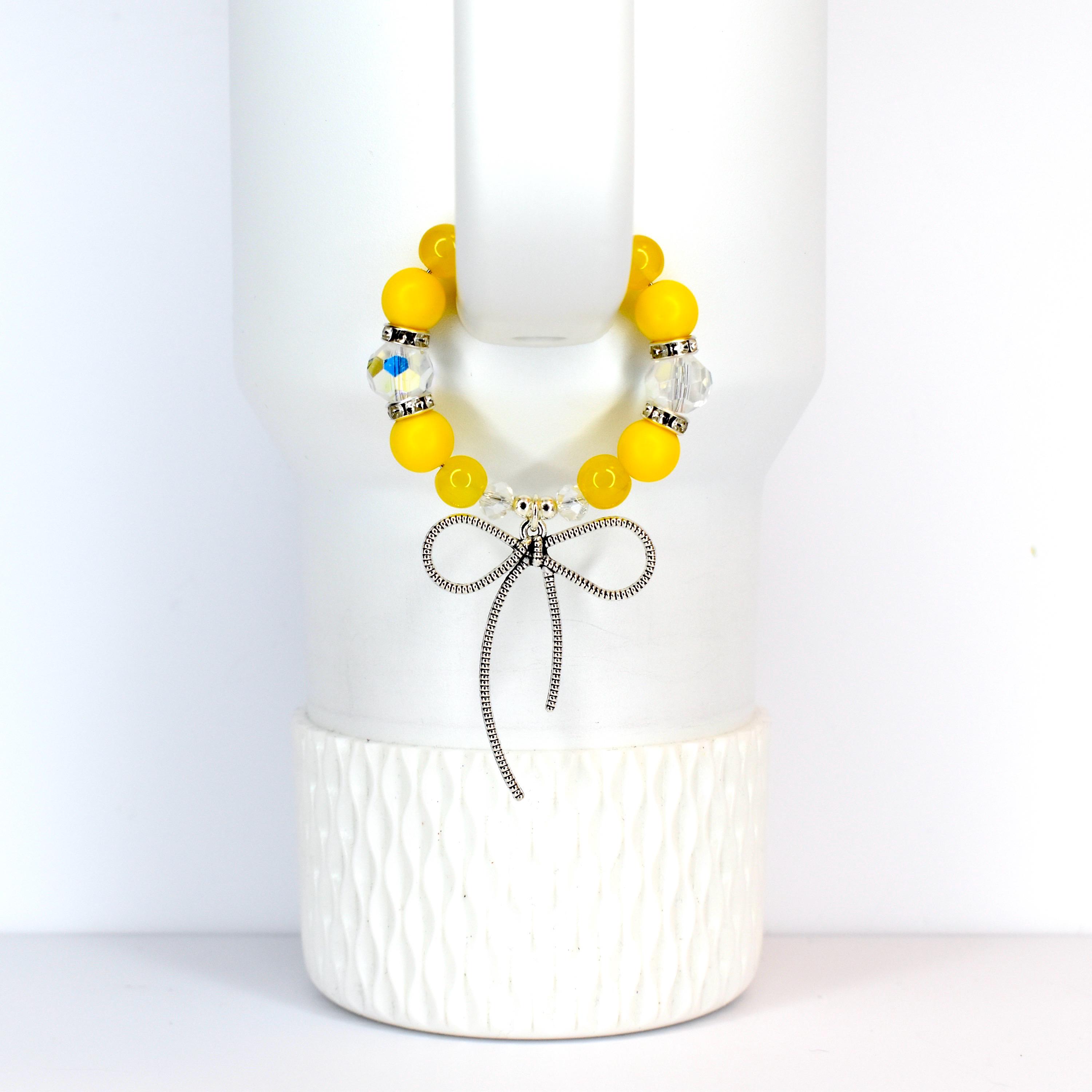 Add a pop of cheerful sunshine to your daily hydration routine with this vibrant yellow tumbler bracelet! Featuring glossy yellow beads paired with sparkling clear crystal accents and silver spacers, this eye-catching accessory is topped with an adorable silver bow charm that adds the perfect touch of feminine flair.