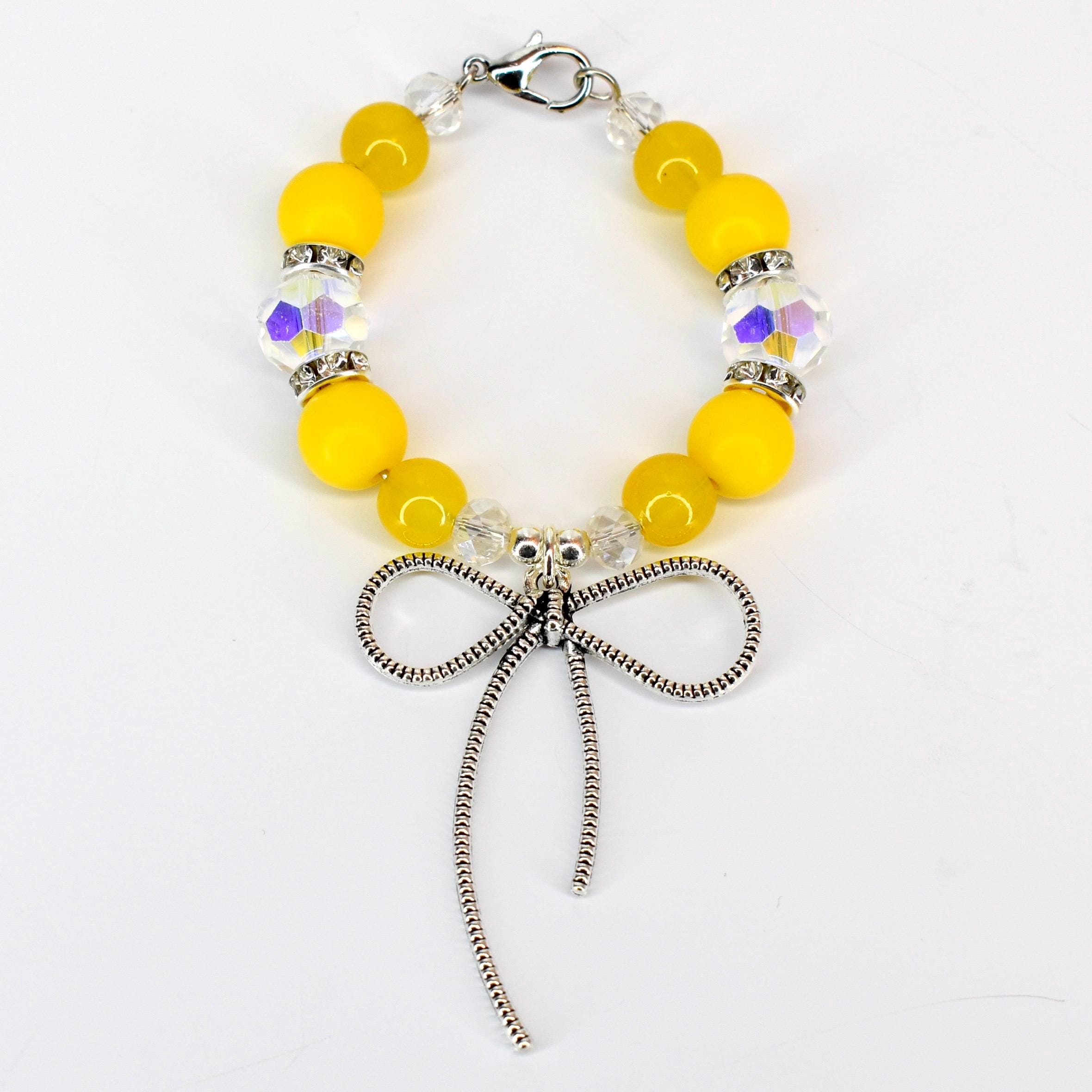 Bright yellow beads create a bold, happy vibe that’s perfect for adding personality to your everyday carry. The combination of matte and glossy yellow tones gives visual interest, while clear AB-finish crystals catch the light beautifully. Silver rhinestone spacers and a detailed bow charm complete this playful yet polished look.