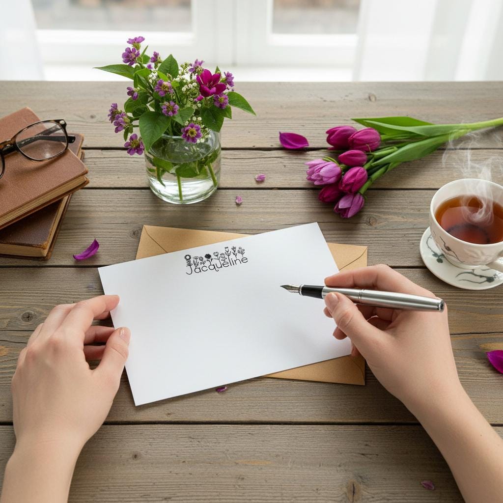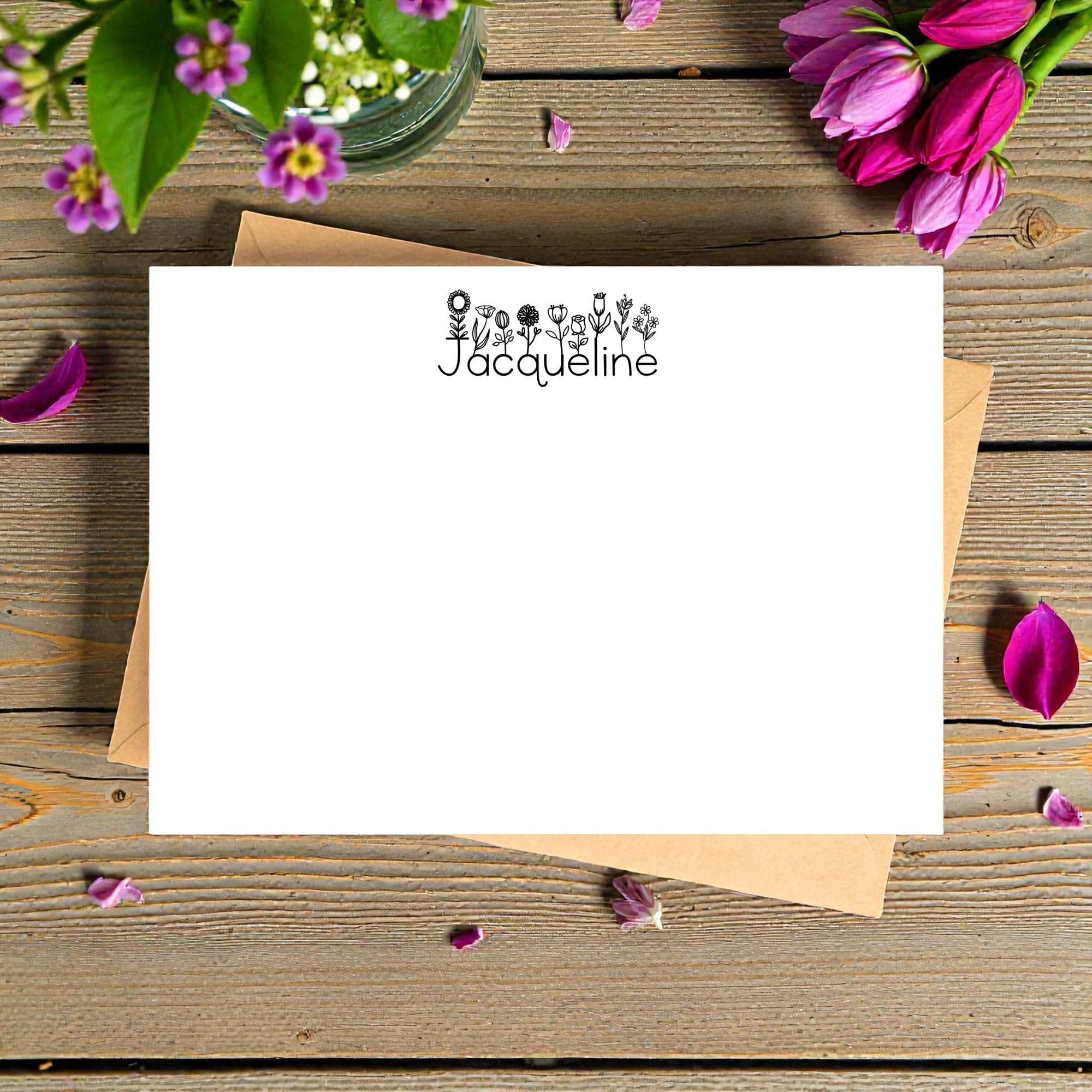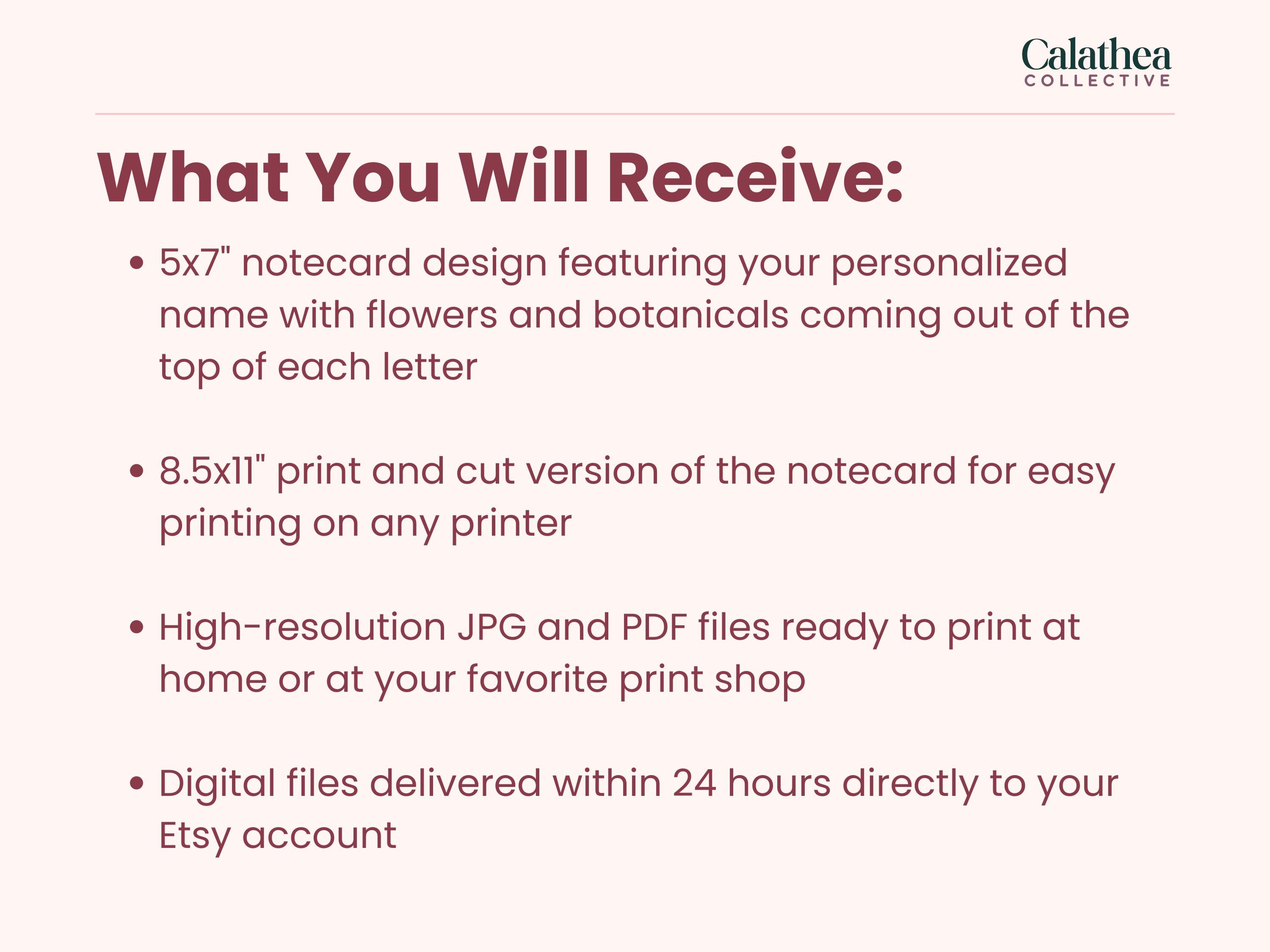 - 5x7" notecard design featuring your personalized name with flowers and botanicals coming out of the top of each letter