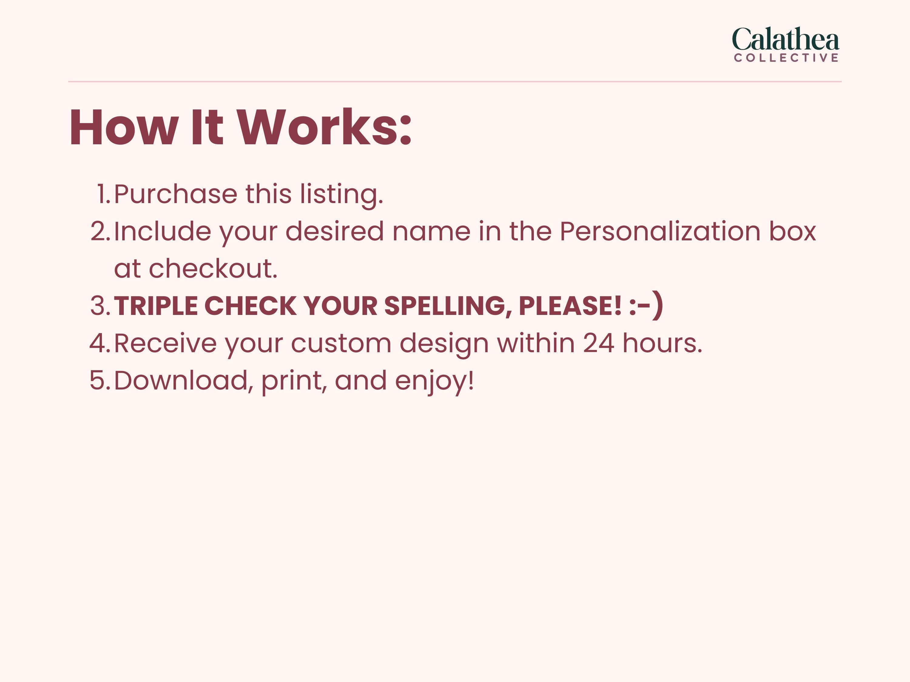 Most of Calathea Collective's products are handmade to order, which means they are created just for you! Because of the custom nature, we don't accept returns or exchanges. That said, if there’s ever an issue with your order—like damage during shipping or a mistake on our end—please reach out within 7 days. We want you to love your purchase and will always do our best to make it right.