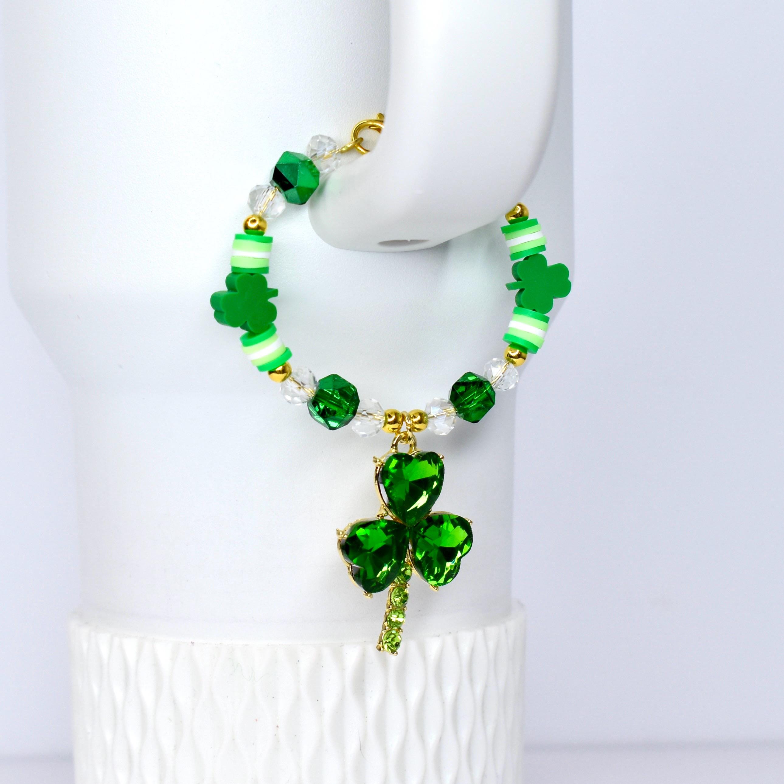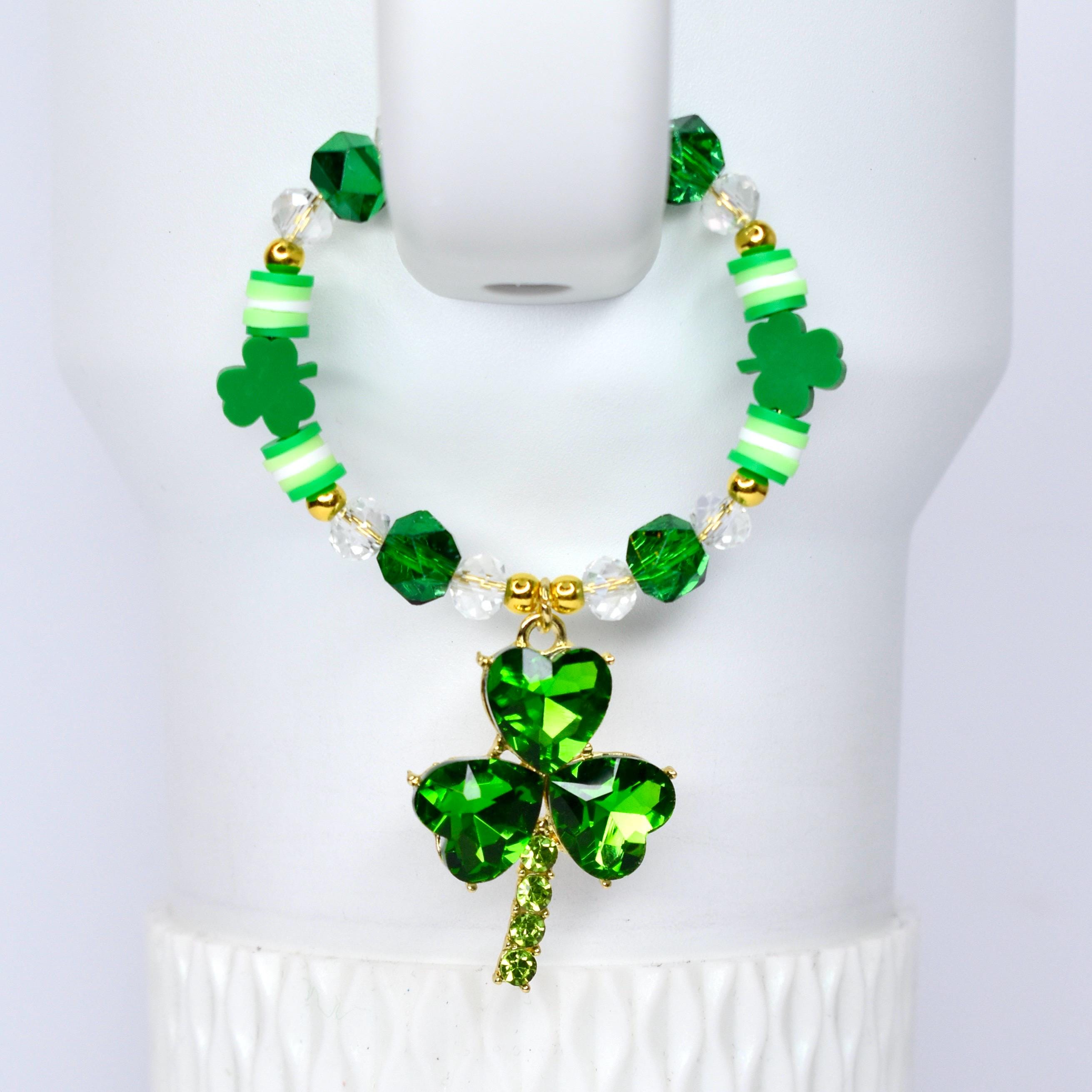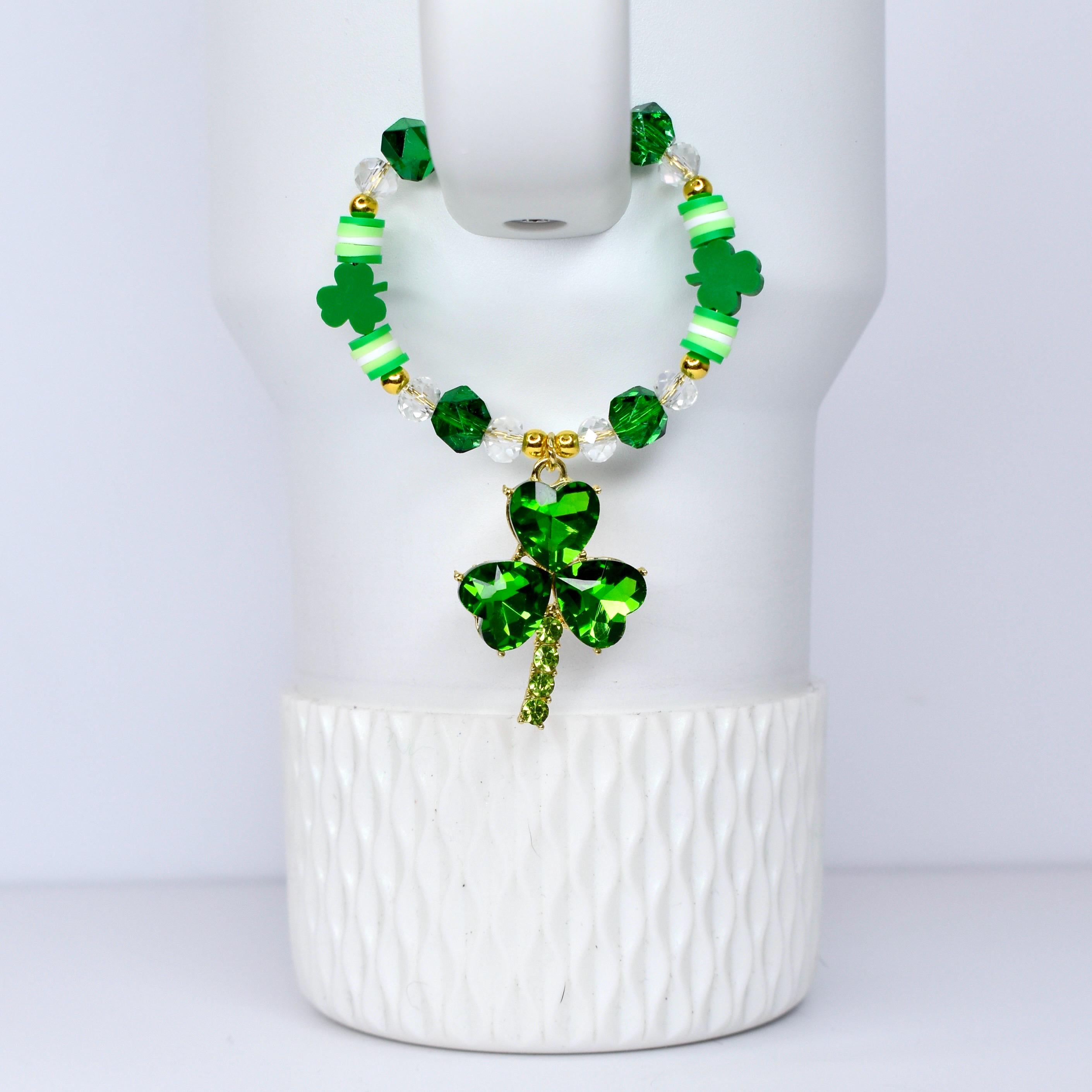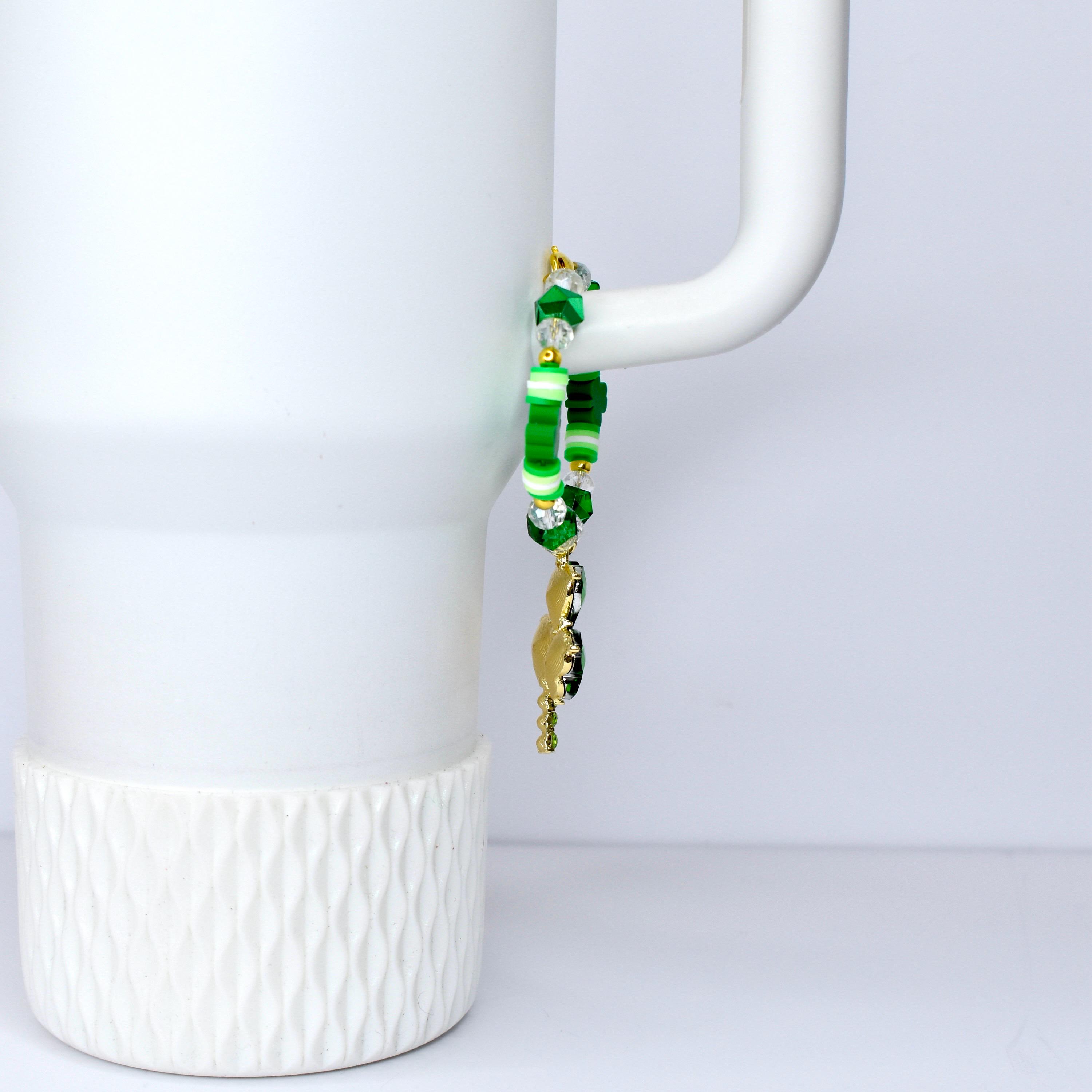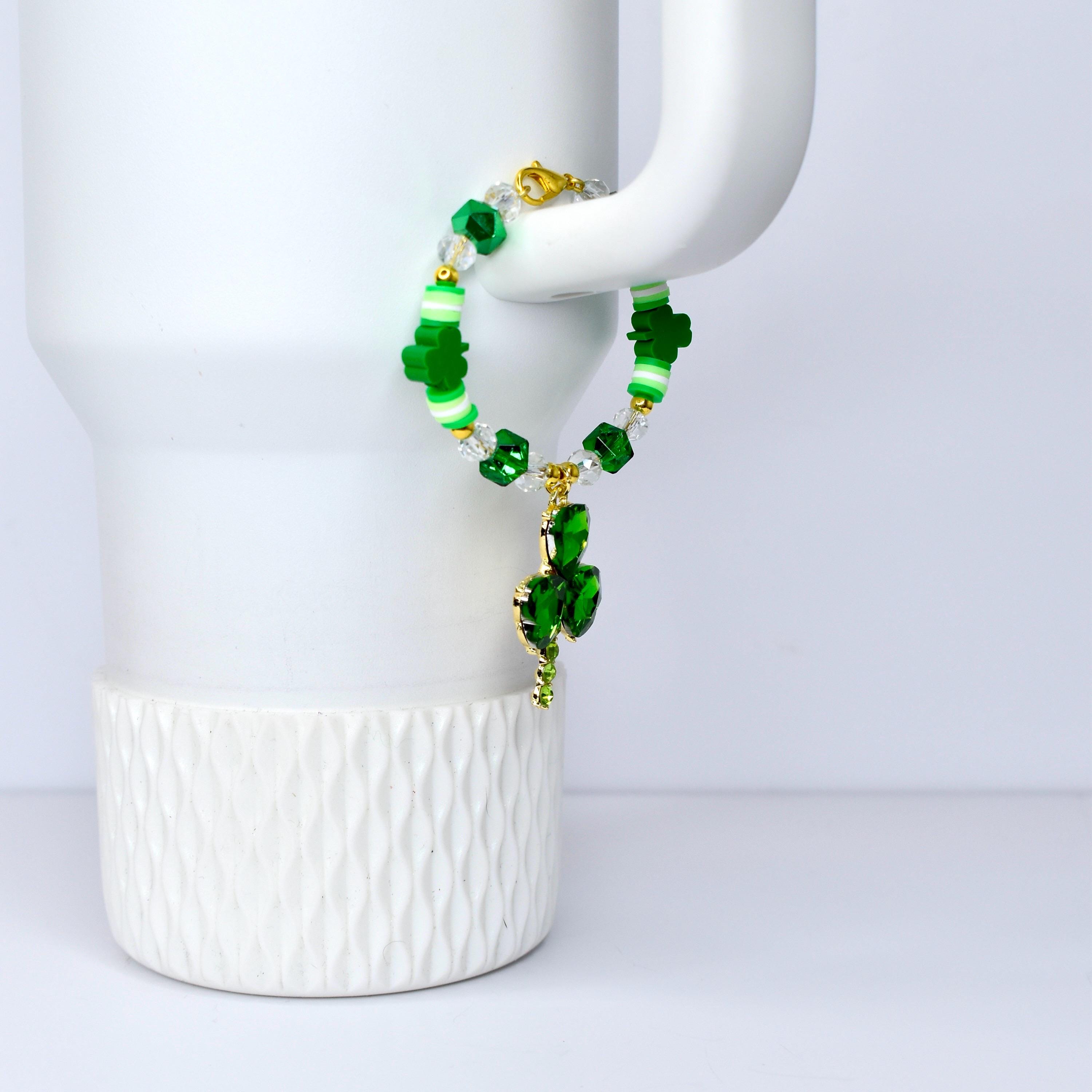 This tumbler charm transforms your everyday drinkware into a festive accessory. The combination of faceted green beads and golden accents catches the light beautifully, while the playful shamrock charm adds personality and holiday spirit. Easy to clasp on and off, making it simple to switch between seasonal styles.