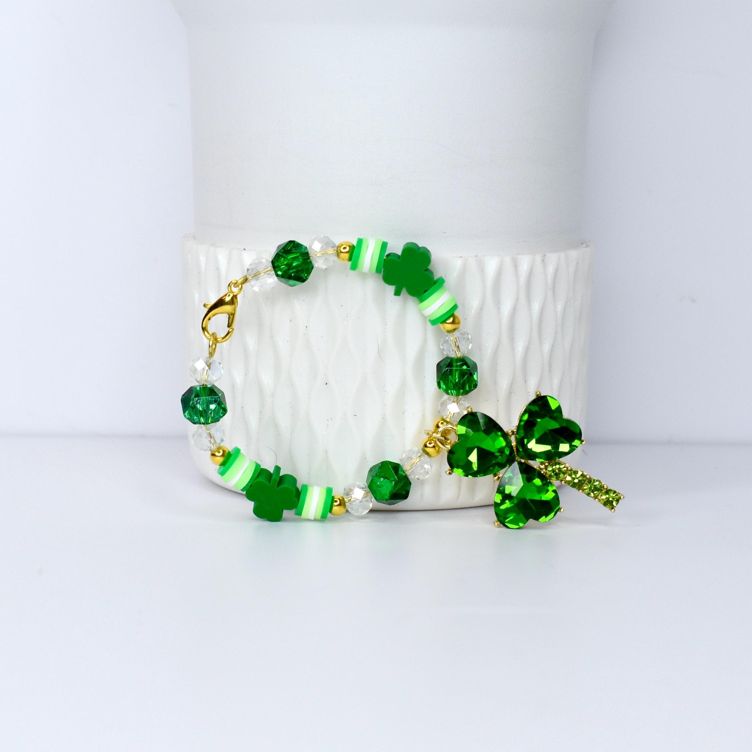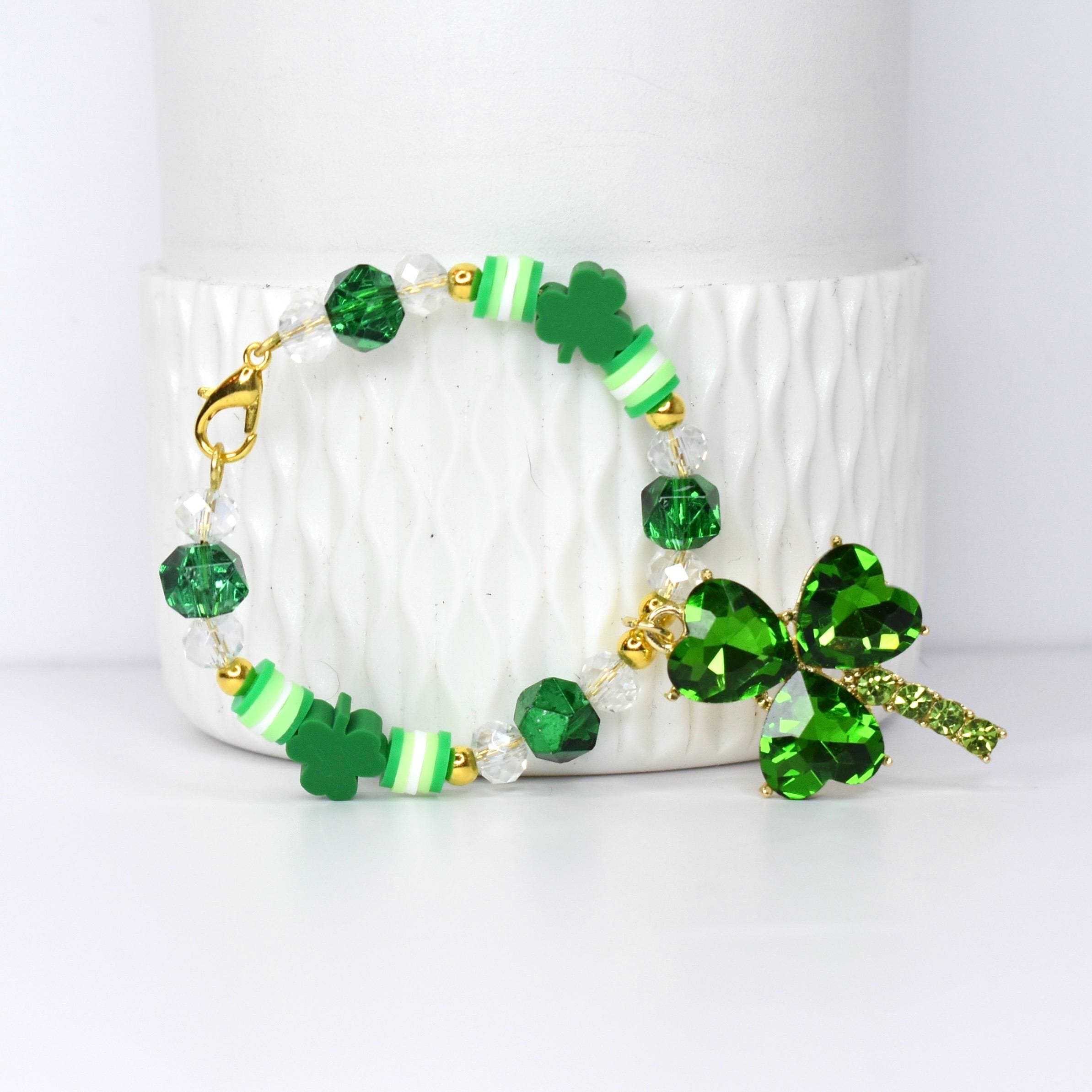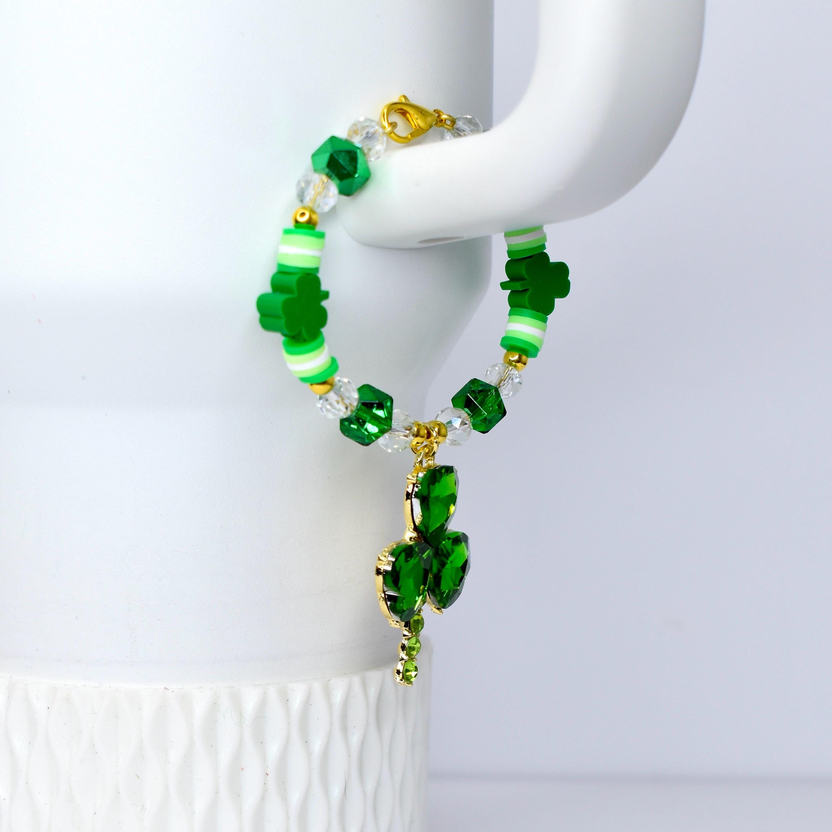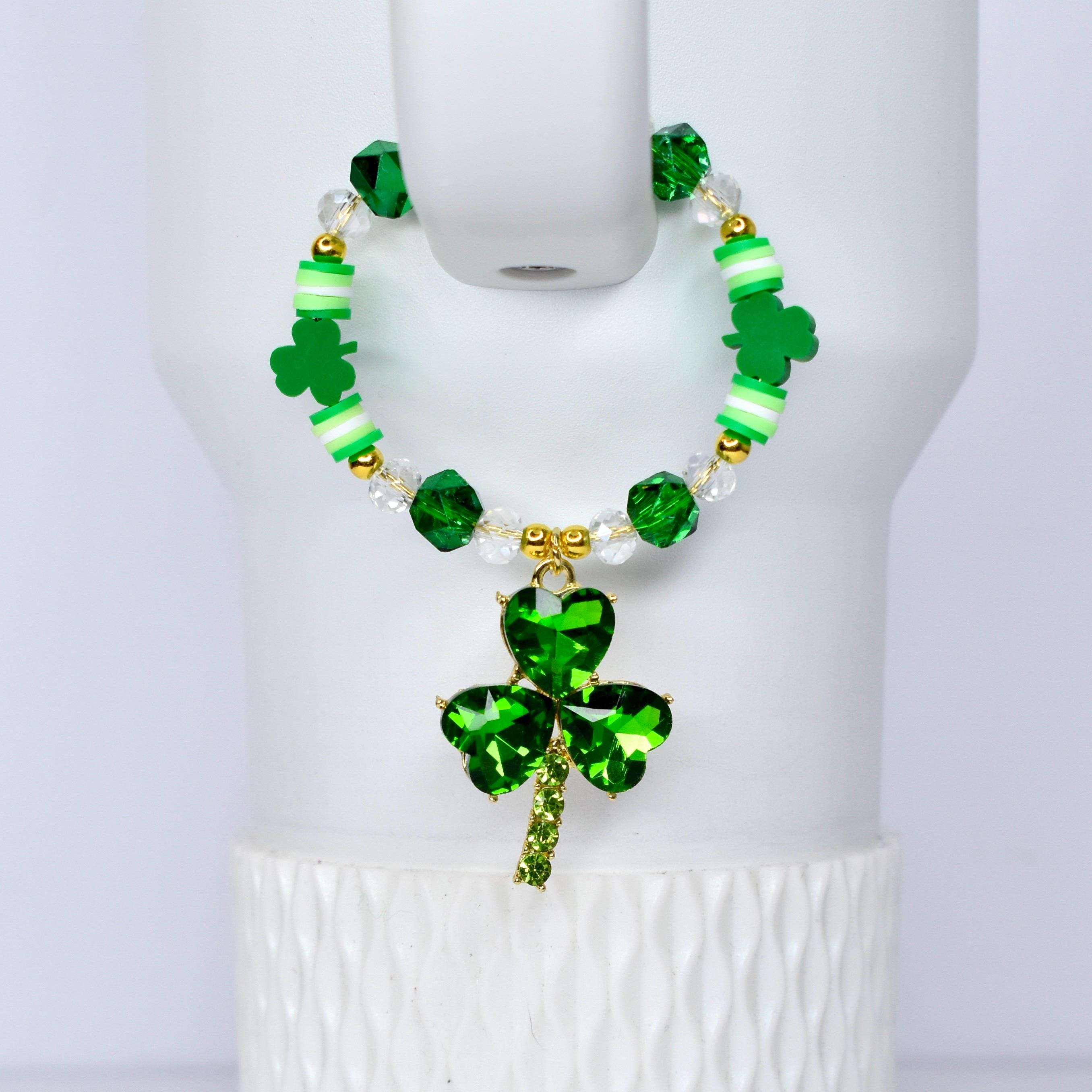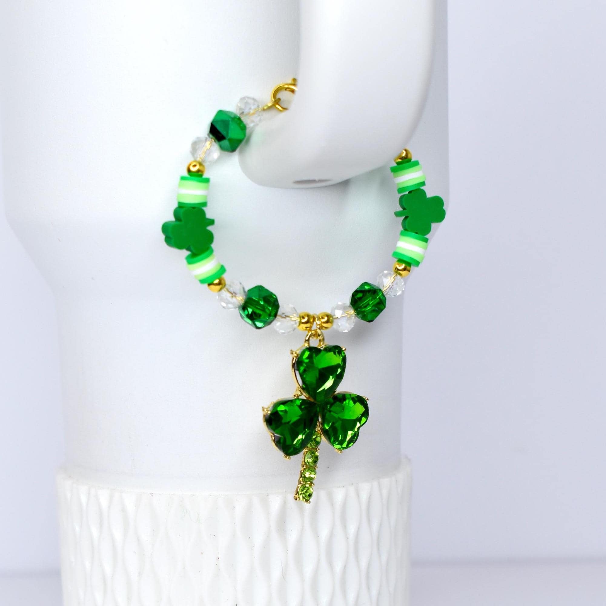 This tumbler charm transforms your everyday drinkware into a festive accessory. The combination of faceted green beads and golden accents catches the light beautifully, while the playful shamrock charm adds personality and holiday spirit. Easy to clasp on and off, making it simple to switch between seasonal styles.
