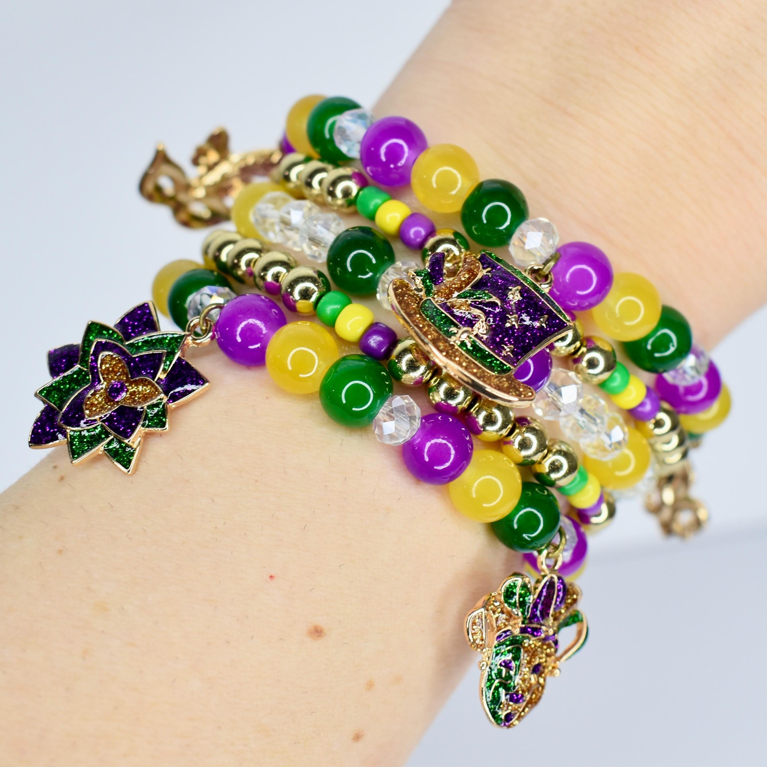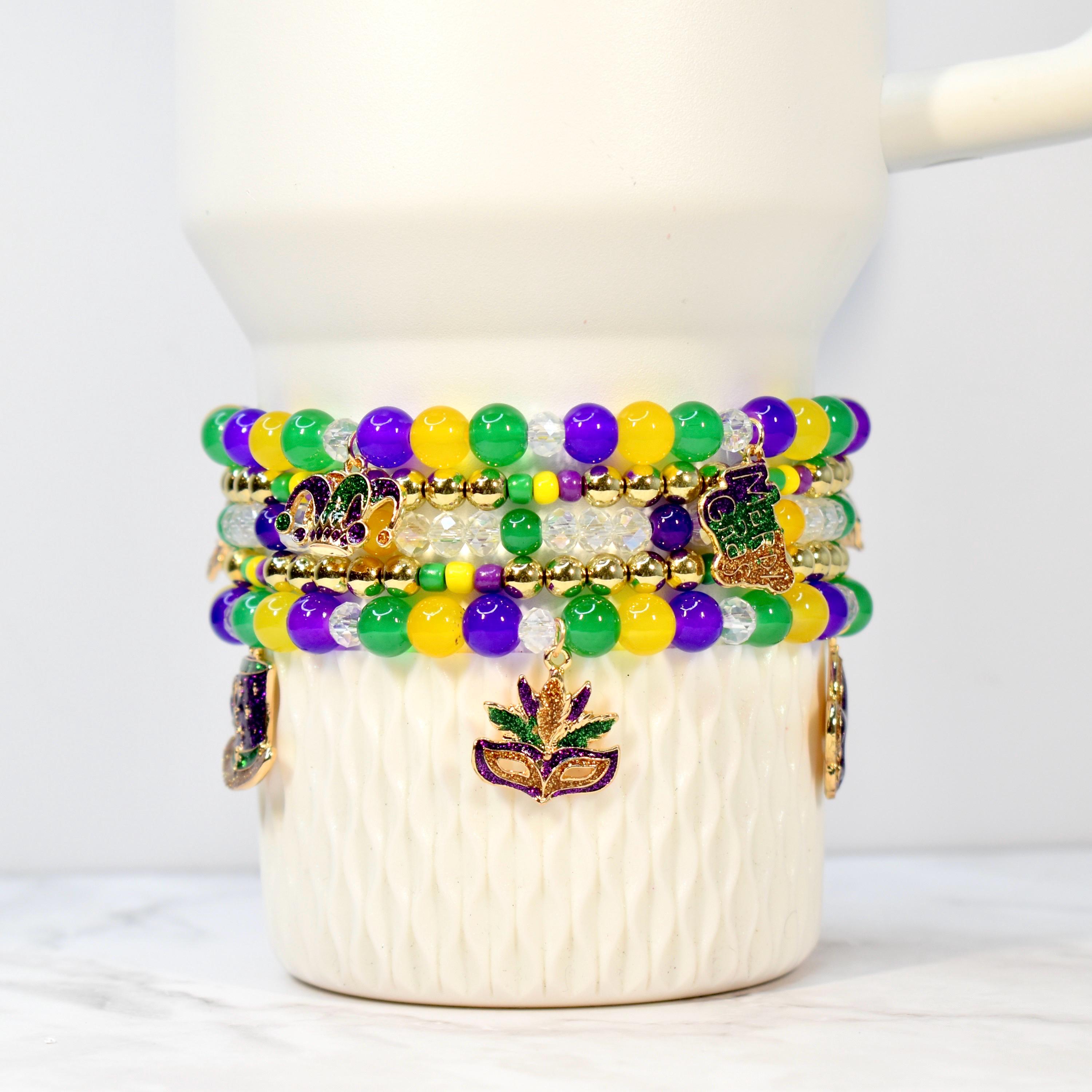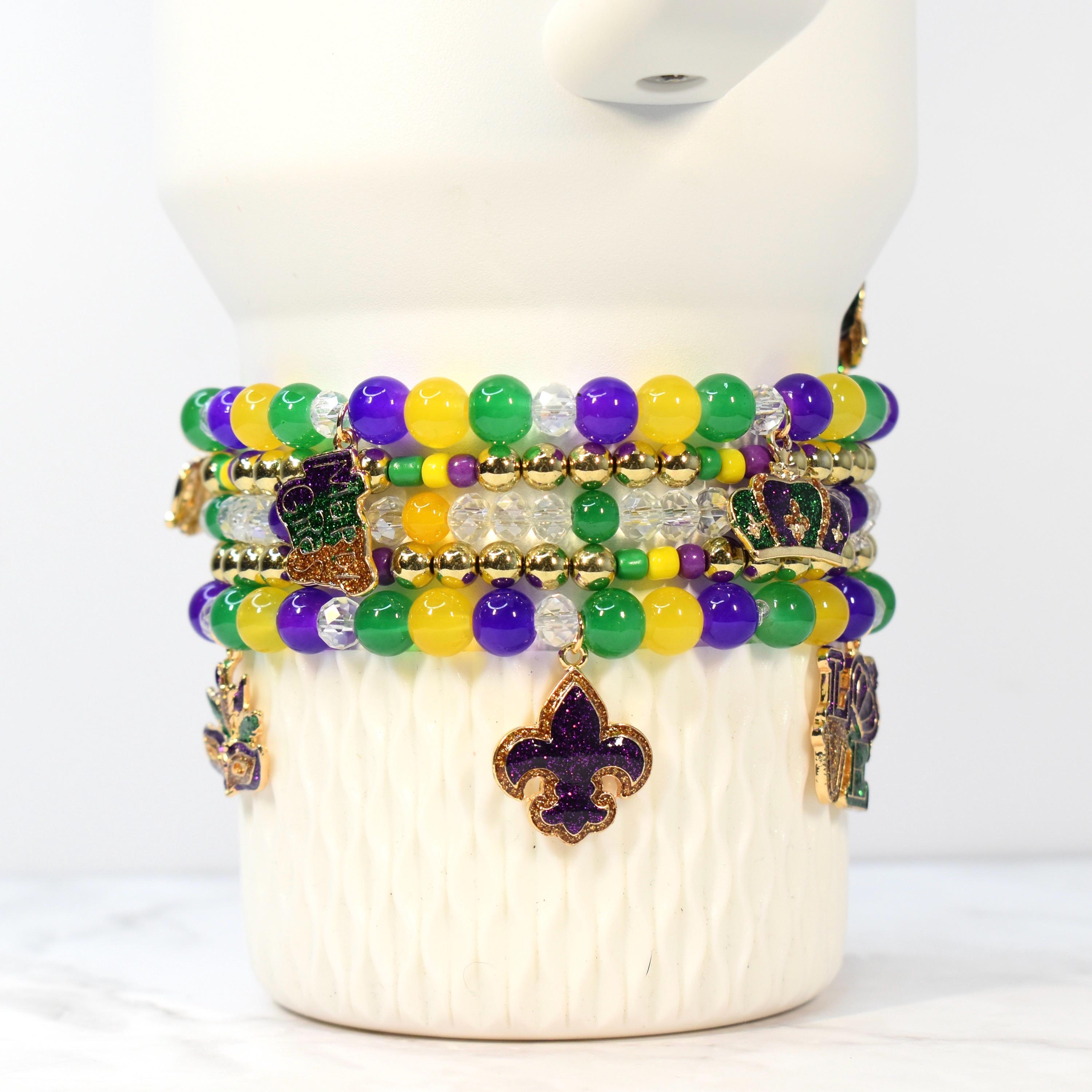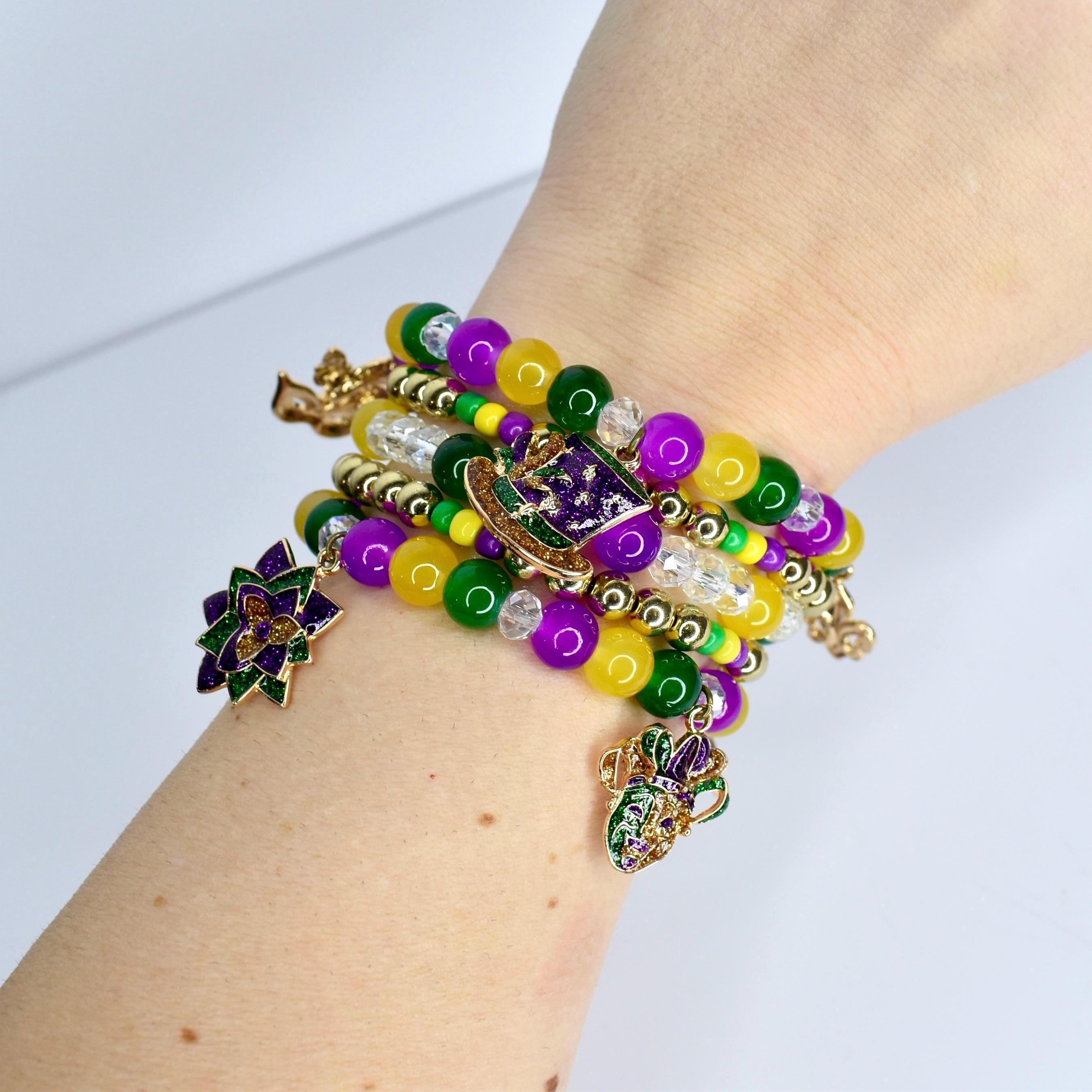 Laissez les bons temps rouler! Celebrate Mardi Gras in style with this vibrant 5-piece bracelet stack featuring the iconic purple, green and gold colors of carnival season. Each handcrafted bracelet is designed to wear individually or stacked together for maximum festive impact.