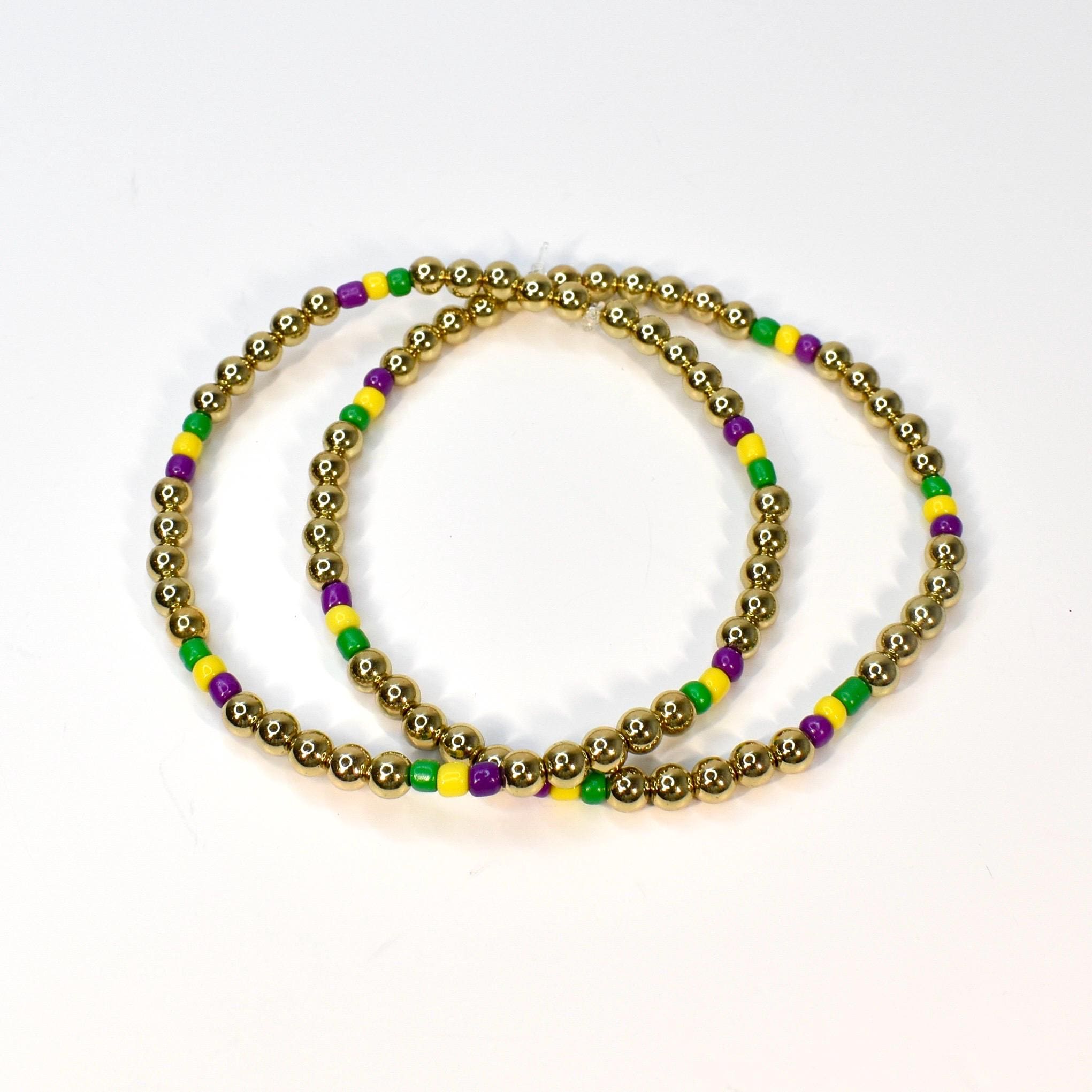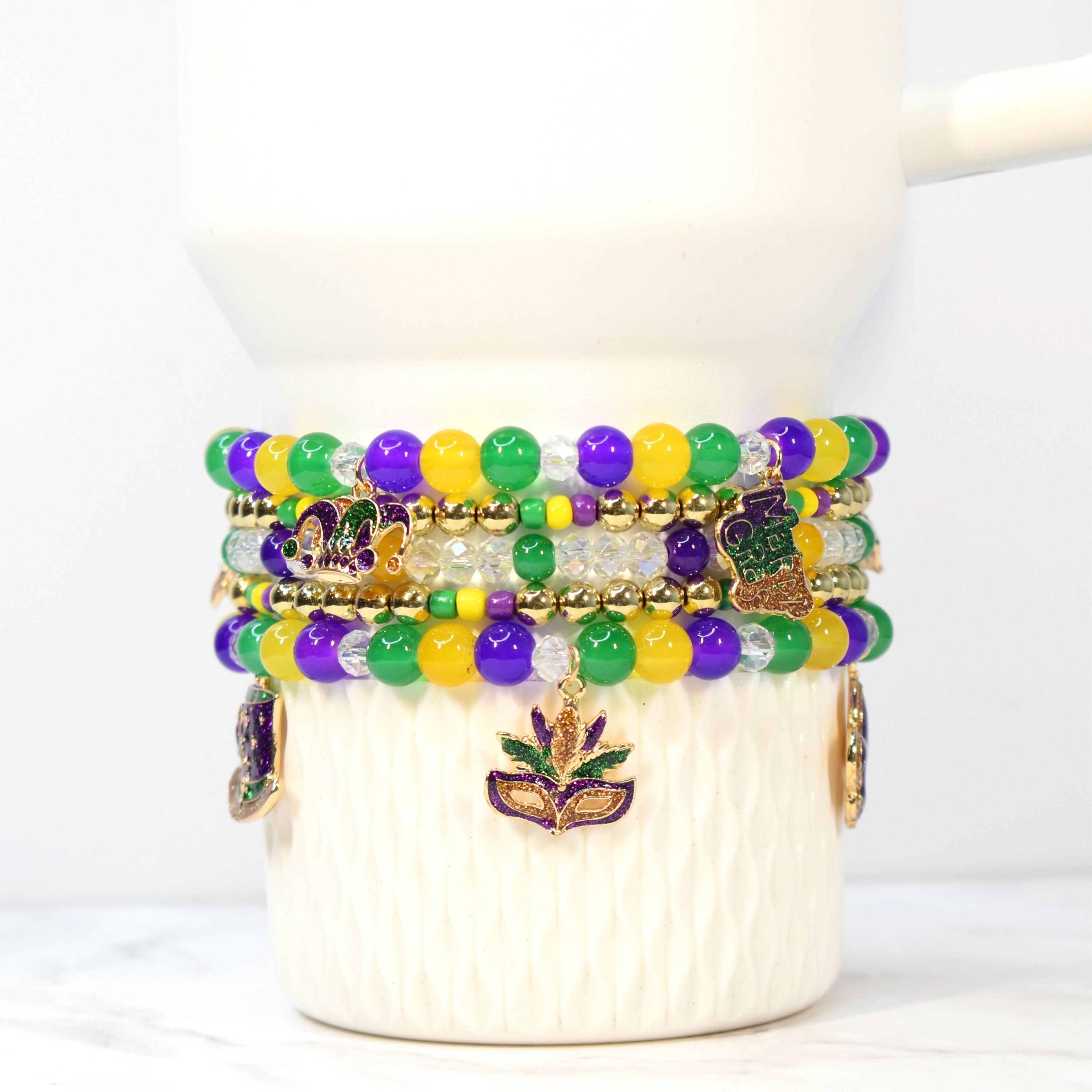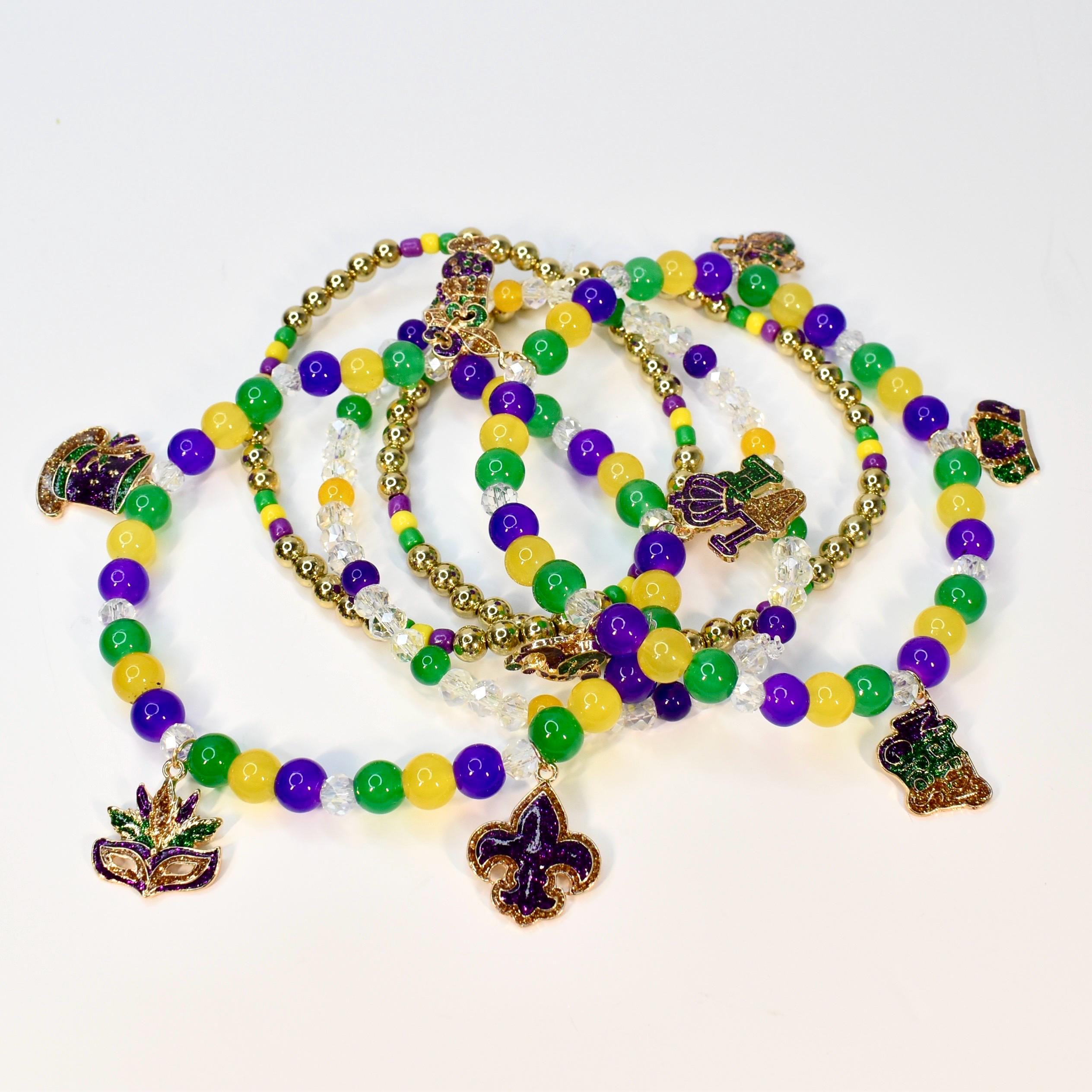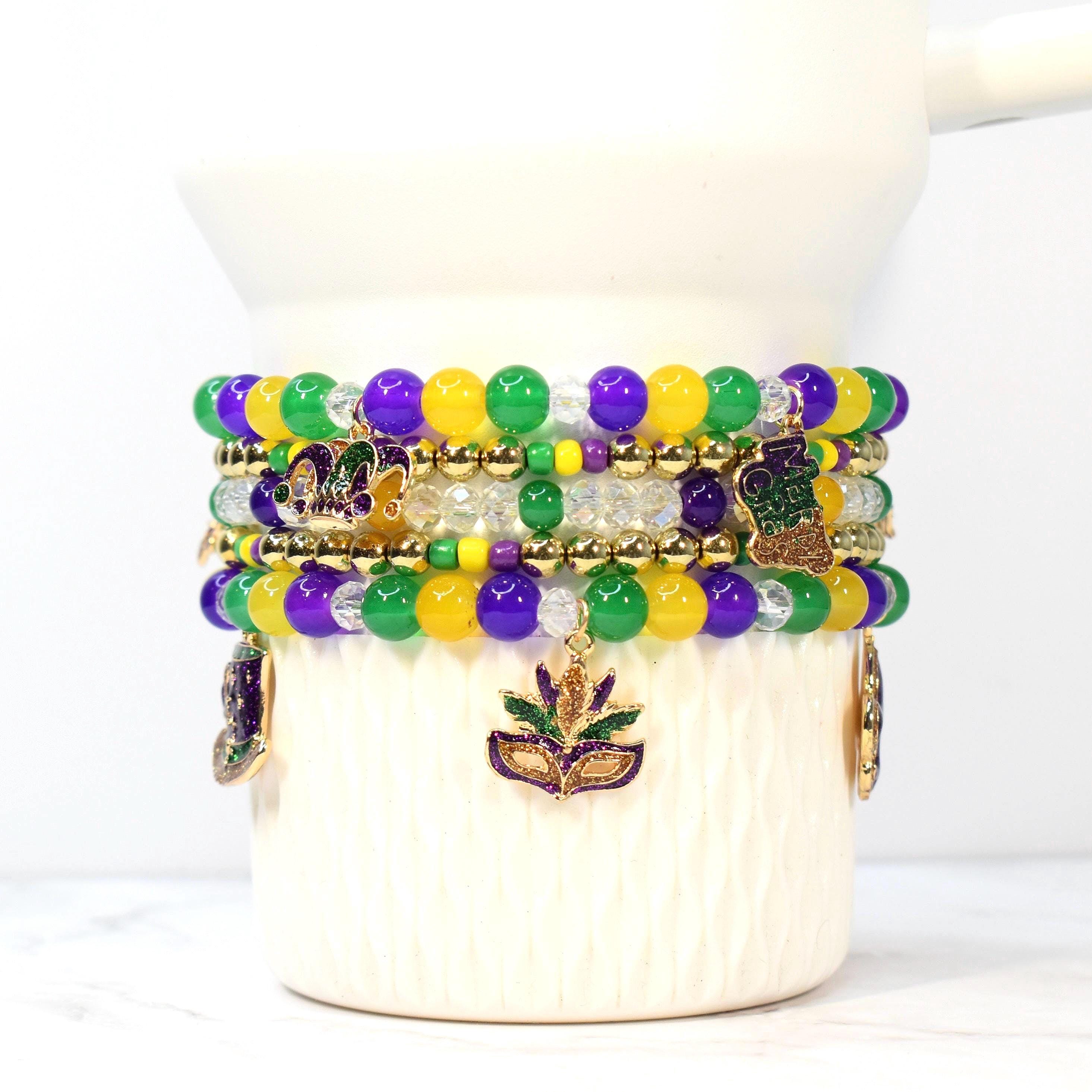 Laissez les bons temps rouler! Celebrate Mardi Gras in style with this vibrant 5-piece bracelet stack featuring the iconic purple, green and gold colors of carnival season. Each handcrafted bracelet is designed to wear individually or stacked together for maximum festive impact.