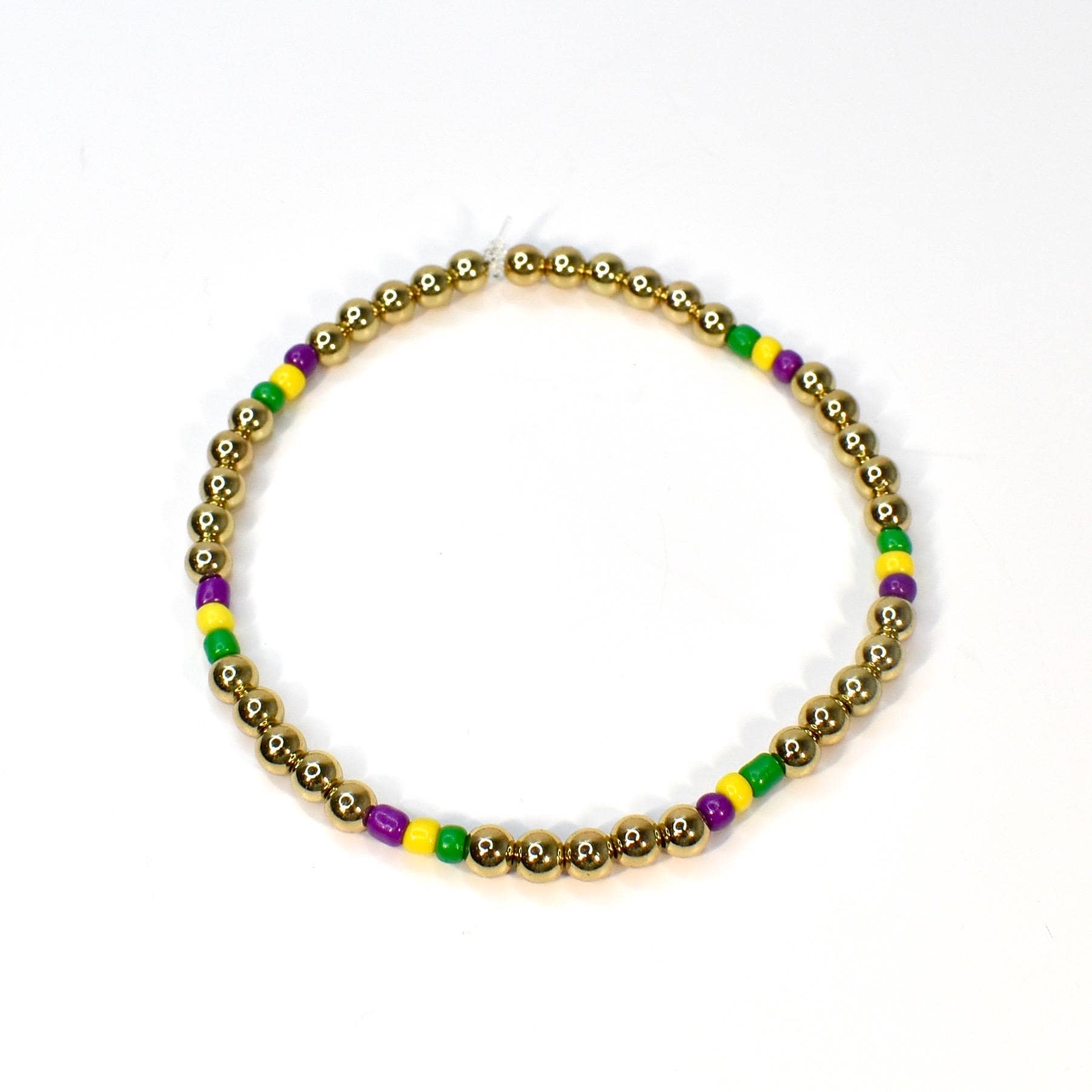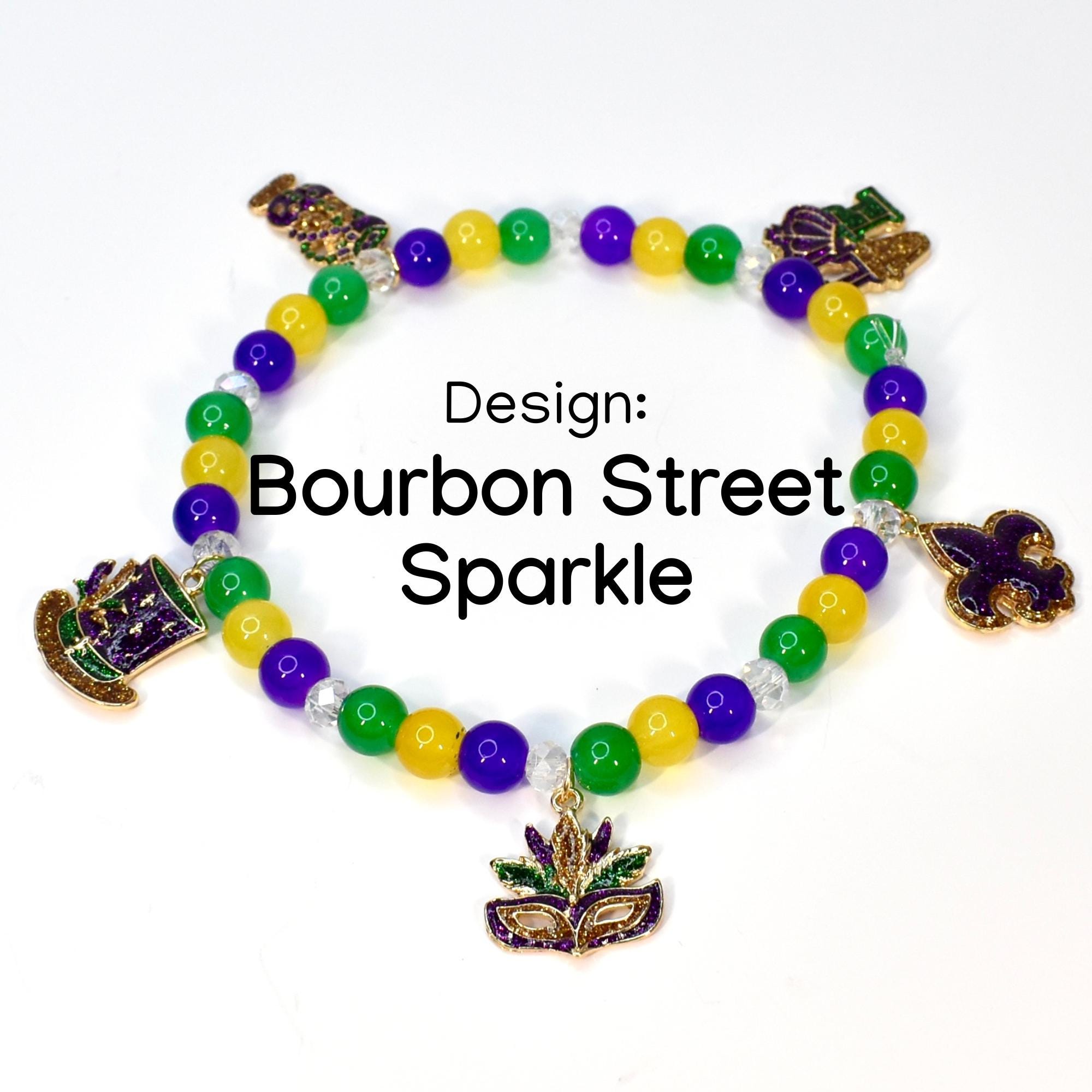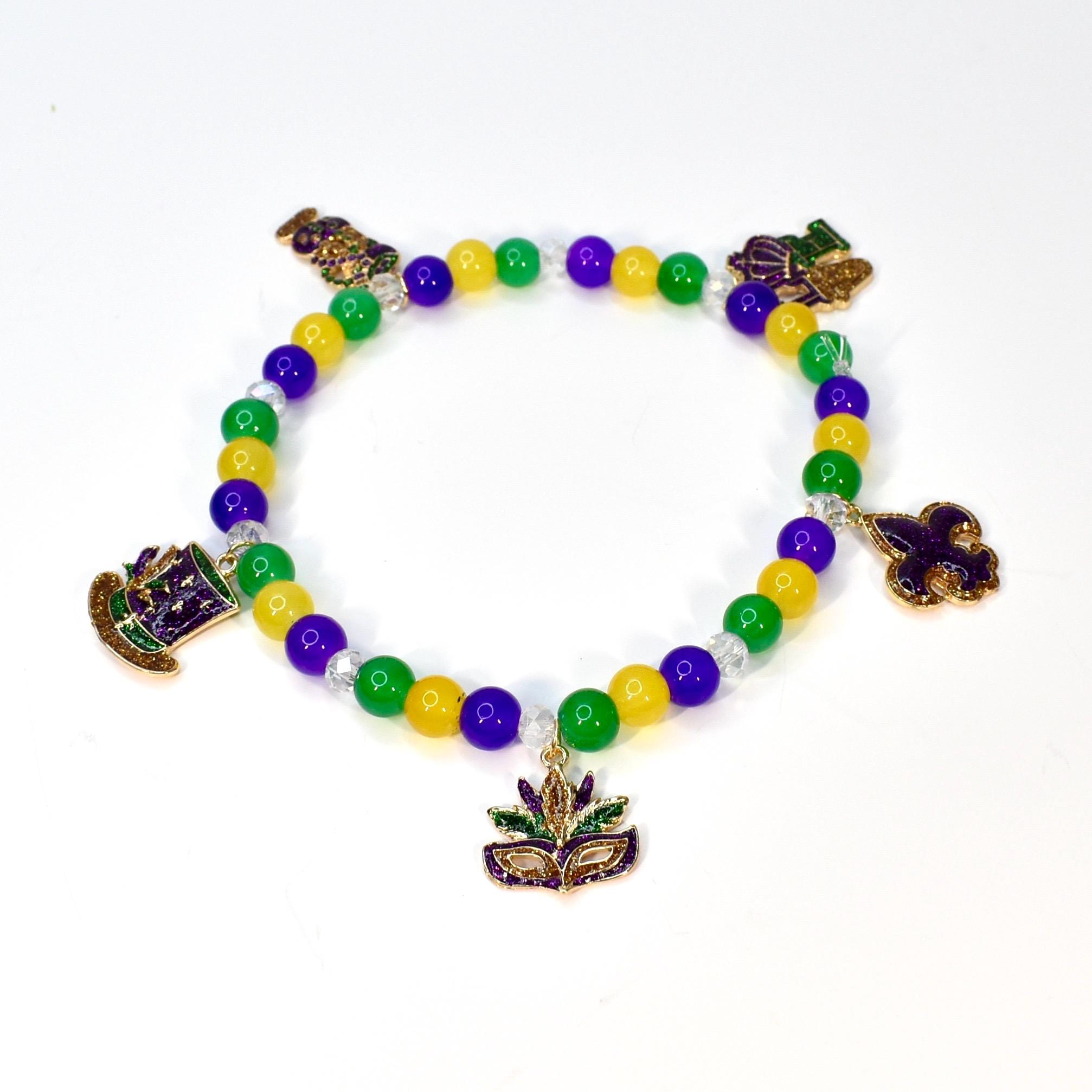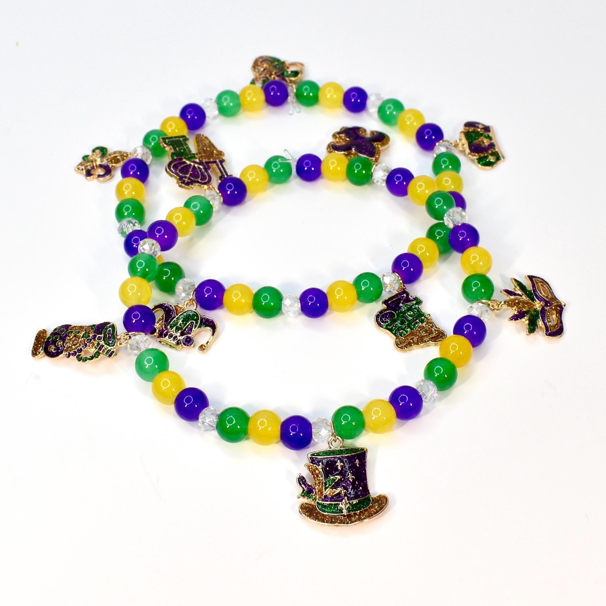 Laissez les bons temps rouler! Celebrate Mardi Gras in style with this vibrant 5-piece bracelet stack featuring the iconic purple, green and gold colors of carnival season. Each handcrafted bracelet is designed to wear individually or stacked together for maximum festive impact.