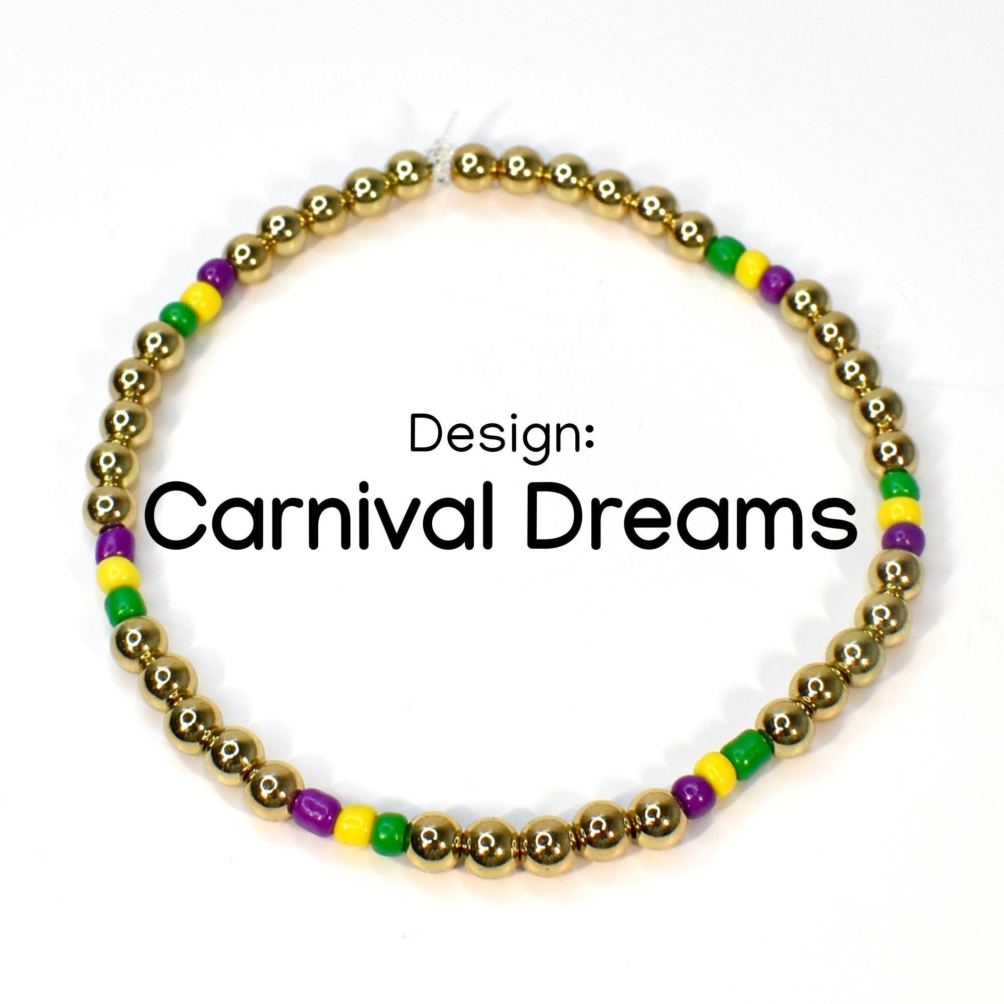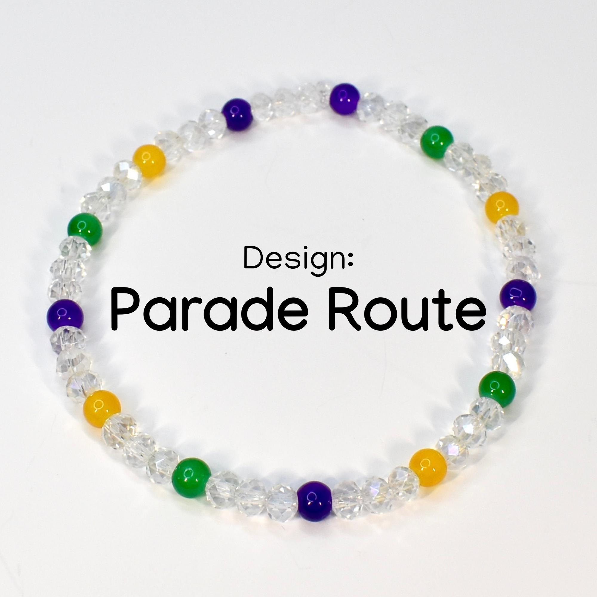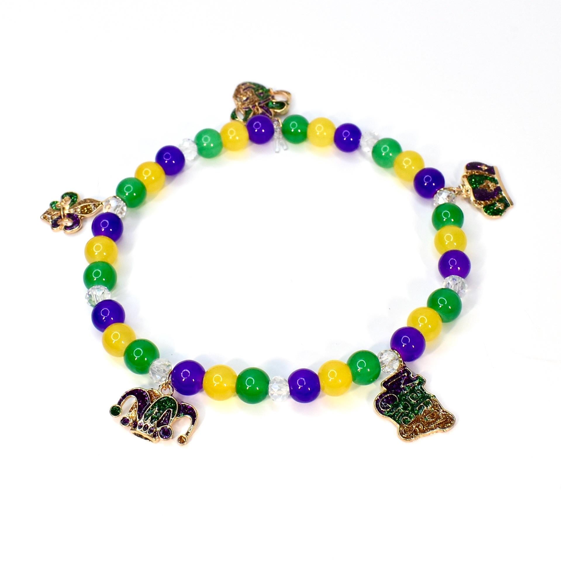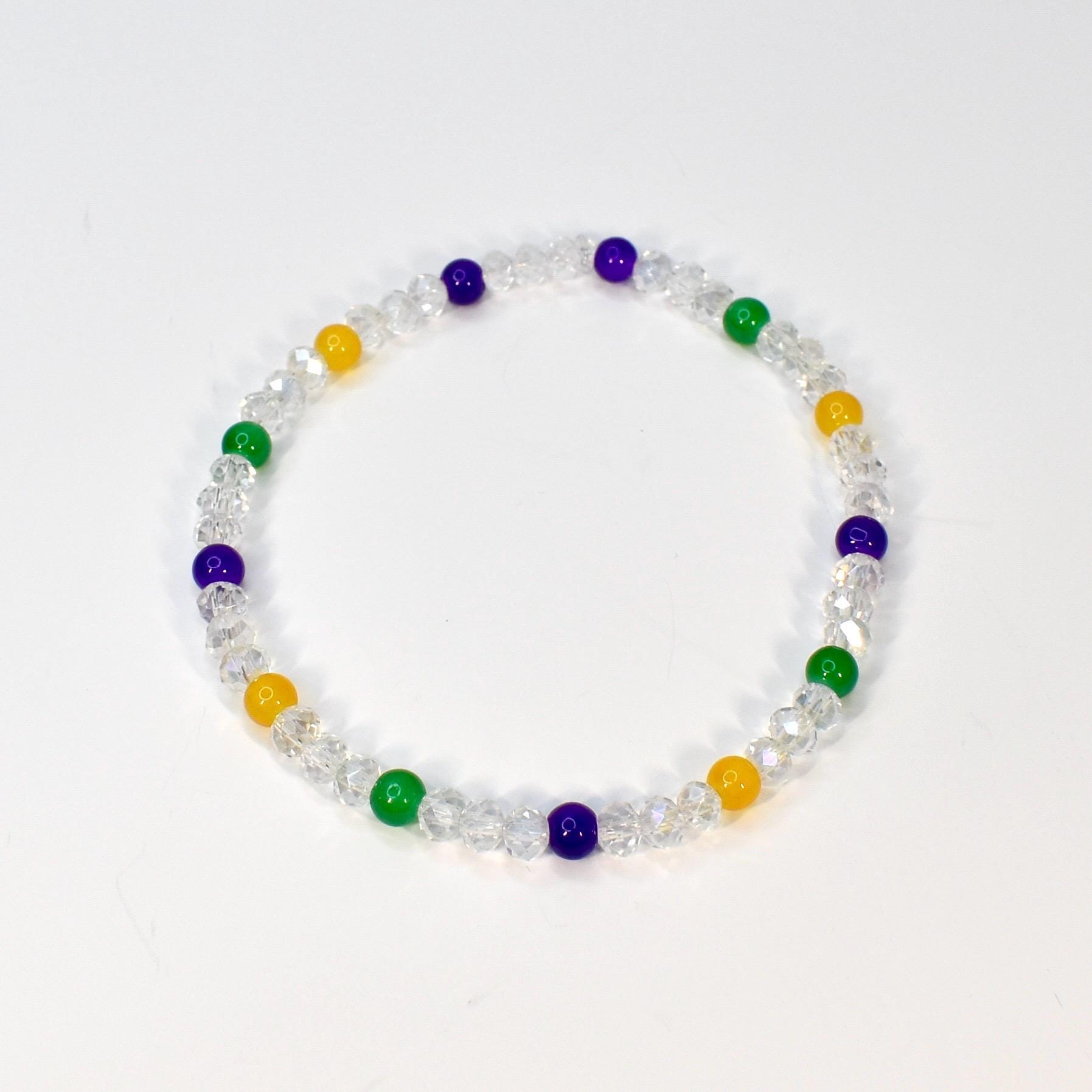 Laissez les bons temps rouler! Celebrate Mardi Gras in style with this vibrant 5-piece bracelet stack featuring the iconic purple, green and gold colors of carnival season. Each handcrafted bracelet is designed to wear individually or stacked together for maximum festive impact.