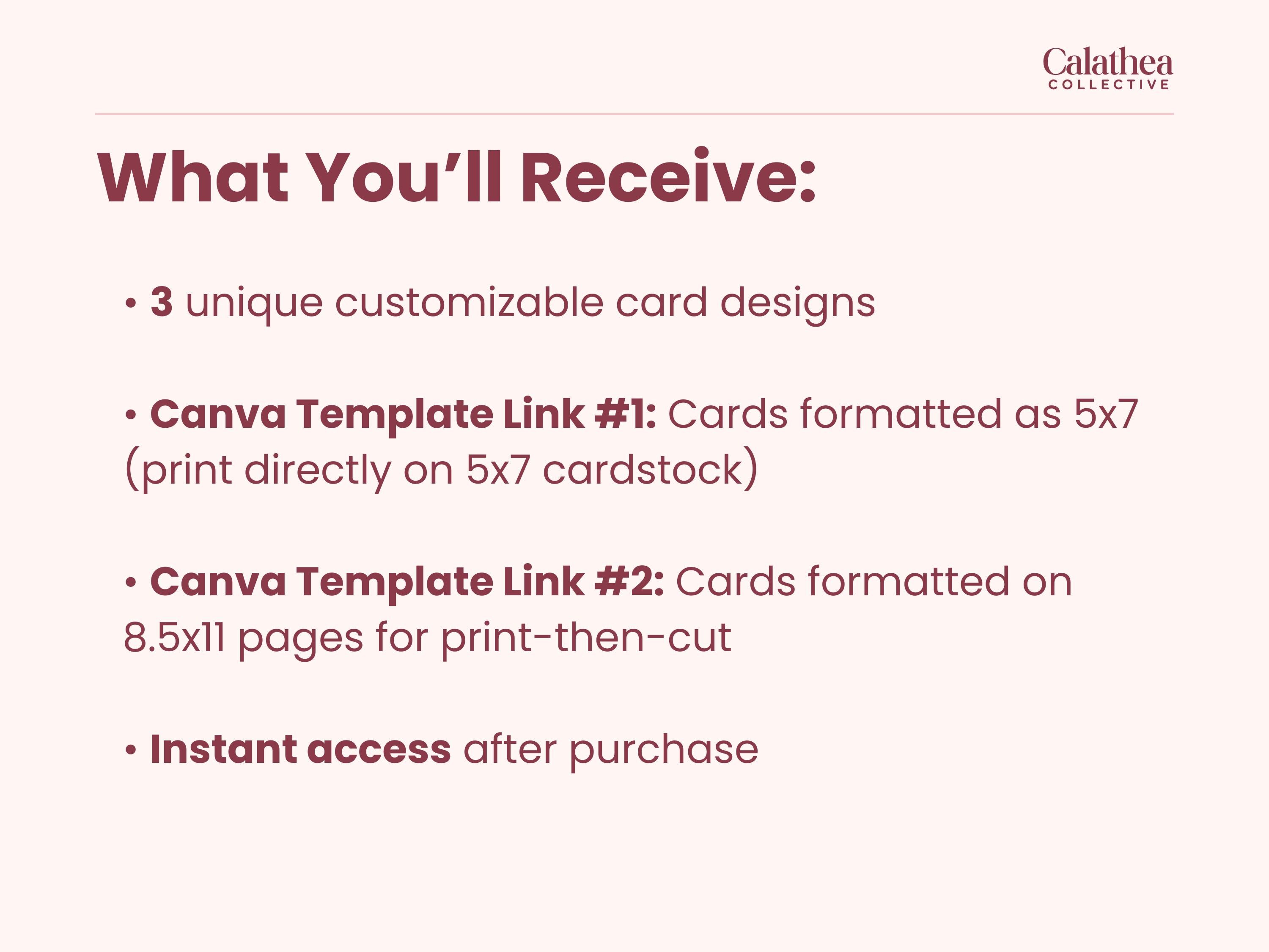 - A PDF with two Canva template links: 1) 5x7" editable template and 2) 8.5x11" template to print and cut the note cards on any printer