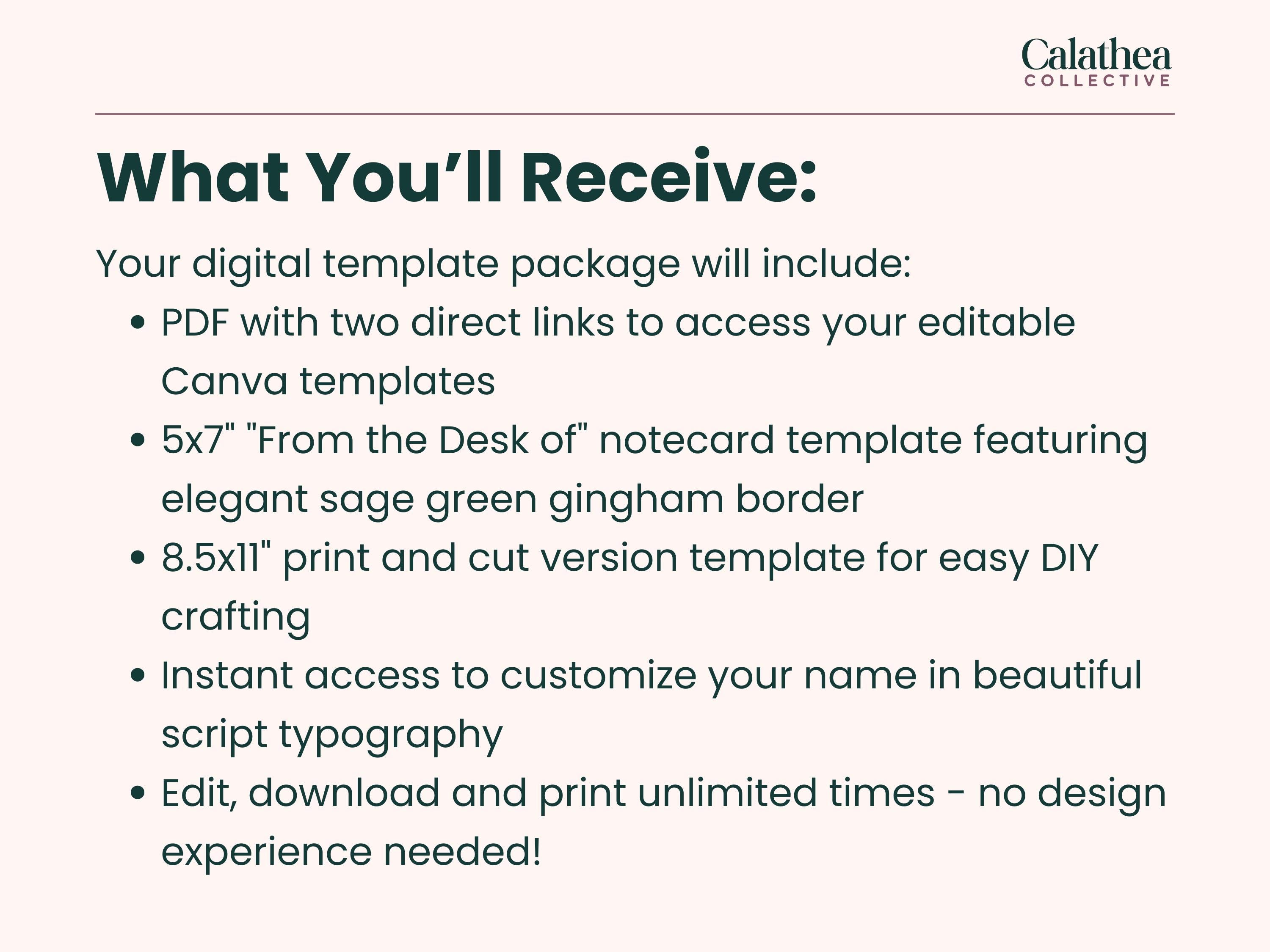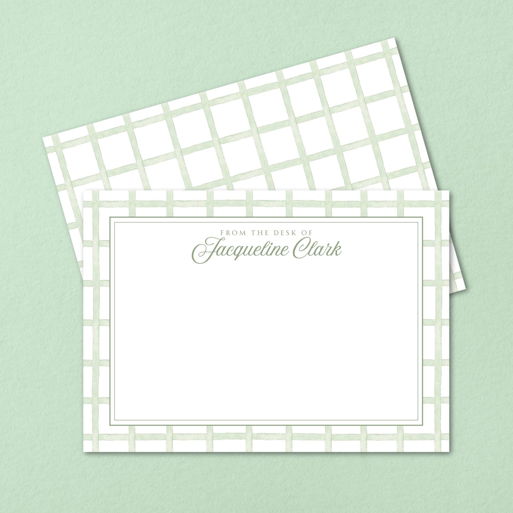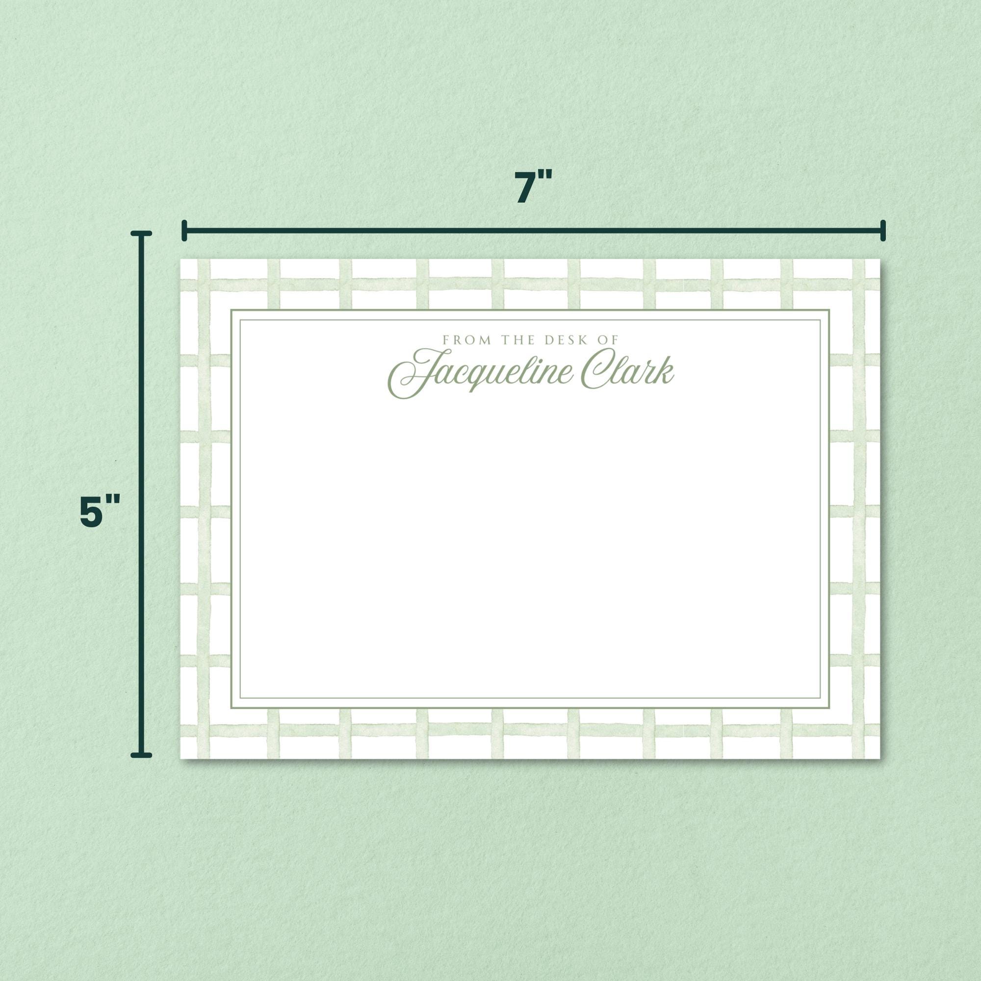 • 5x7" "From the Desk of" notecard template featuring elegant sage green gingham border