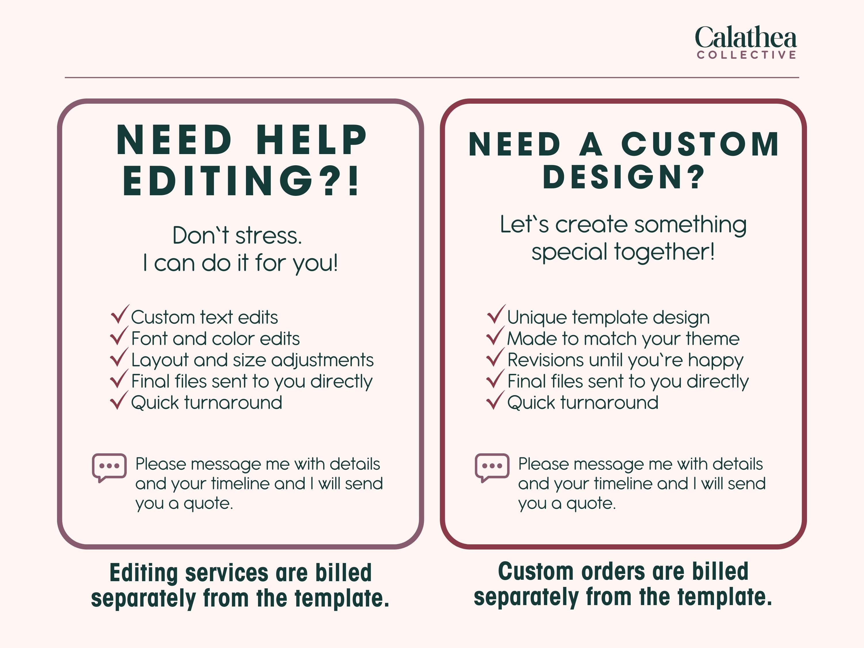 Most of Calathea Collective's products are handmade to order, which means they are created just for you! Because of the custom nature, we don't accept returns or exchanges. That said, if there’s ever an issue with your order—like damage during shipping or a mistake on our end—please reach out within 7 days. We want you to love your purchase and will always do our best to make it right.