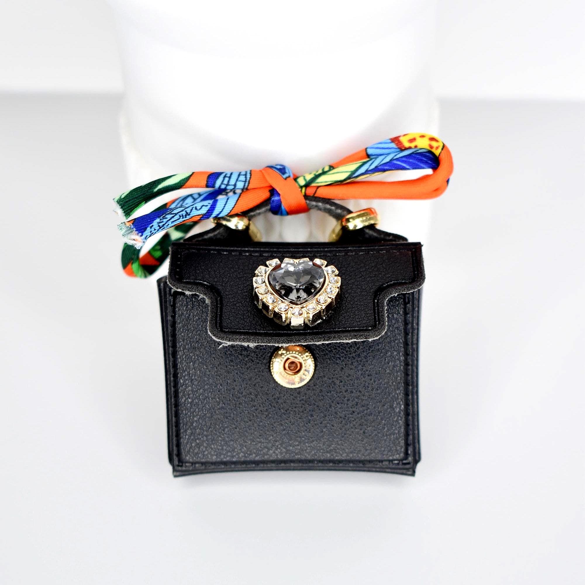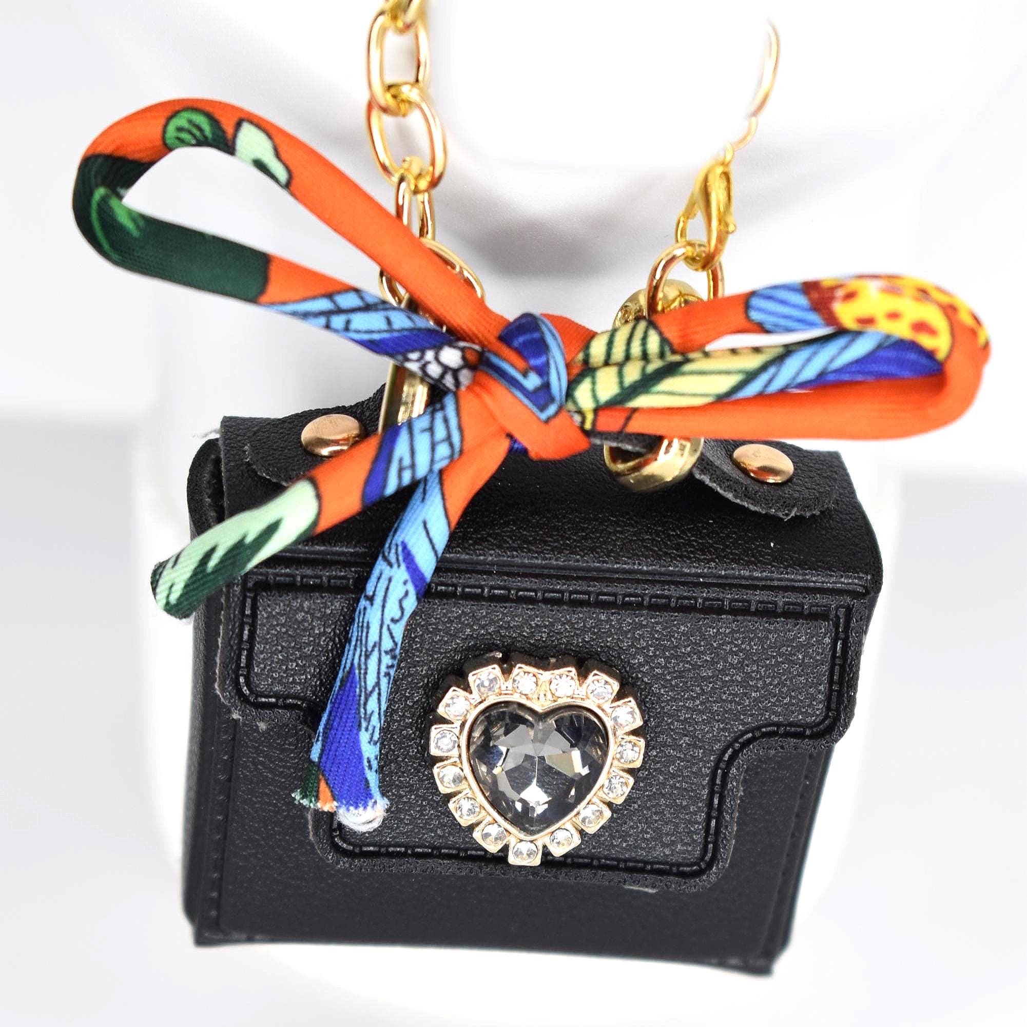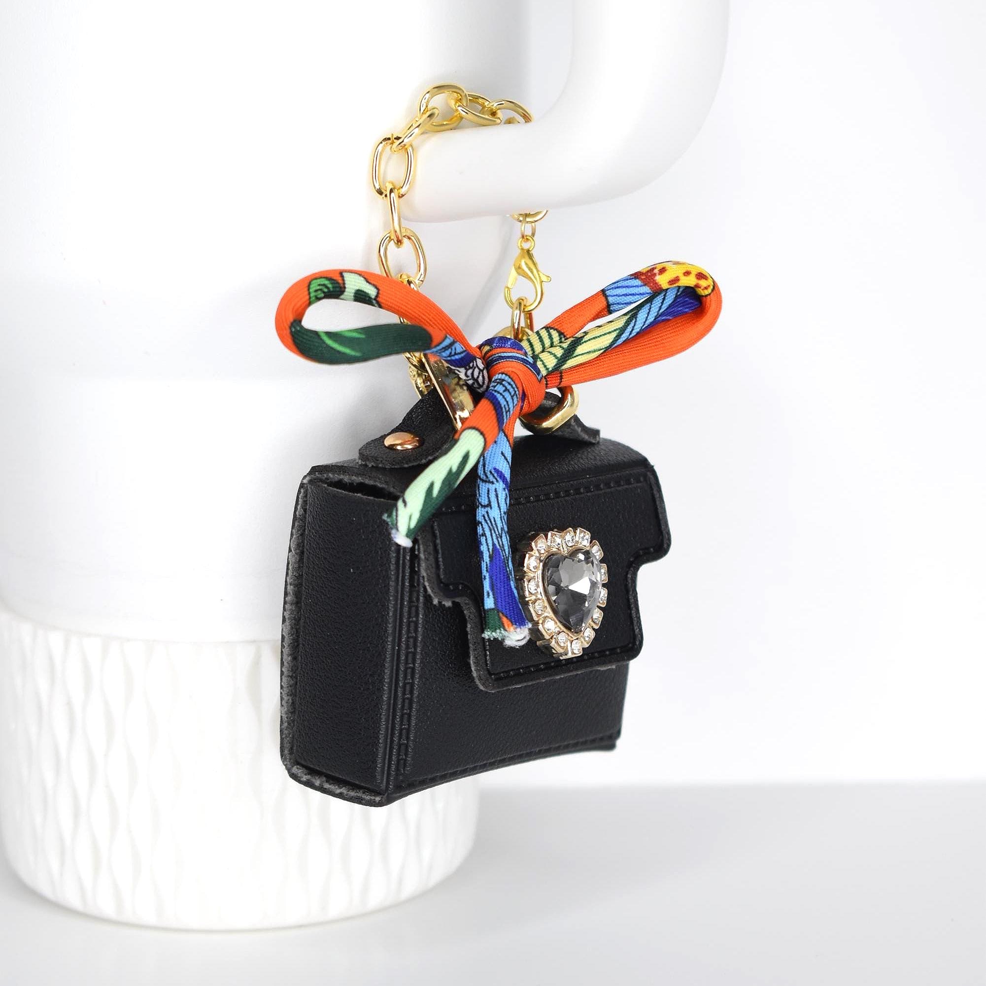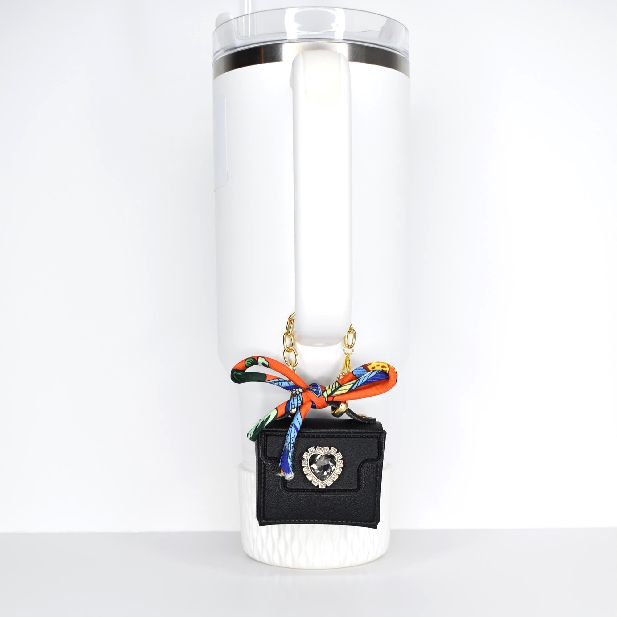 Your tumbler just got a major upgrade! This adorable mini purse charm features a chic black bag with a stunning jeweled crystal accent and a vibrant silk scarf detail that brings designer vibes to your daily sip.