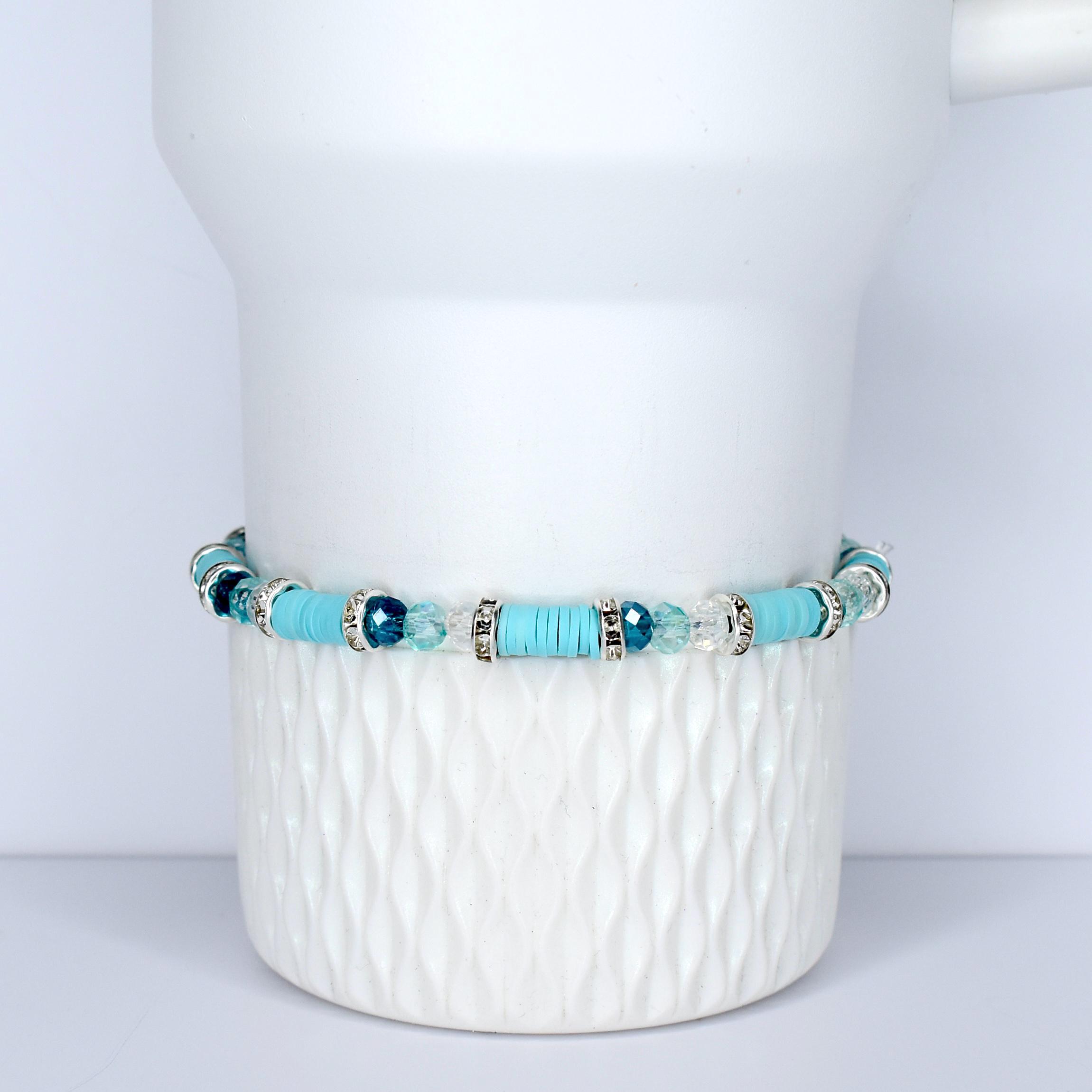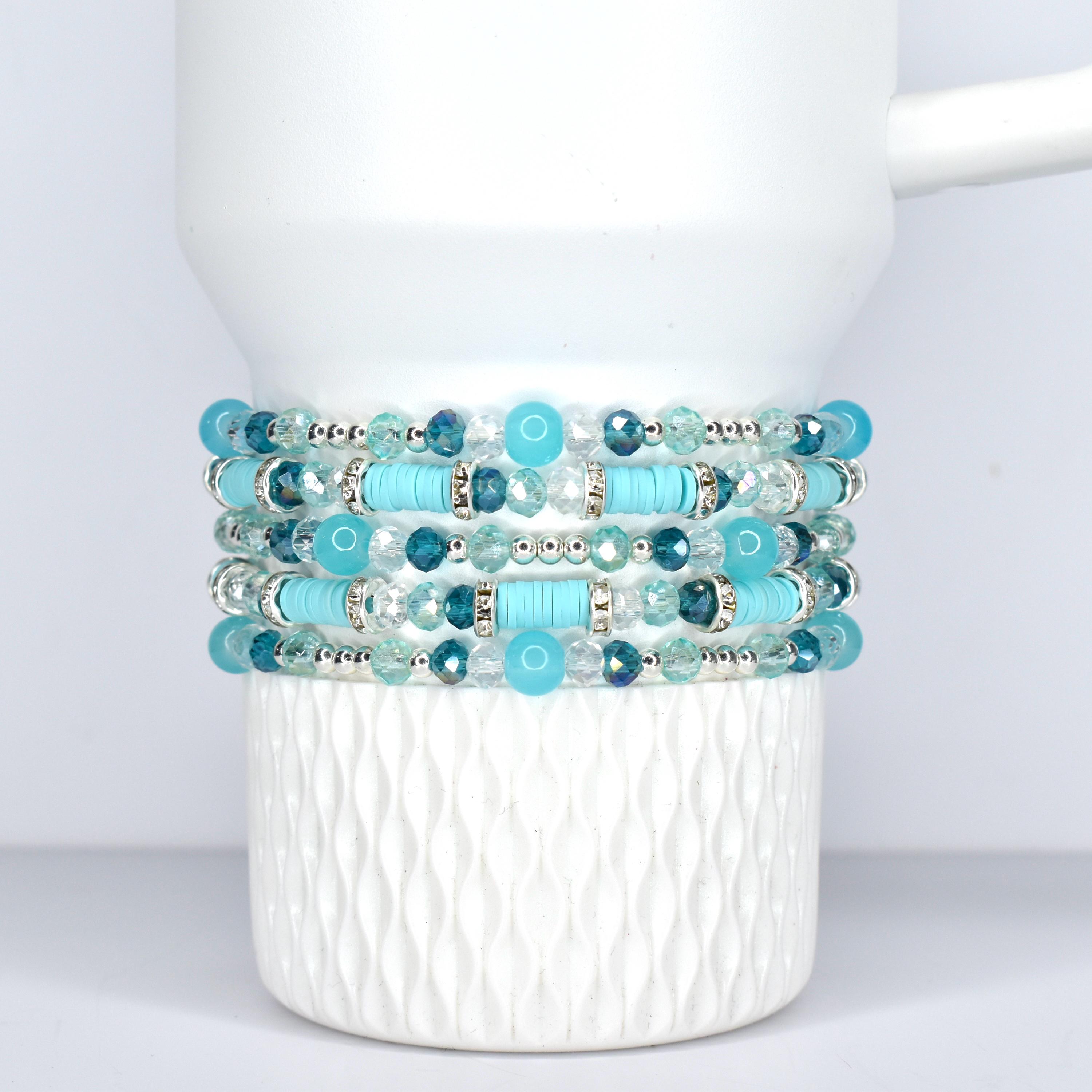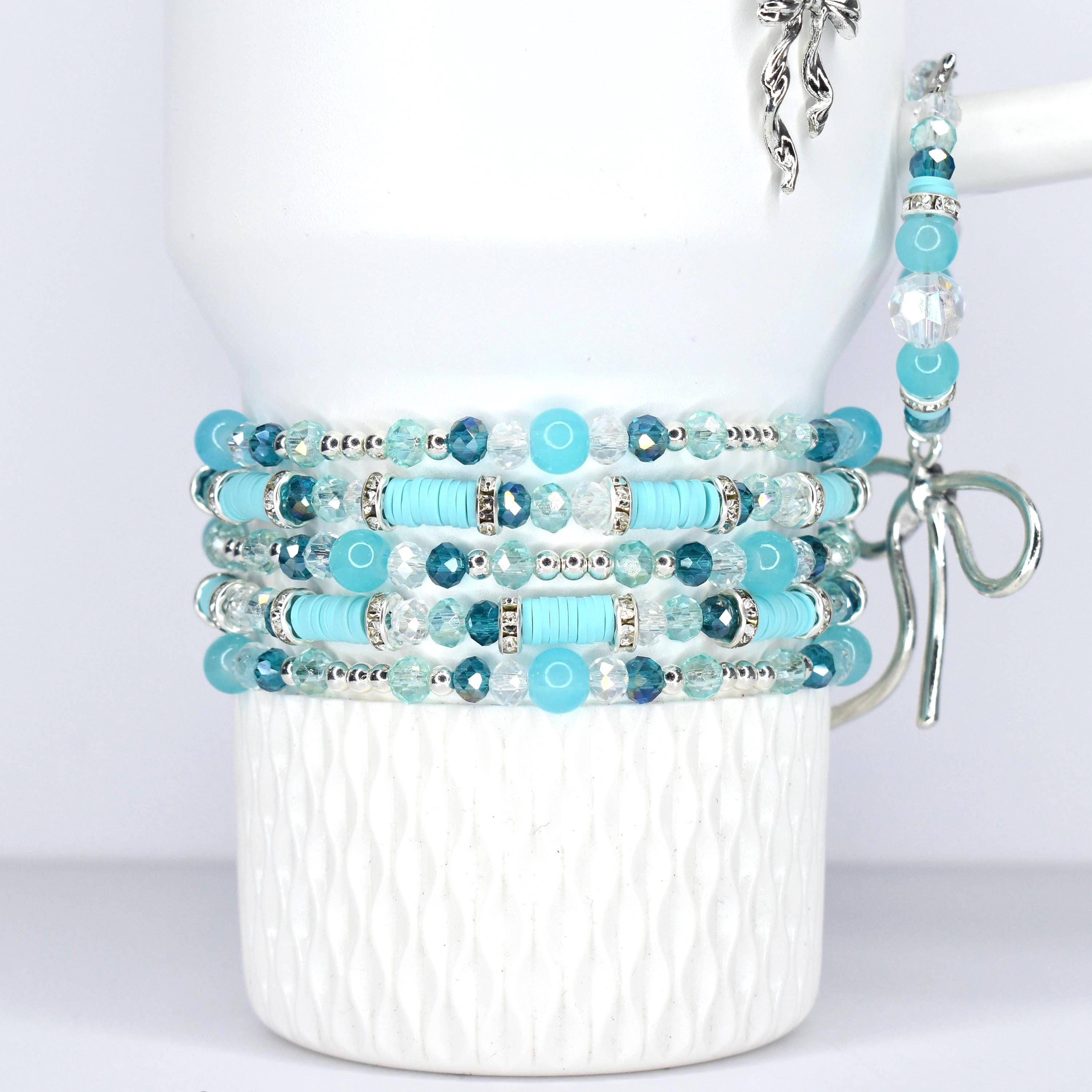 Meet your new favorite cup accessory! This stunning 5-piece bracelet collection features gorgeous ocean-inspired tones in turquoise, teal and crystal clear with silver accents that bring coastal vibes to every sip.
