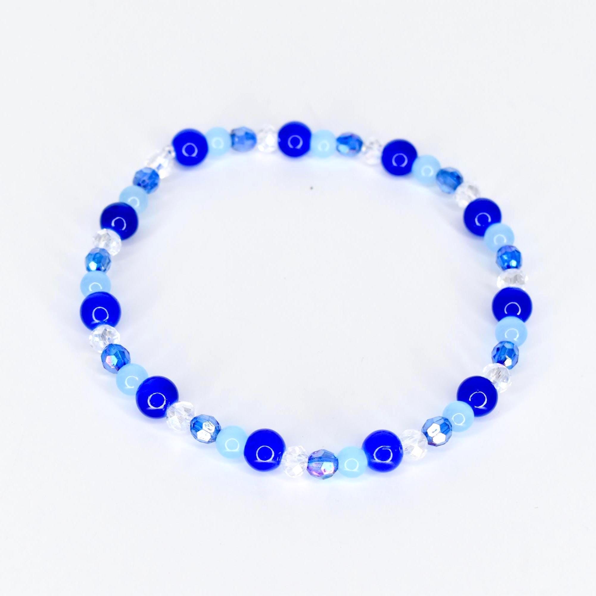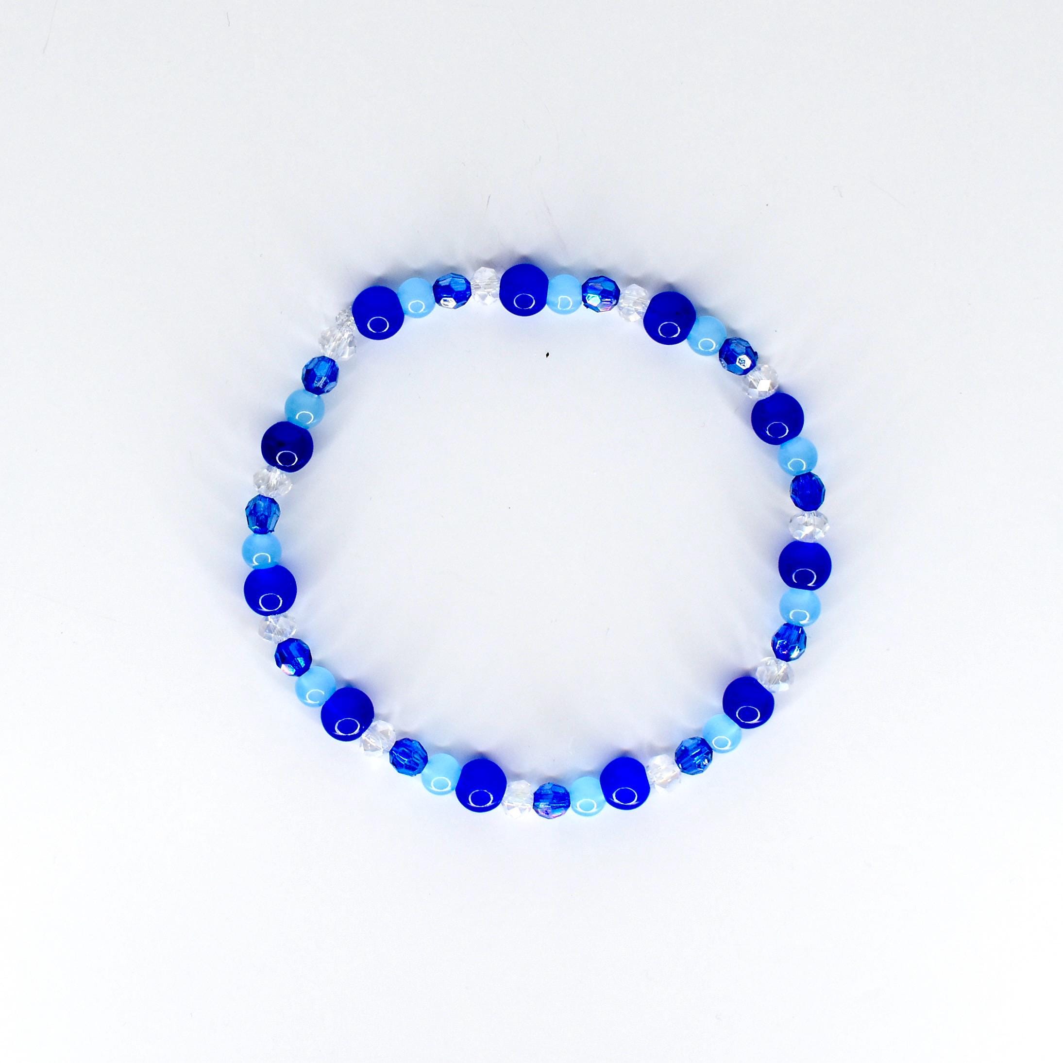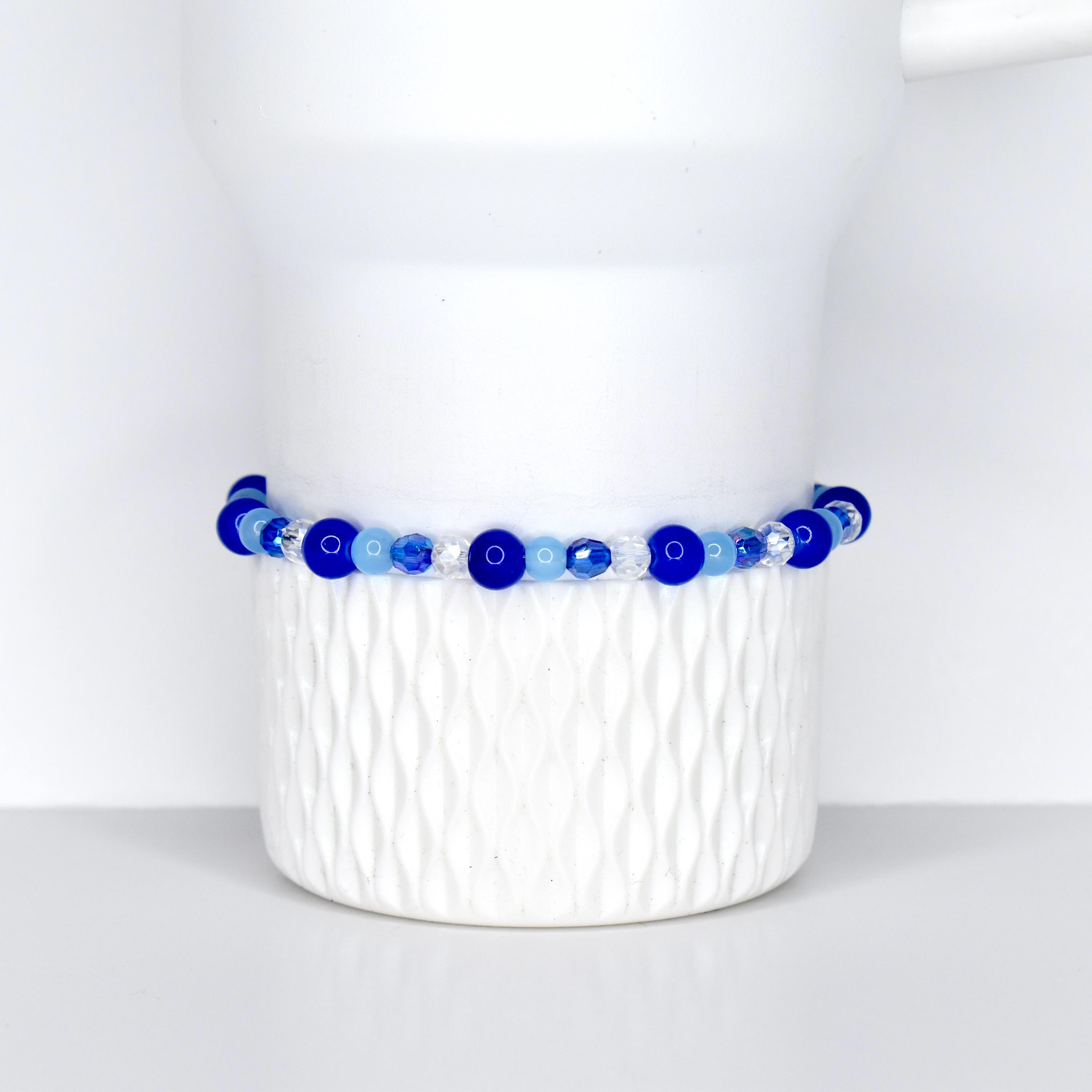 Add a pop of blue to your tumbler or your wrist! This handmade beaded bracelet features a gorgeous mix of cobalt, light blue and clear crystal beads that catch the light beautifully. Perfect on its own or grab a few to build your own custom stack.
