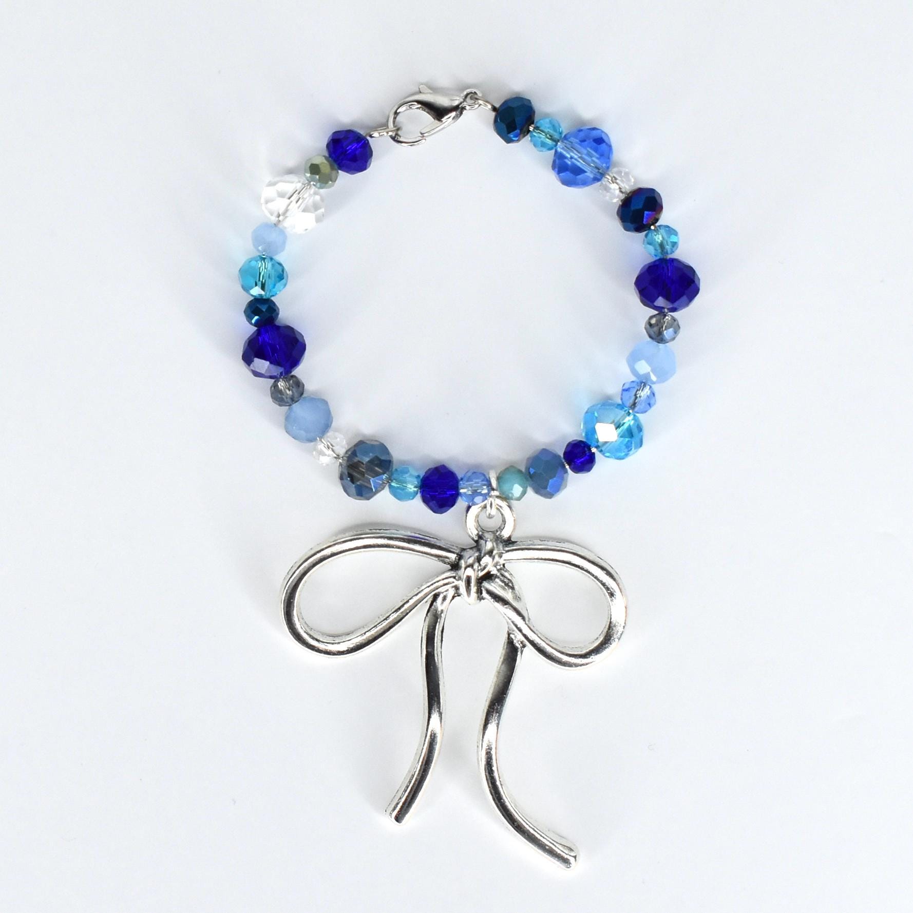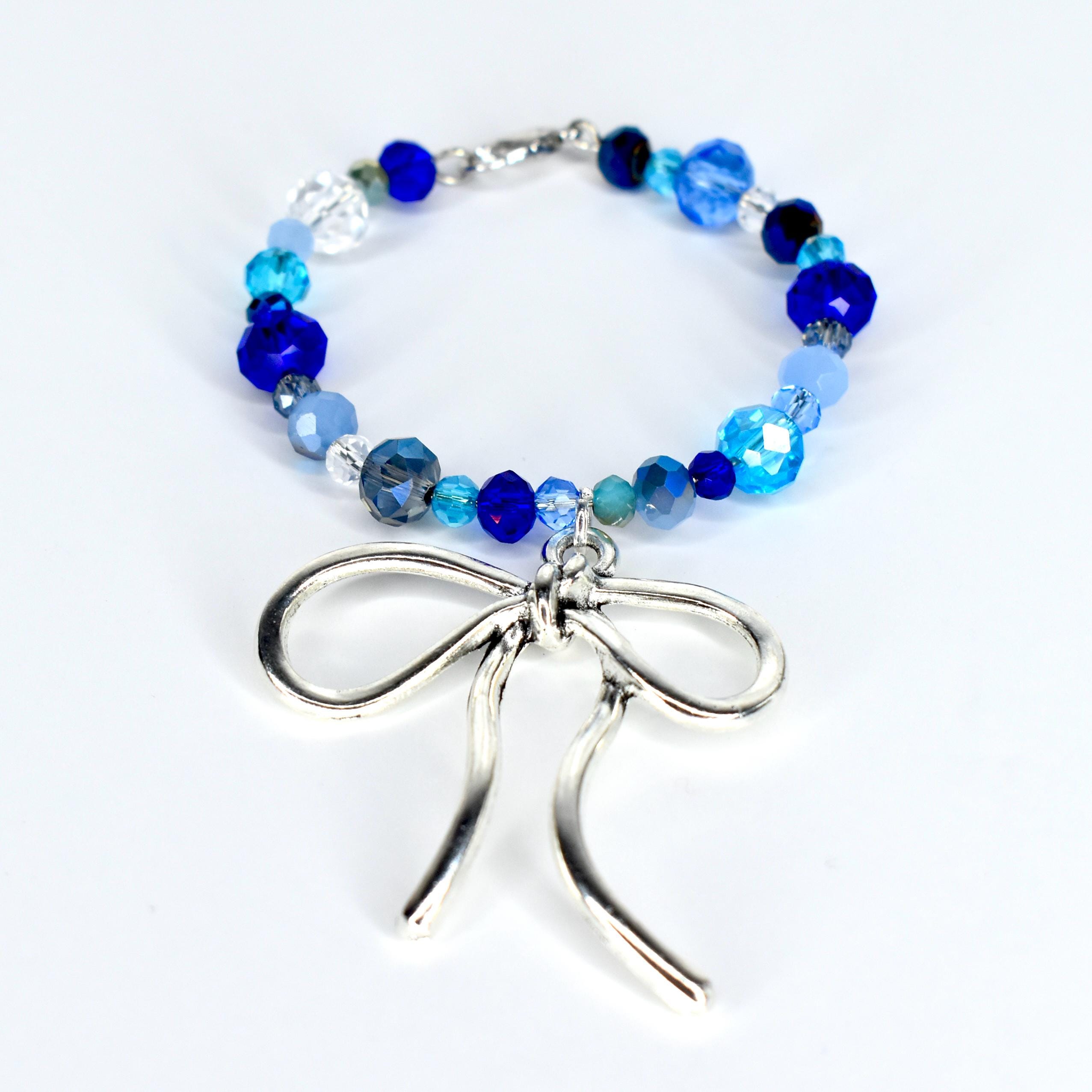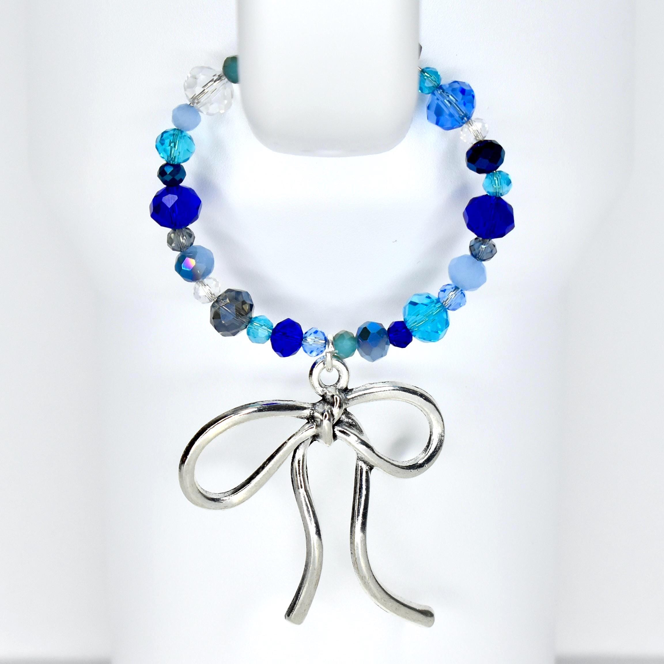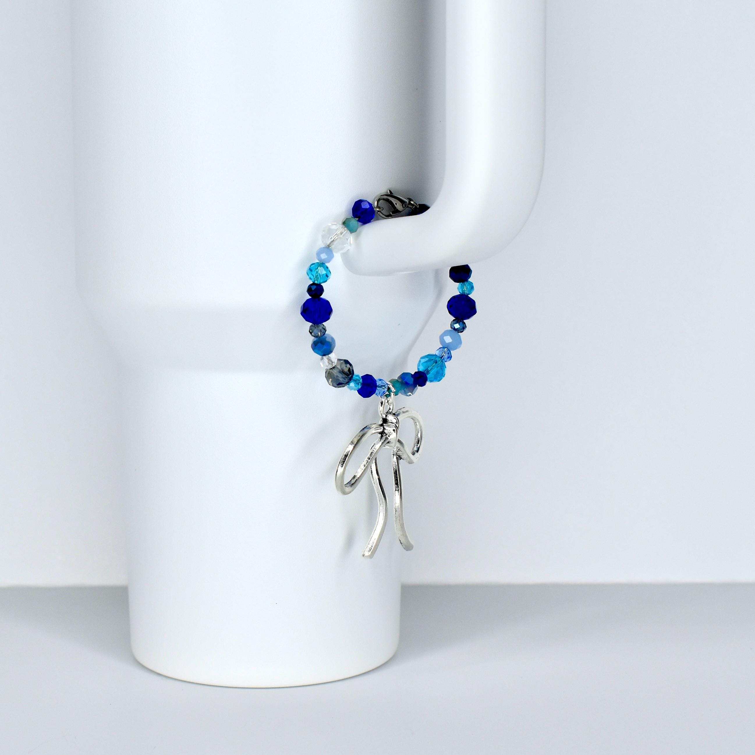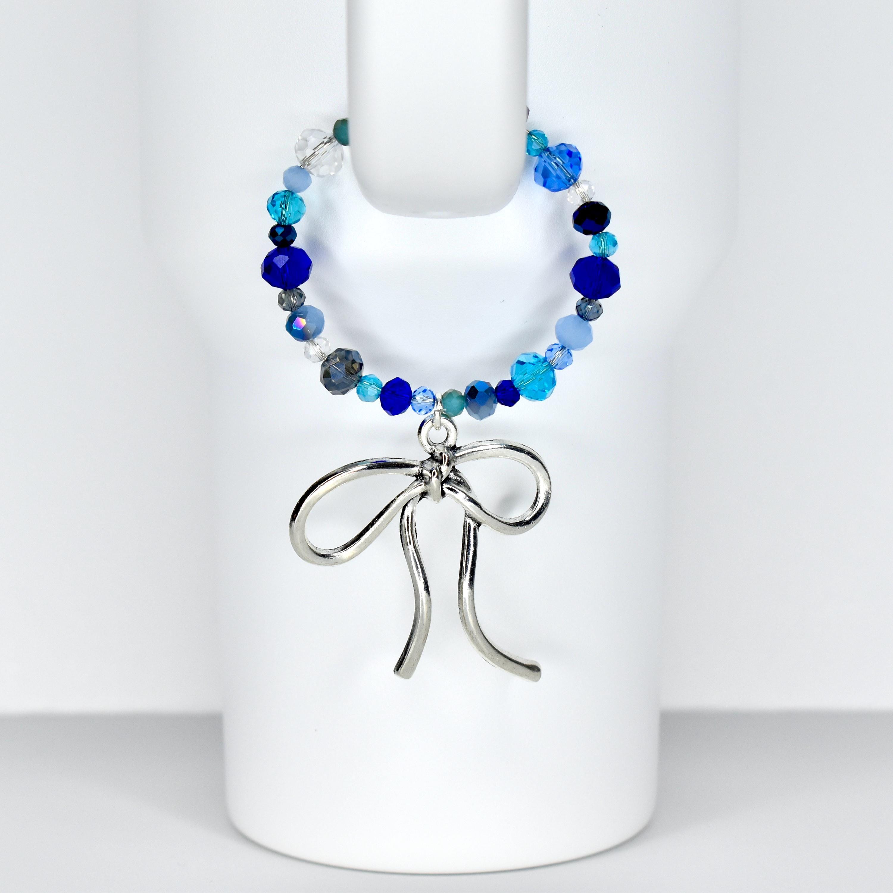Dress up your tumbler handle with this stunning blue crystal handle bracelet featuring an oversized silver bow charm. The mix of cobalt, aqua, navy and clear faceted beads gives this piece so much sparkle and dimension — and that bow? Obsessed.