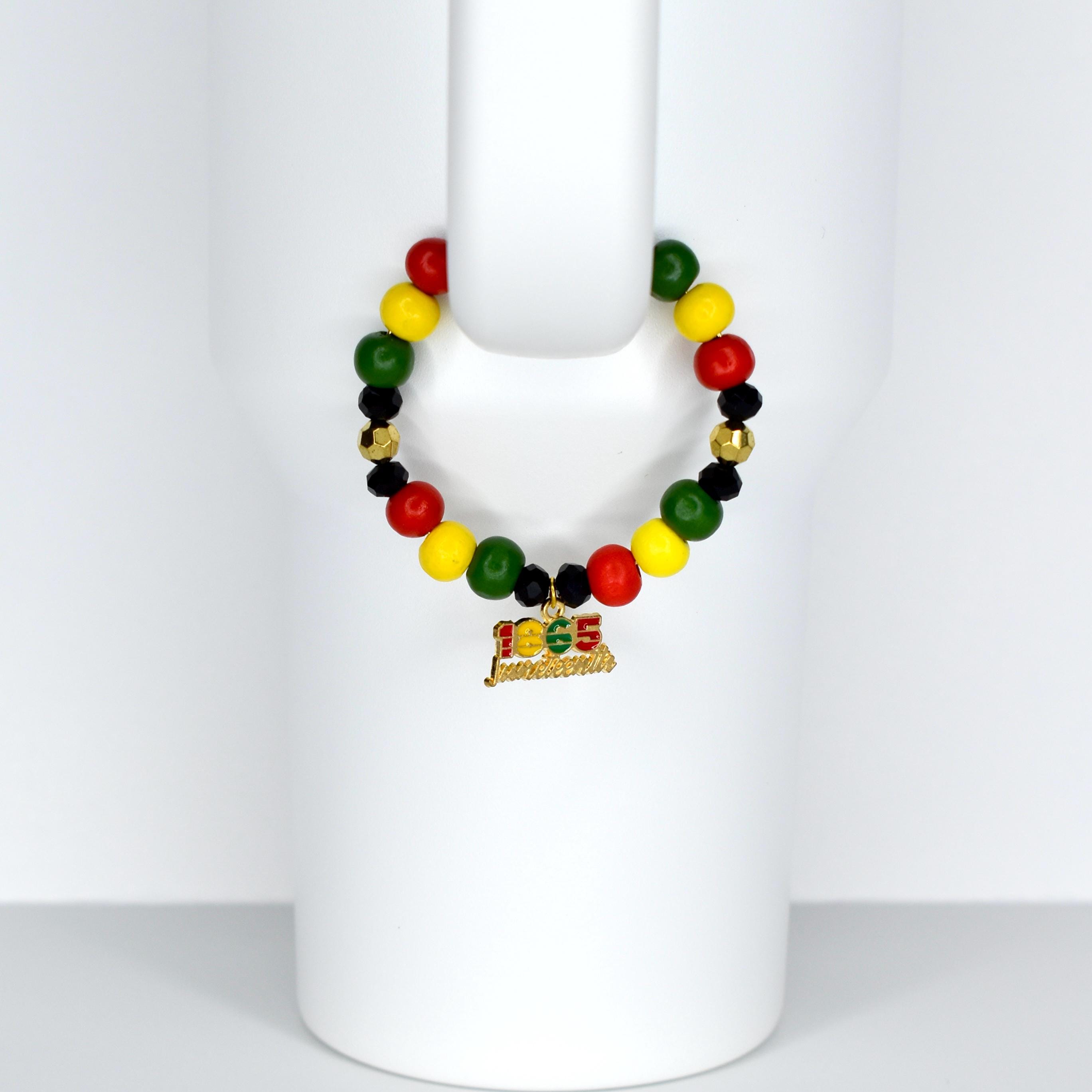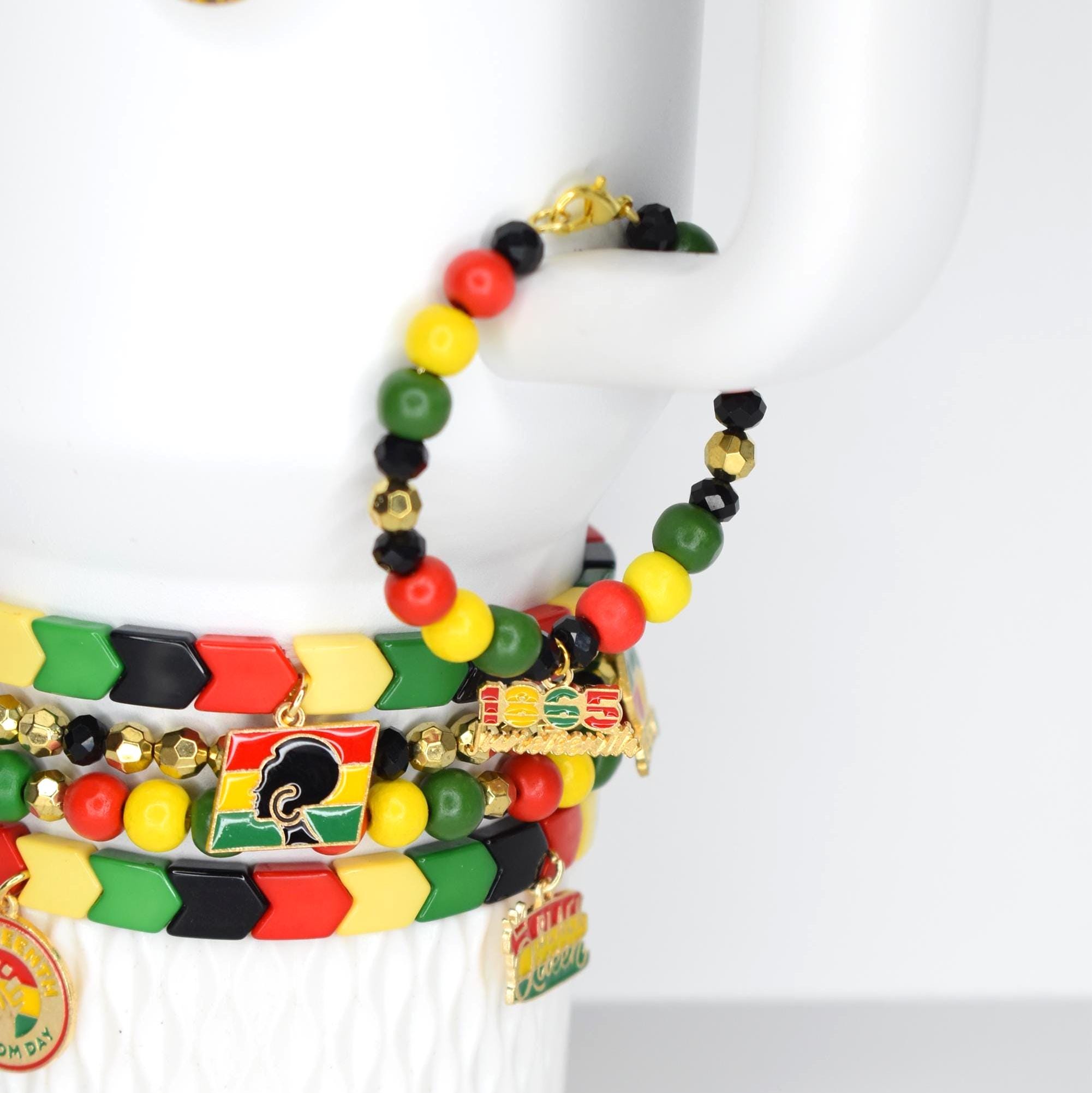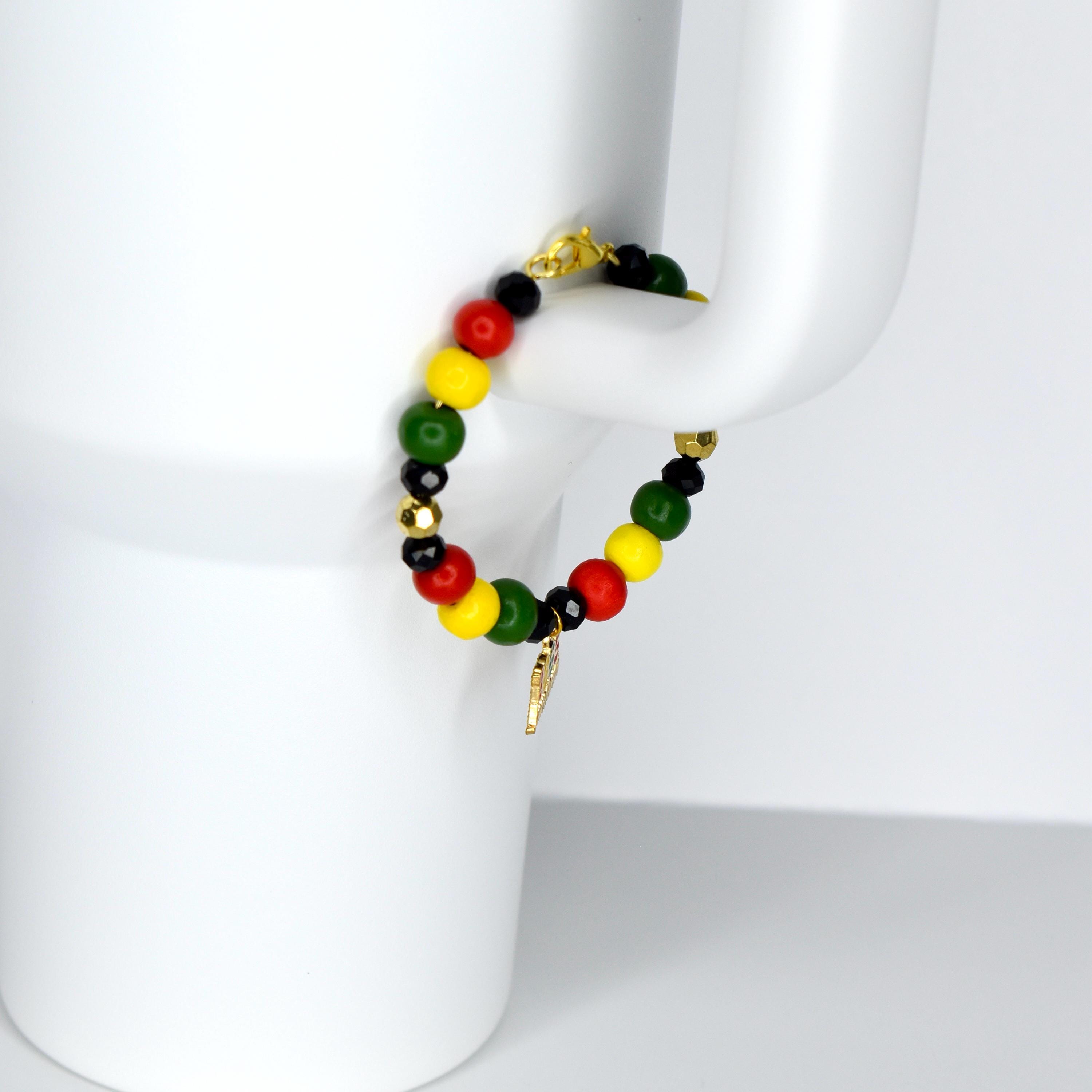 Complete your Juneteenth tumbler setup with this handmade handle bracelet in red, black, green and yellow beads with gold accents. This piece hangs beautifully from your tumbler handle and pairs perfectly with our Freedom Day bracelet stack.