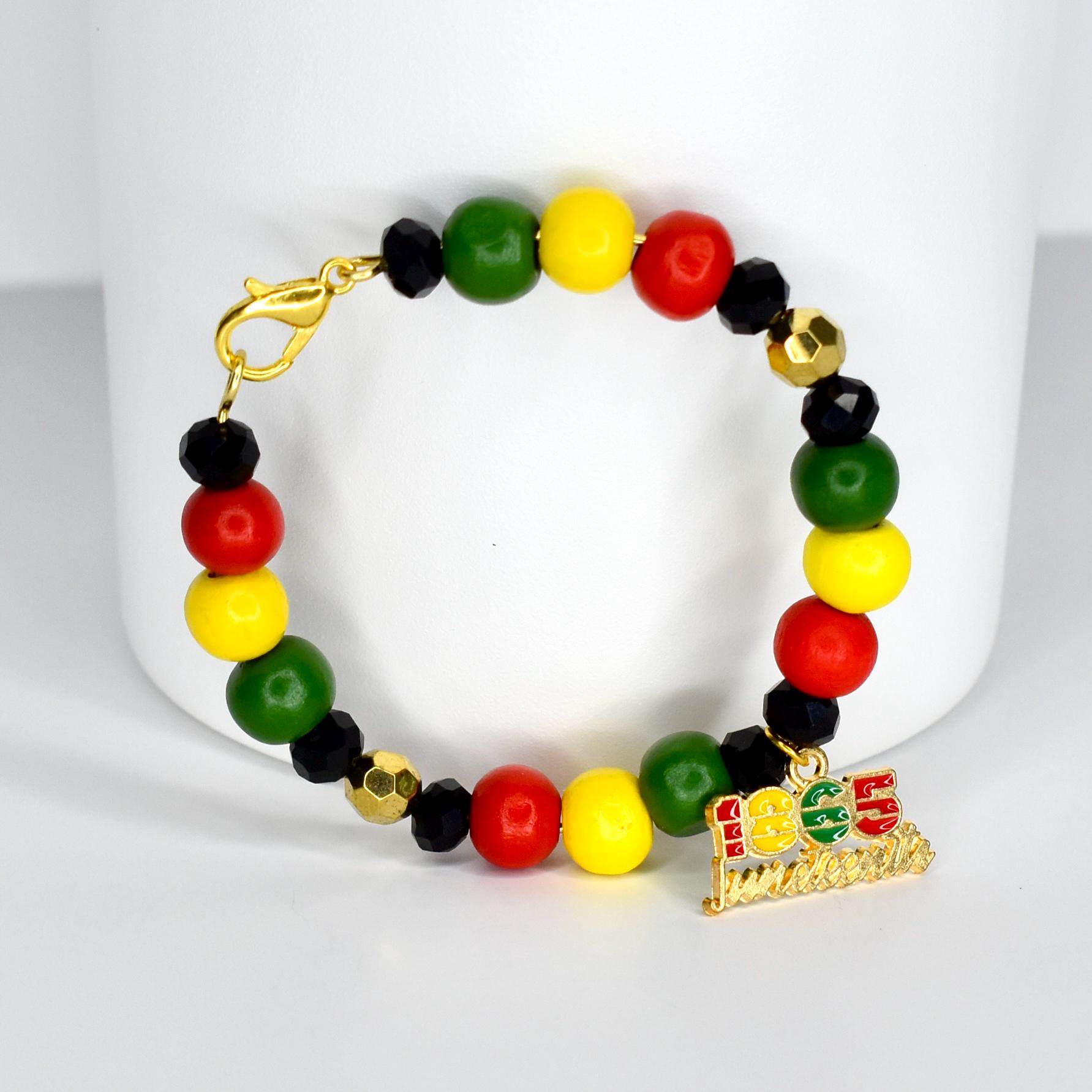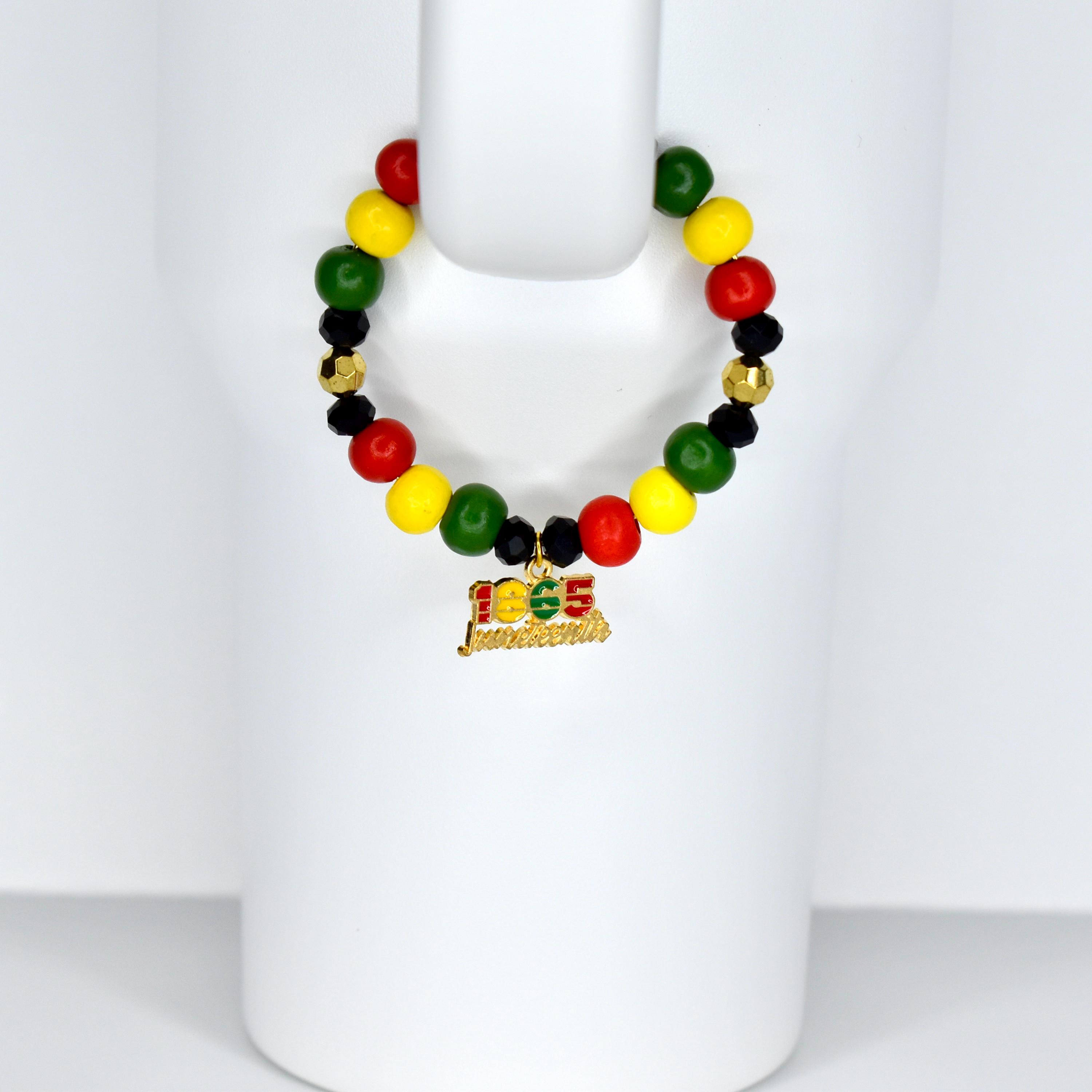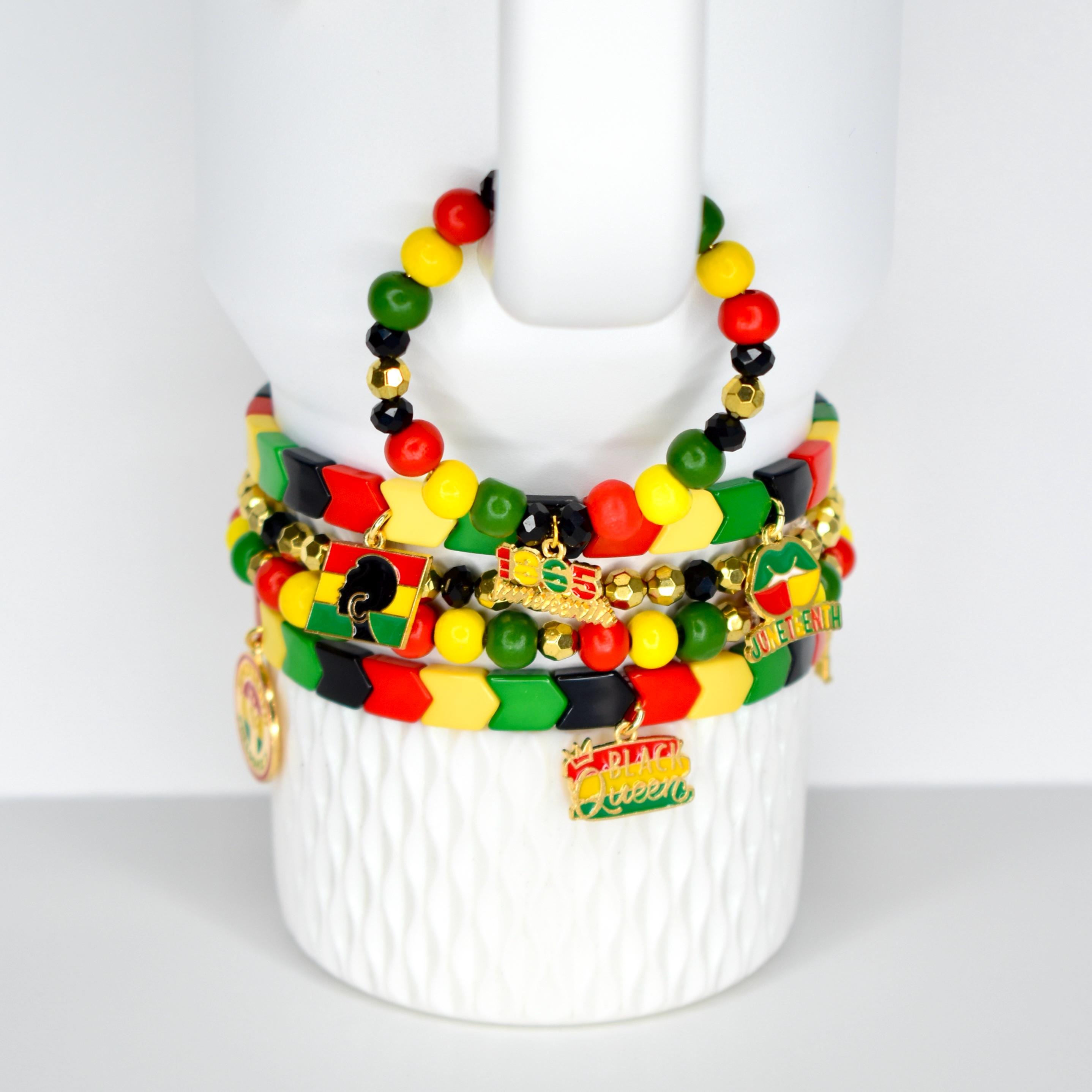 Complete your Juneteenth tumbler setup with this handmade handle bracelet in red, black, green and yellow beads with gold accents. This piece hangs beautifully from your tumbler handle and pairs perfectly with our Freedom Day bracelet stack.