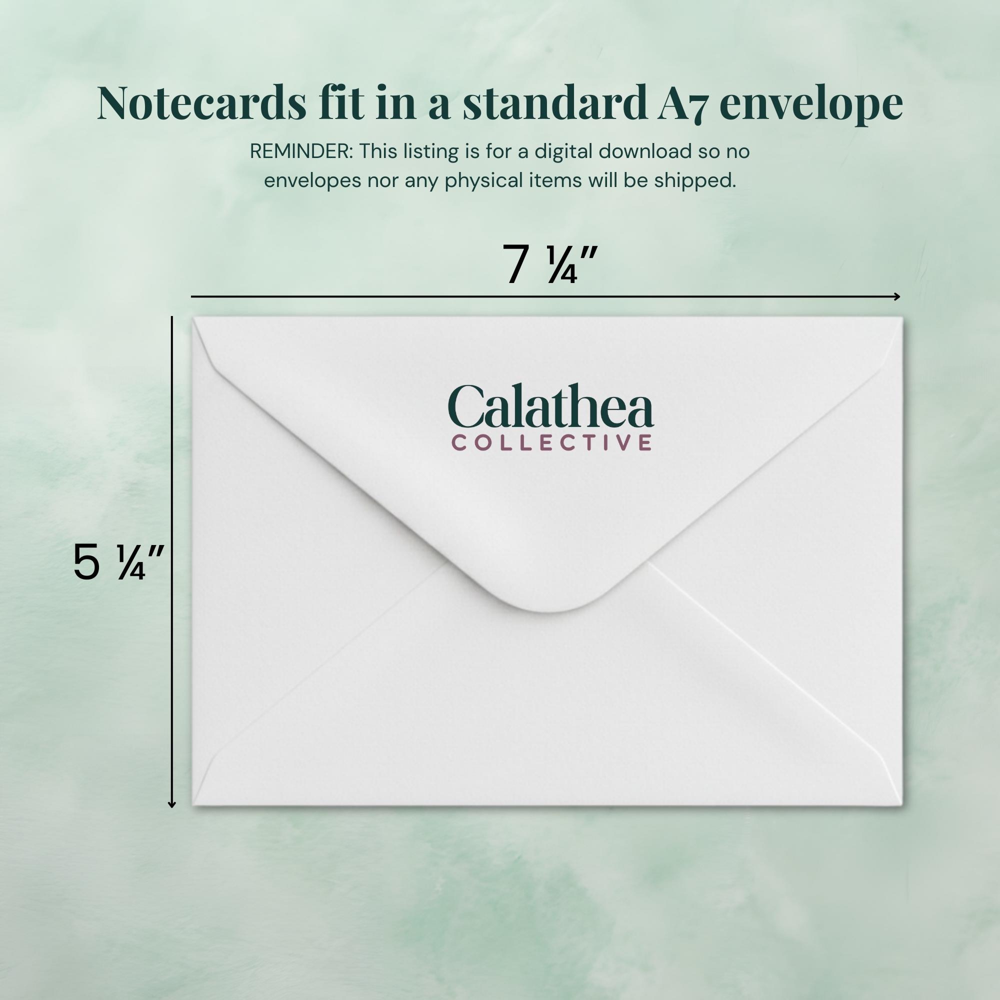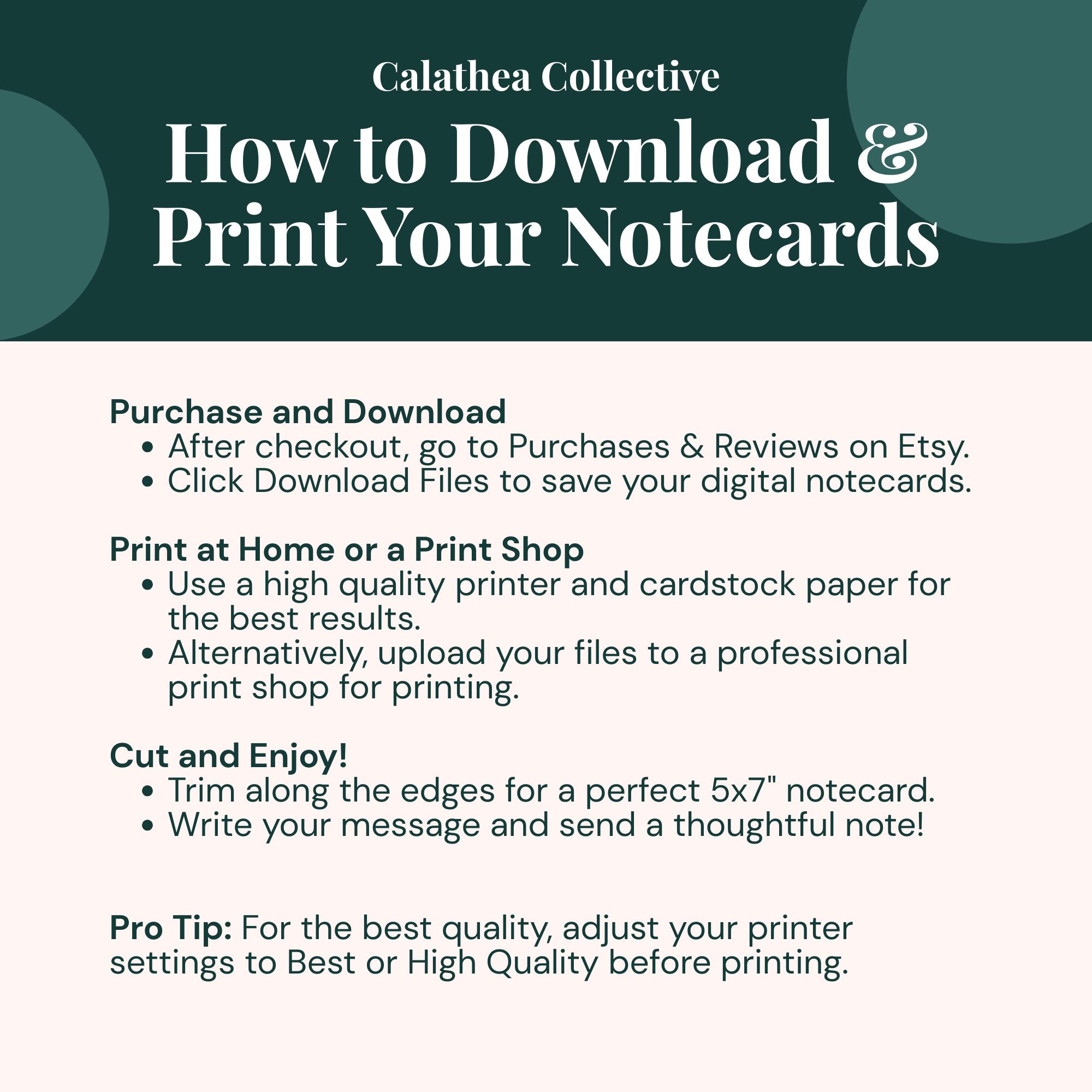 4 unique notecard designs (digital PDF/JPG files), ready to print at home or at your local print shop. Each card is designed to print on standard card stock for a polished, professional finish.