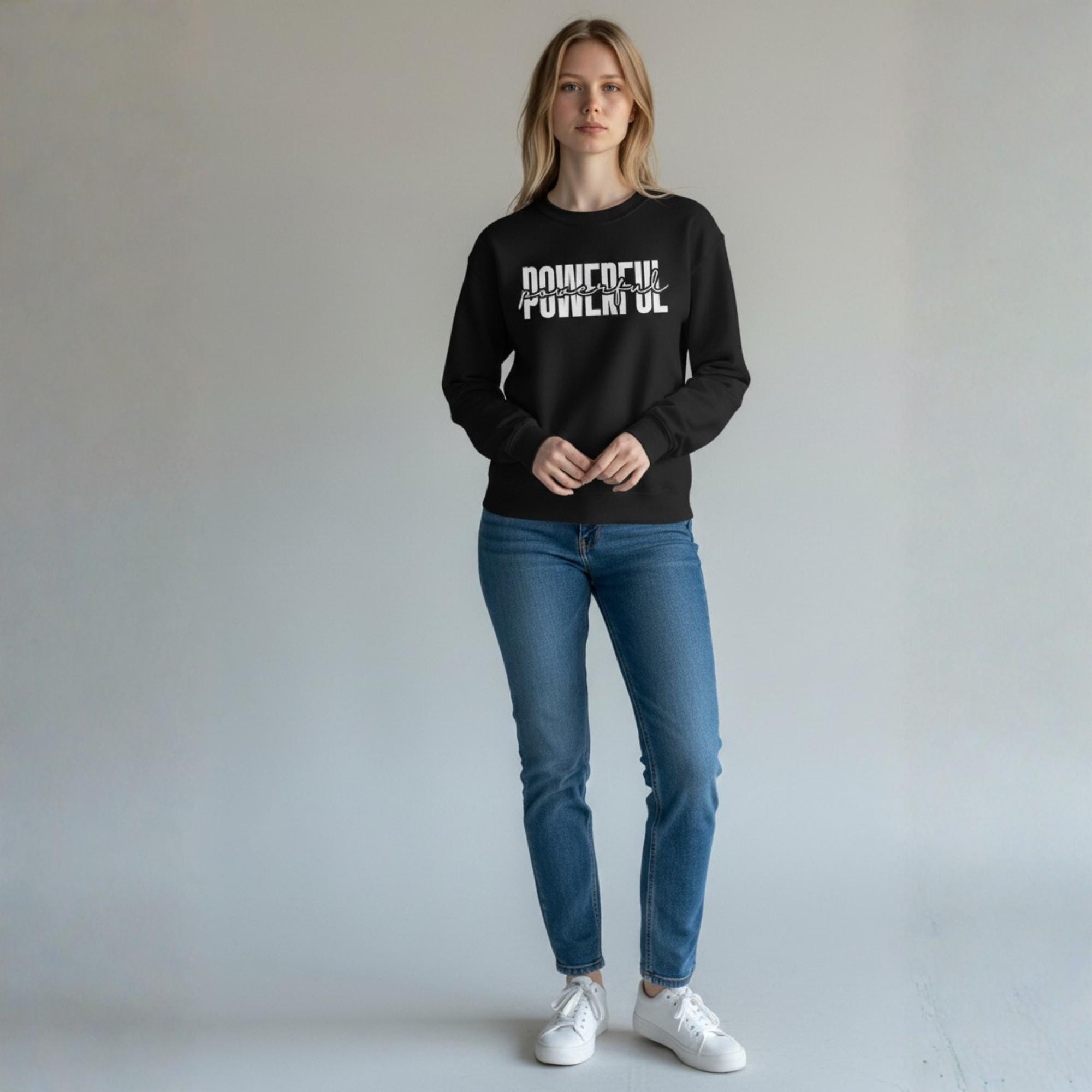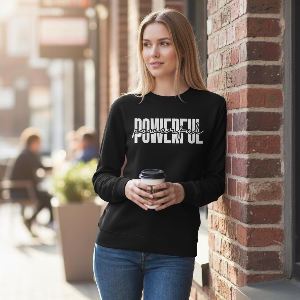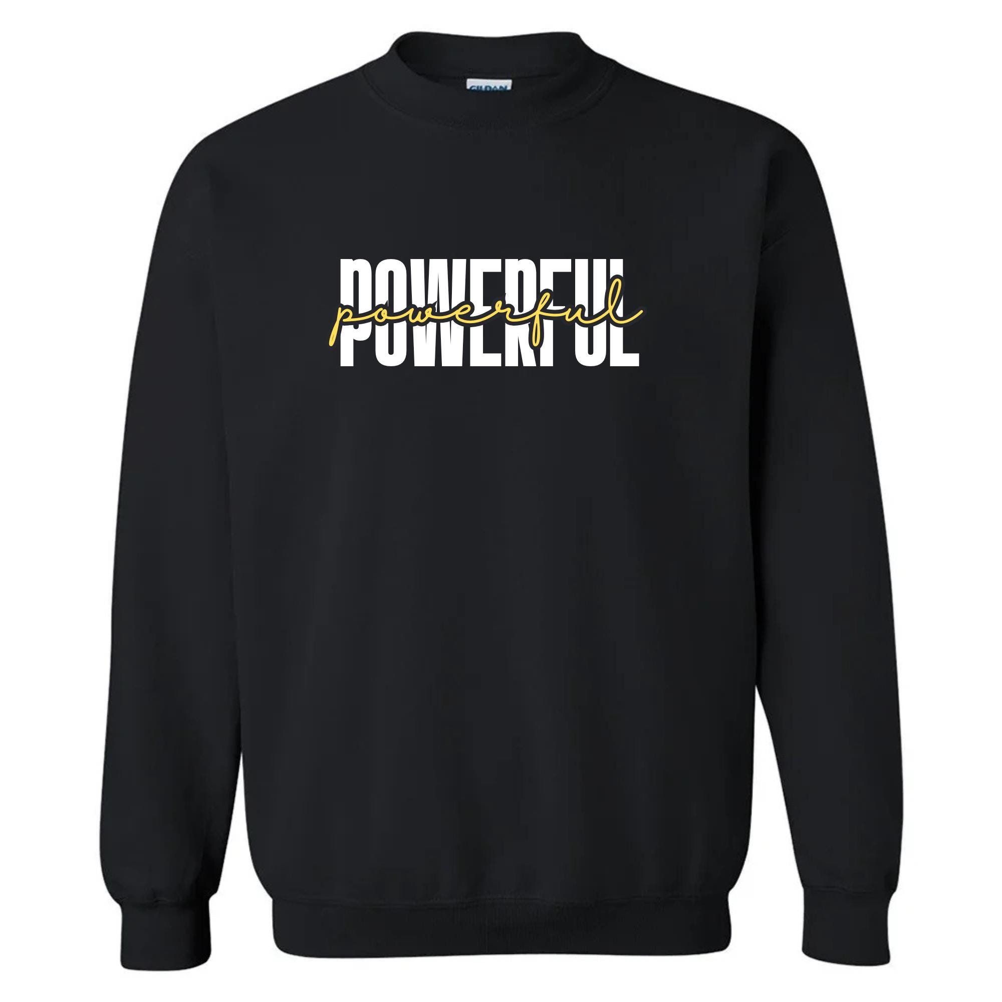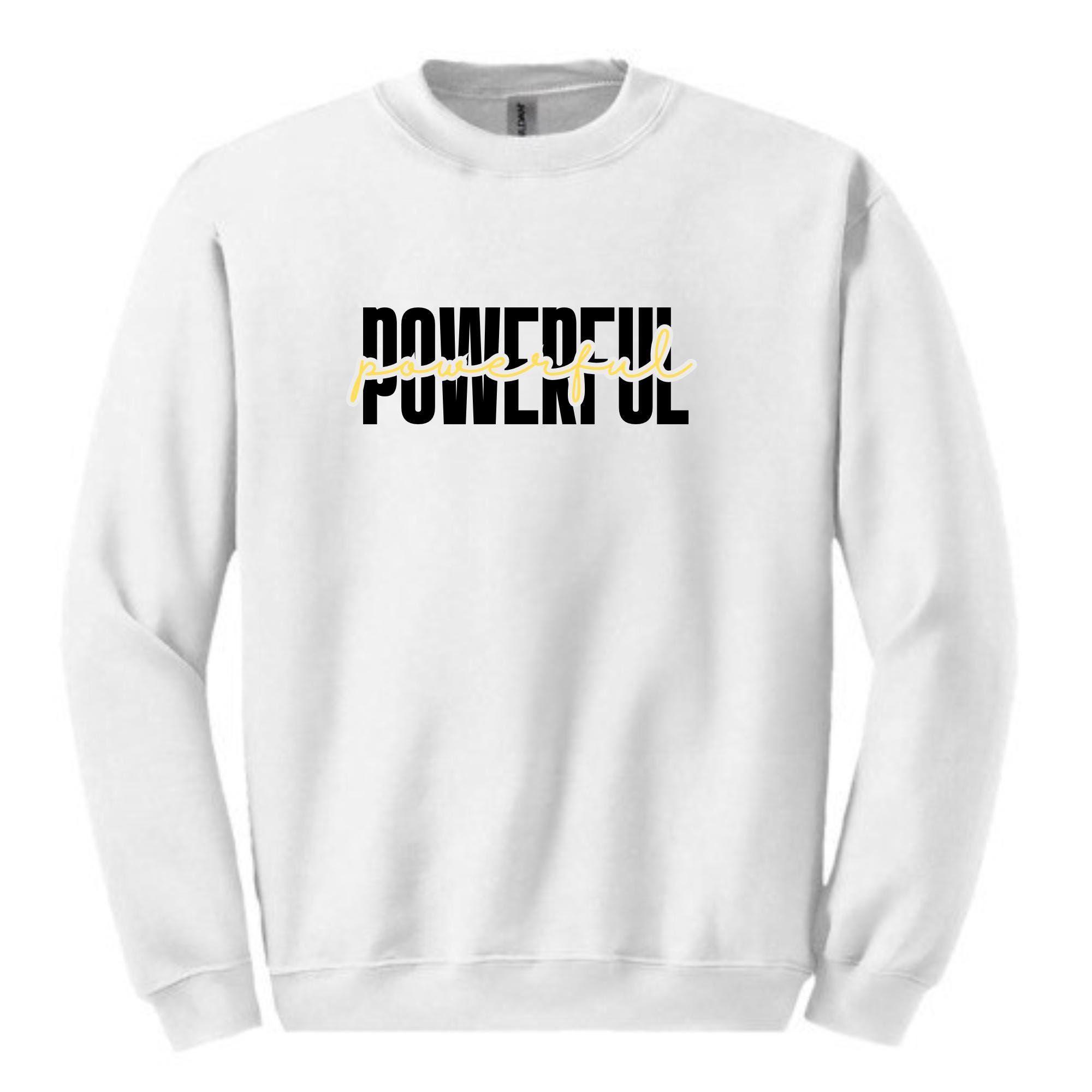 This cozy crewneck features the word "POWERFUL" in bold block letters with a script overlay — a modern design that pairs beautifully with your favorite jeans, leggings or loungewear.