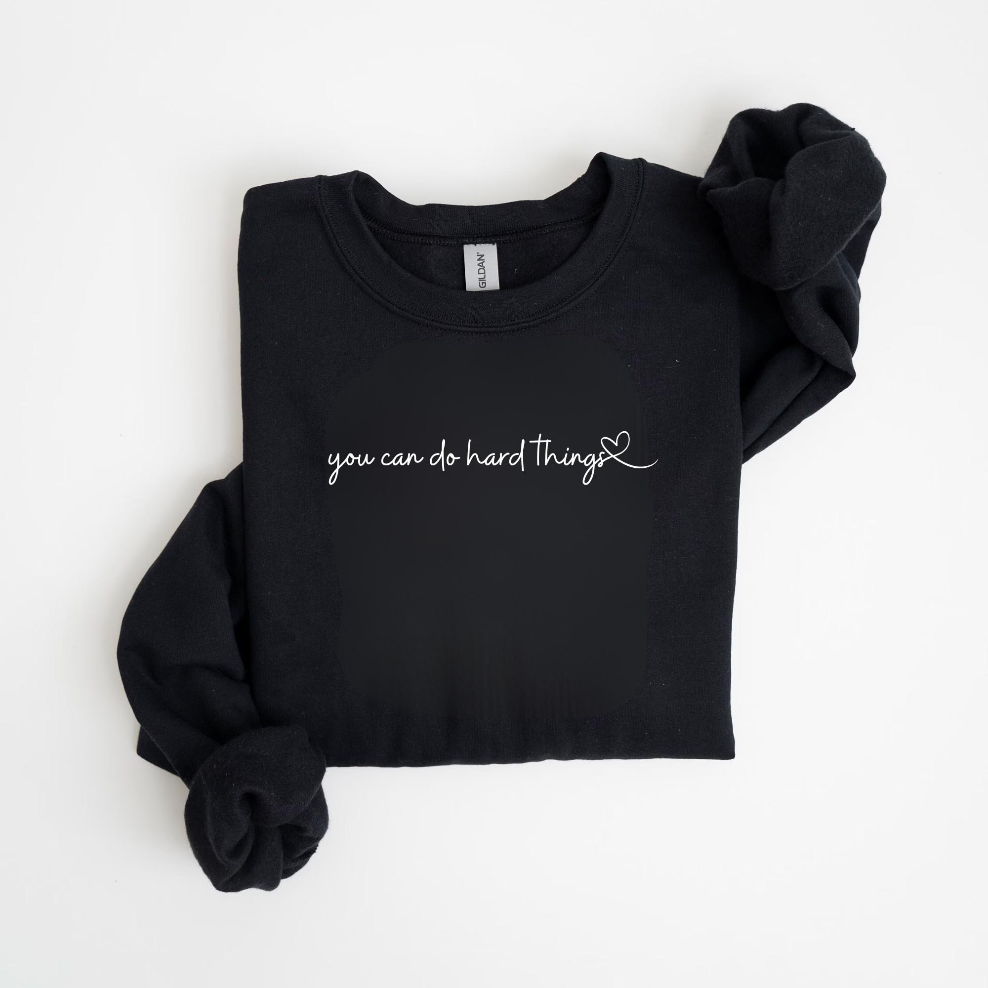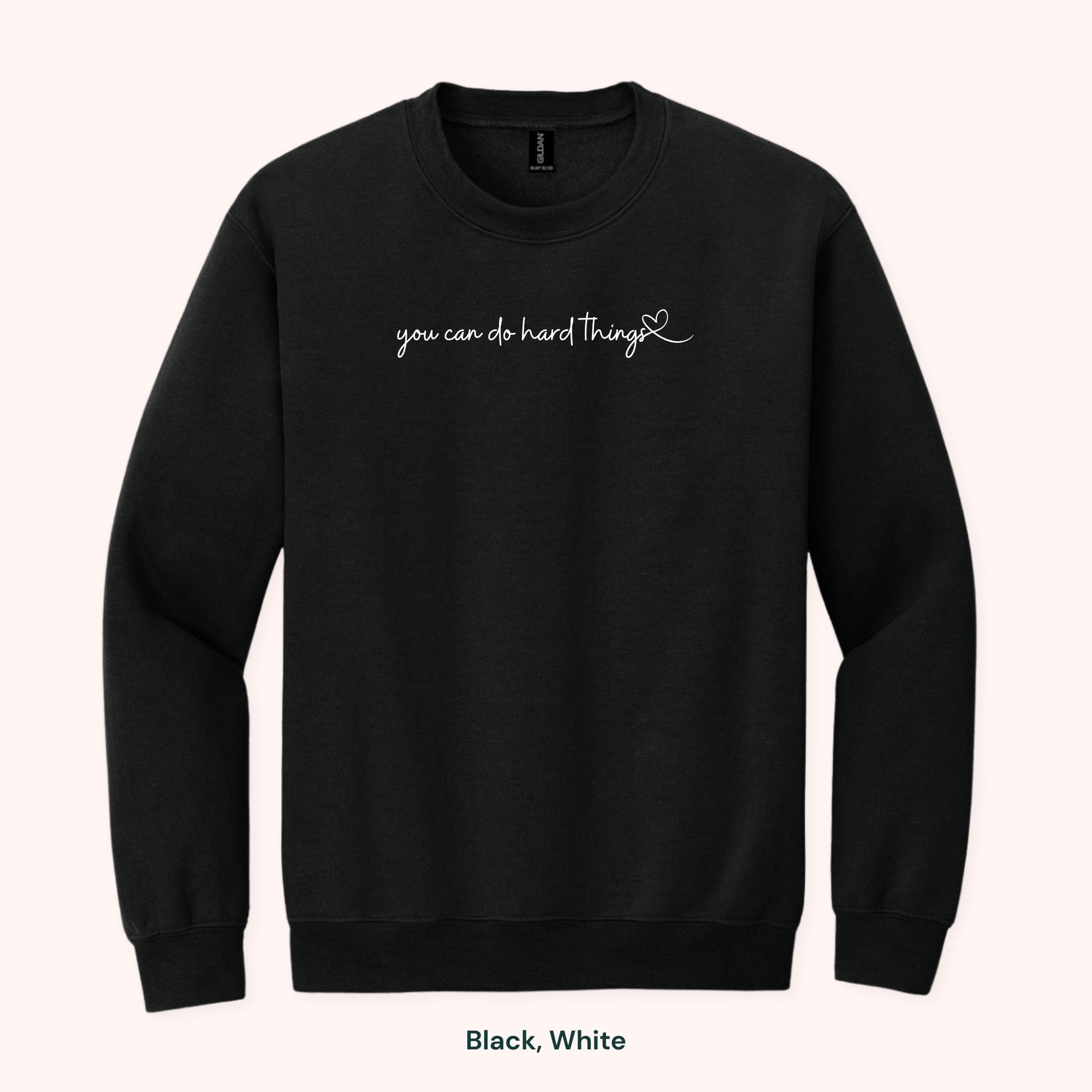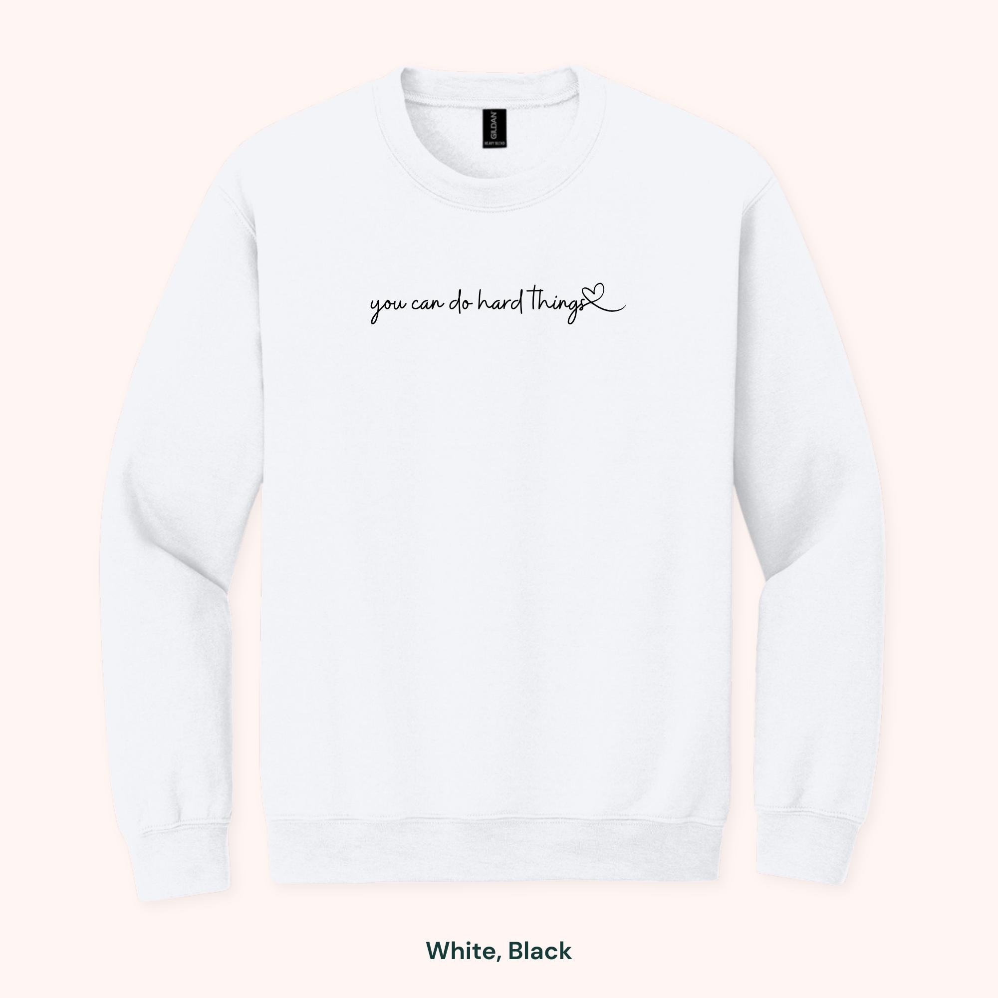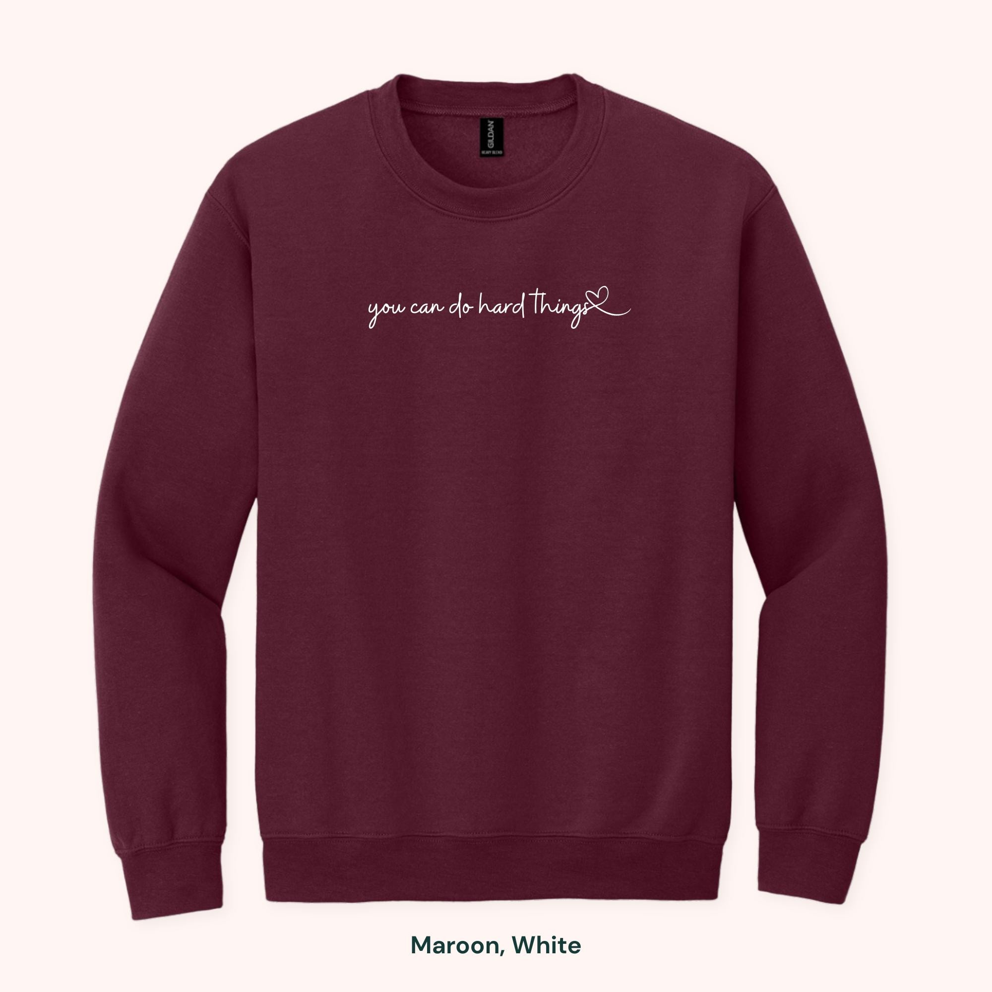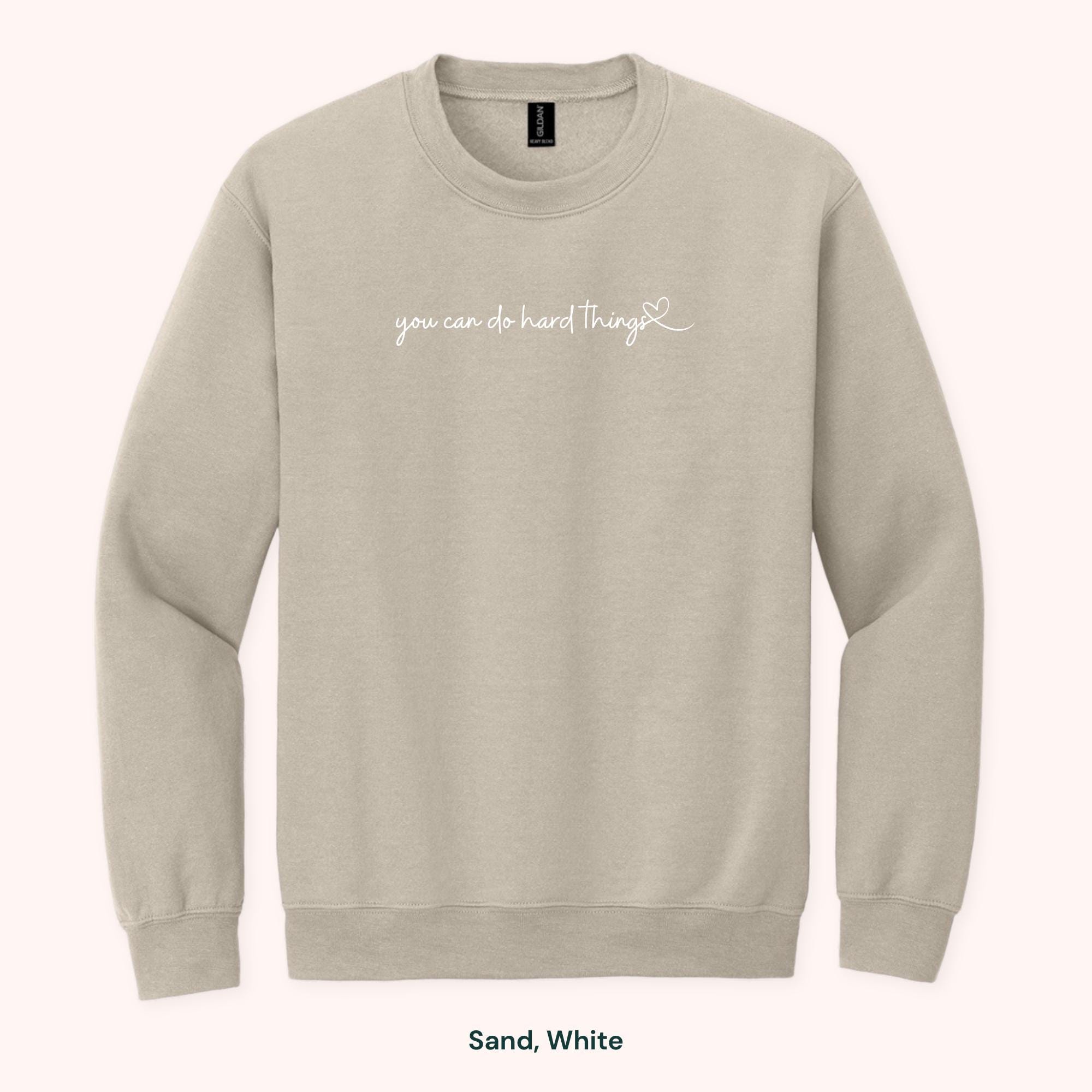 This cozy crewneck features the phrase "you can do hard things" in a beautiful handwritten script with a heart detail — a subtle yet meaningful design that goes with everything in your closet.