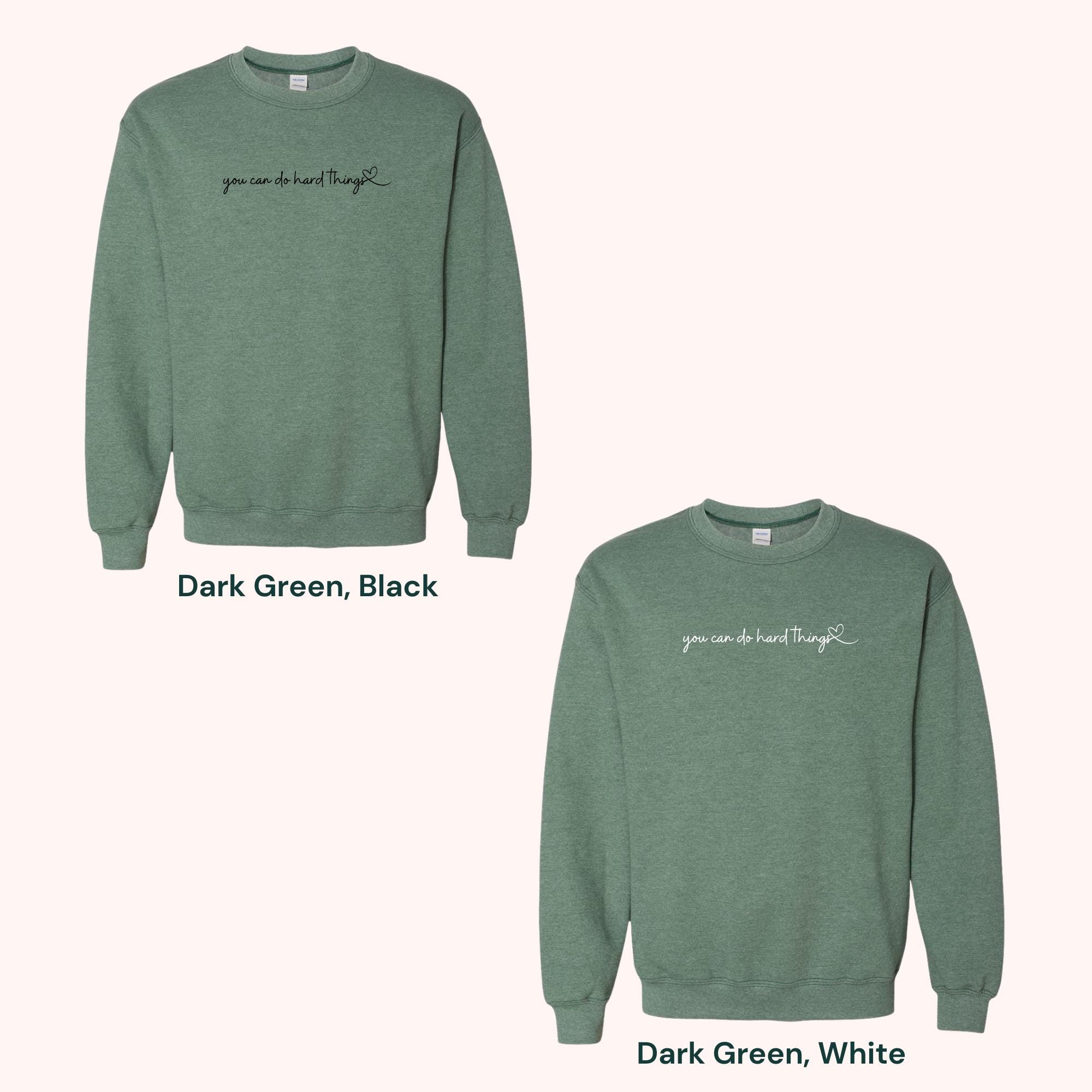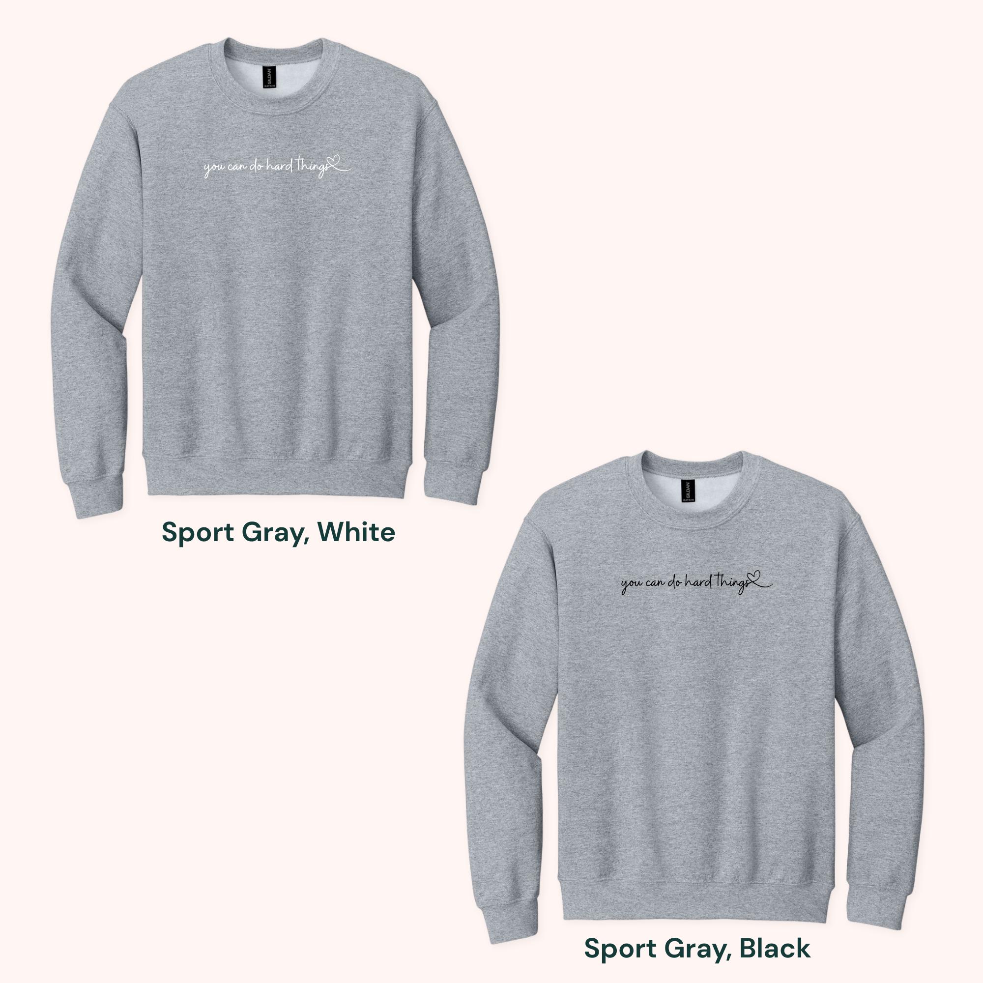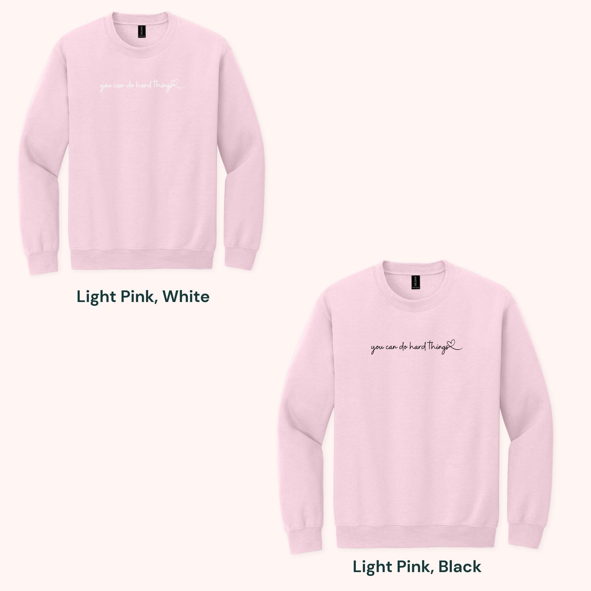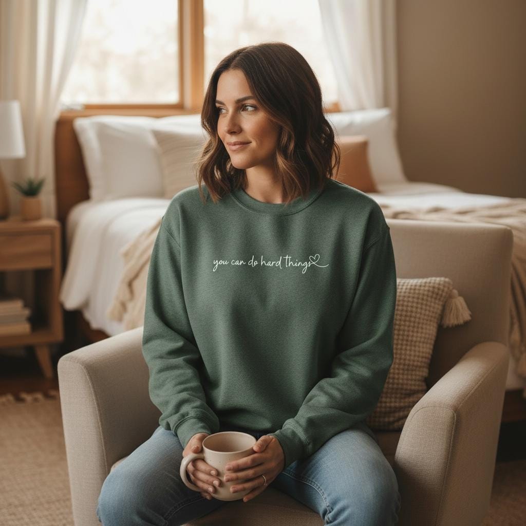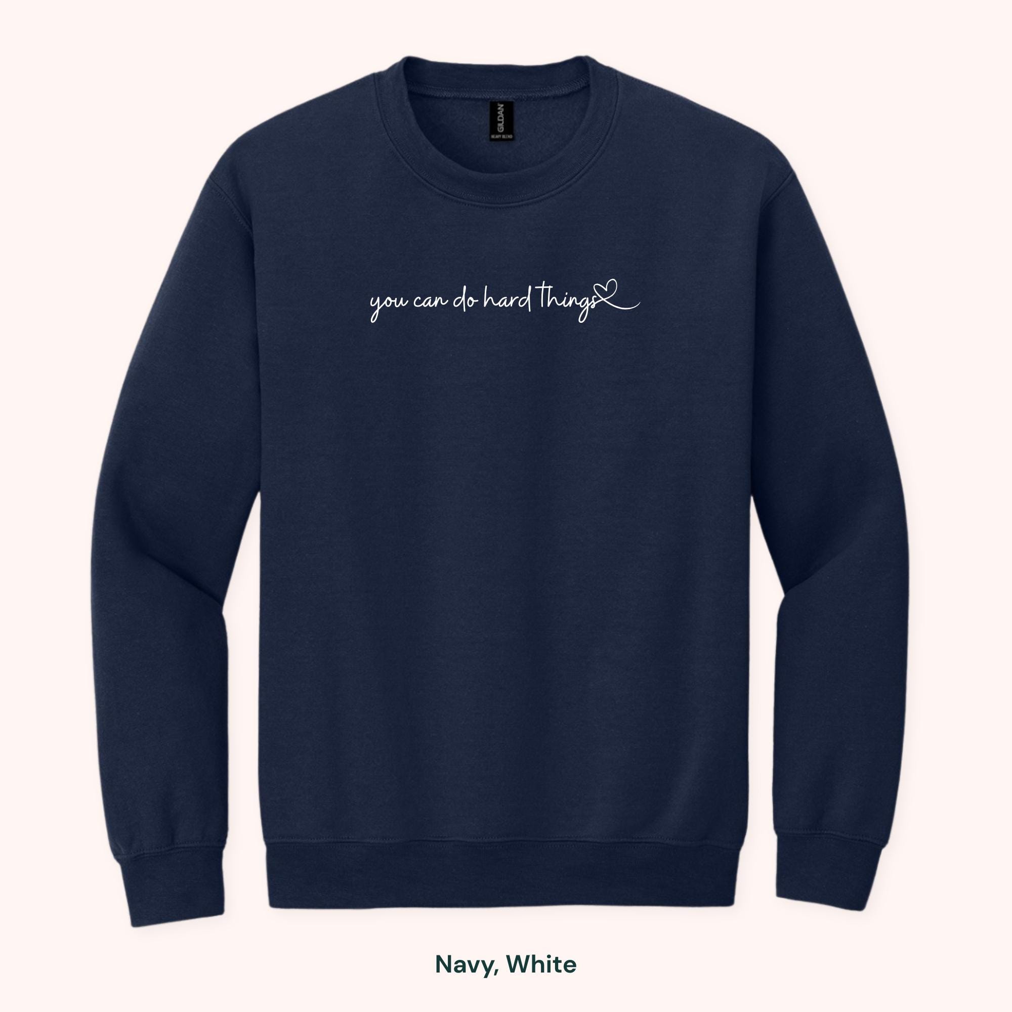 This cozy crewneck features the phrase "you can do hard things" in a beautiful handwritten script with a heart detail — a subtle yet meaningful design that goes with everything in your closet.