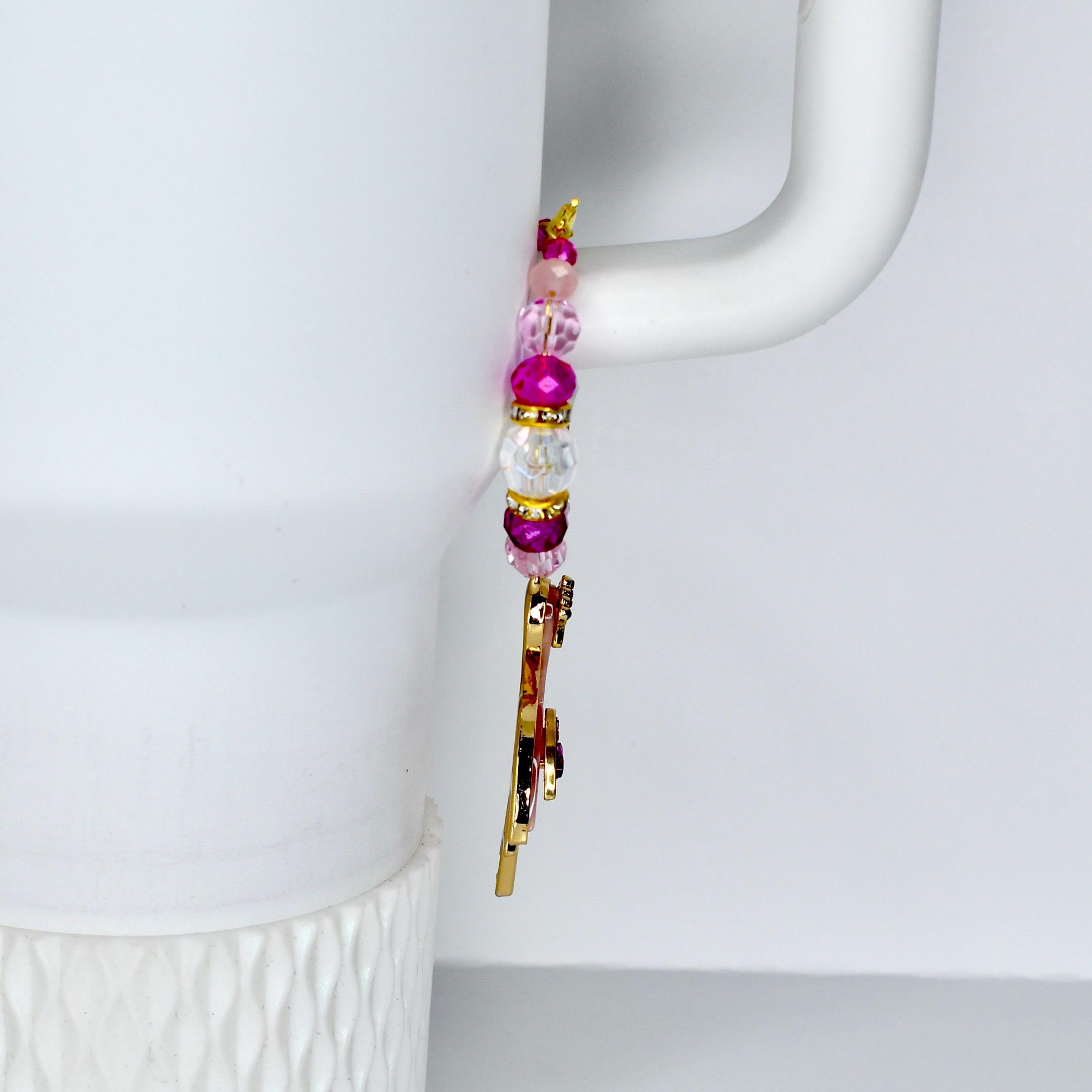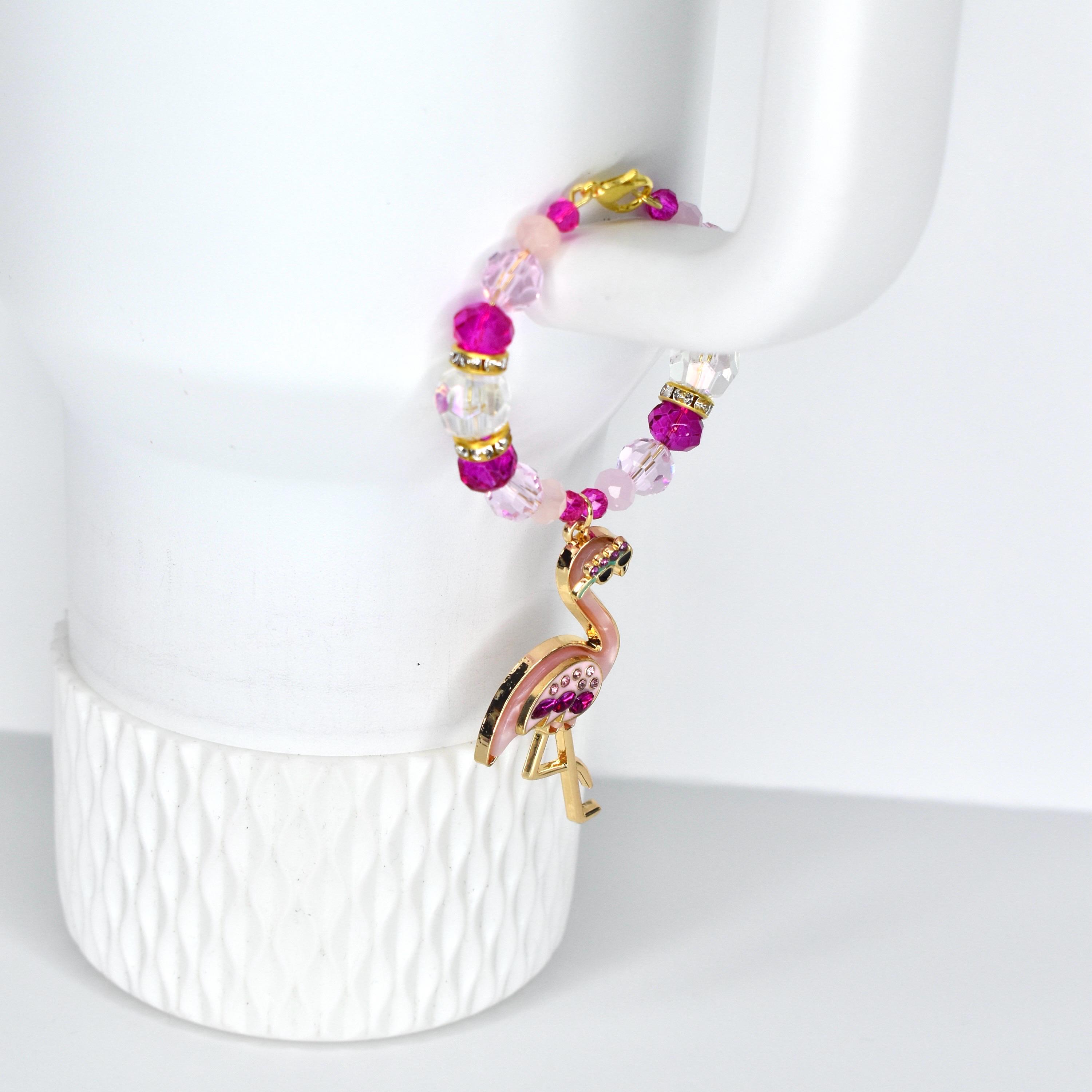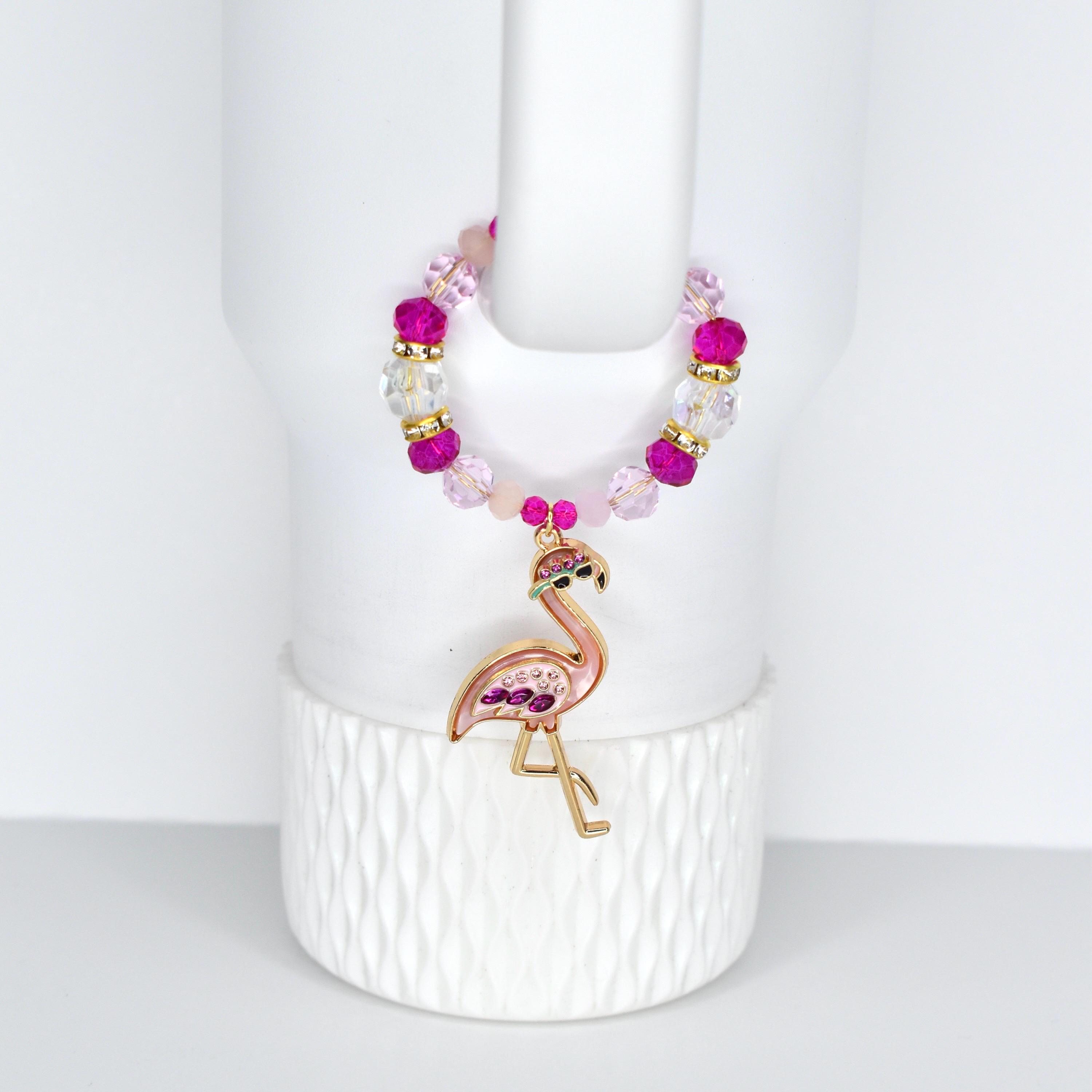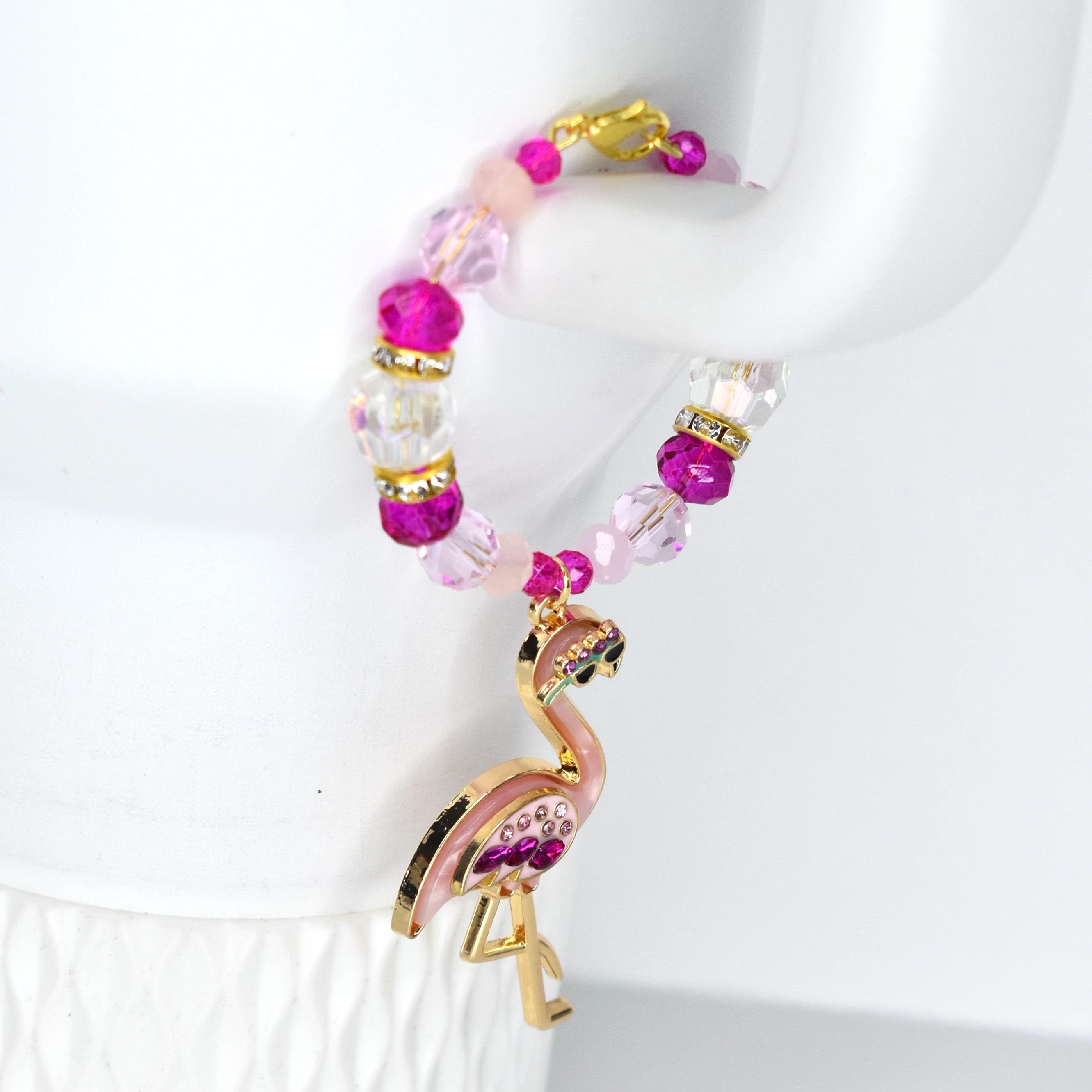 The flamingo bracelet is bold, bright and unapologetically pink. This tumbler handle bracelet features a fun flamingo charm strung on a stretchy band of hot pink faceted crystal beads and clear crystals with gold rhinestone spacers and gold-tone hardware.